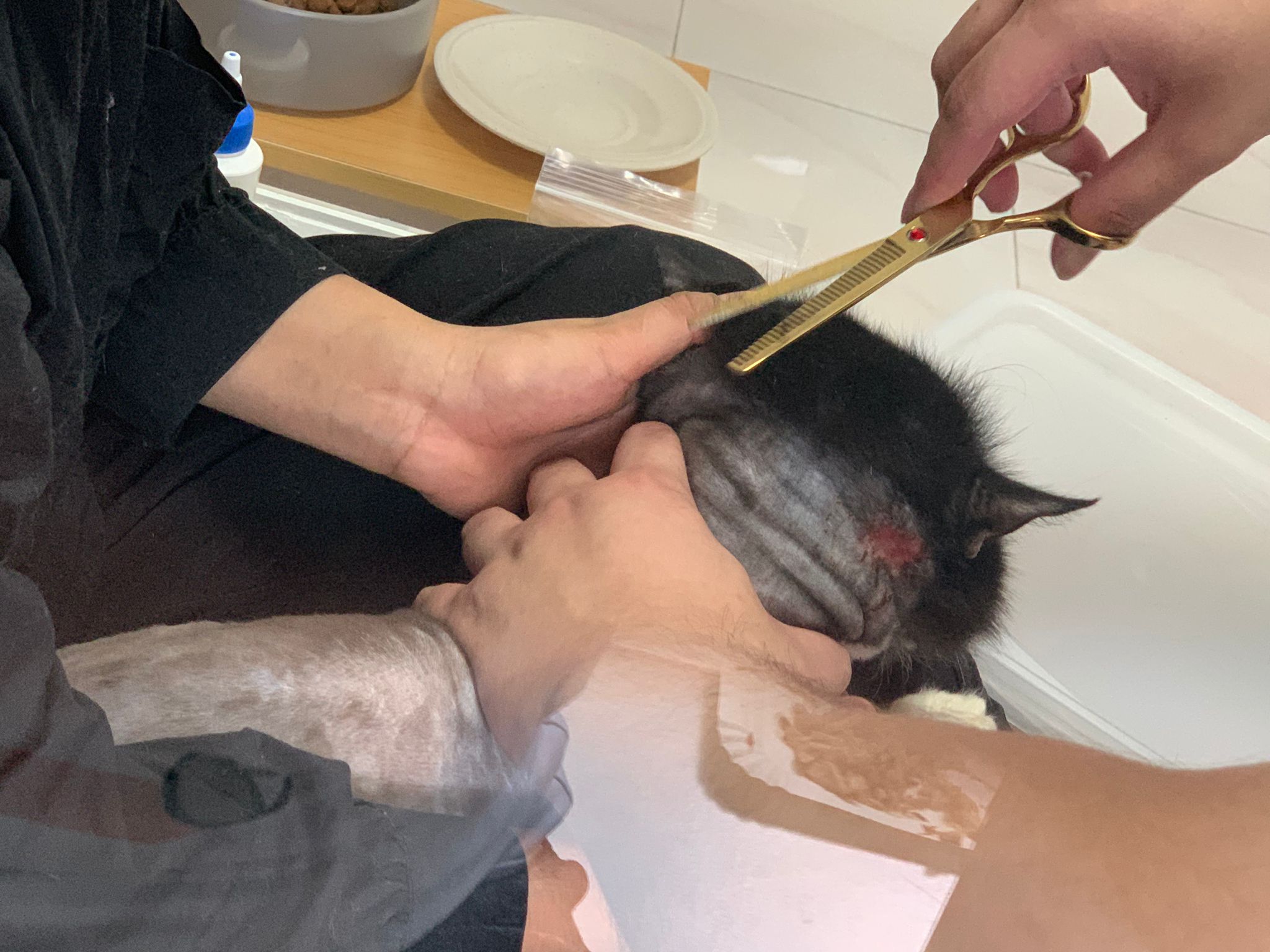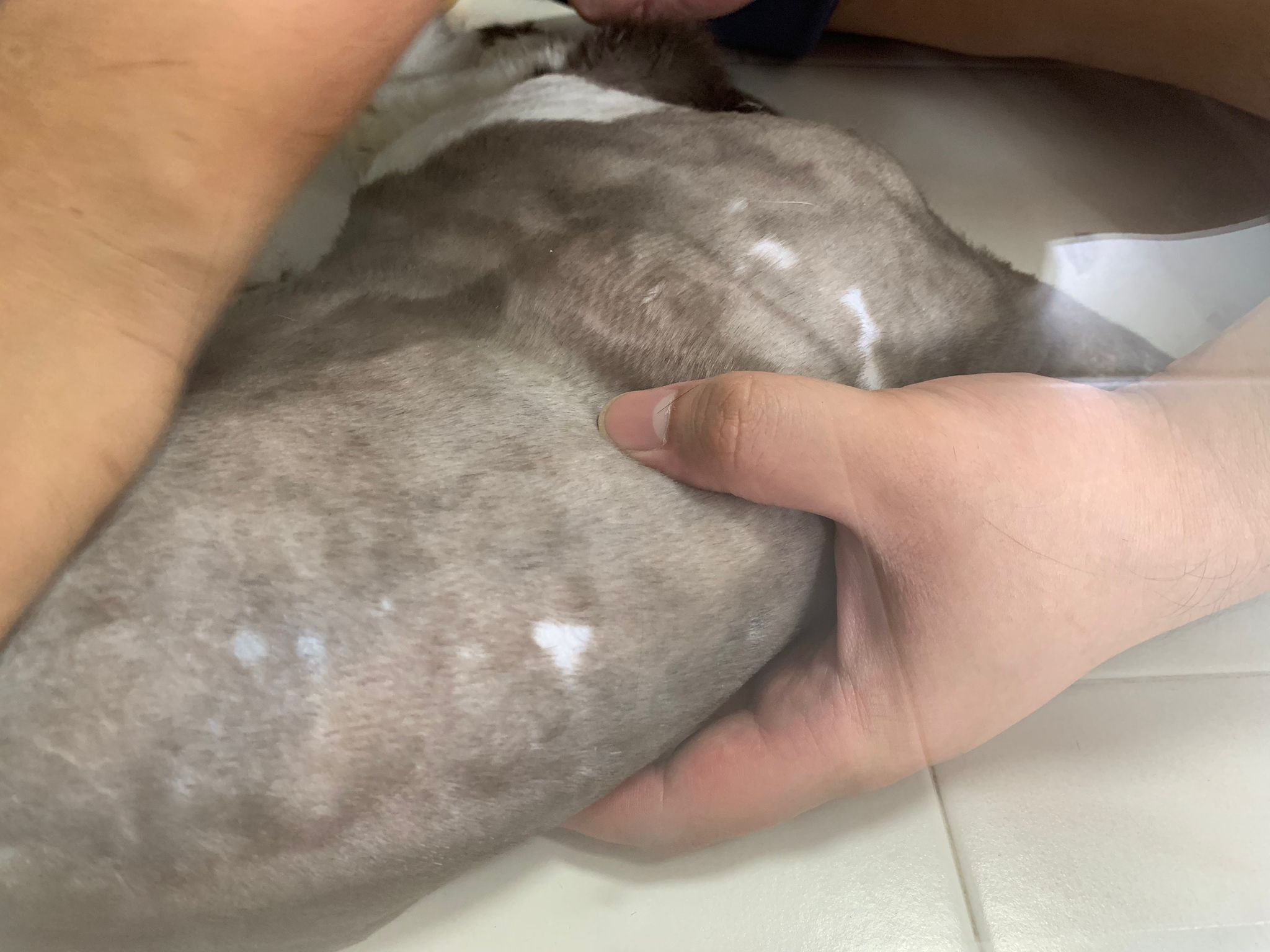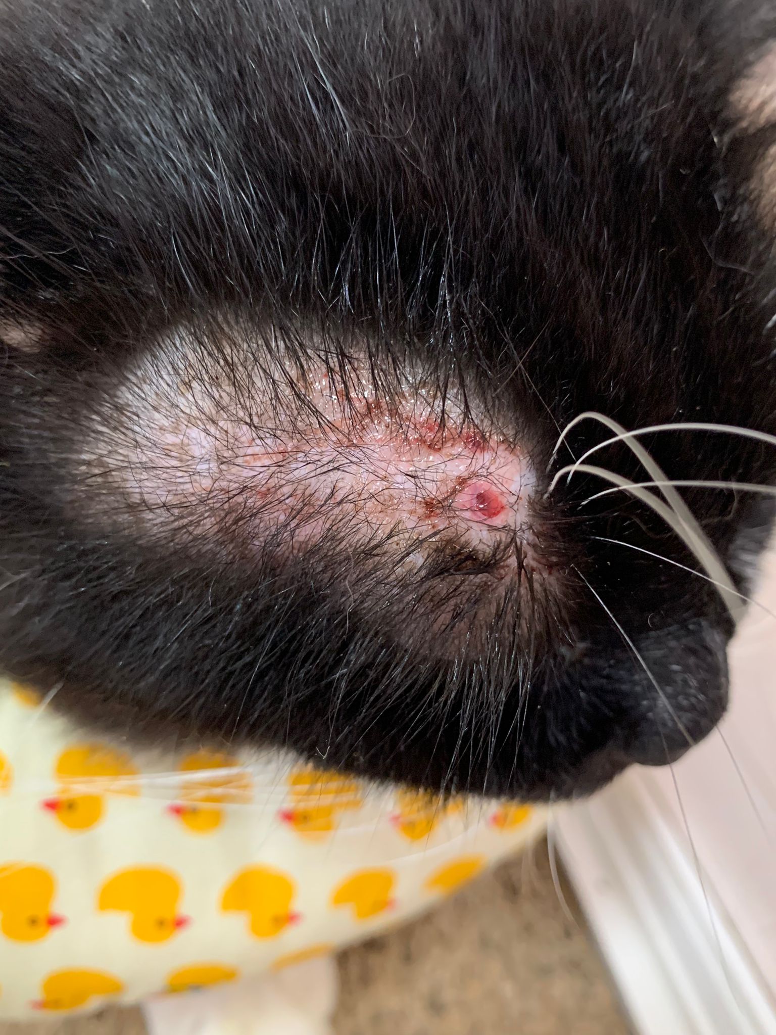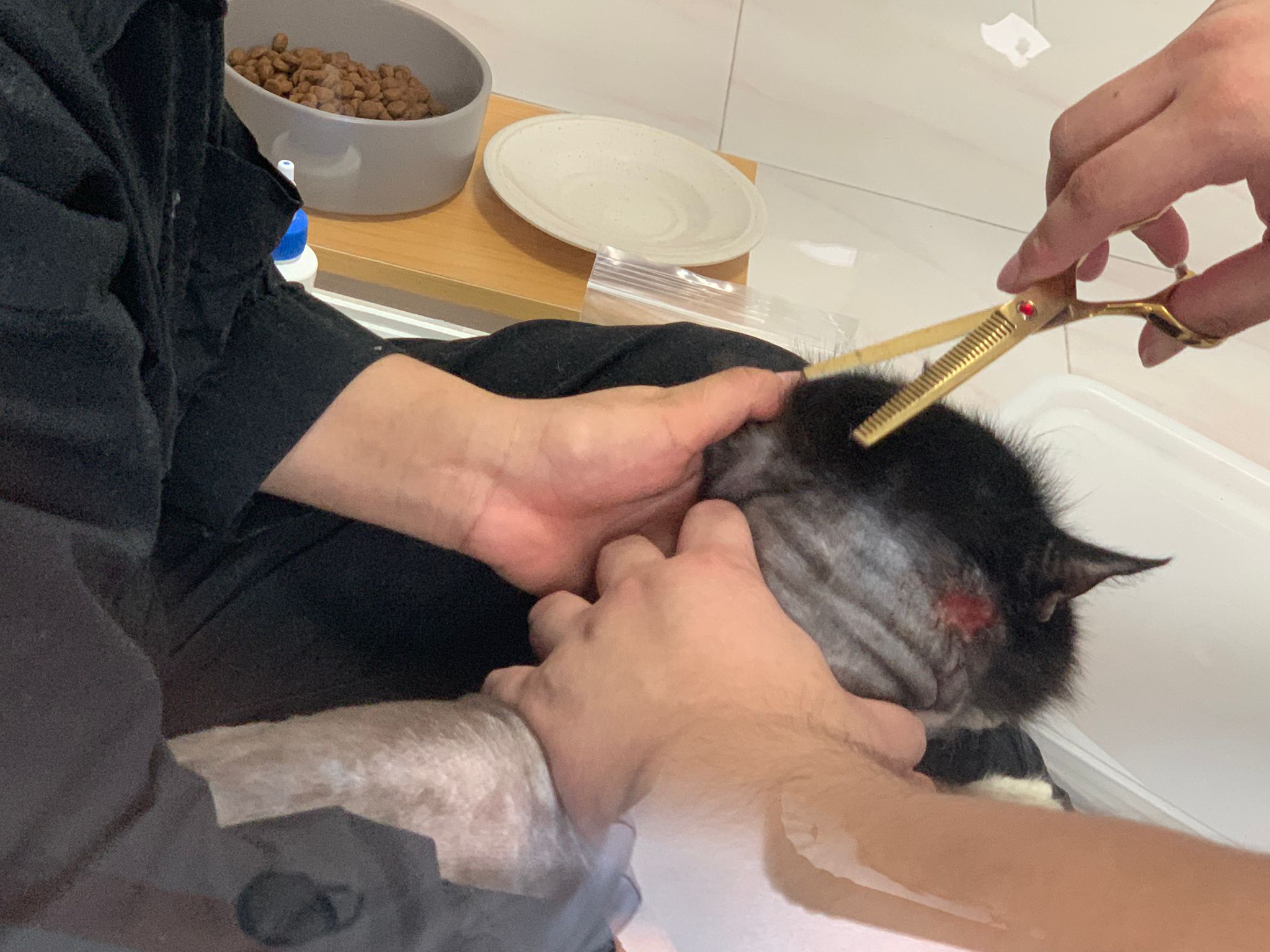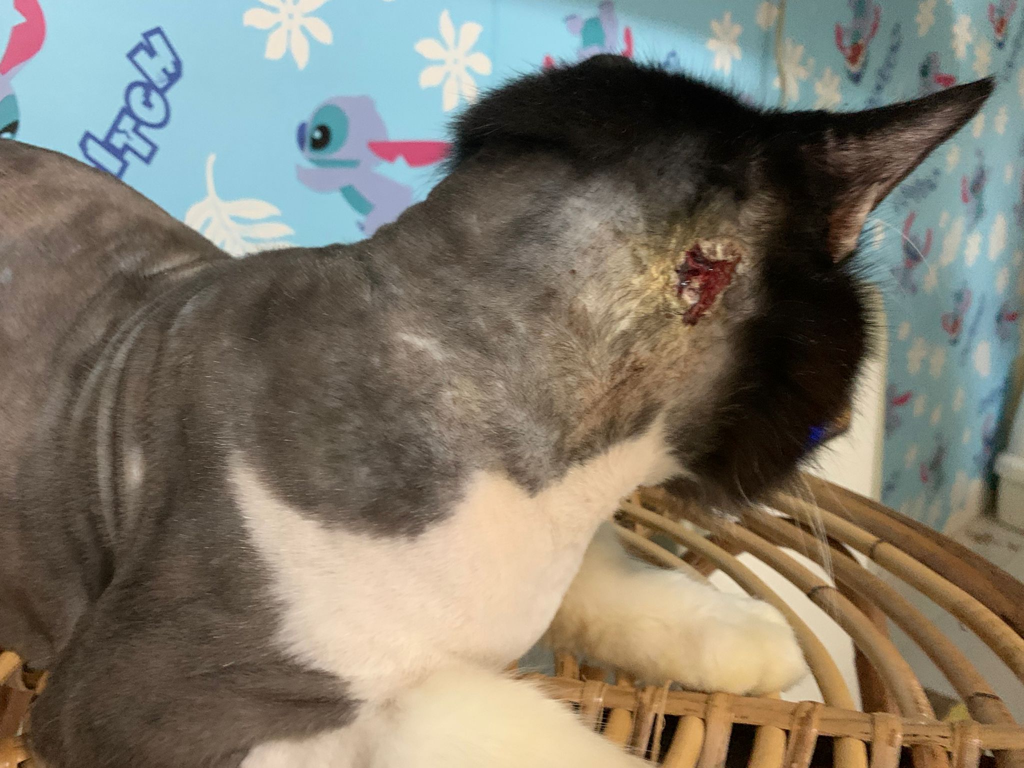 check his wound out, I clean w f10 he still ok. Will struggle but my scruff is fine. Put the ointment from clinic he will jump. Erm. I’ll consider the treatment again. His left side also same loh. Except not red. His body and head also have.