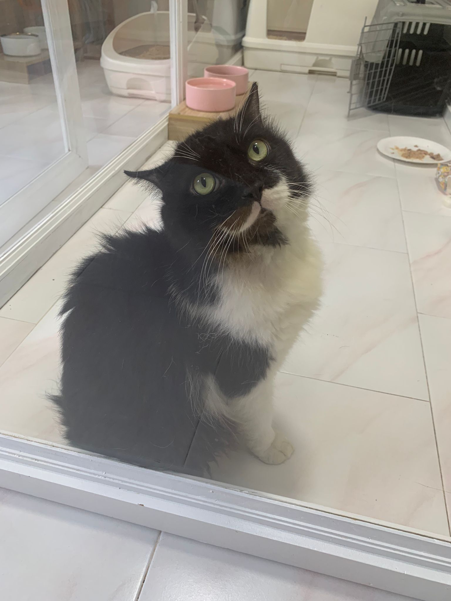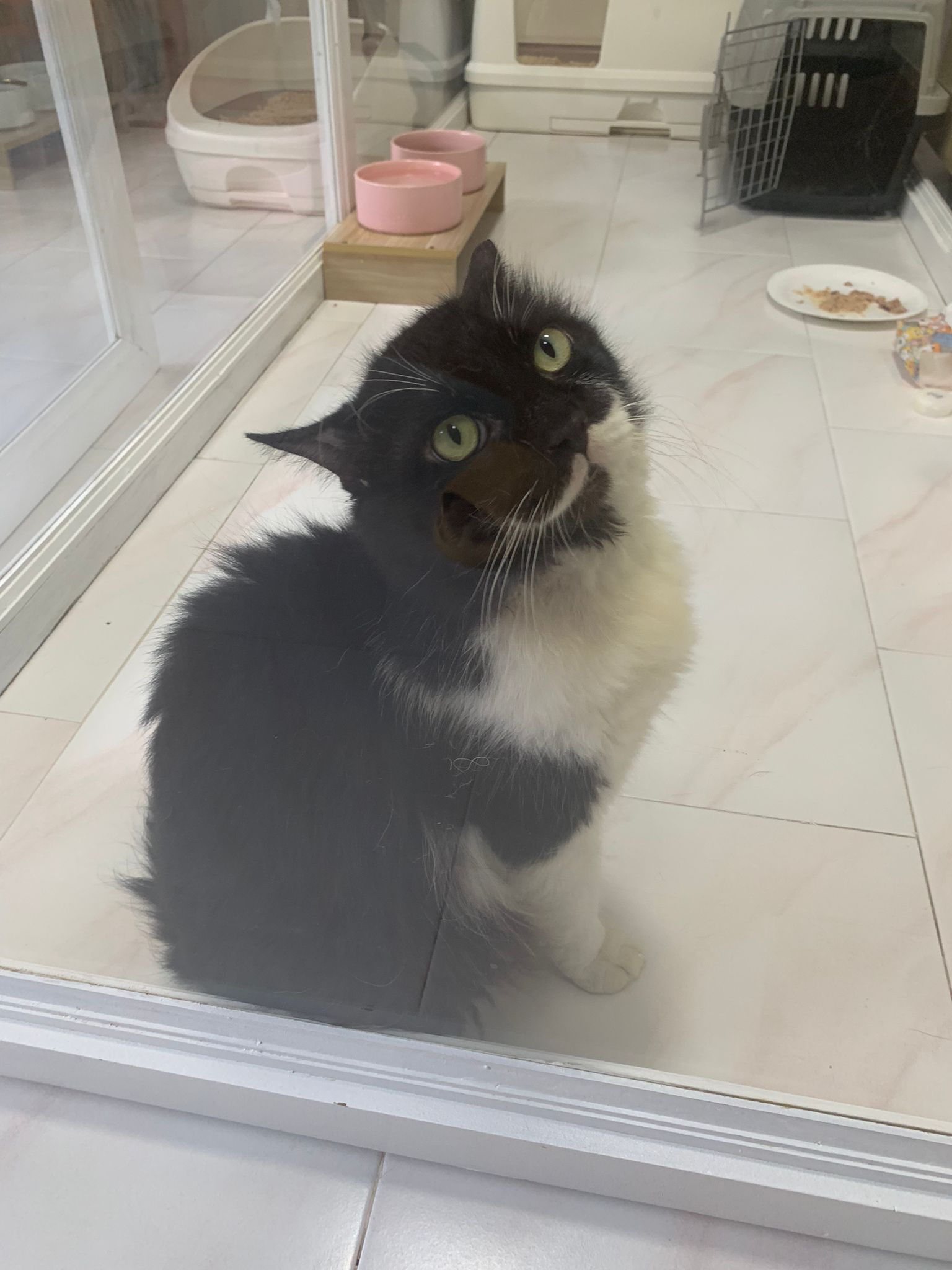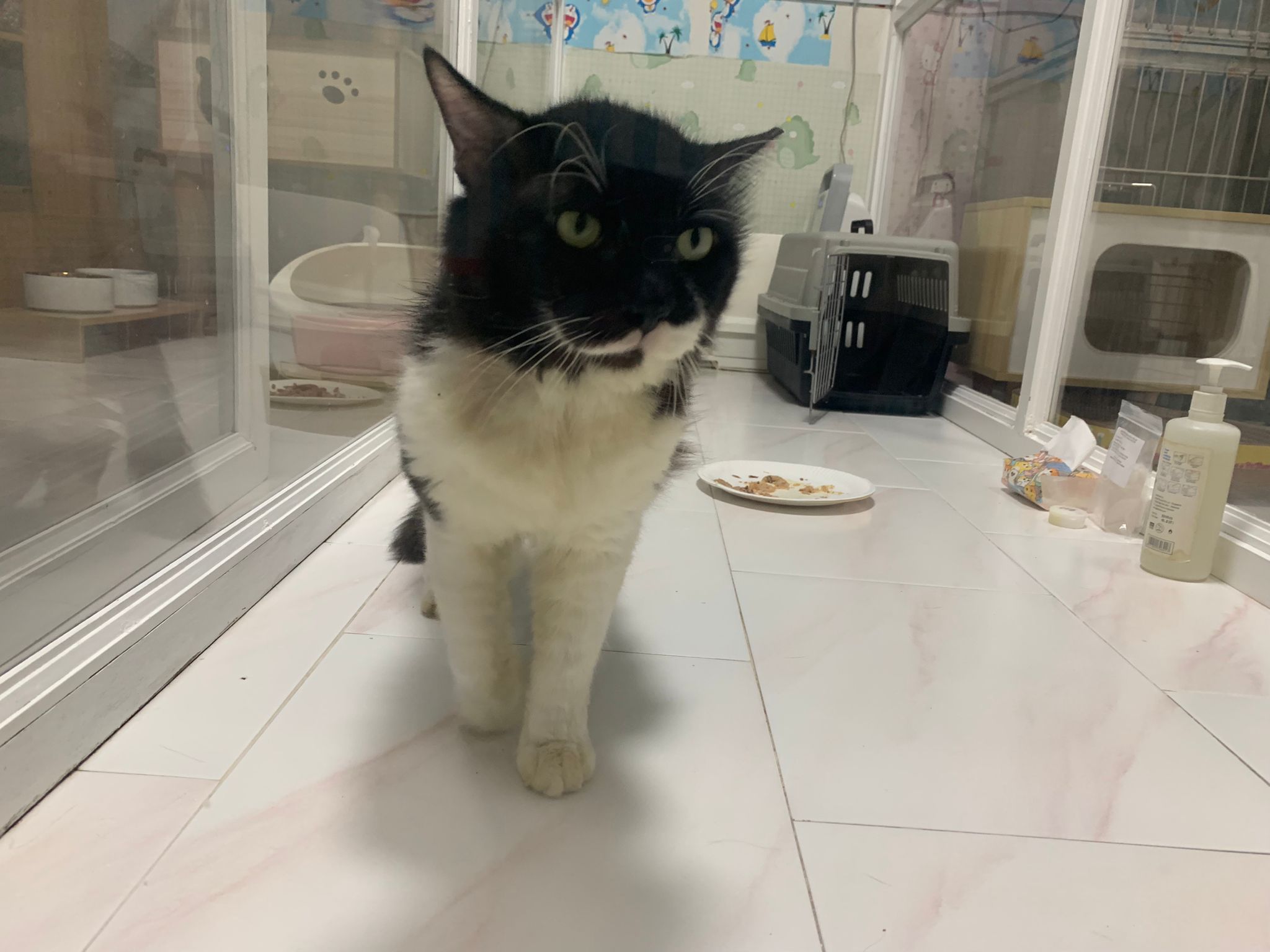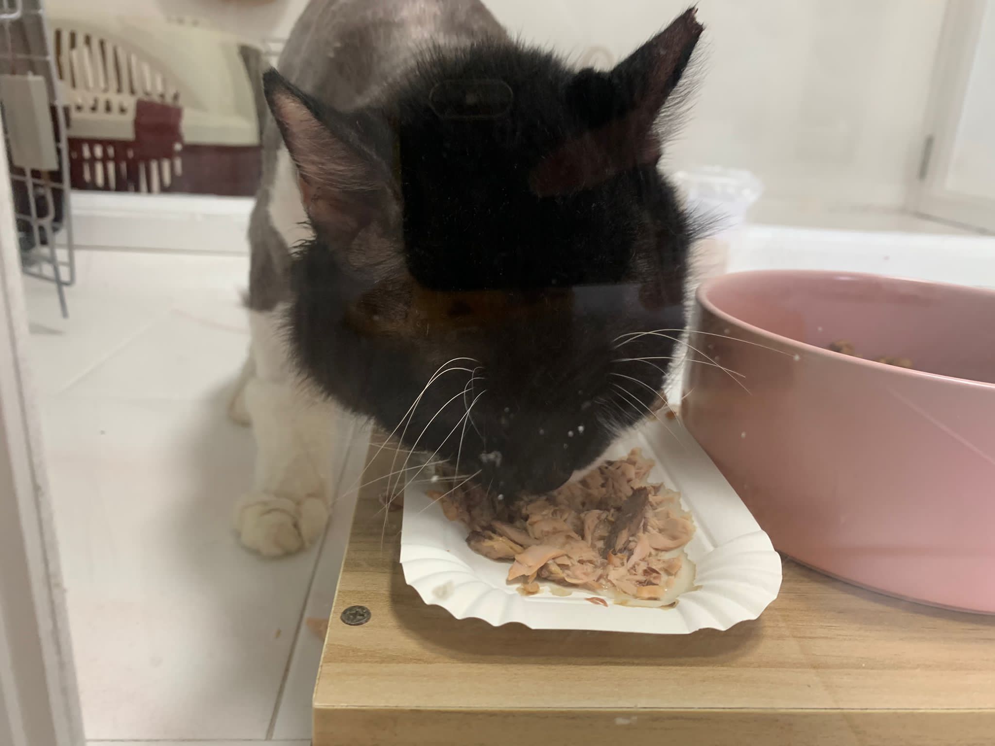 240pm: back to 猫房. Stay room b. Ok w other cats. Serve tuna w chicken ham. got walk out of carrier look ard. meow ok. not that loud.