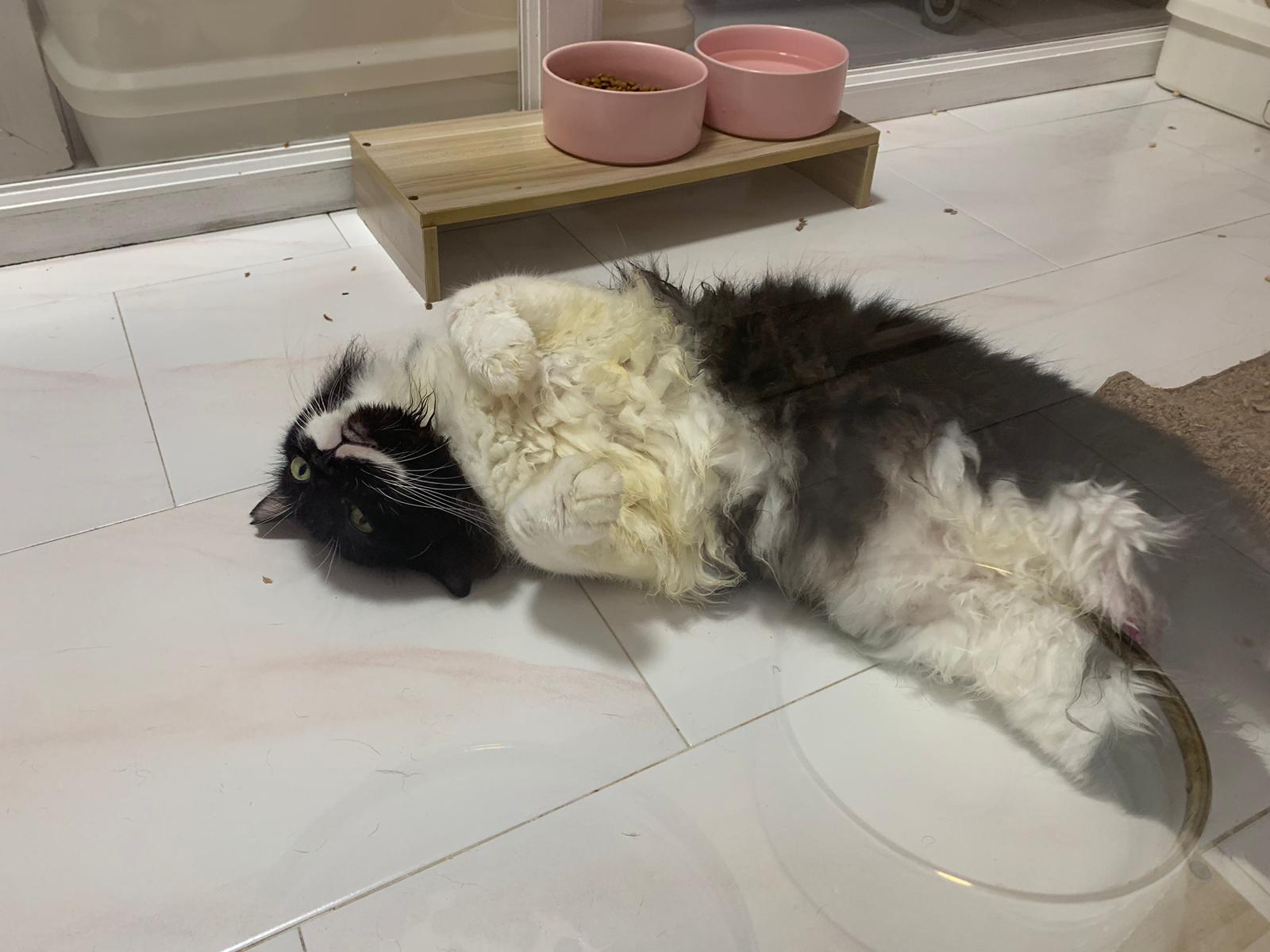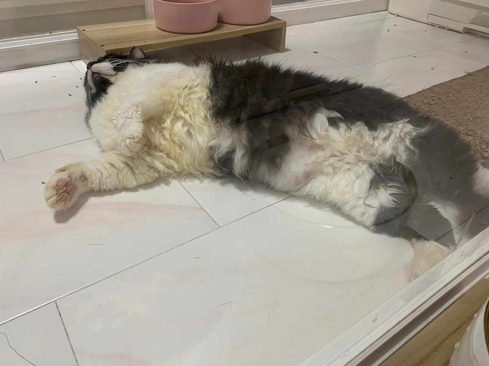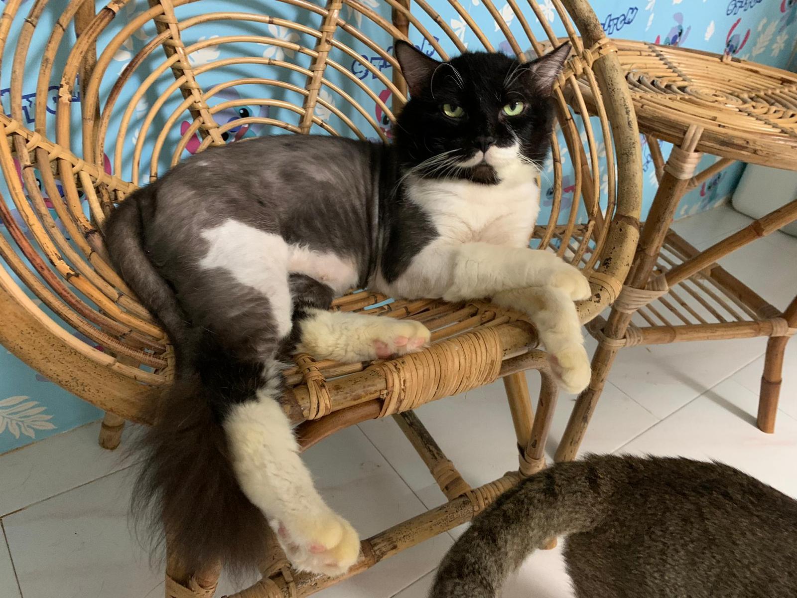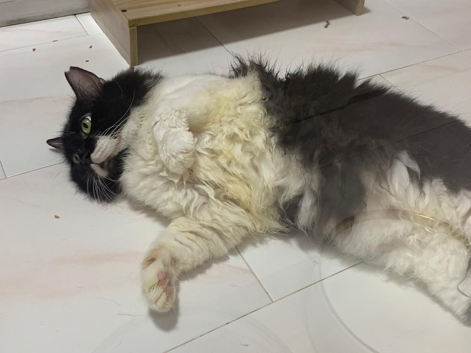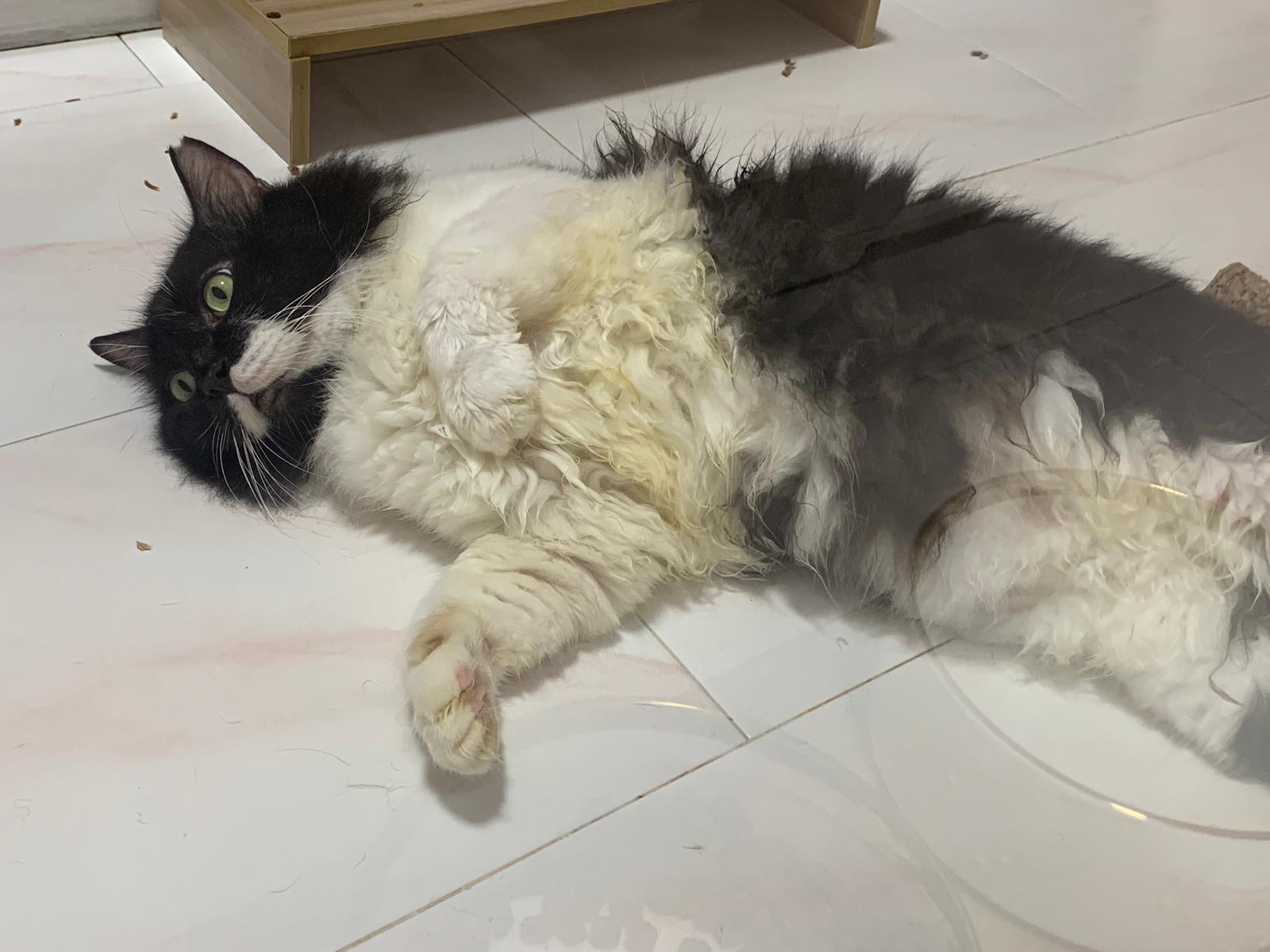 Fur are very sticky (lucky no matted fur). Tail very bad, means I got more spots I need to clean and medicate. He is a kicker, he likes to kick pple. Don’t scratch don’t bite.
