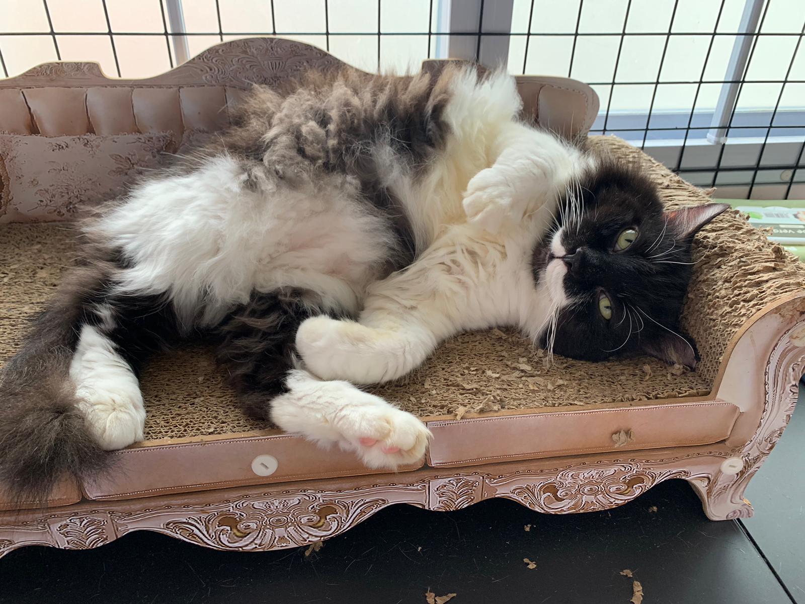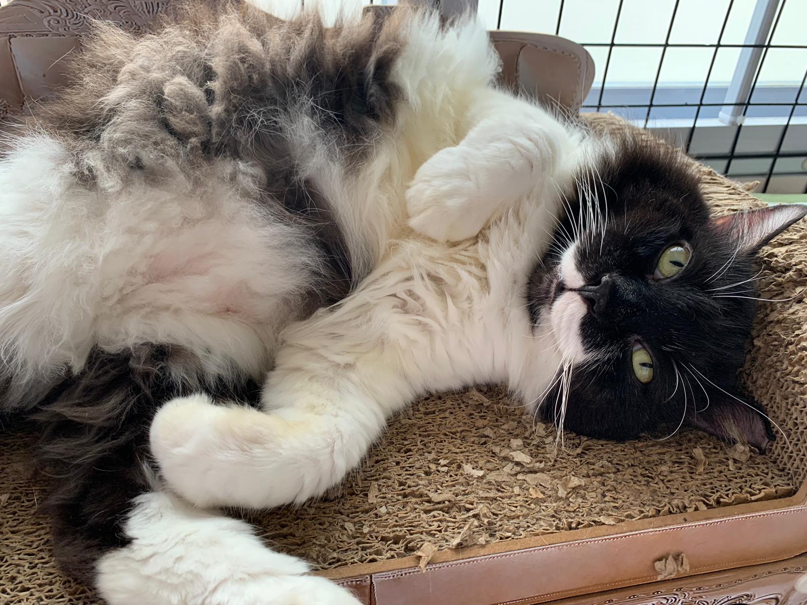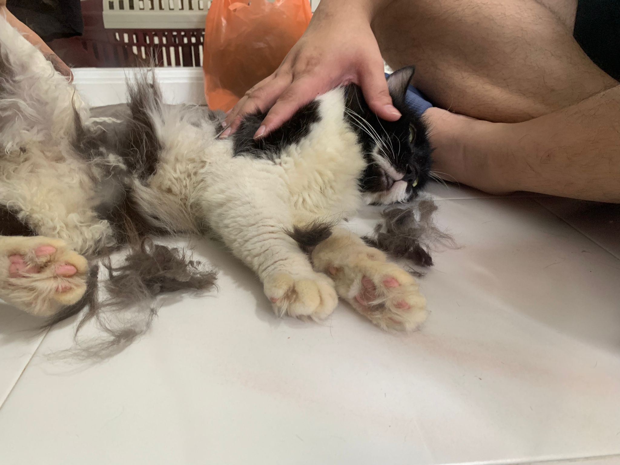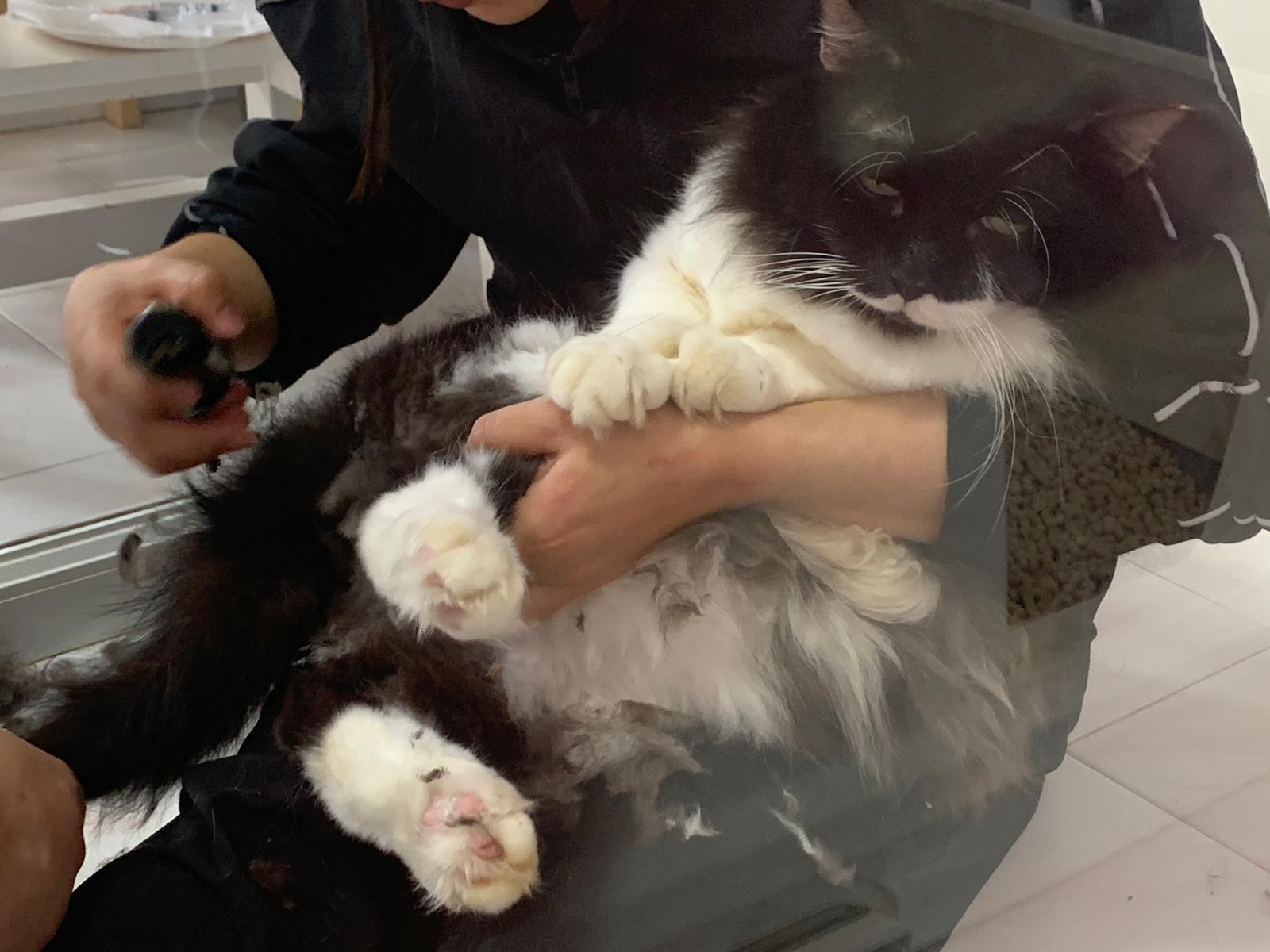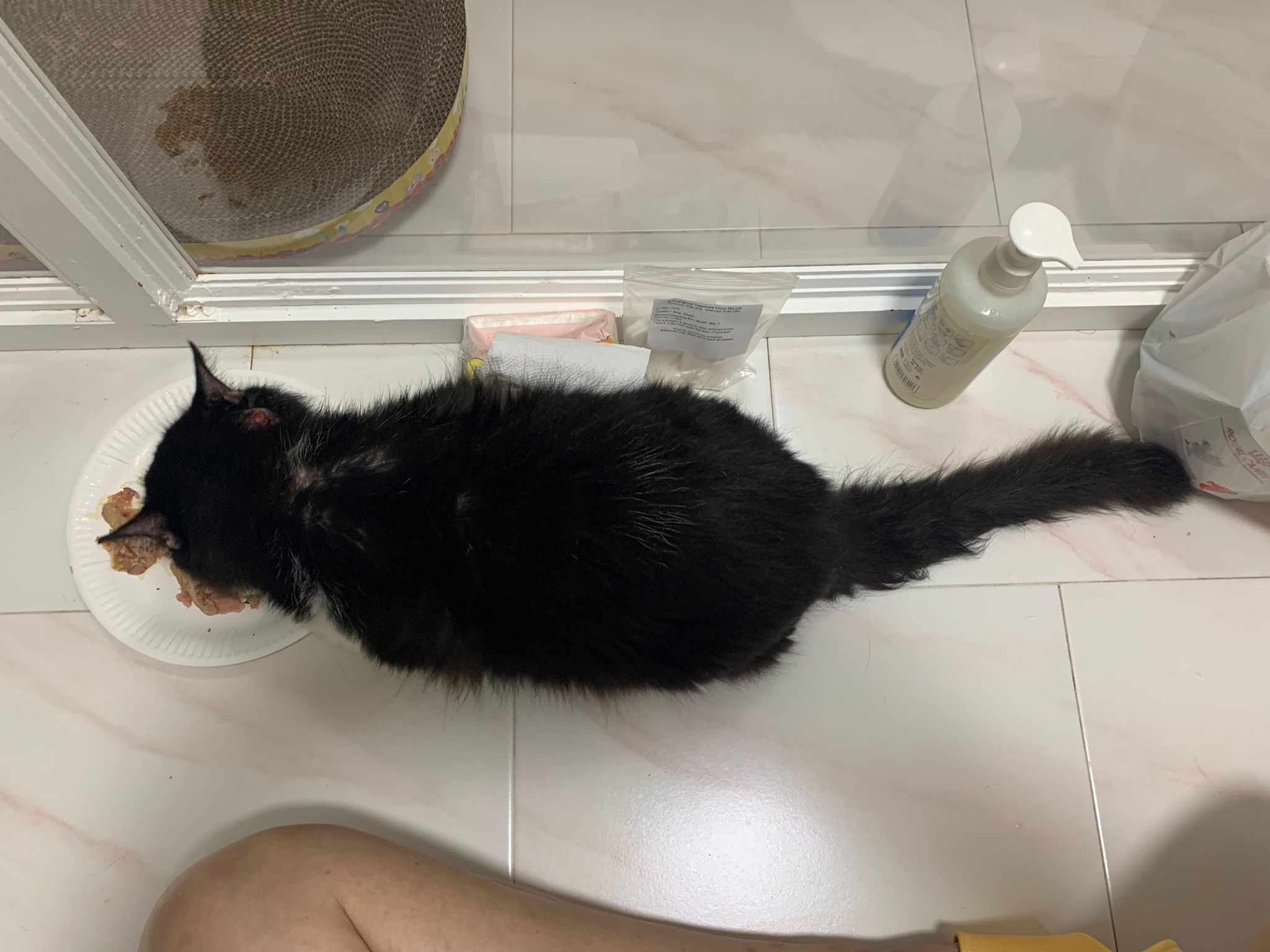 Fur are very sticky (lucky no matted fur). Tail very bad, means I got more spots I need to clean and medicate. He is a kicker, he likes to kick pple. Don’t scratch don’t bite.