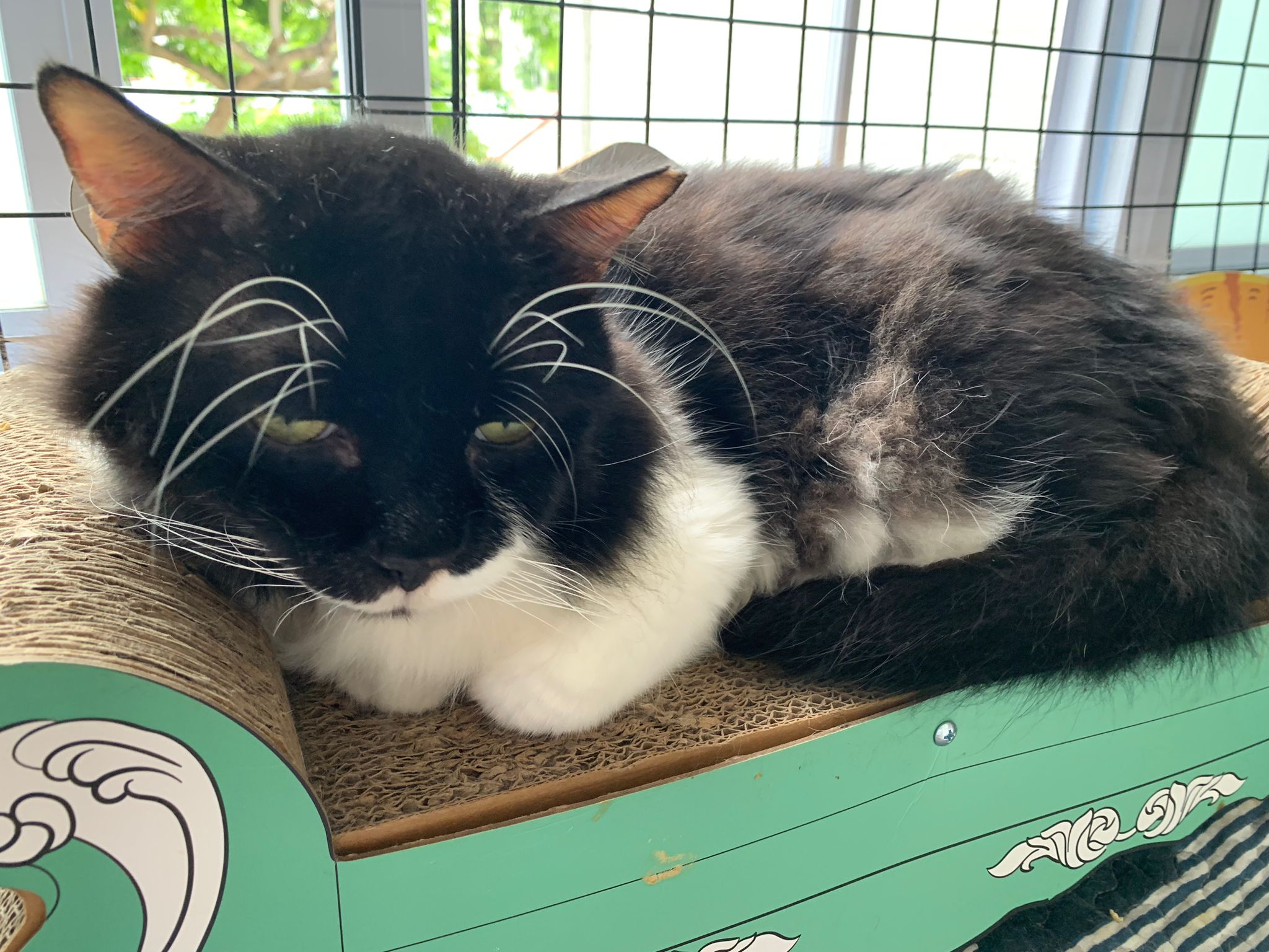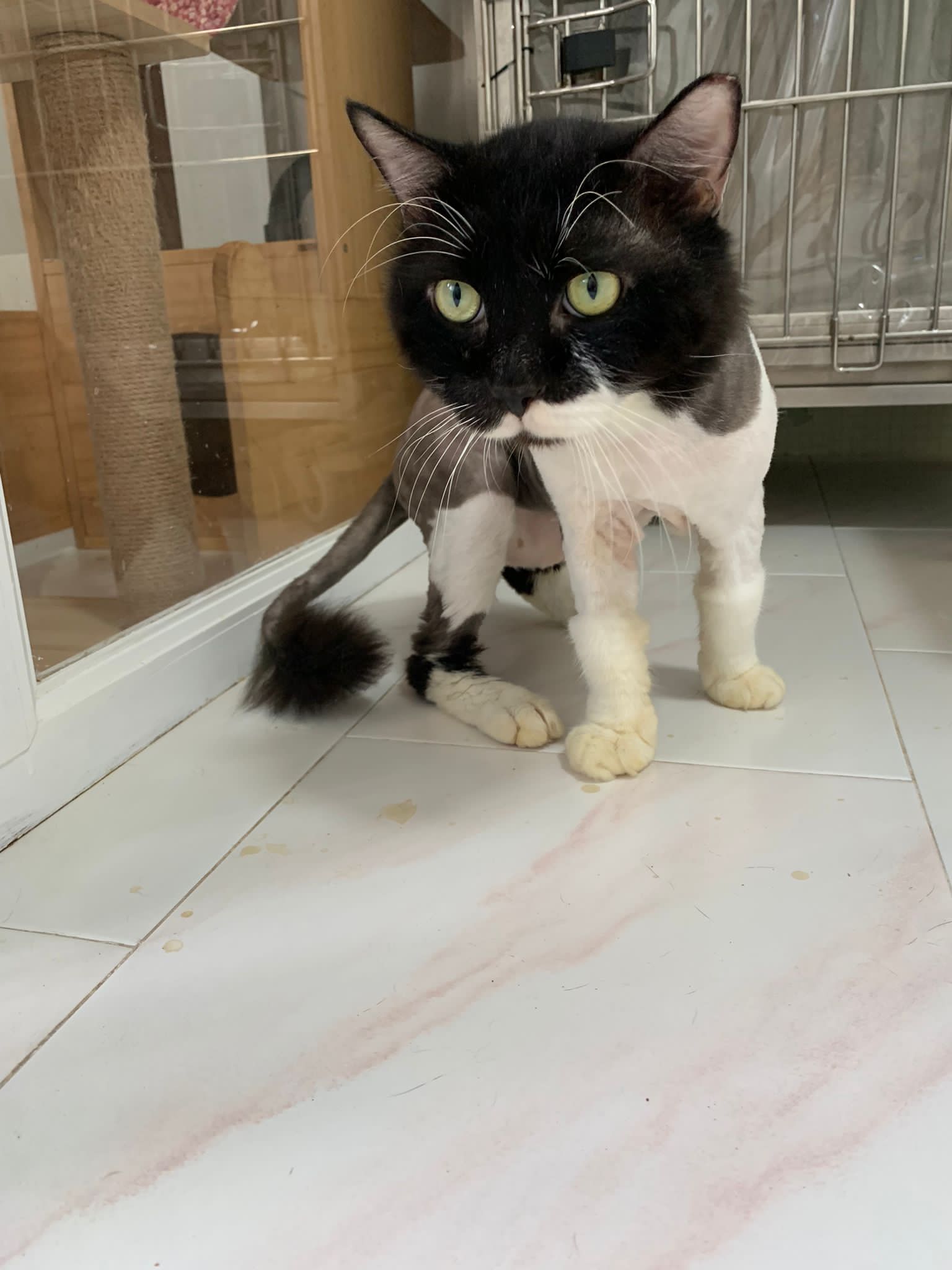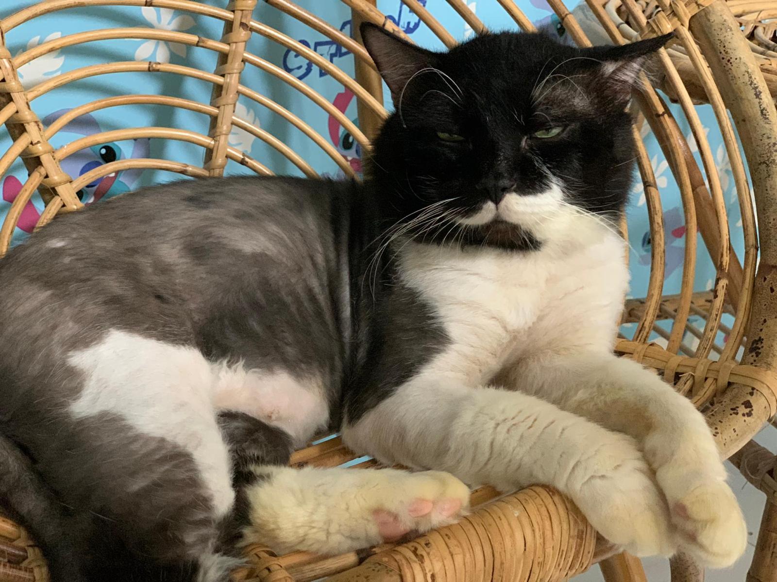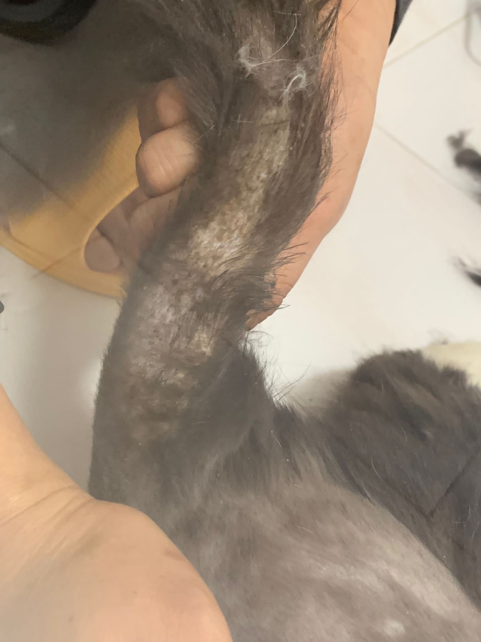 Fur are very sticky (lucky no matted fur). Tail very bad, means I got more spots I need to clean and medicate. He is a kicker, he likes to kick pple. Don’t scratch don’t bite.