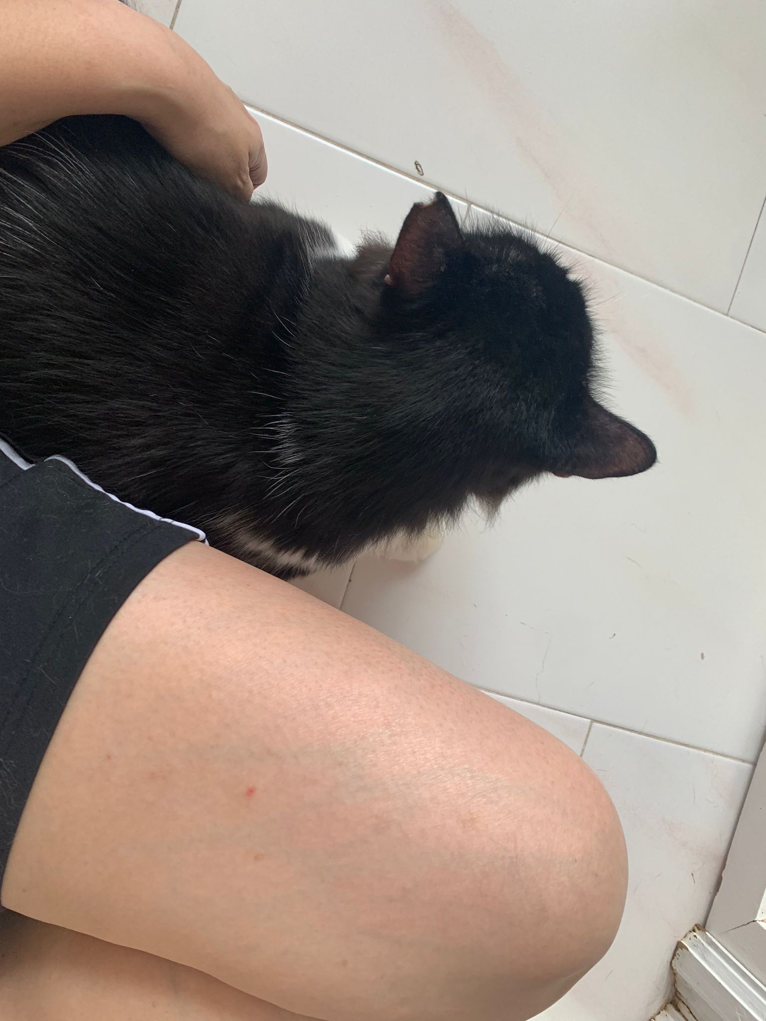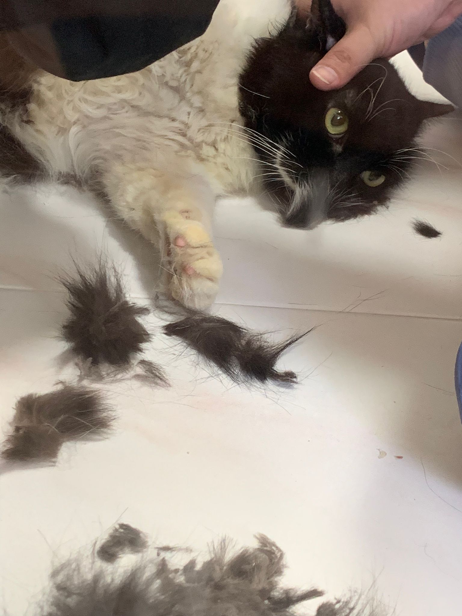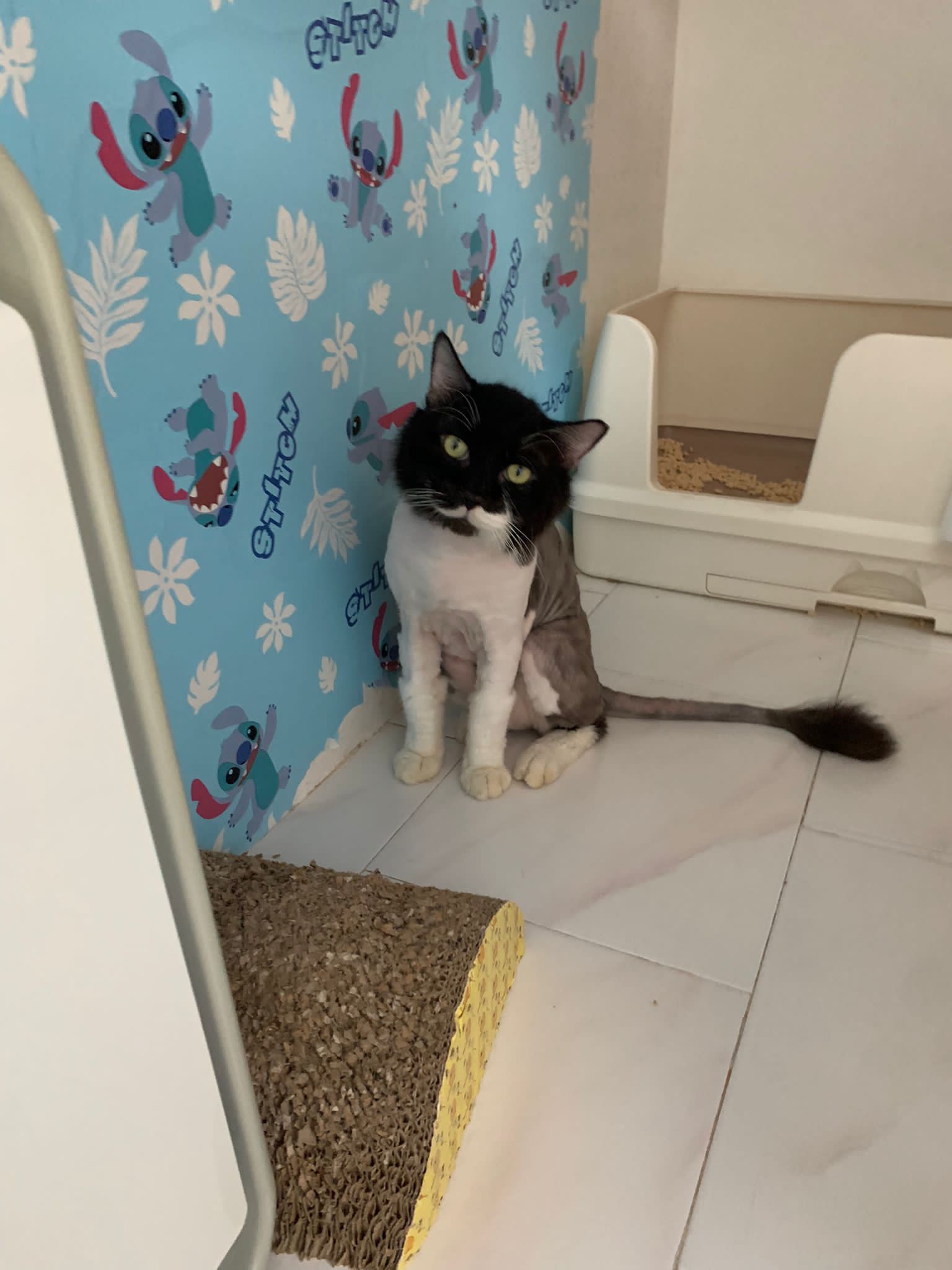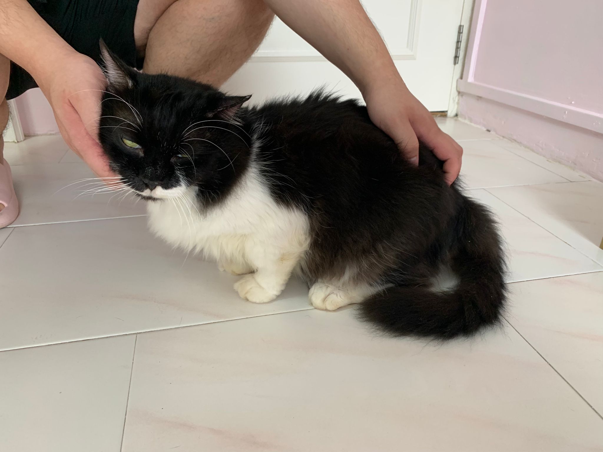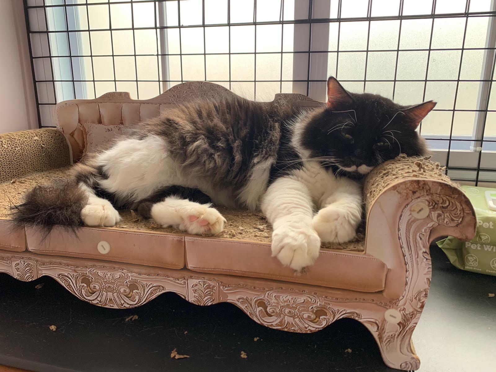 Fur are very sticky (lucky no matted fur). Tail very bad, means I got more spots I need to clean and medicate. He is a kicker, he likes to kick pple. Don’t scratch don’t bite.