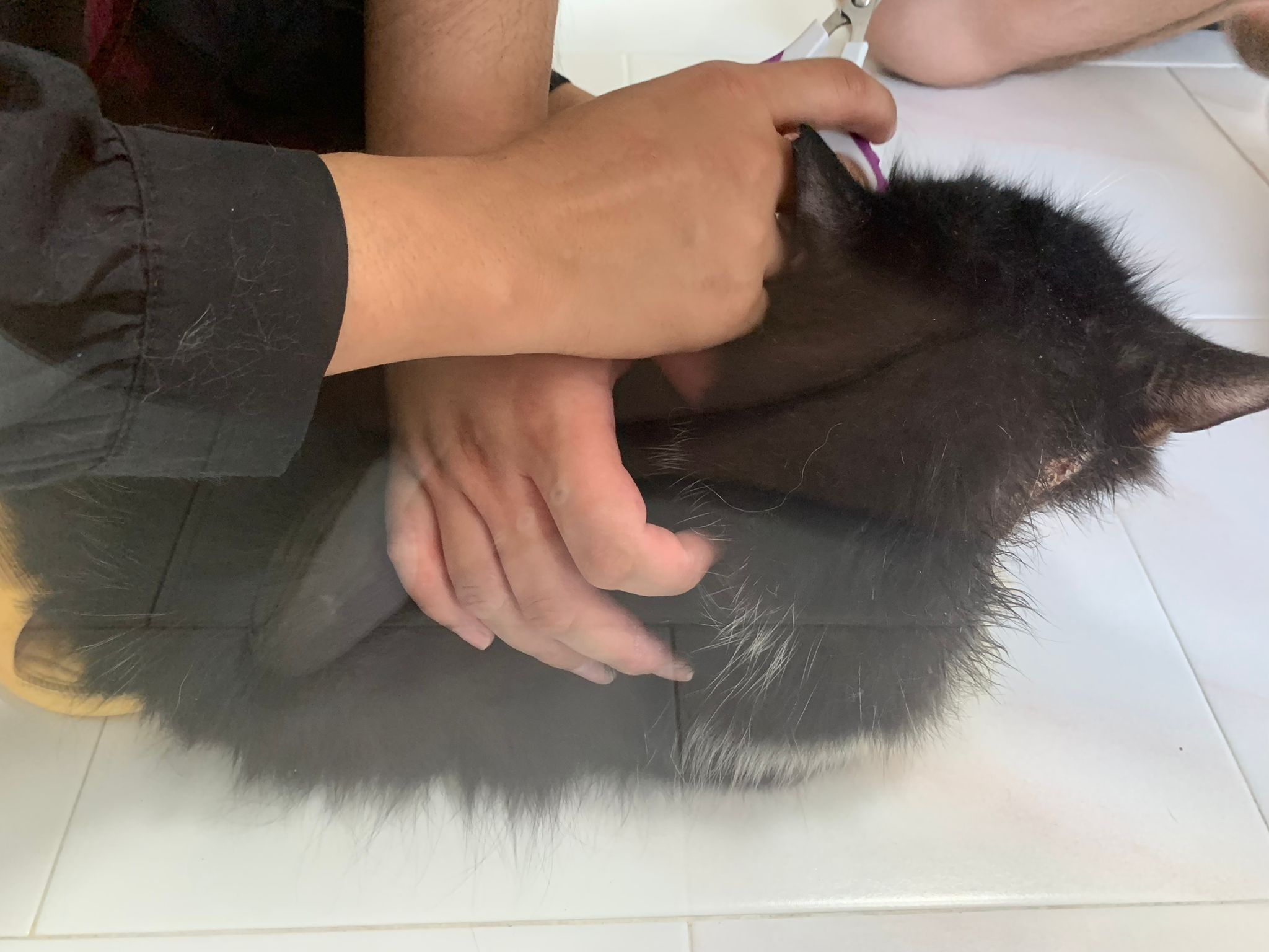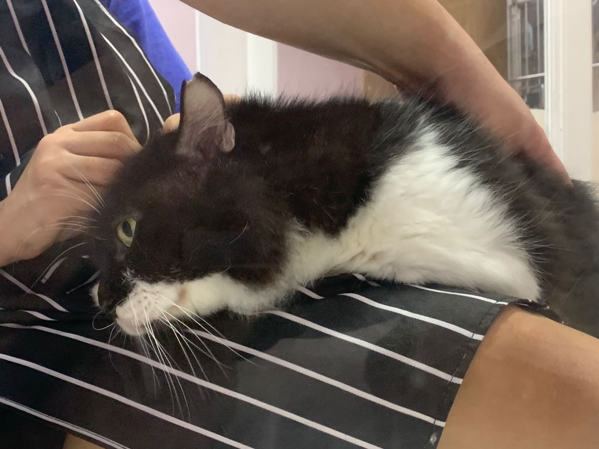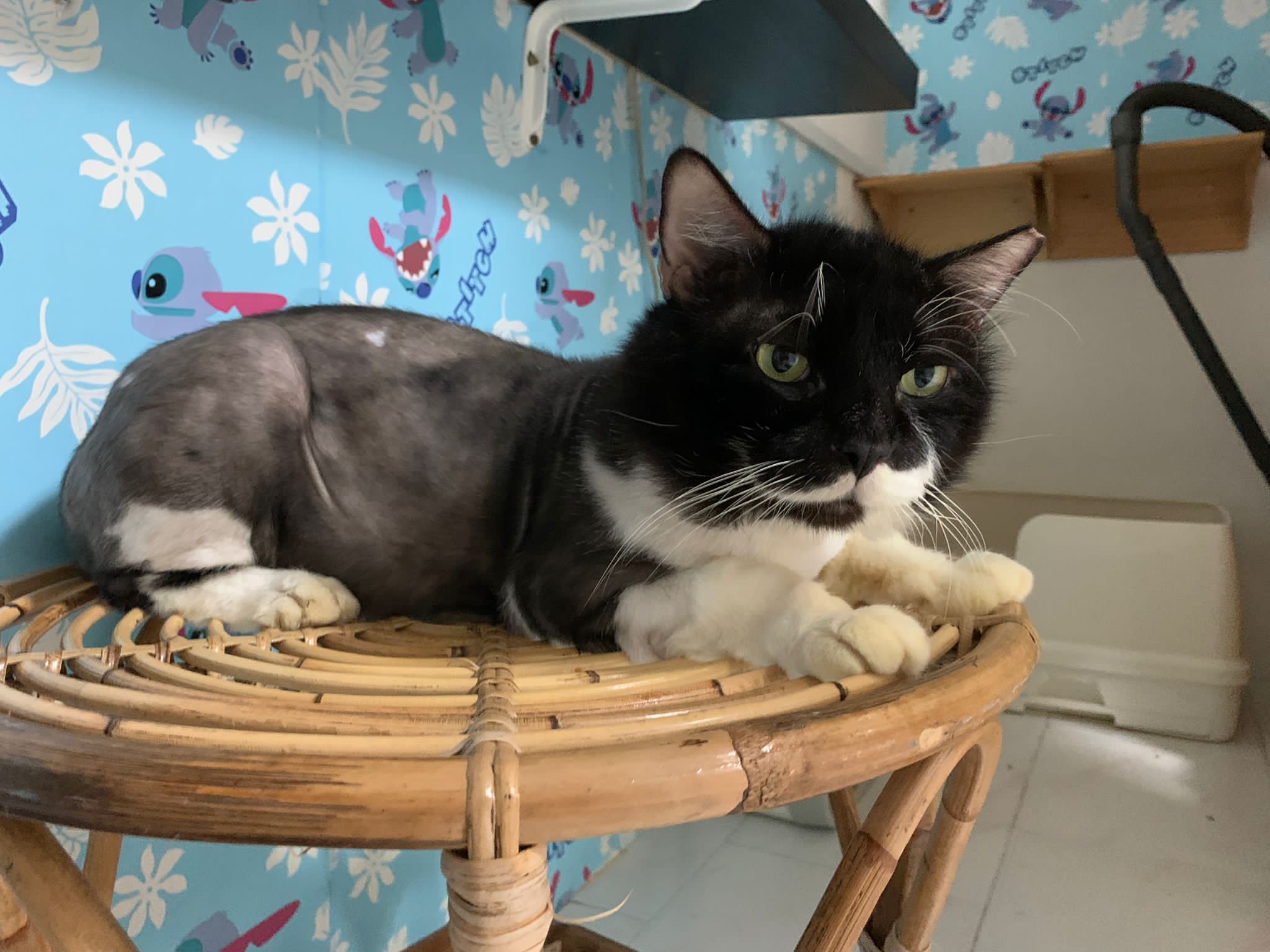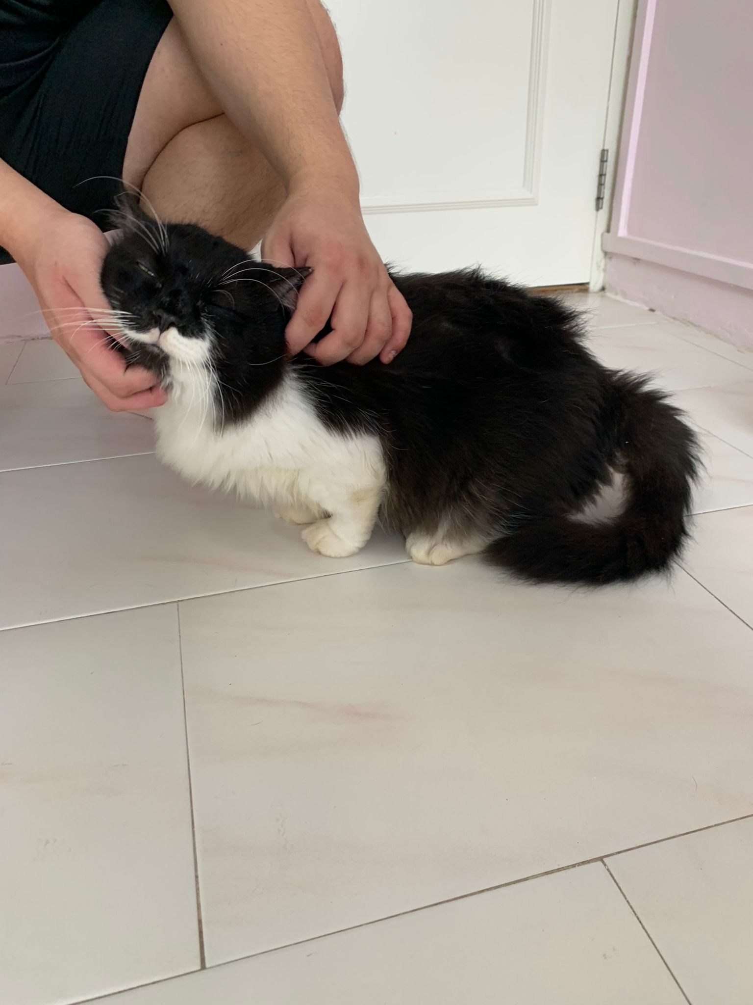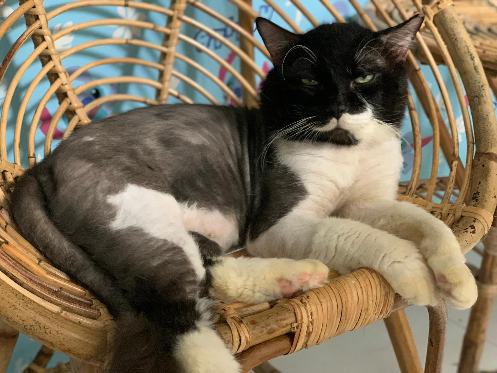Fur are very sticky (lucky no matted fur). Tail very bad, means I got more spots I need to clean and medicate. He is a kicker, he likes to kick pple. Don’t scratch don’t bite.
