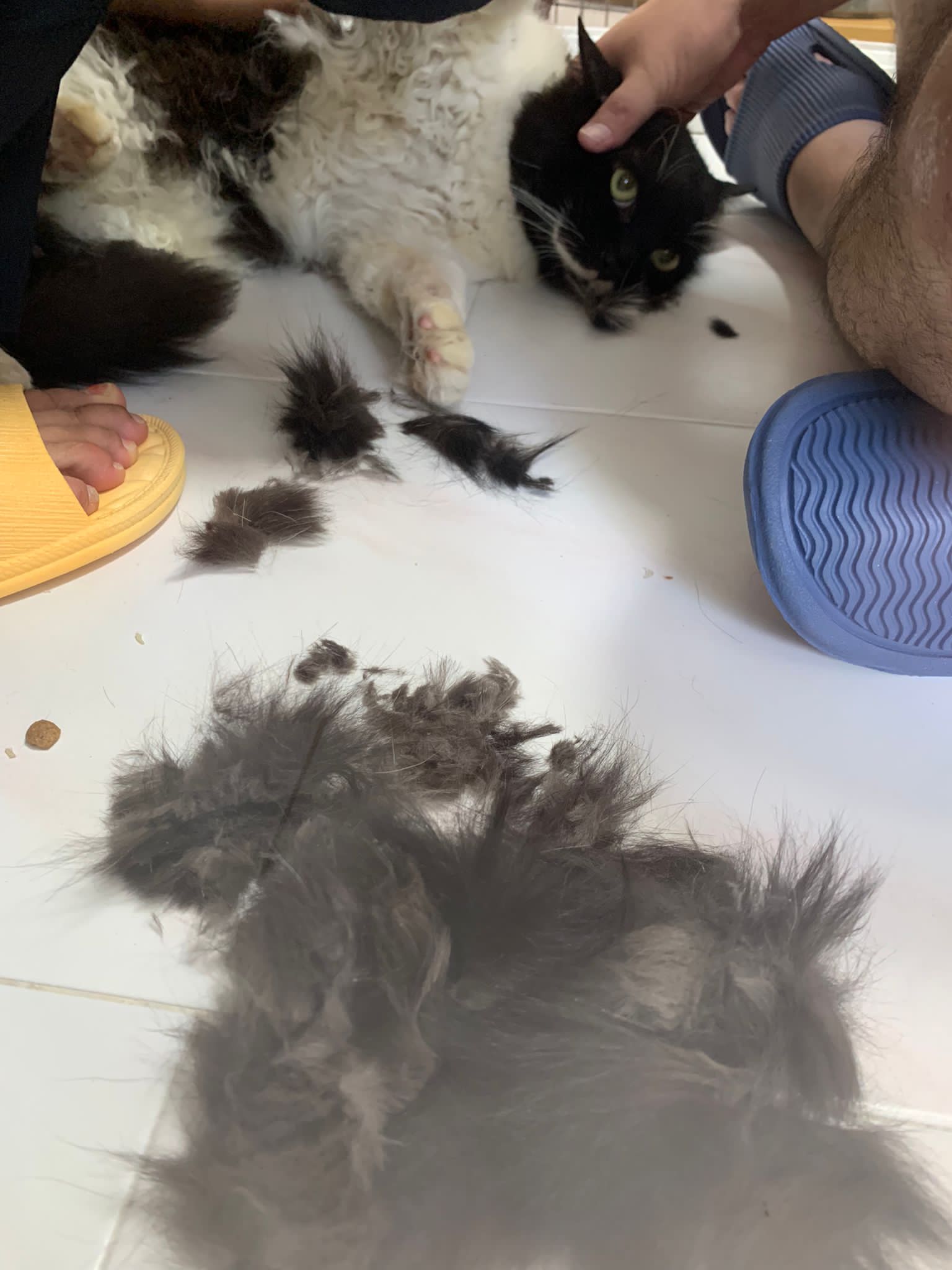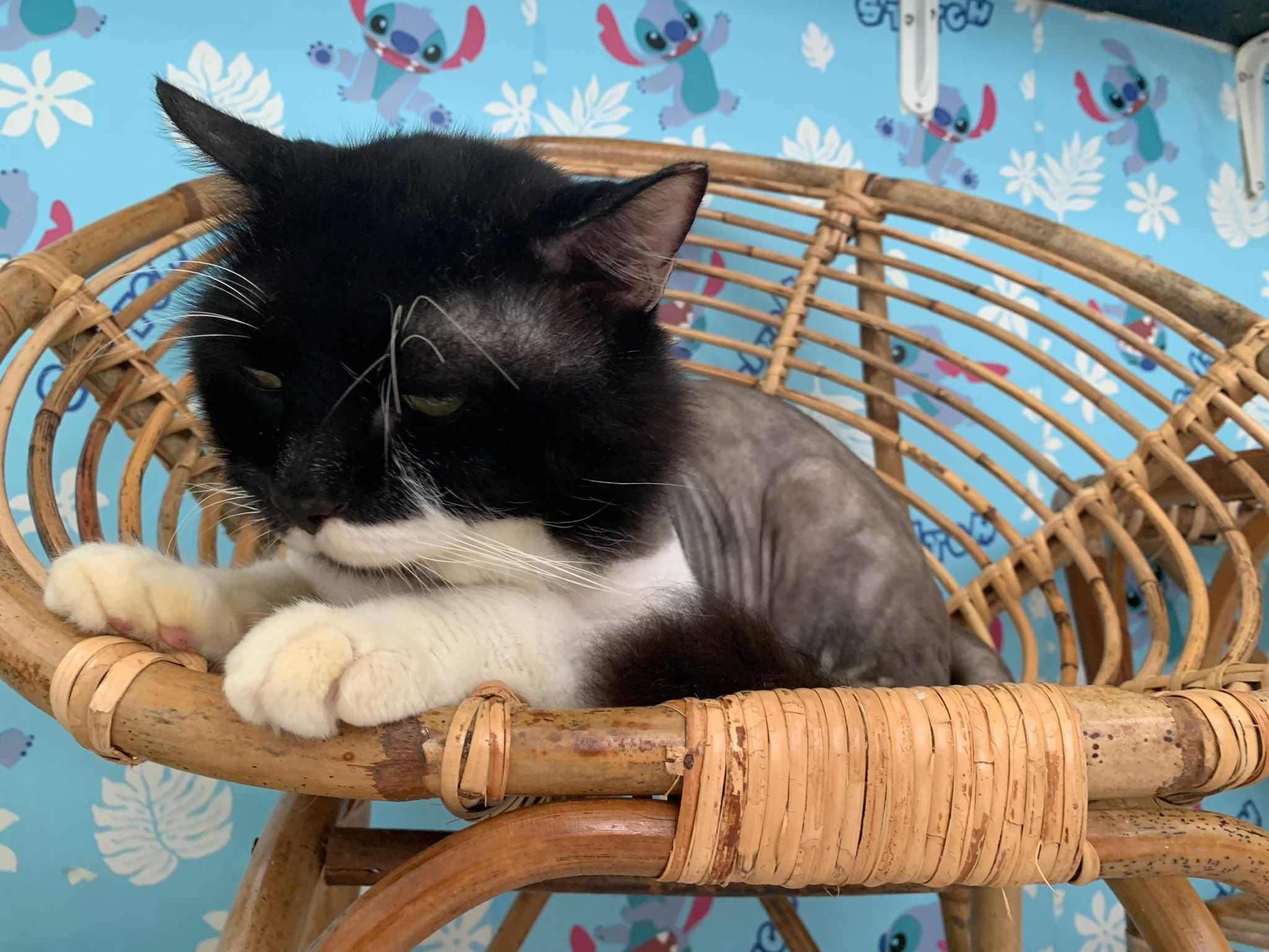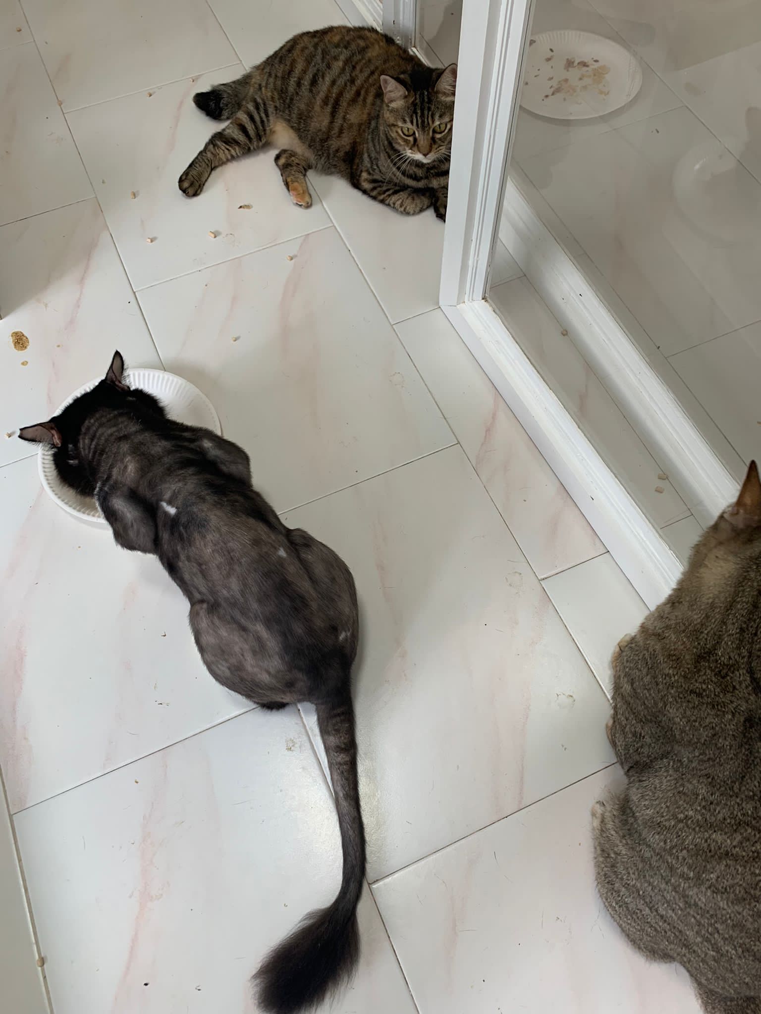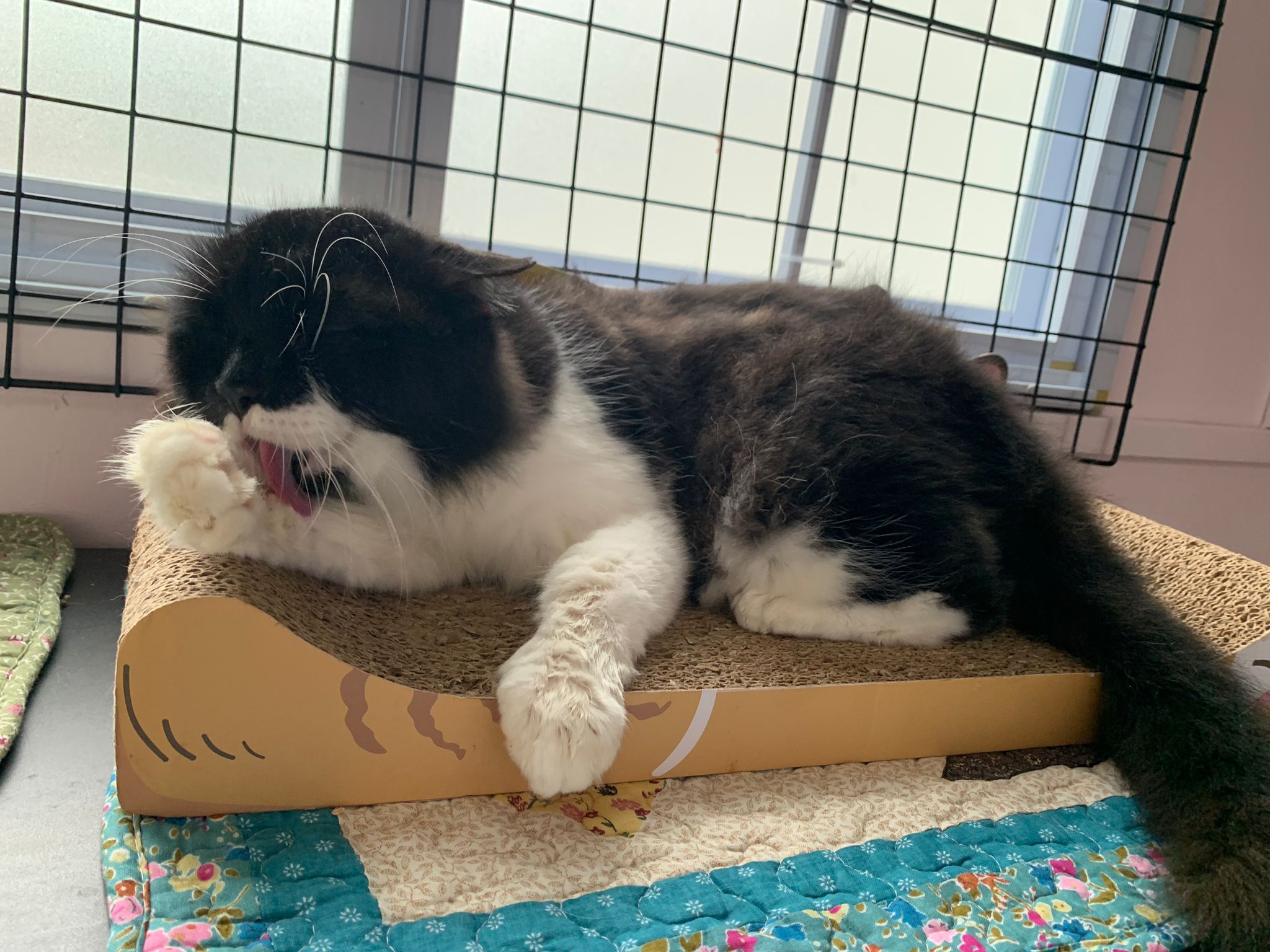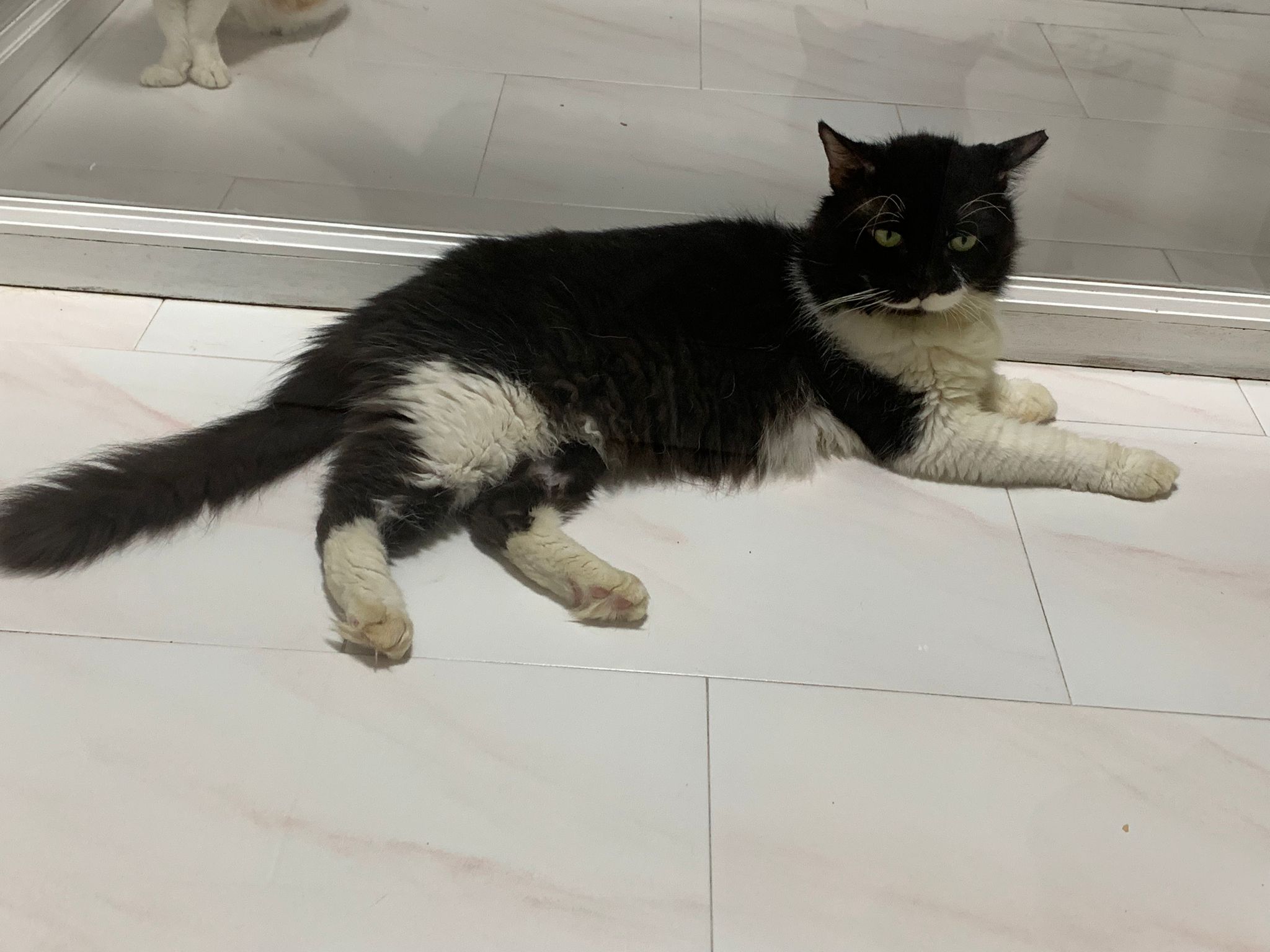 Fur are very sticky (lucky no matted fur). Tail very bad, means I got more spots I need to clean and medicate. He is a kicker, he likes to kick pple. Don’t scratch don’t bite.