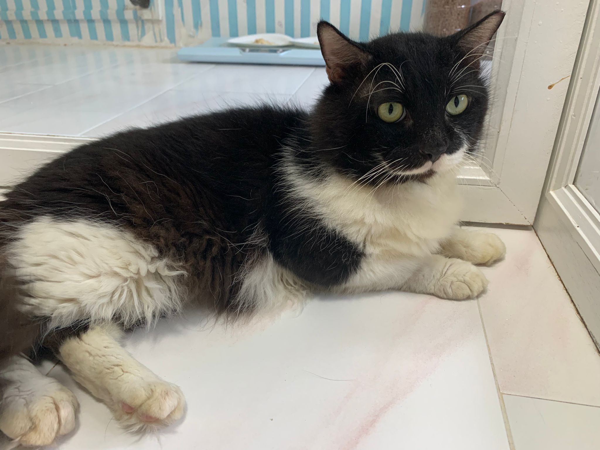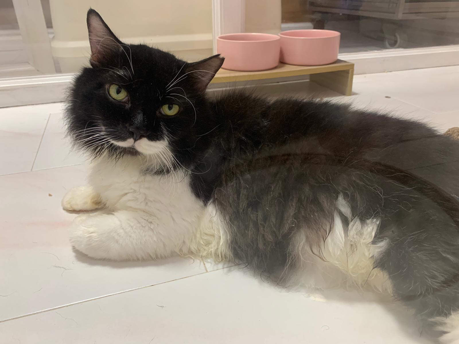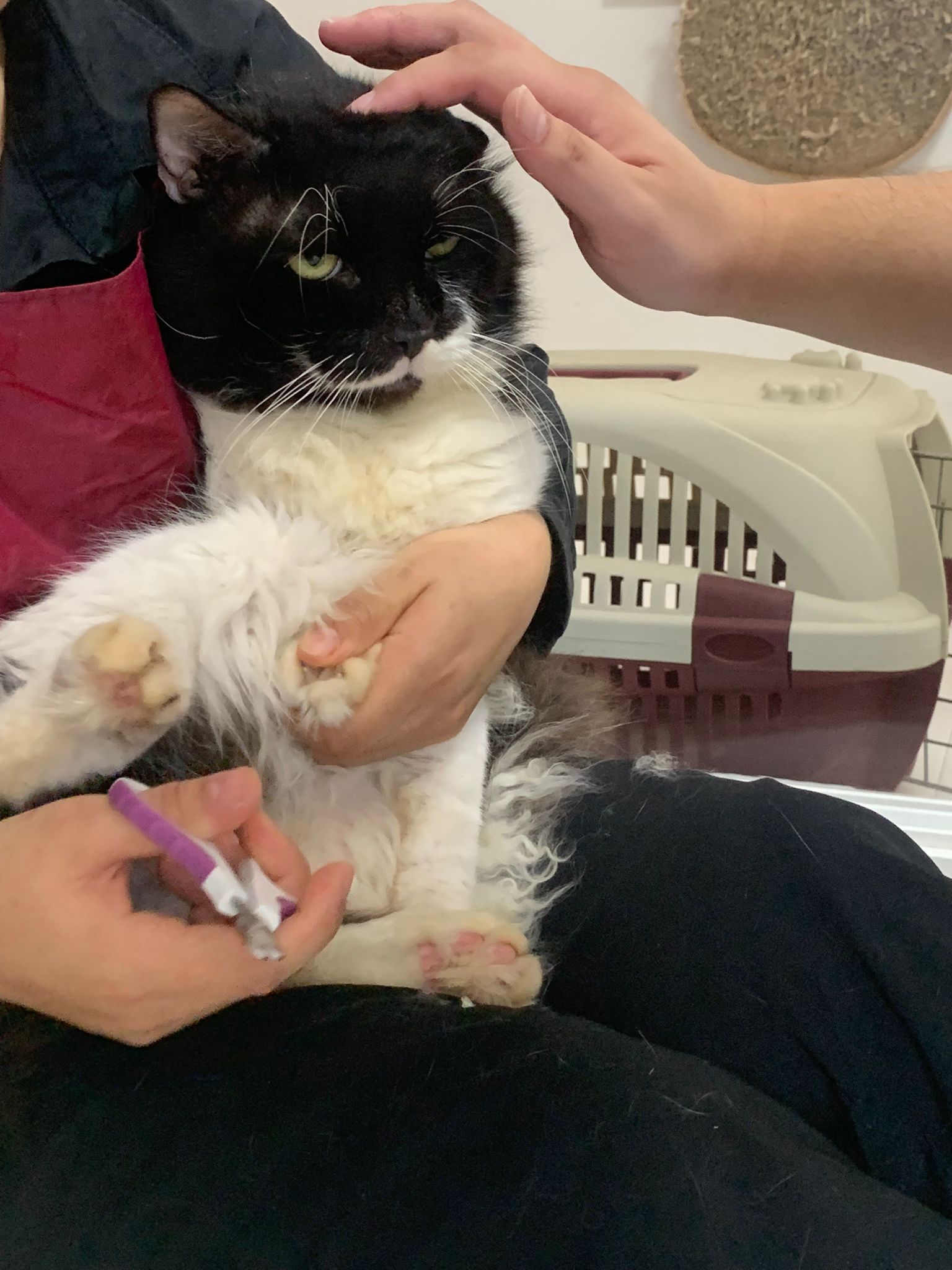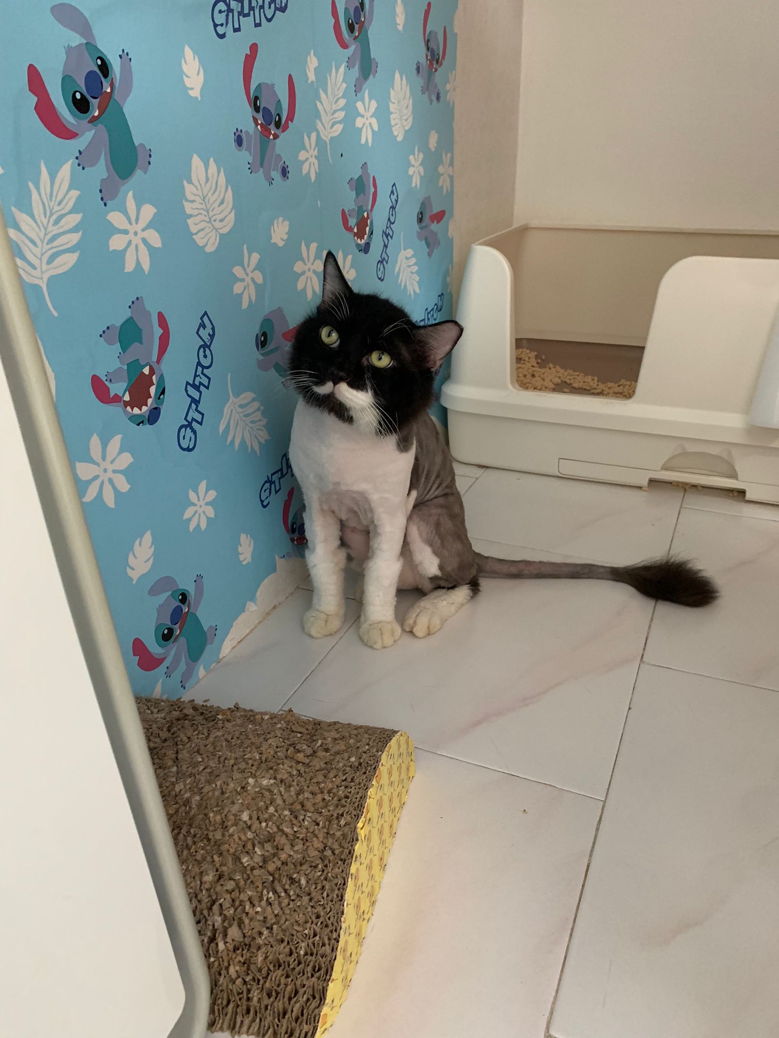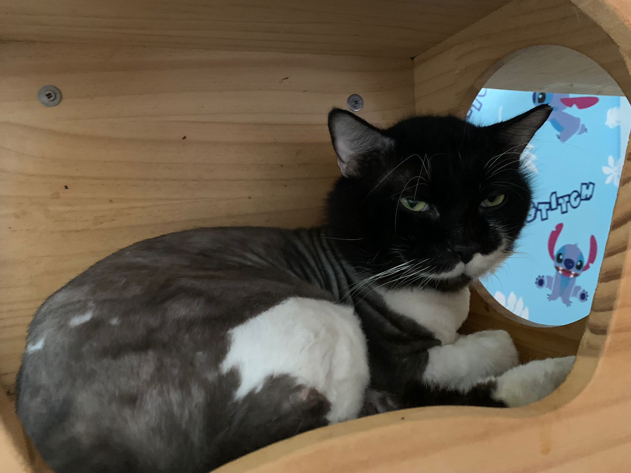 Fur are very sticky (lucky no matted fur). Tail very bad, means I got more spots I need to clean and medicate. He is a kicker, he likes to kick pple. Don’t scratch don’t bite.