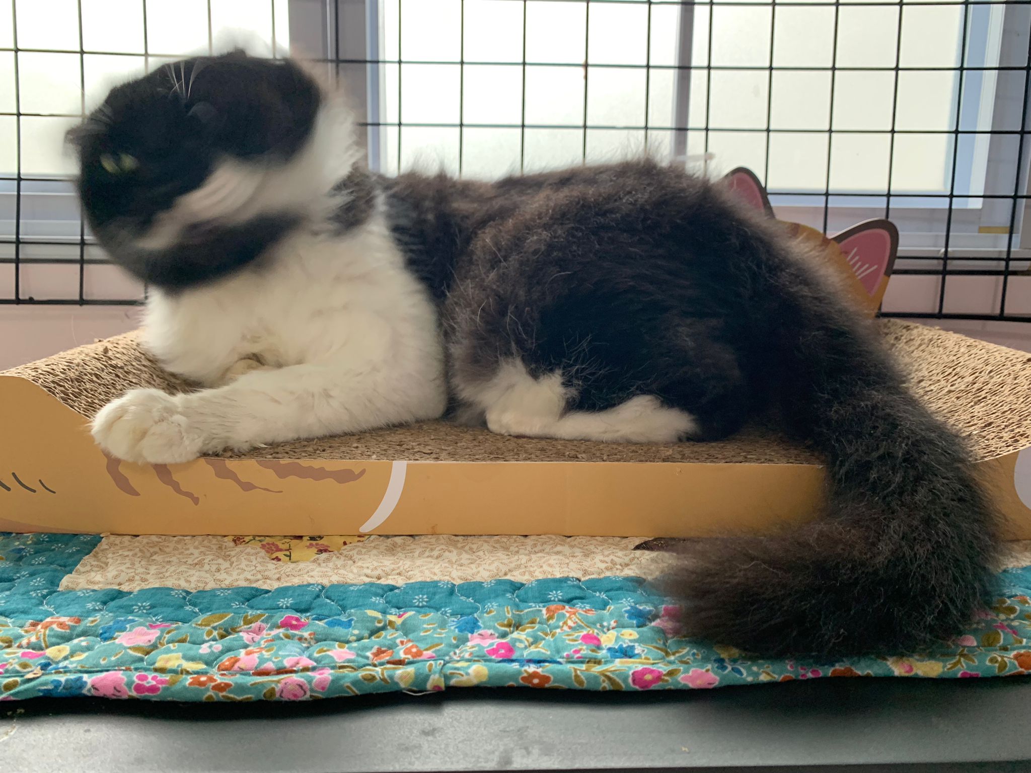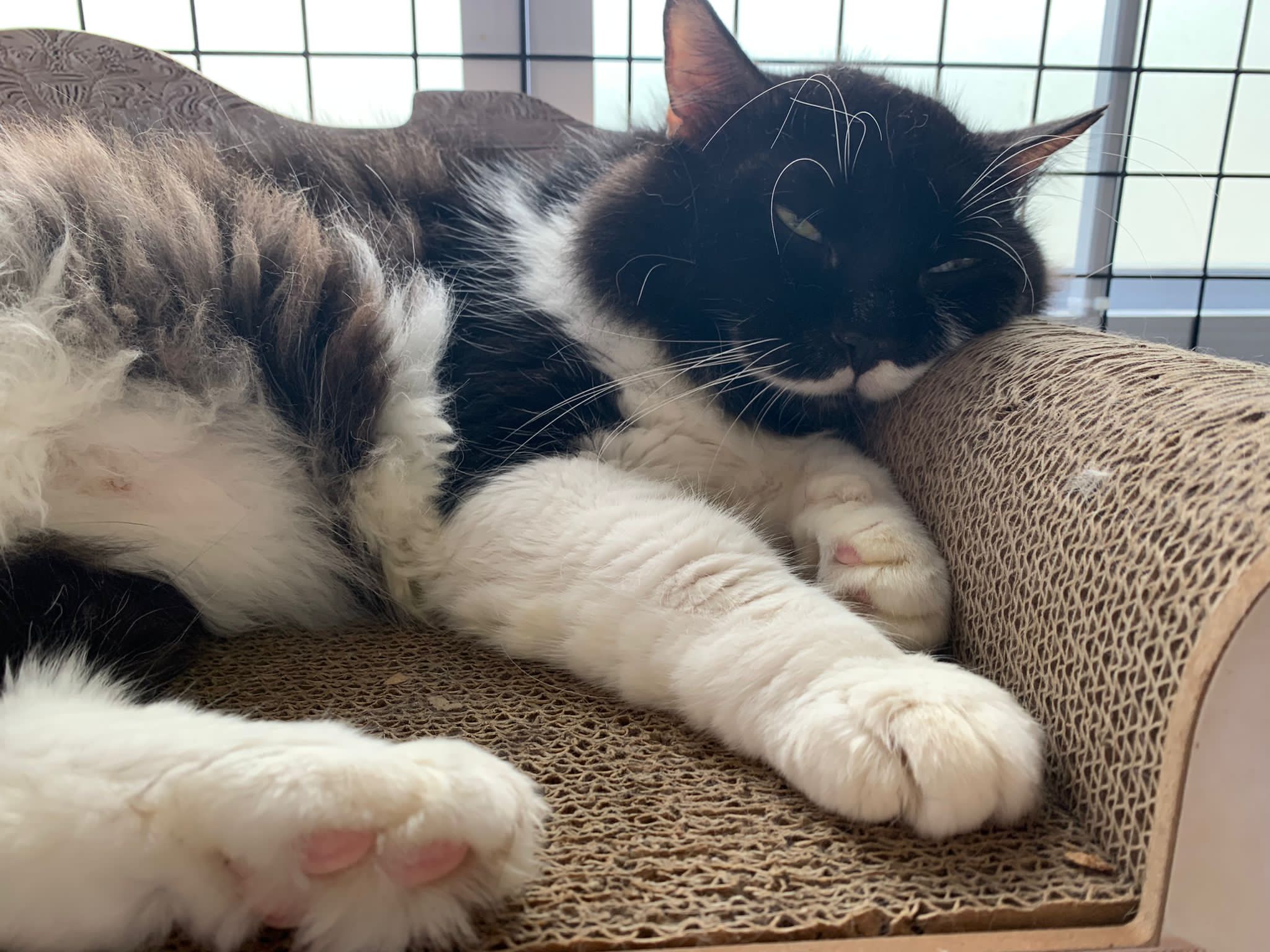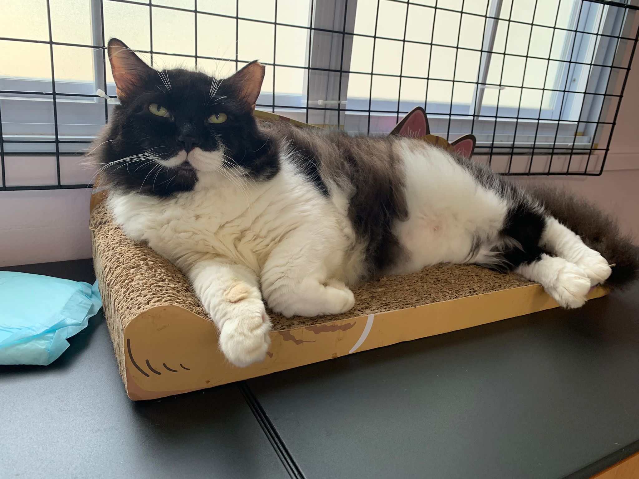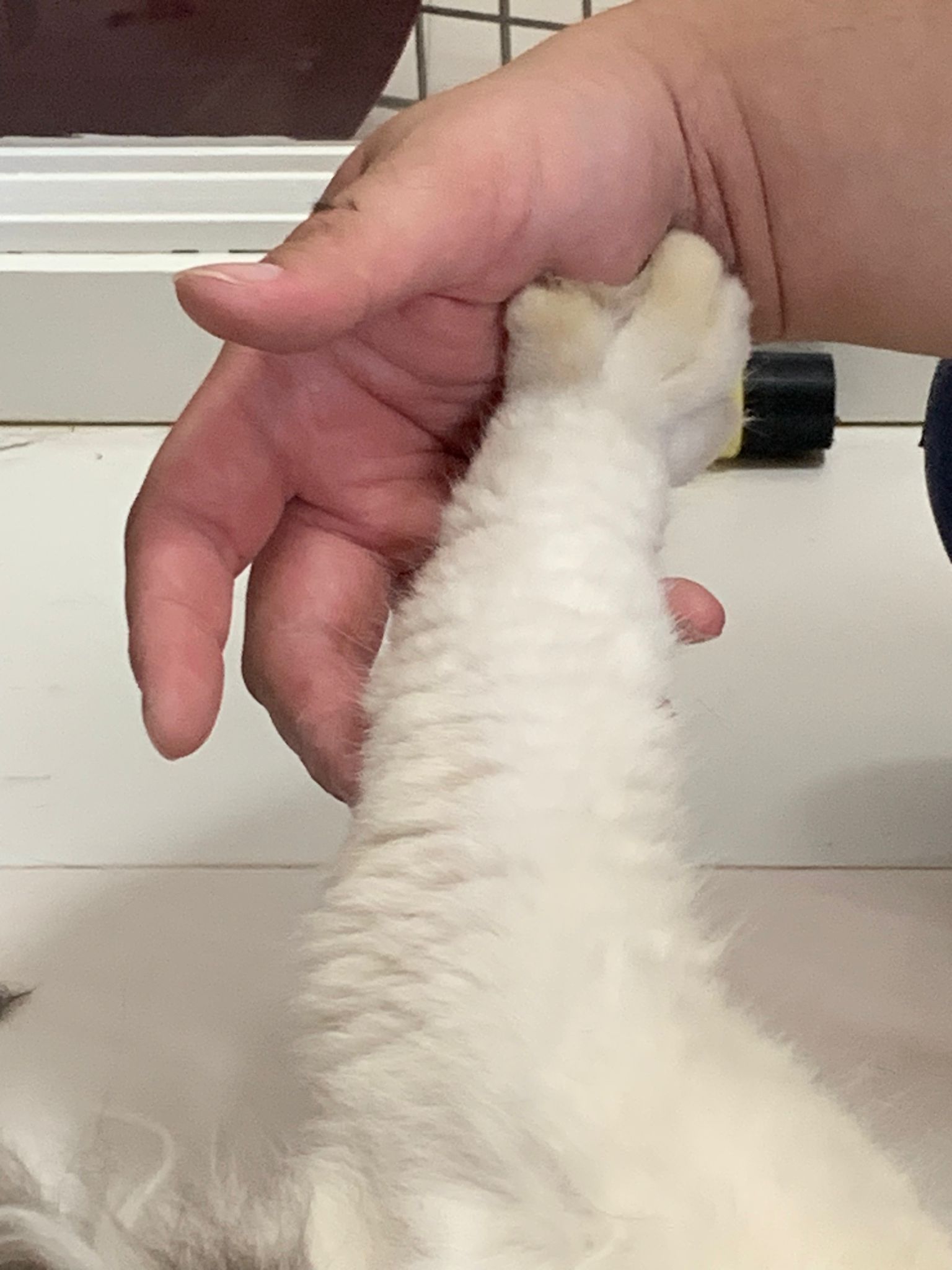 Fur are very sticky (lucky no matted fur). Tail very bad, means I got more spots I need to clean and medicate. He is a kicker, he likes to kick pple. Don’t scratch don’t bite.