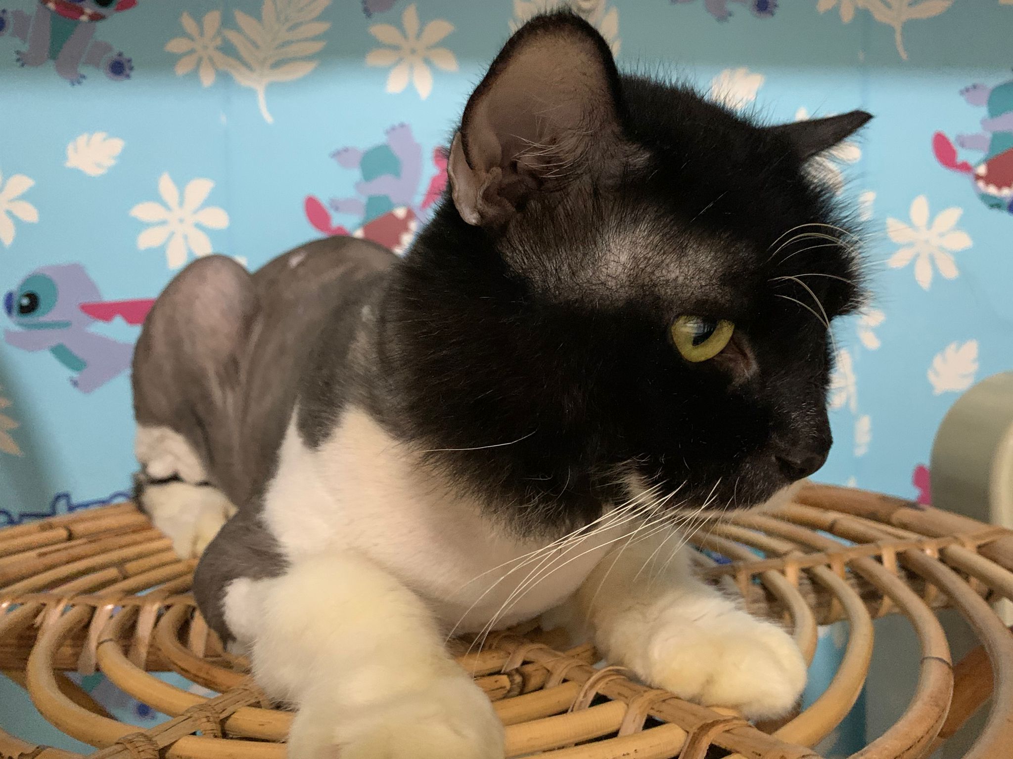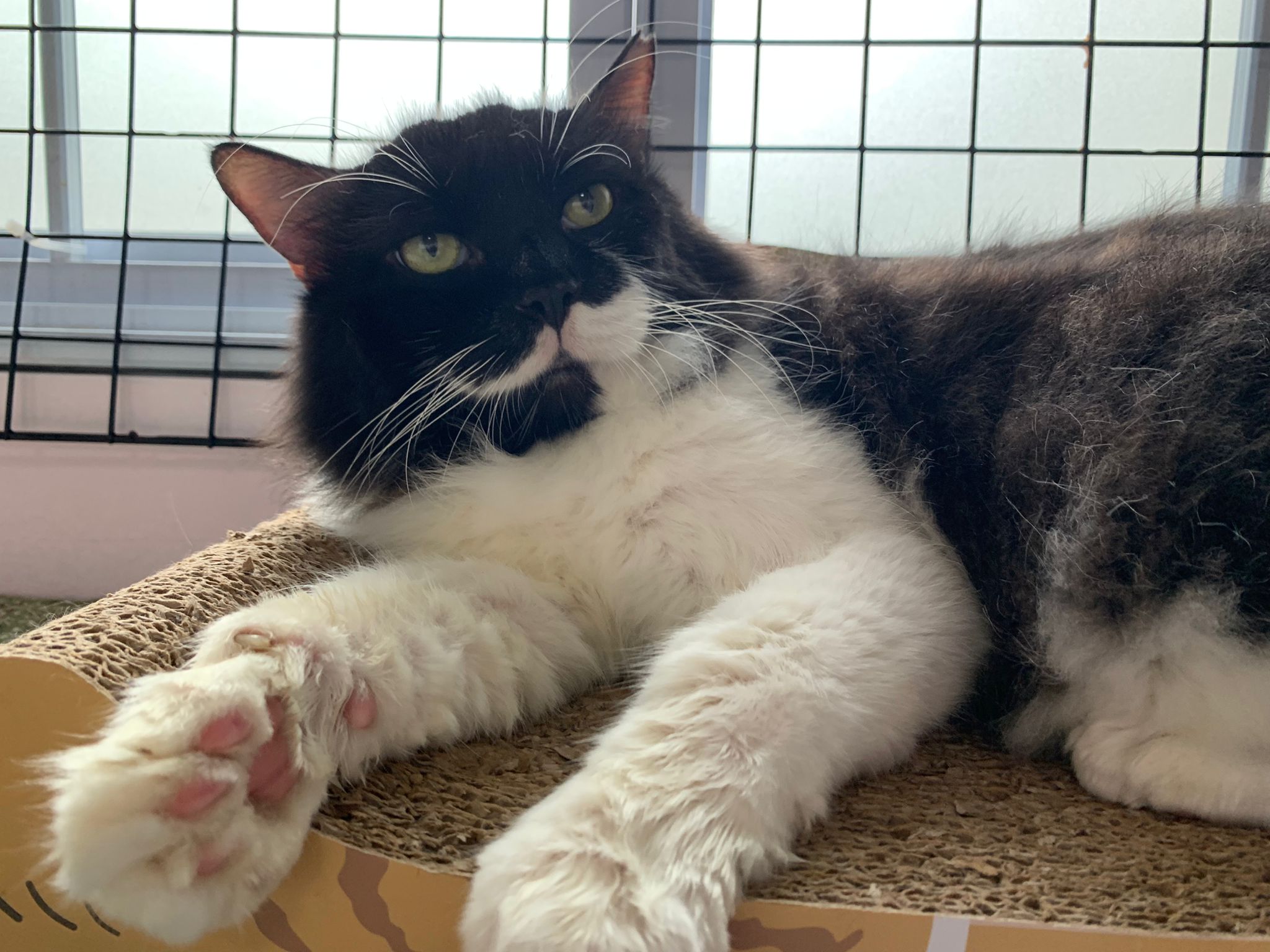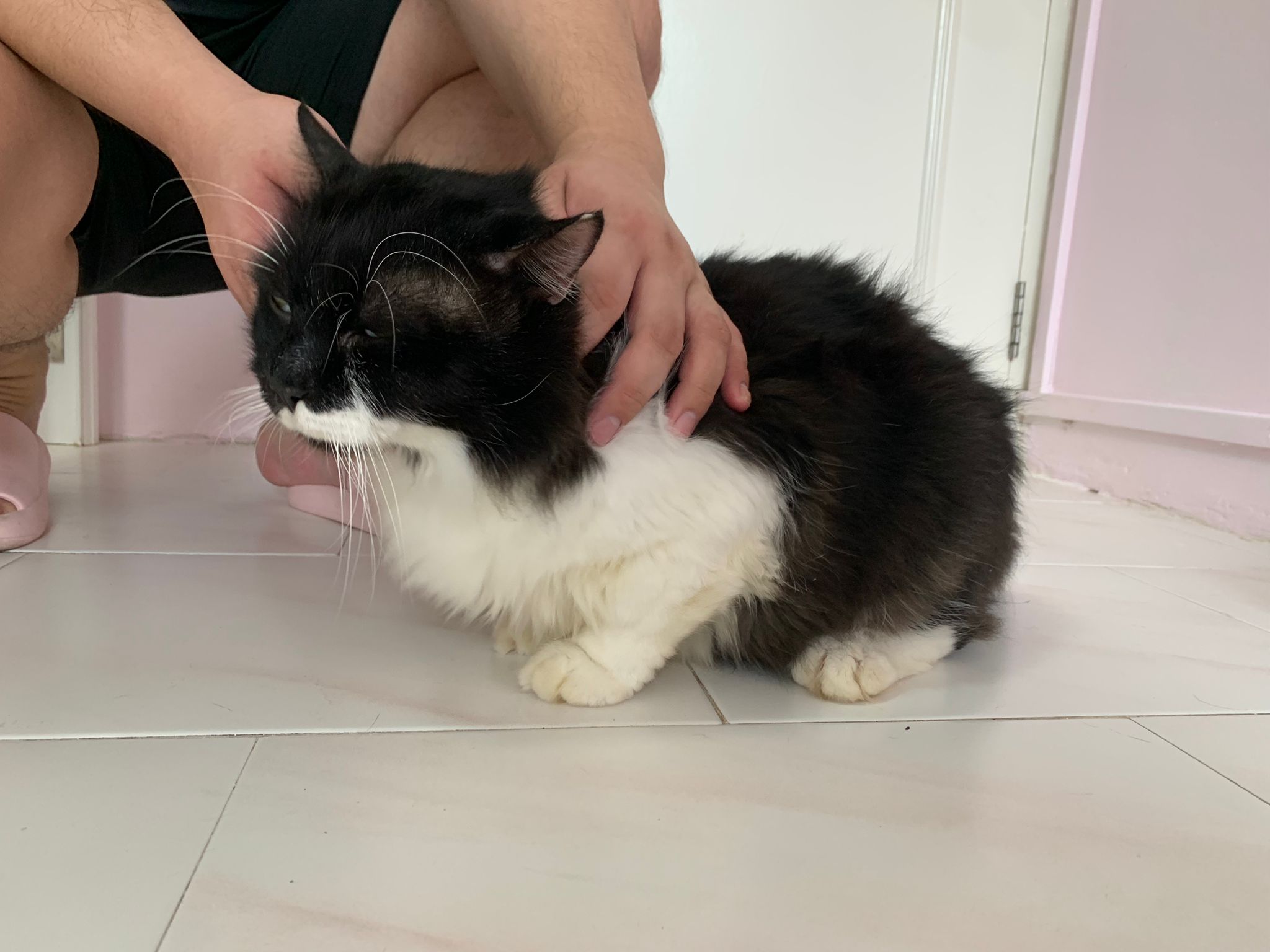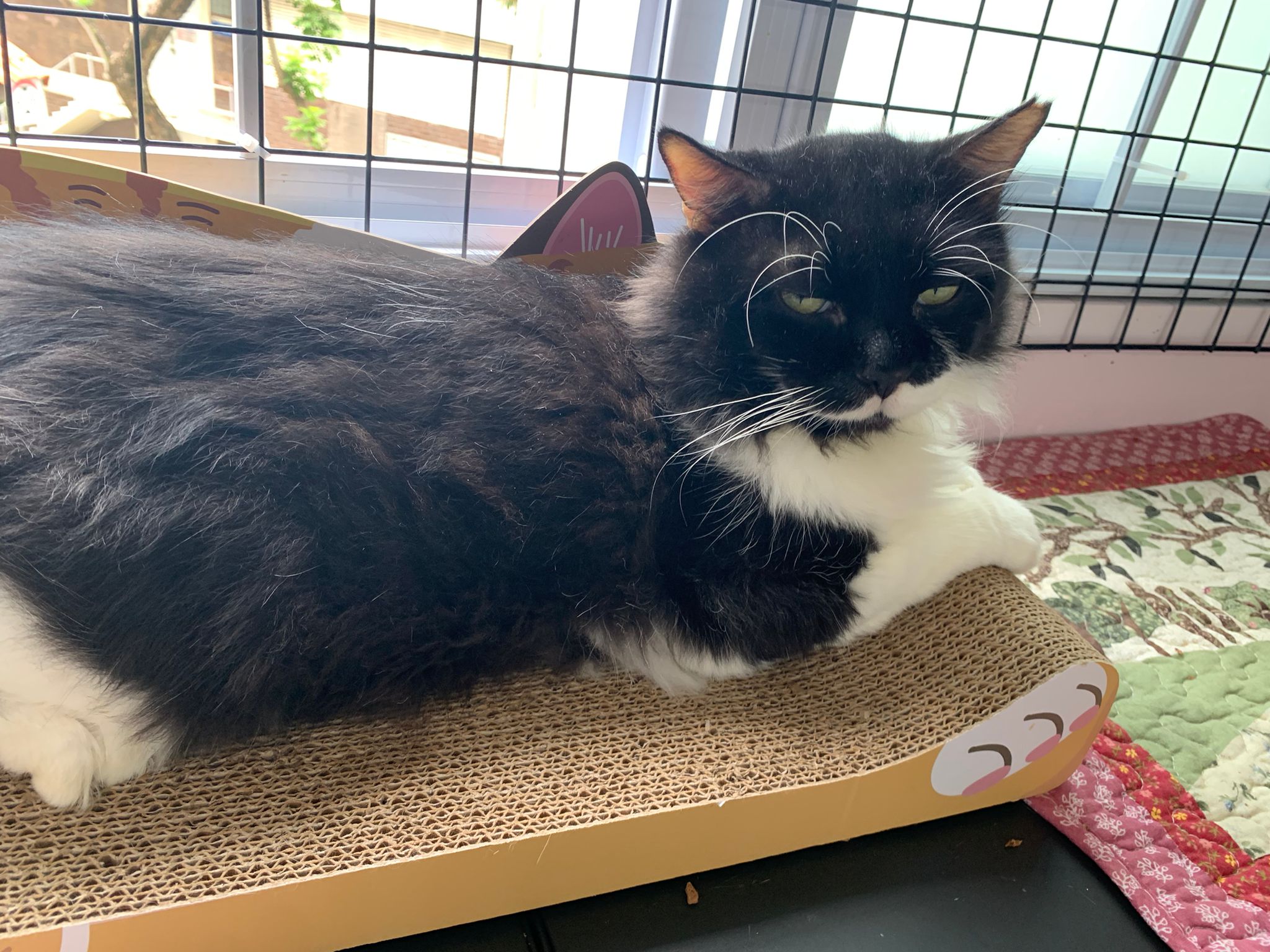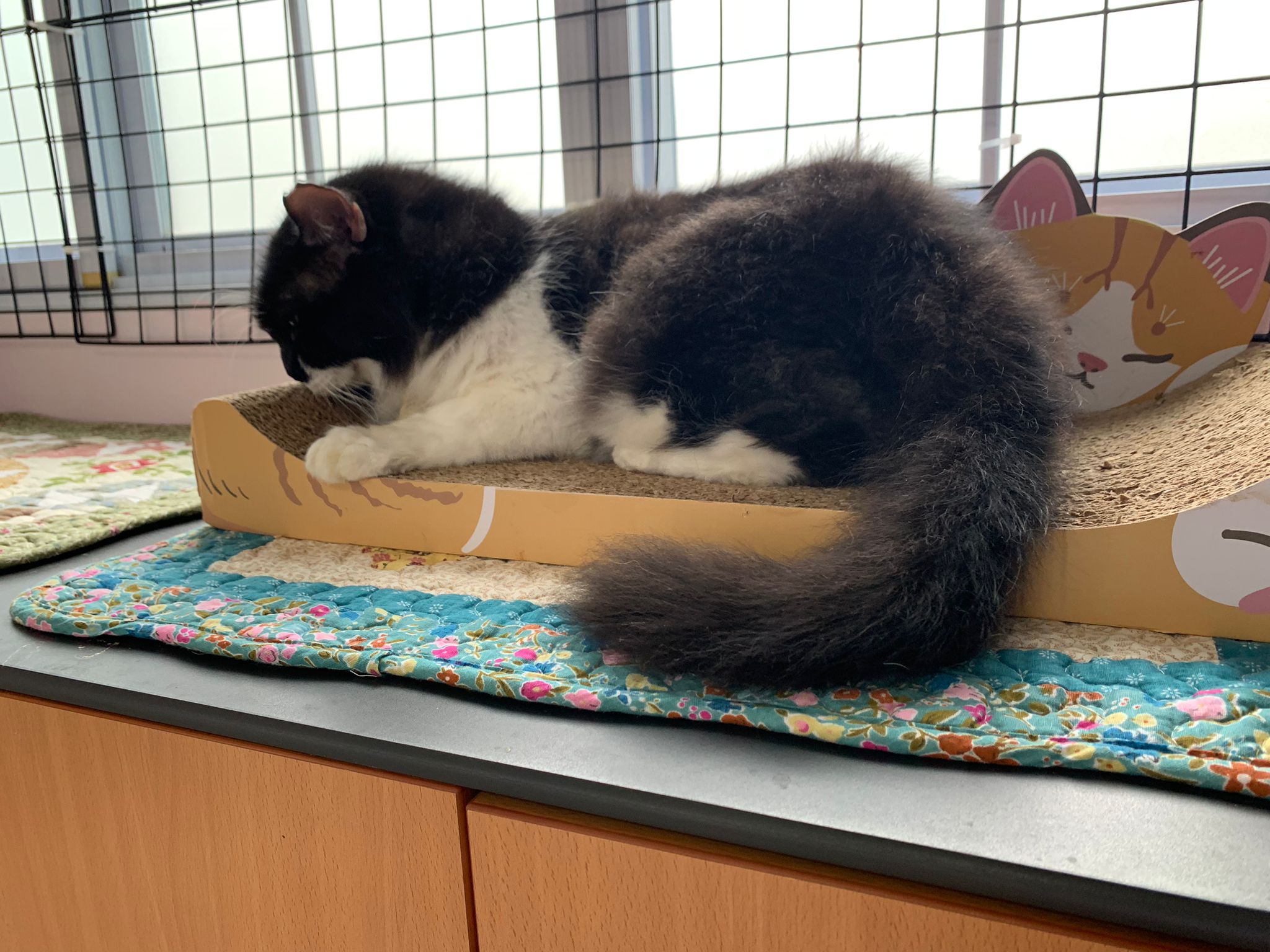 Fur are very sticky (lucky no matted fur). Tail very bad, means I got more spots I need to clean and medicate. He is a kicker, he likes to kick pple. Don’t scratch don’t bite.