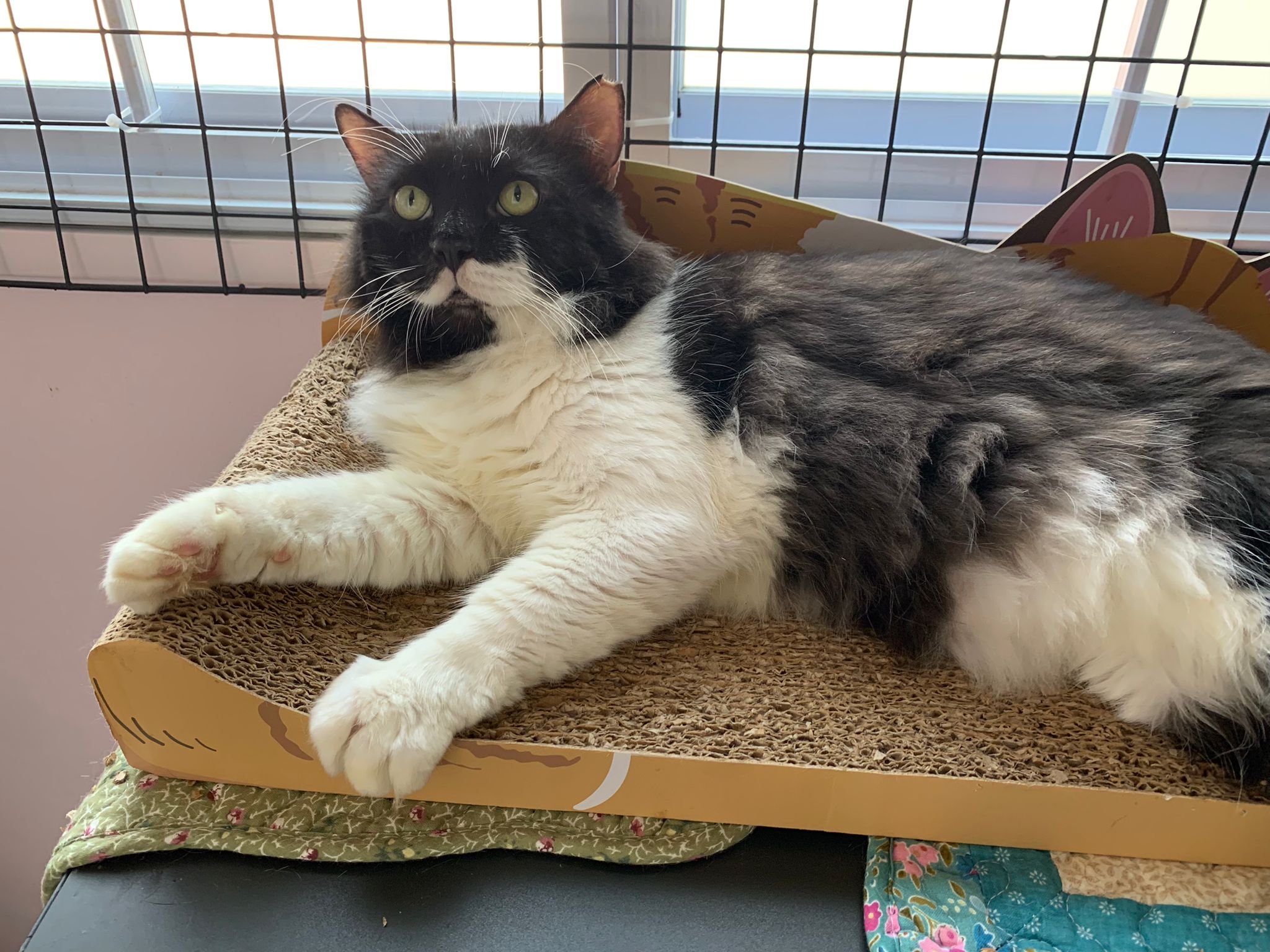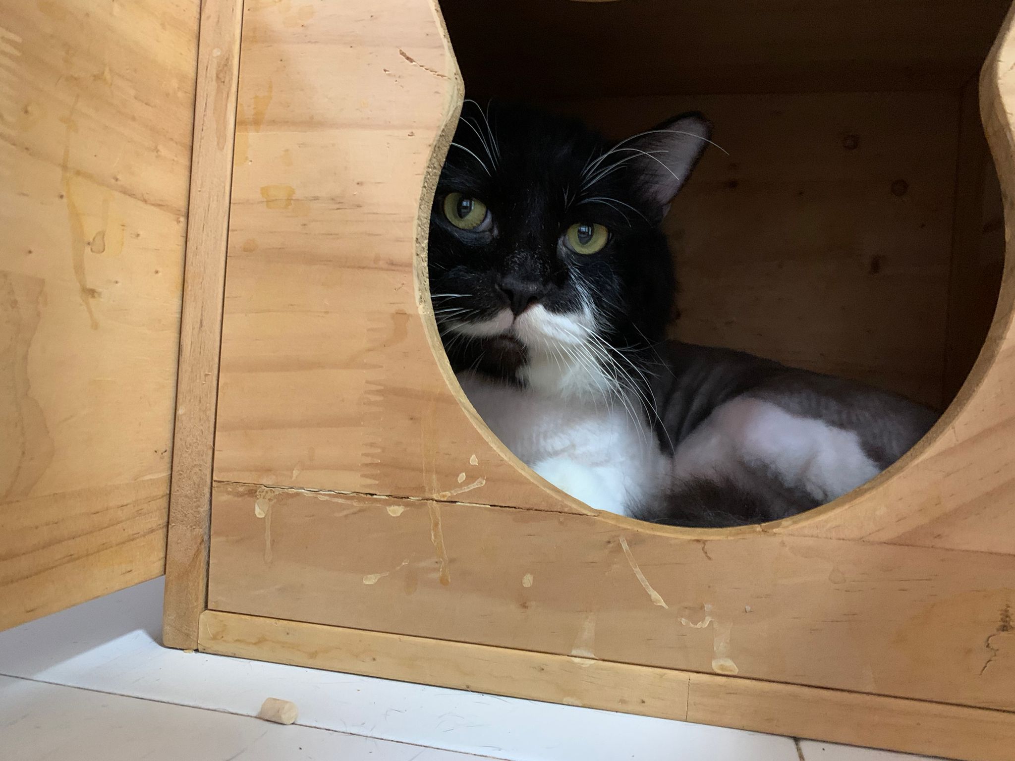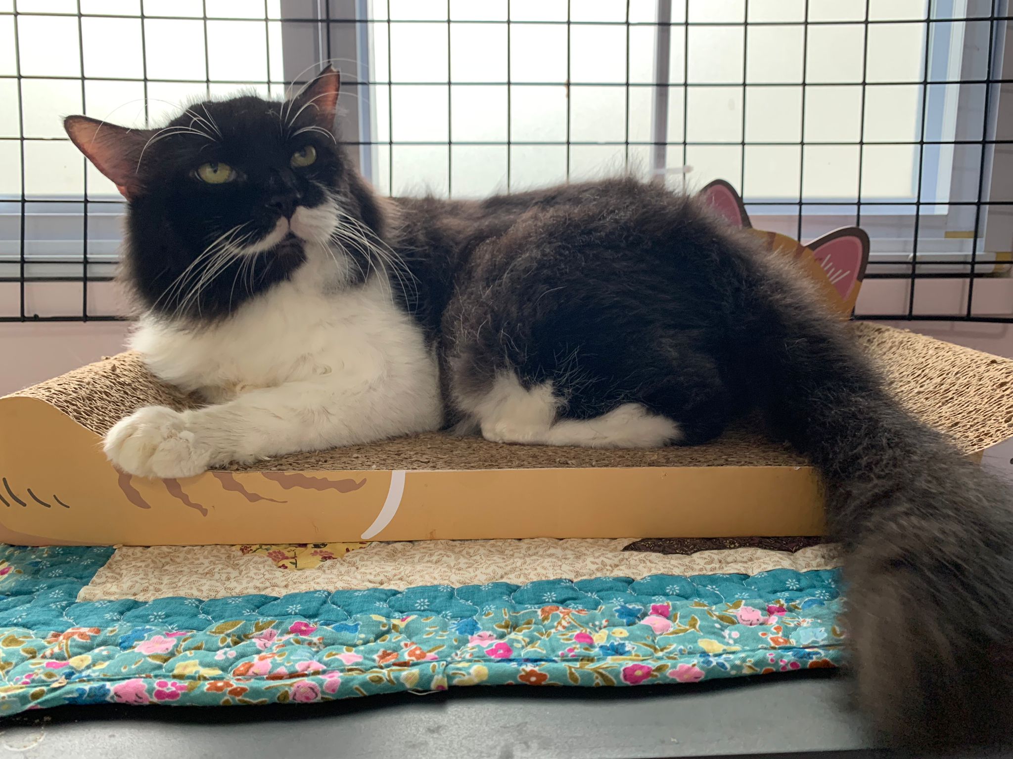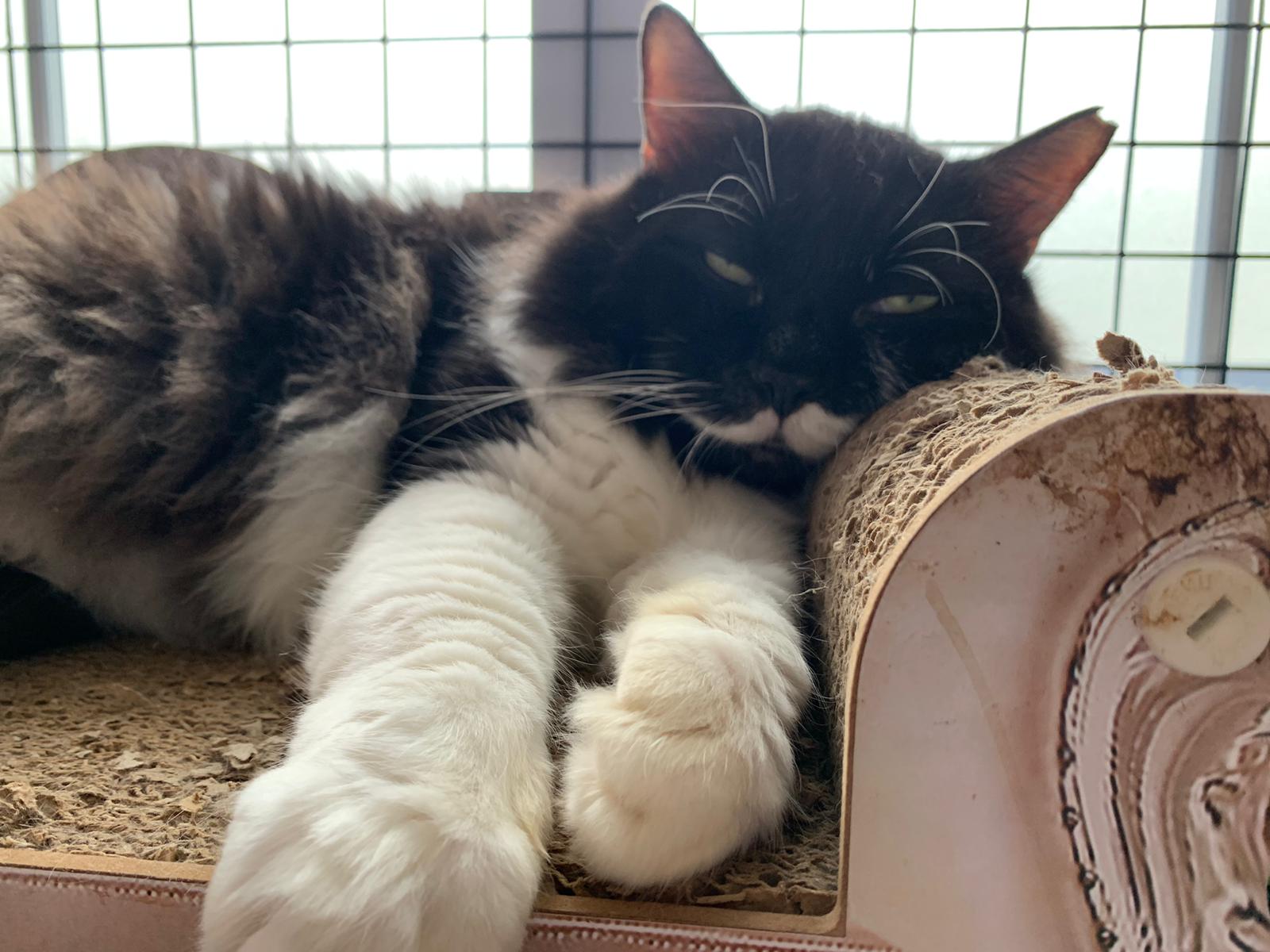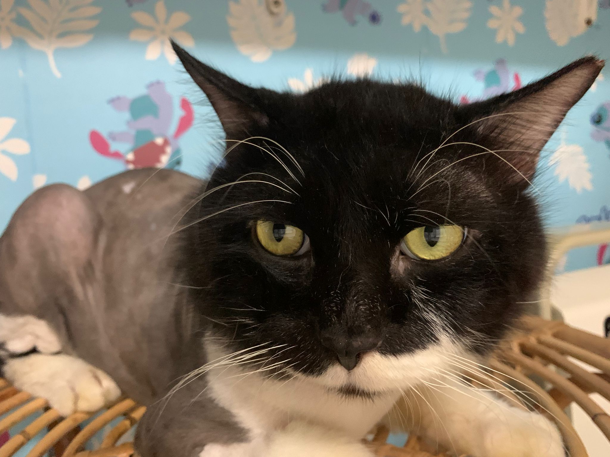 Fur are very sticky (lucky no matted fur). Tail very bad, means I got more spots I need to clean and medicate. He is a kicker, he likes to kick pple. Don’t scratch don’t bite.