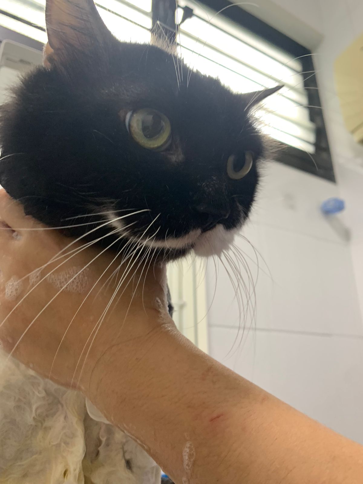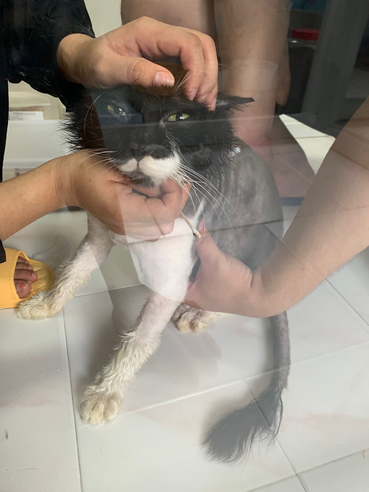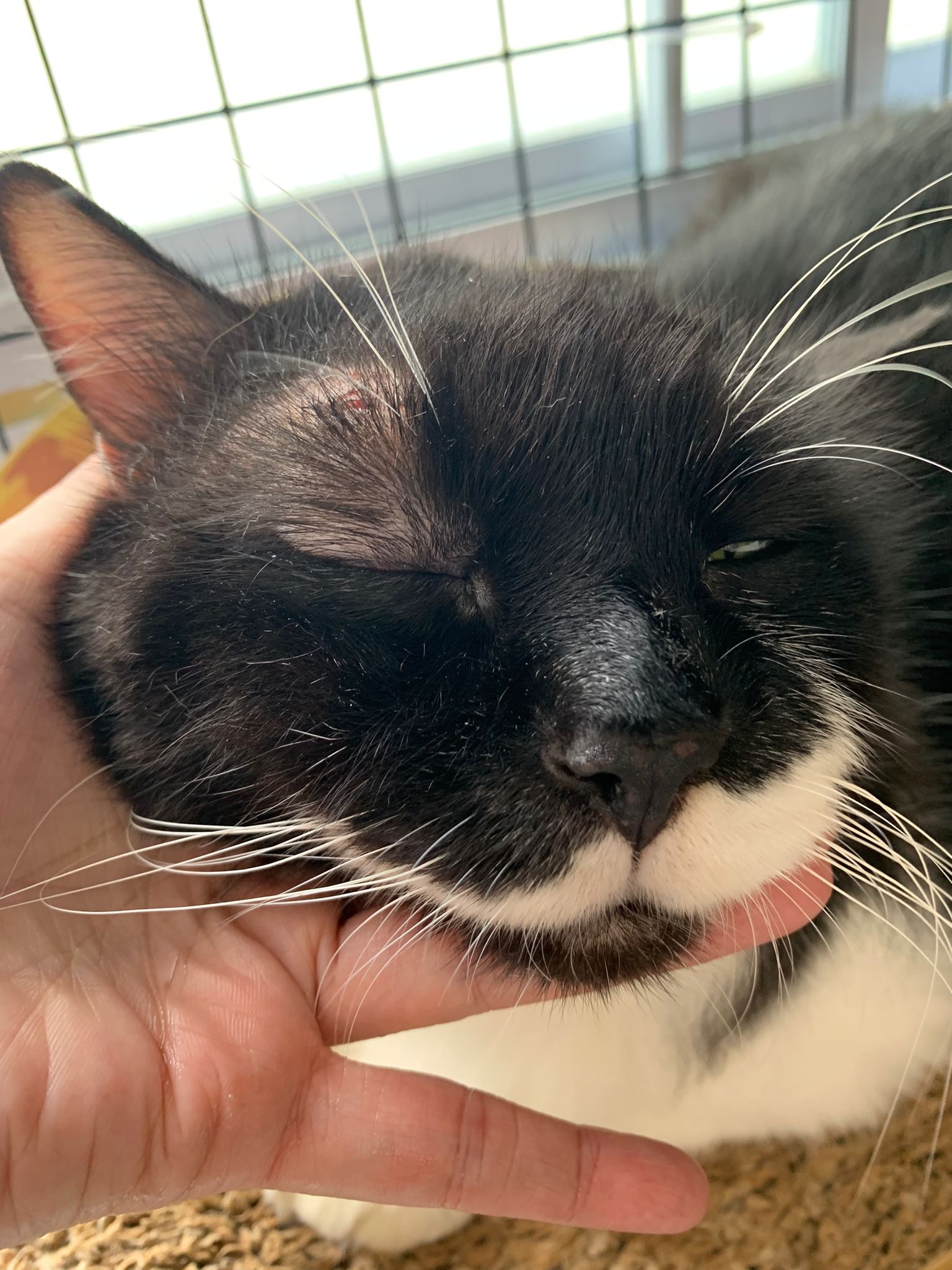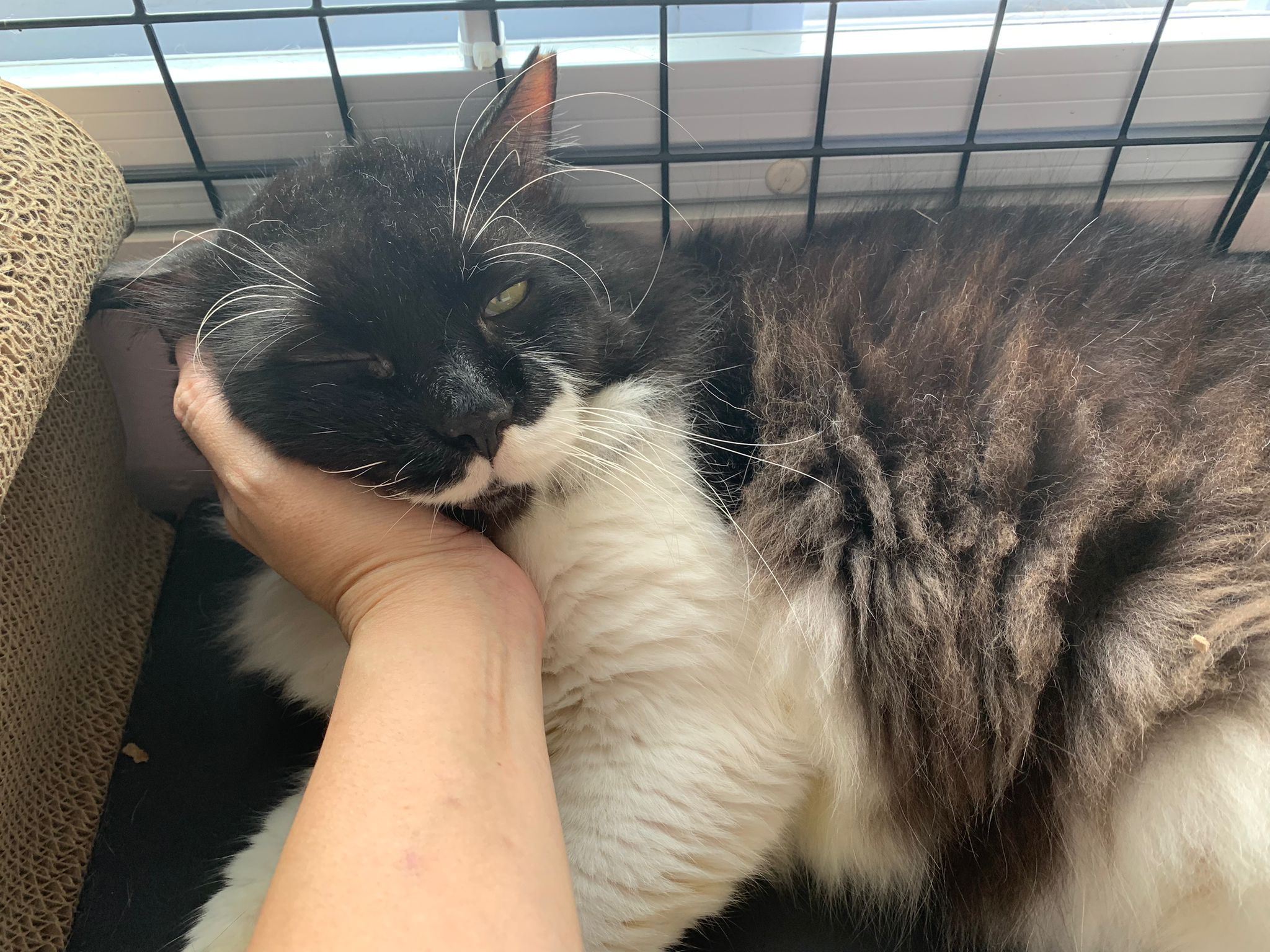 850pm: he is active will walk out look at me, look at daring, no aggression detected. Look at alley face to face in the next room, kpo I think, no aggression detected. He just watched 3 cats need Subcut n meds. And he copy alley sit until posing. will lay head in my palm but I can’t feel totally safe that he won’t bite down. Ha. he on cautious mode in case I’m touching his wounds. Grooming arranged on Thurs. shave him down so can proper treatment.