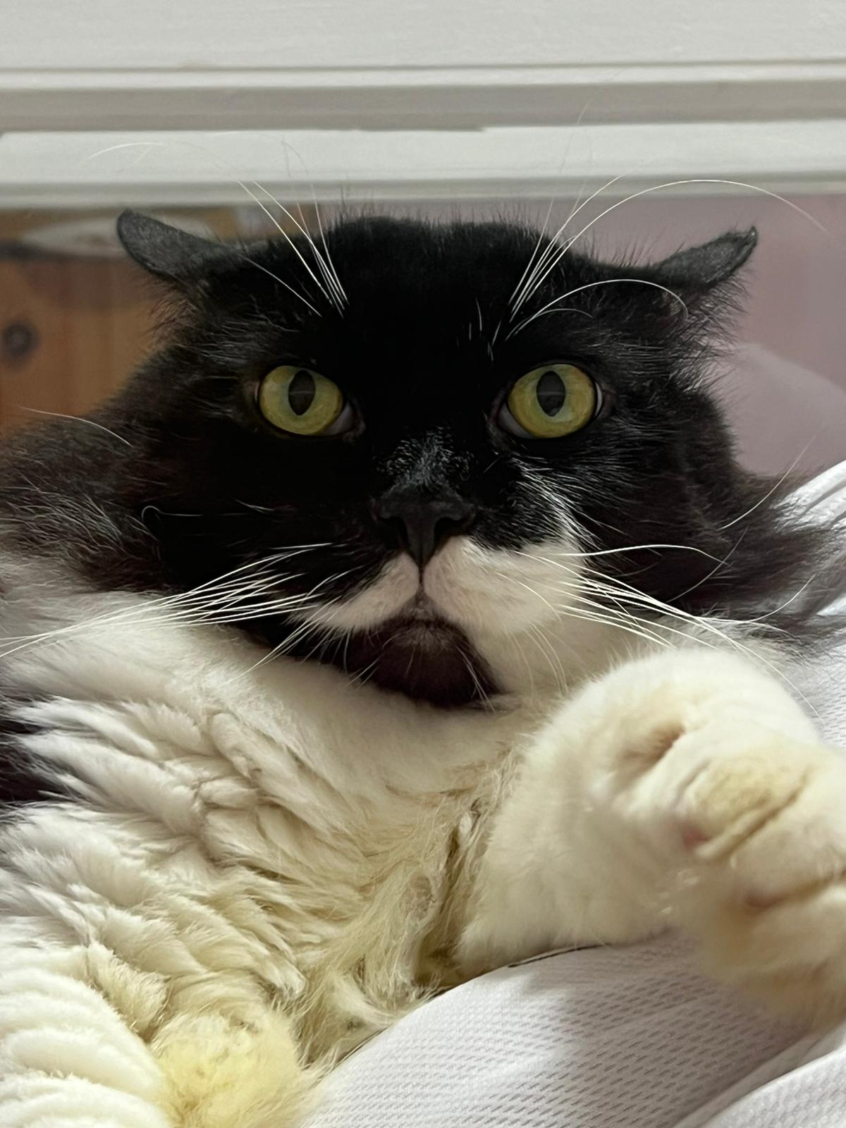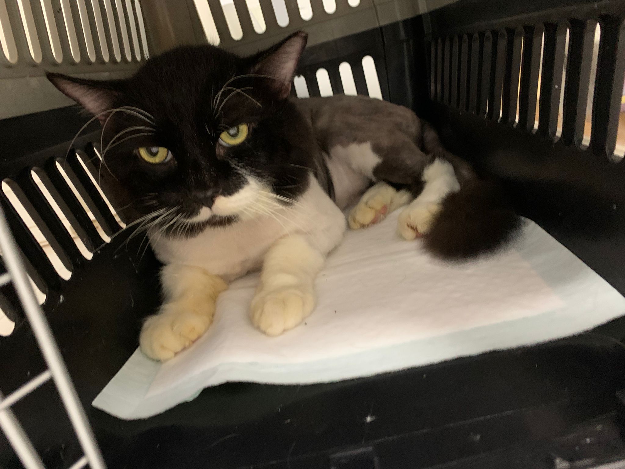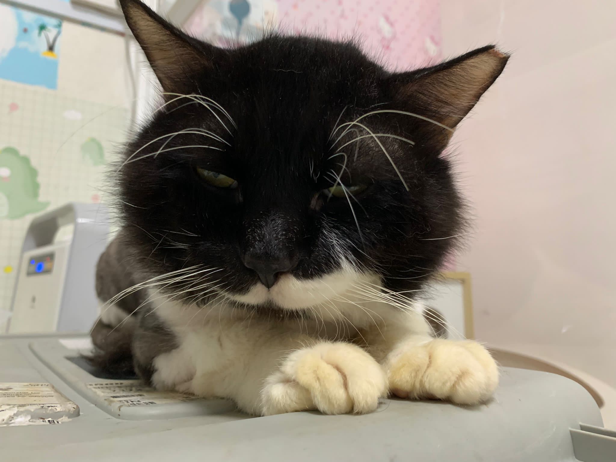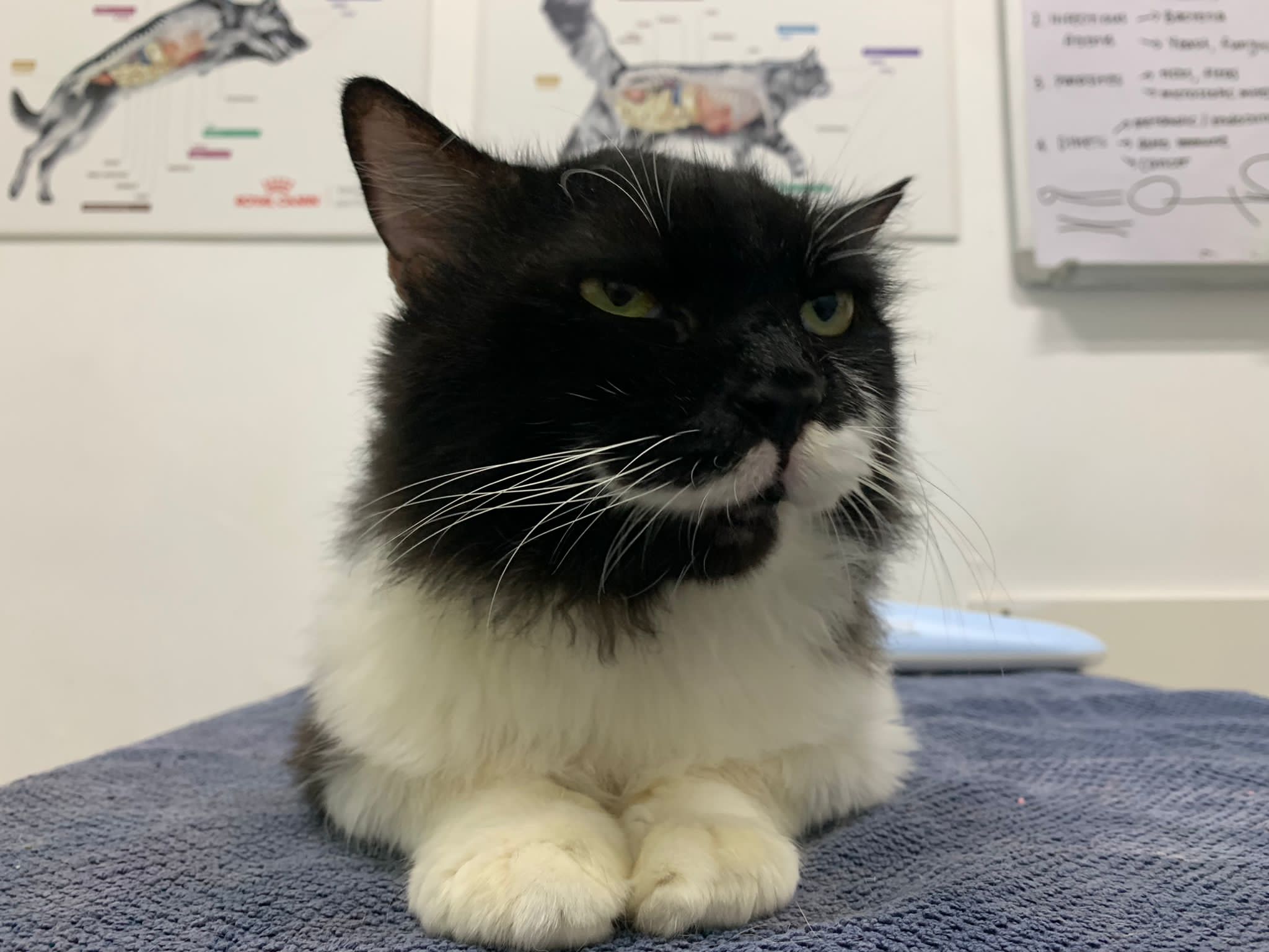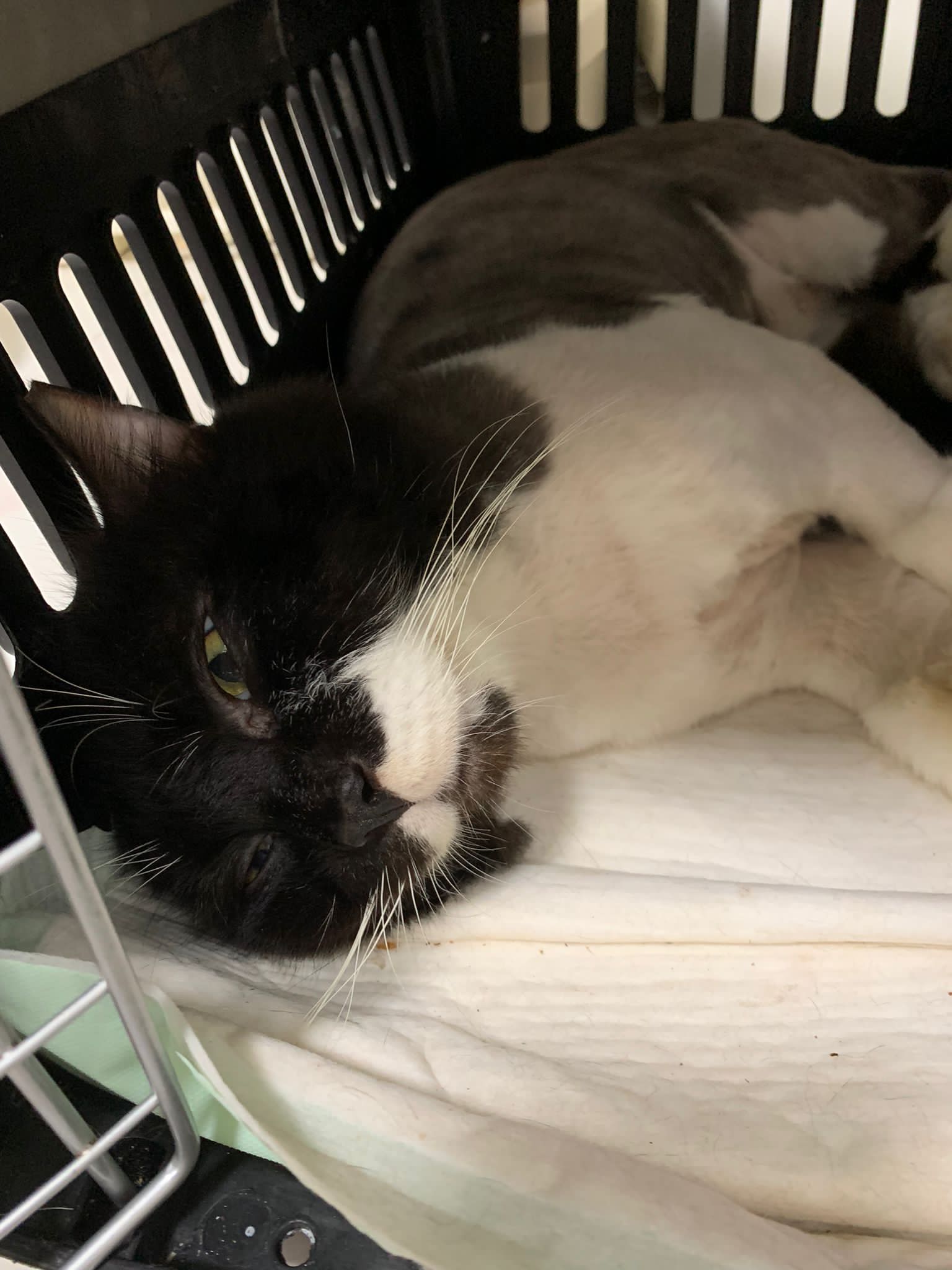 850pm: he is active will walk out look at me, look at daring, no aggression detected. Look at alley face to face in the next room, kpo I think, no aggression detected. He just watched 3 cats need Subcut n meds. And he copy alley sit until posing. will lay head in my palm but I can’t feel totally safe that he won’t bite down. Ha. he on cautious mode in case I’m touching his wounds. Grooming arranged on Thurs. shave him down so can proper treatment.
