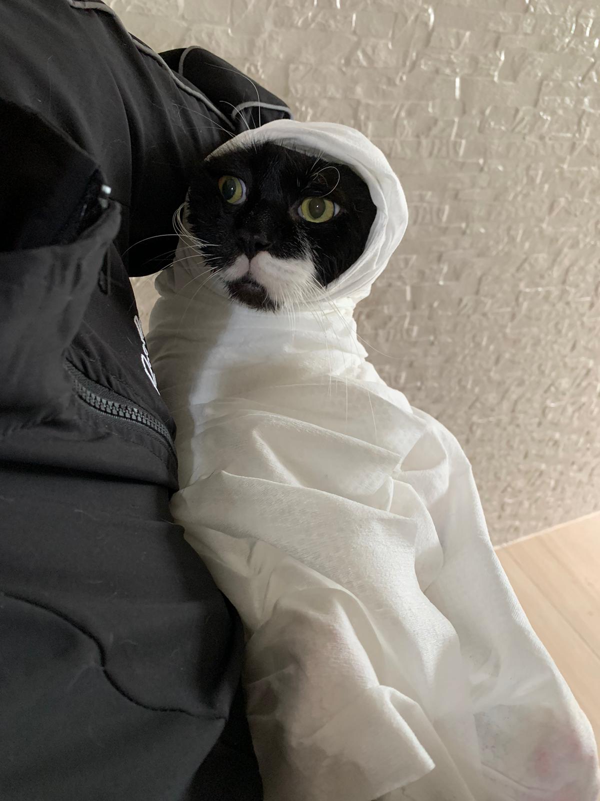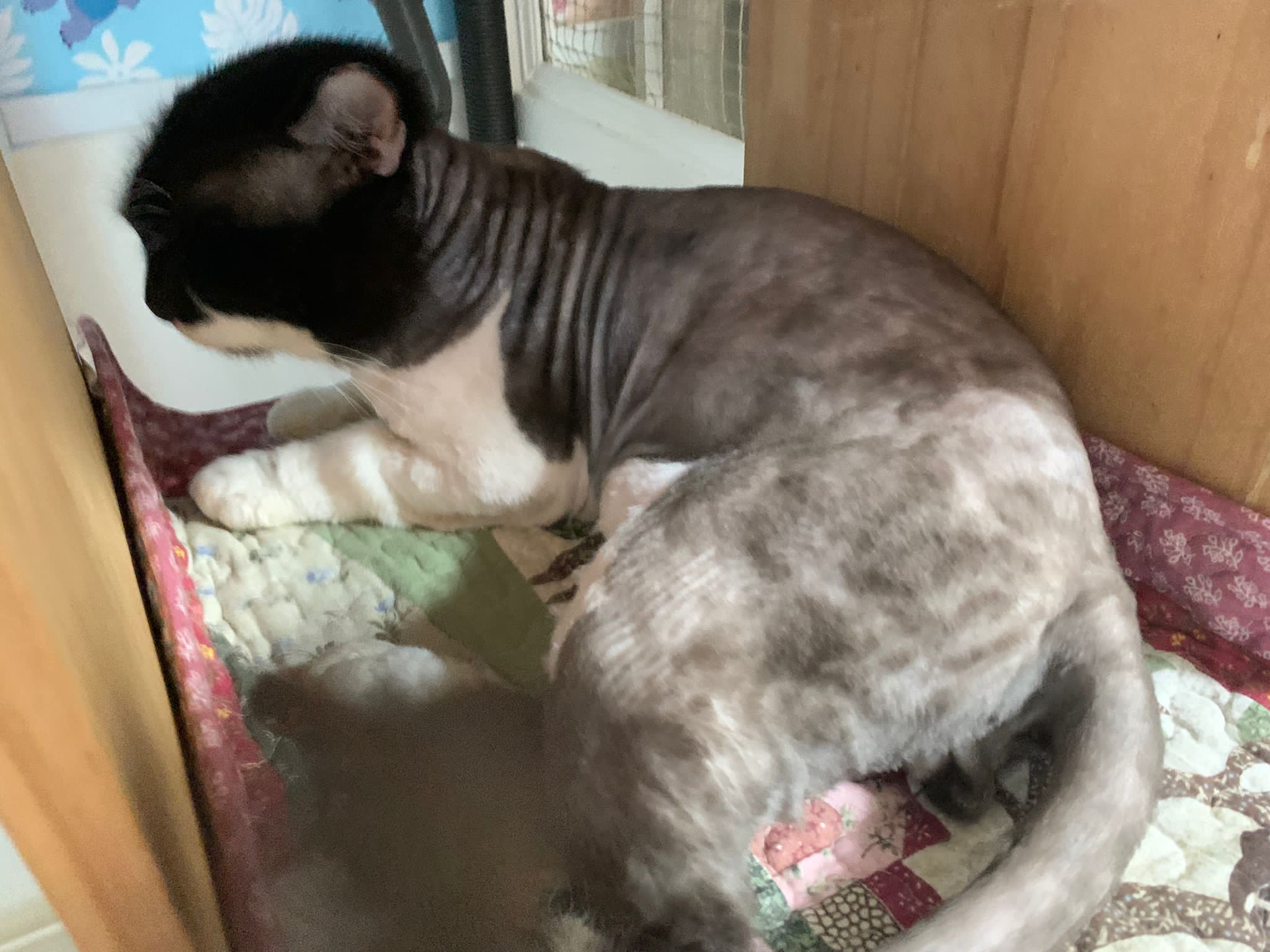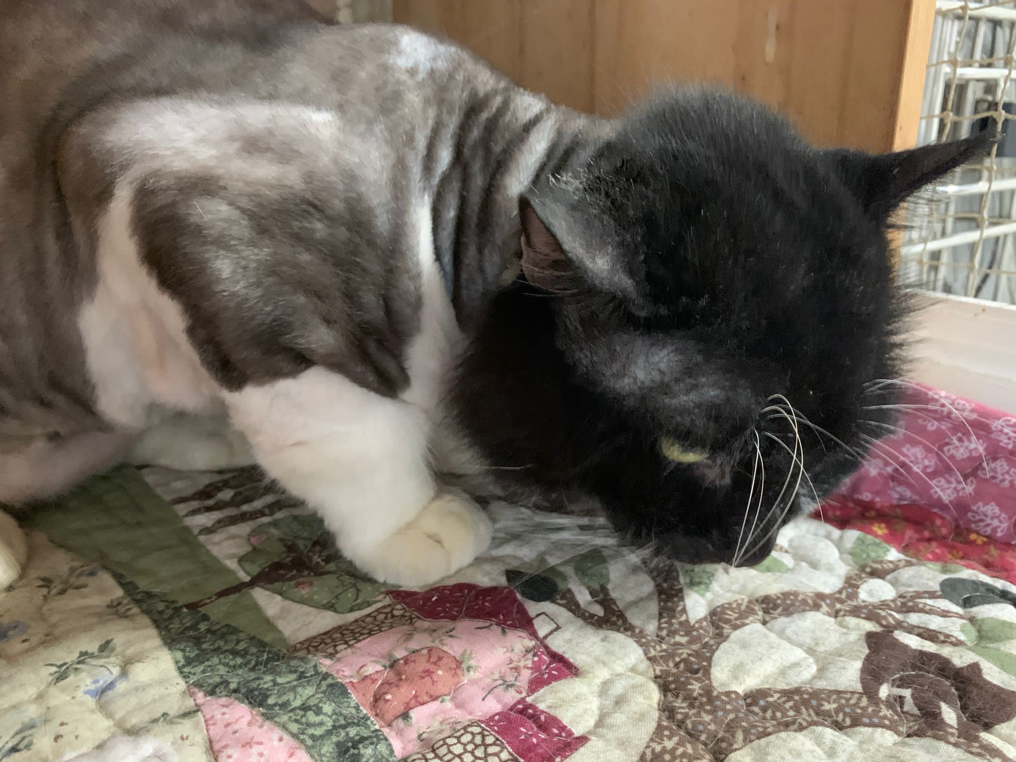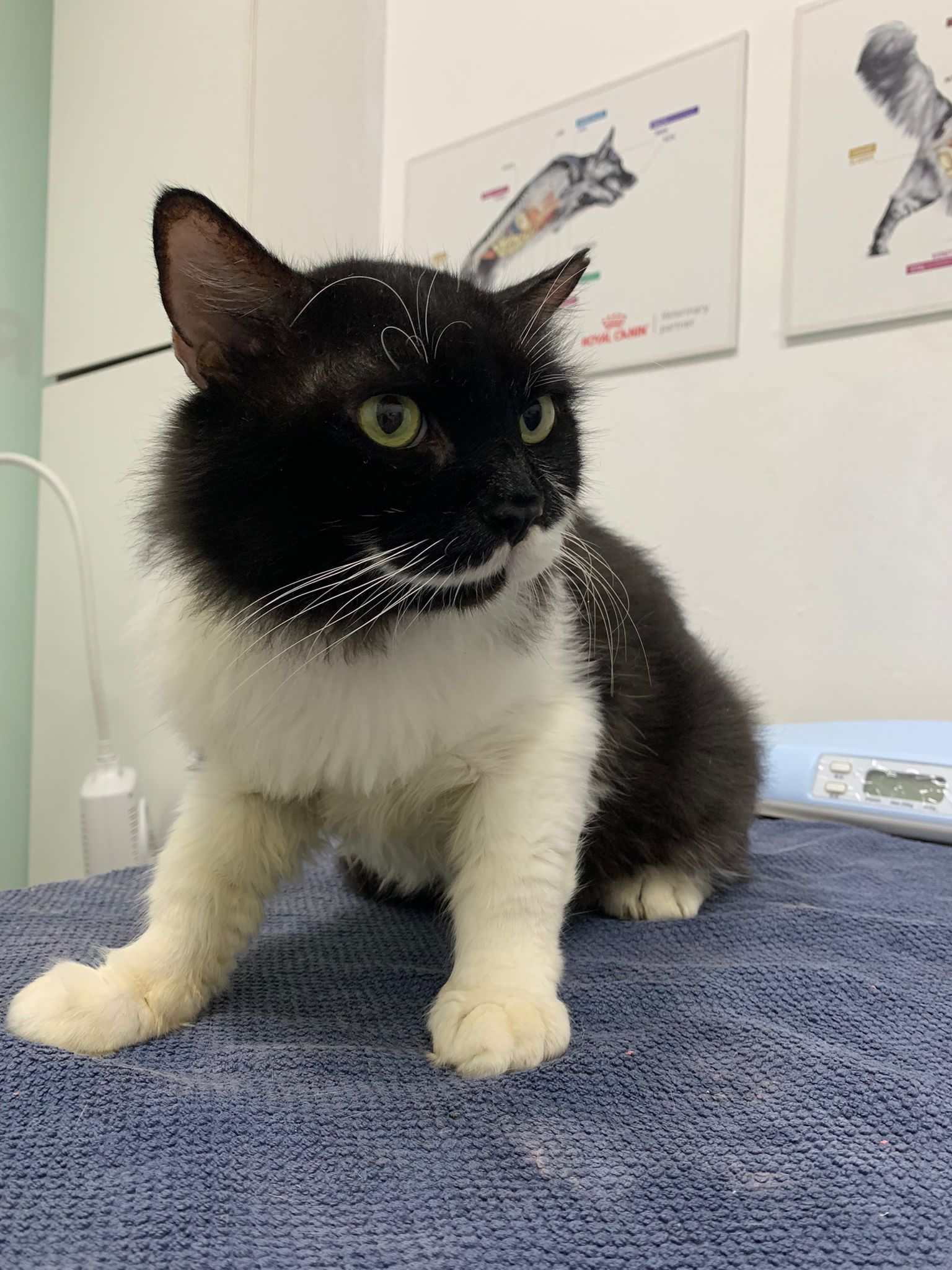 850pm: he is active will walk out look at me, look at daring, no aggression detected. Look at alley face to face in the next room, kpo I think, no aggression detected. He just watched 3 cats need Subcut n meds. And he copy alley sit until posing. will lay head in my palm but I can’t feel totally safe that he won’t bite down. Ha. he on cautious mode in case I’m touching his wounds. Grooming arranged on Thurs. shave him down so can proper treatment.