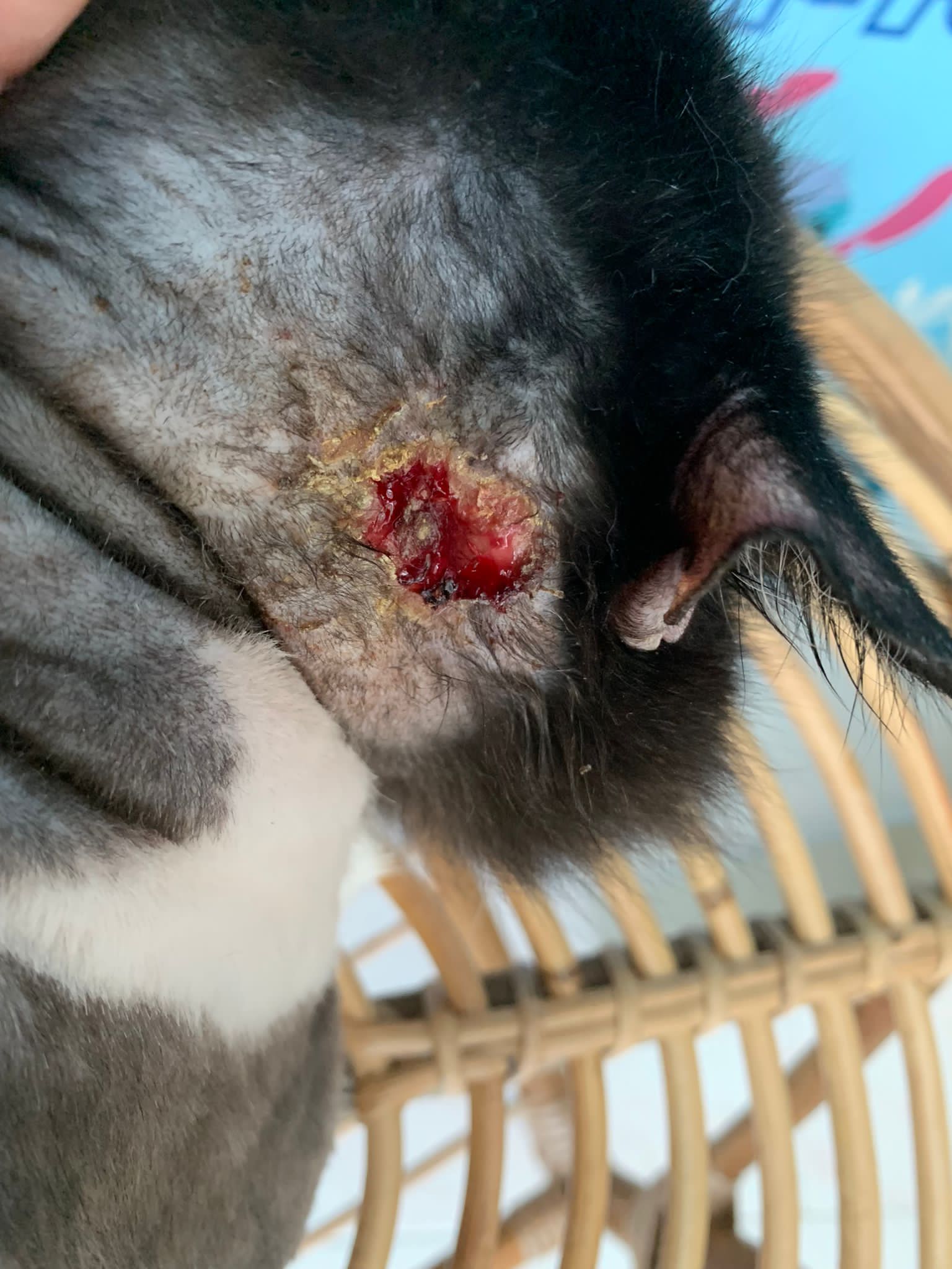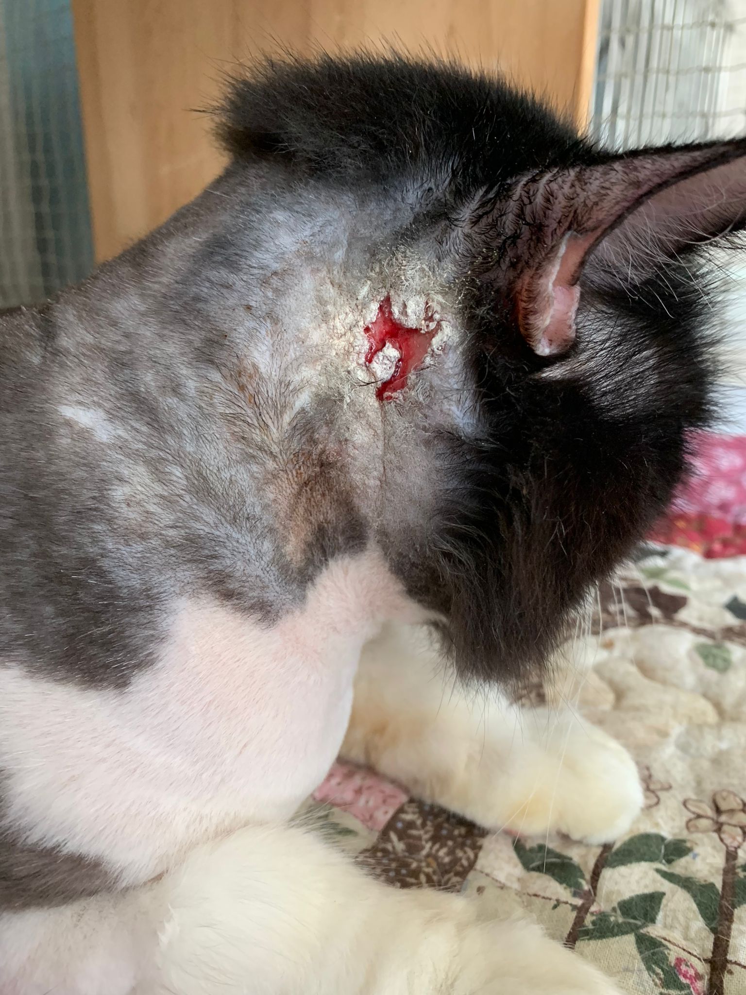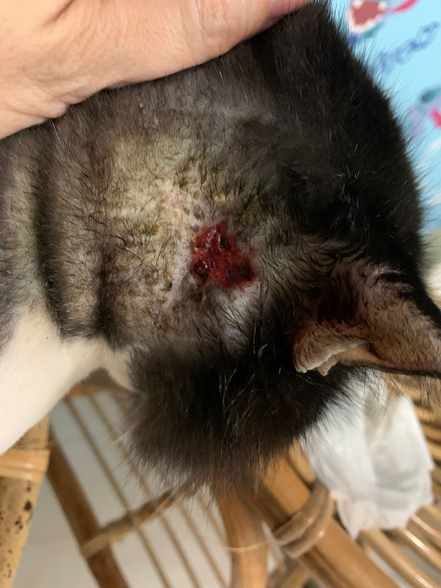 The wound is not good, too much dry up swab how to clean siak, he is sensitive to that. Will kick n yet scruff area is near to the wound.