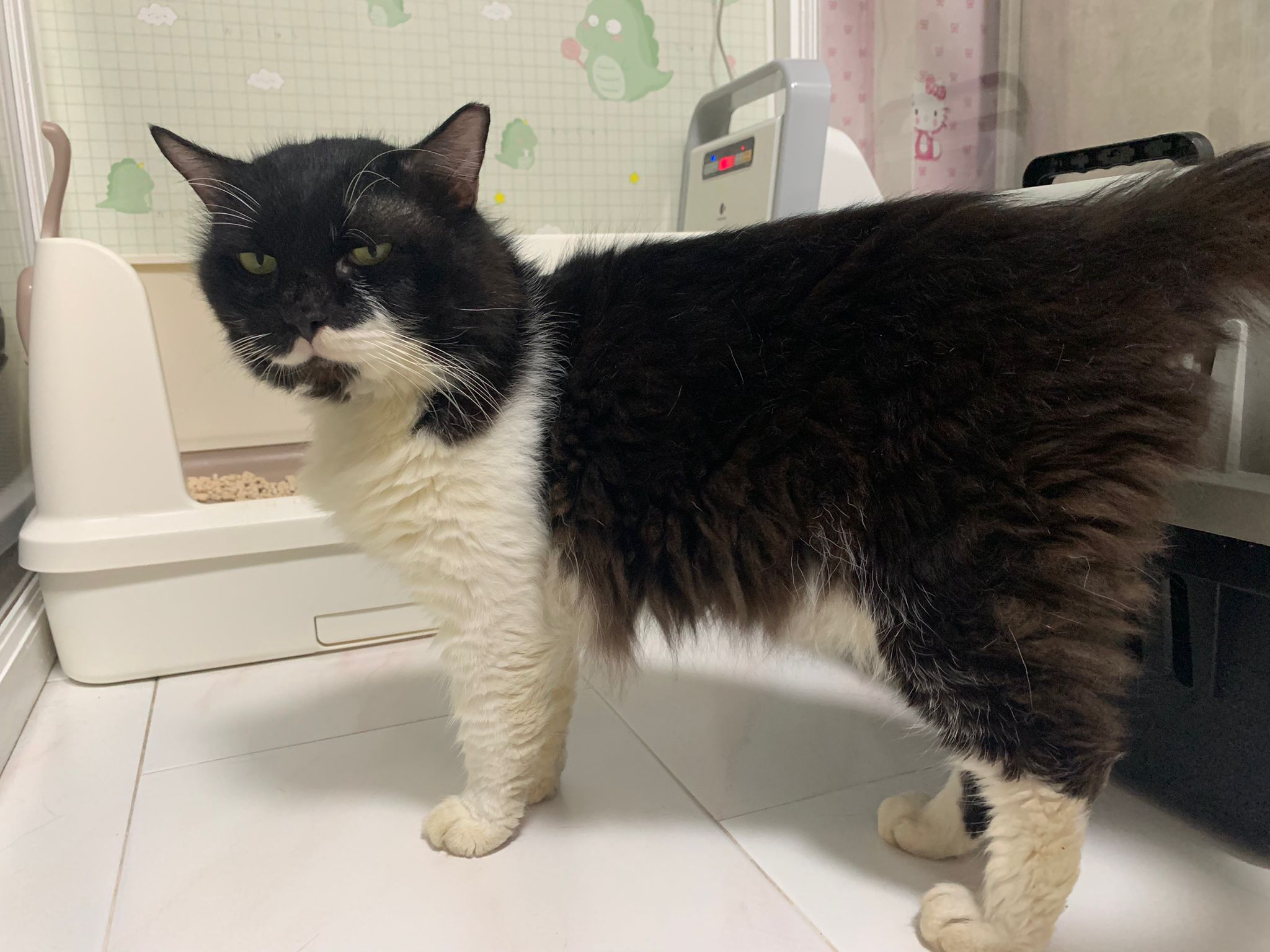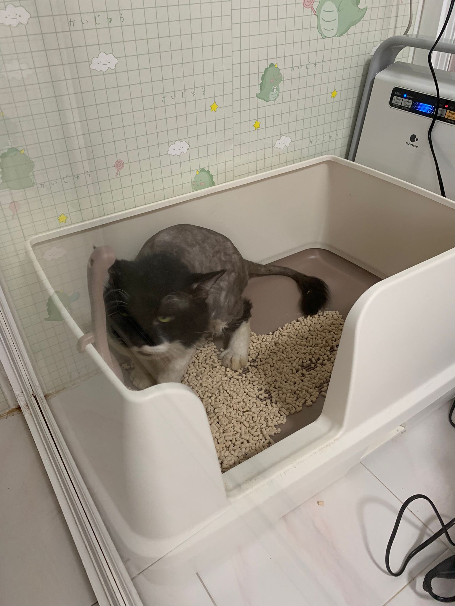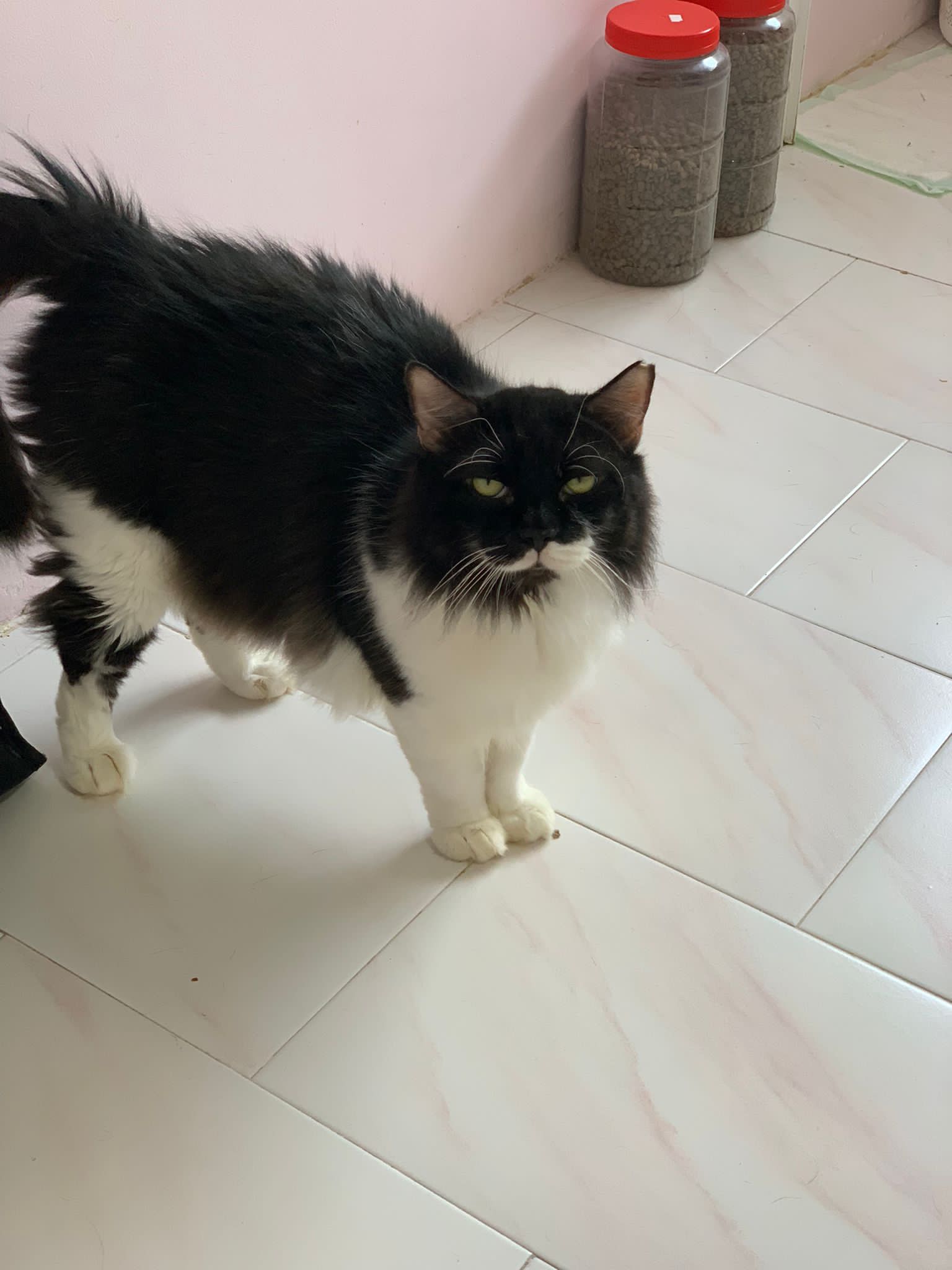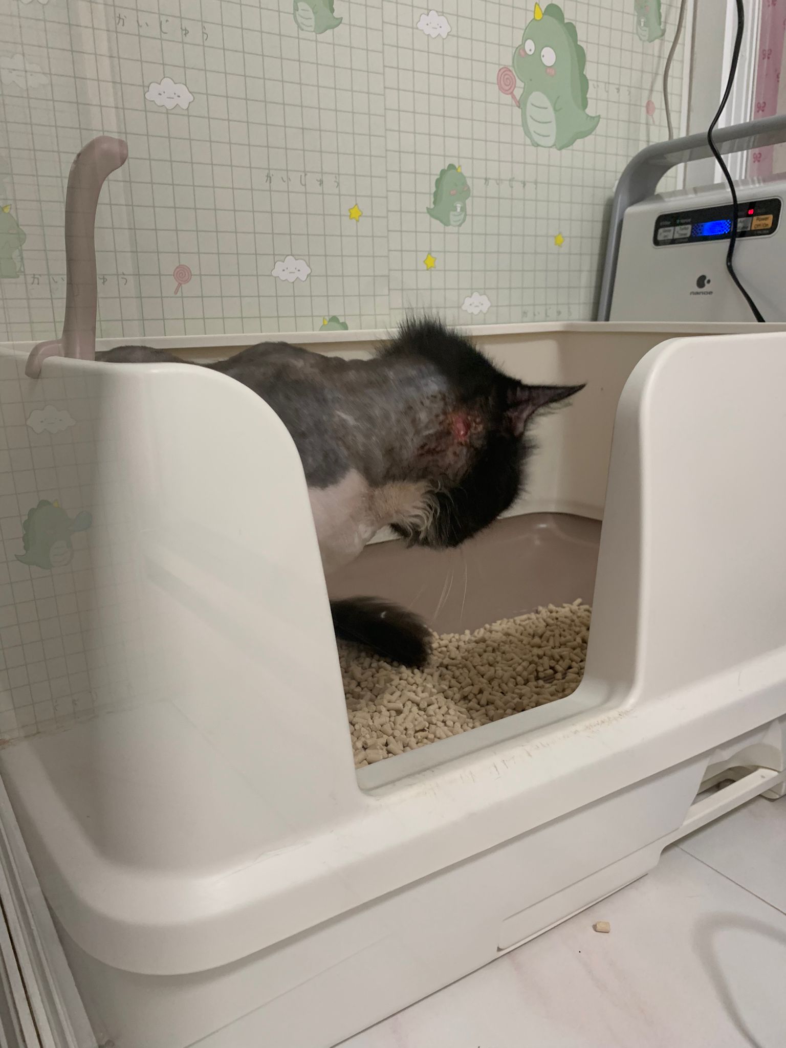 1214pm: haha no wonder soooo much agitated – he want to pee la!! He went straight to the bin . White fur are yellowish