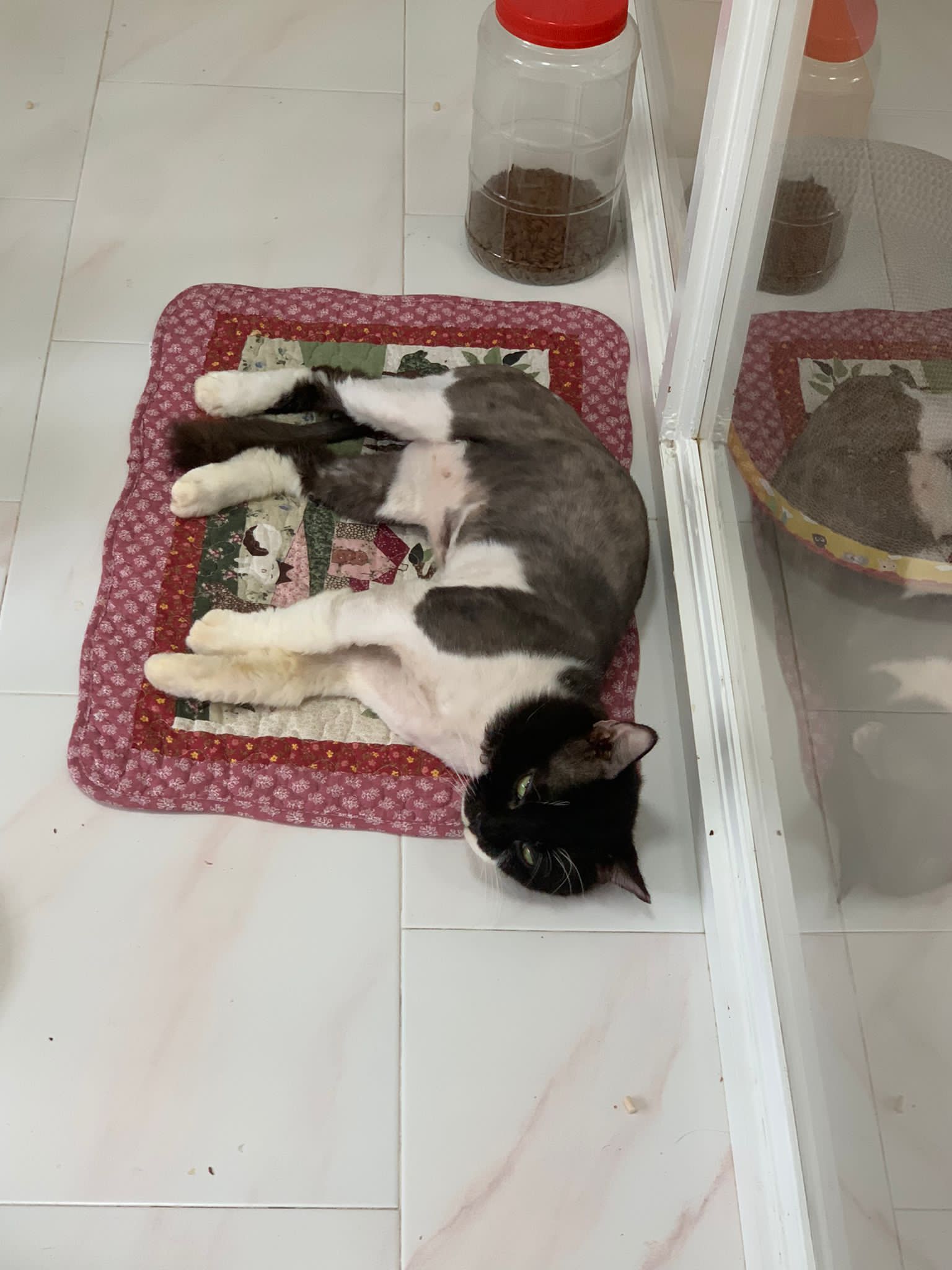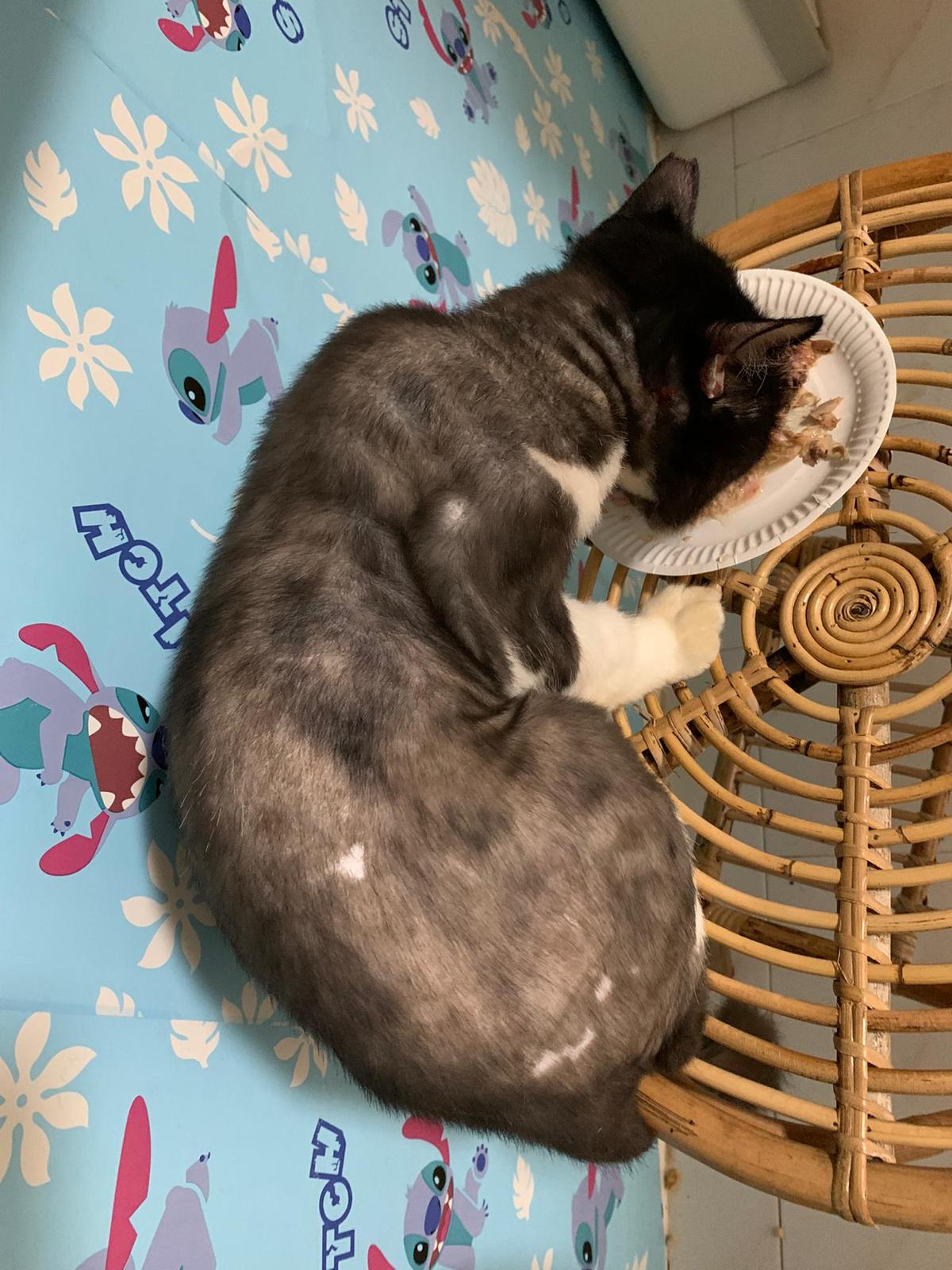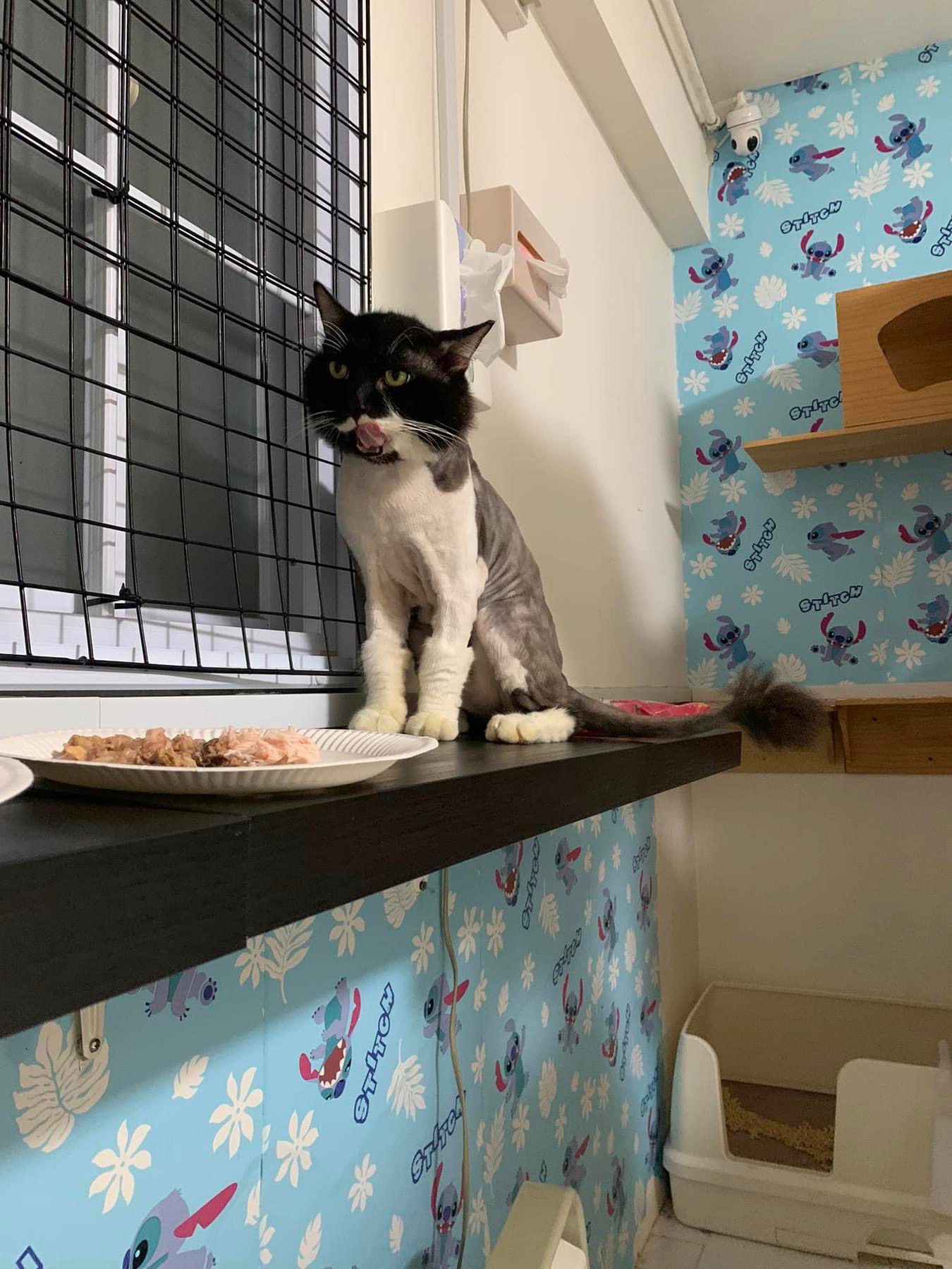 Roam happily till I carry him back to room for overnight. Getting more confident to jump up 80cm -90cm high platform. Clean up and dress his wound, getting better think he feels so too, didn’t struggle as much alr. Day 01 high kick me non stop. Serve him a can of tuna w white fish. maybe Tues can let him out whole day since major cleaning day.