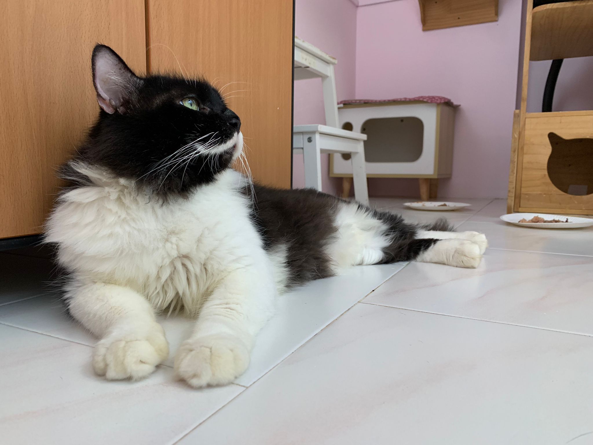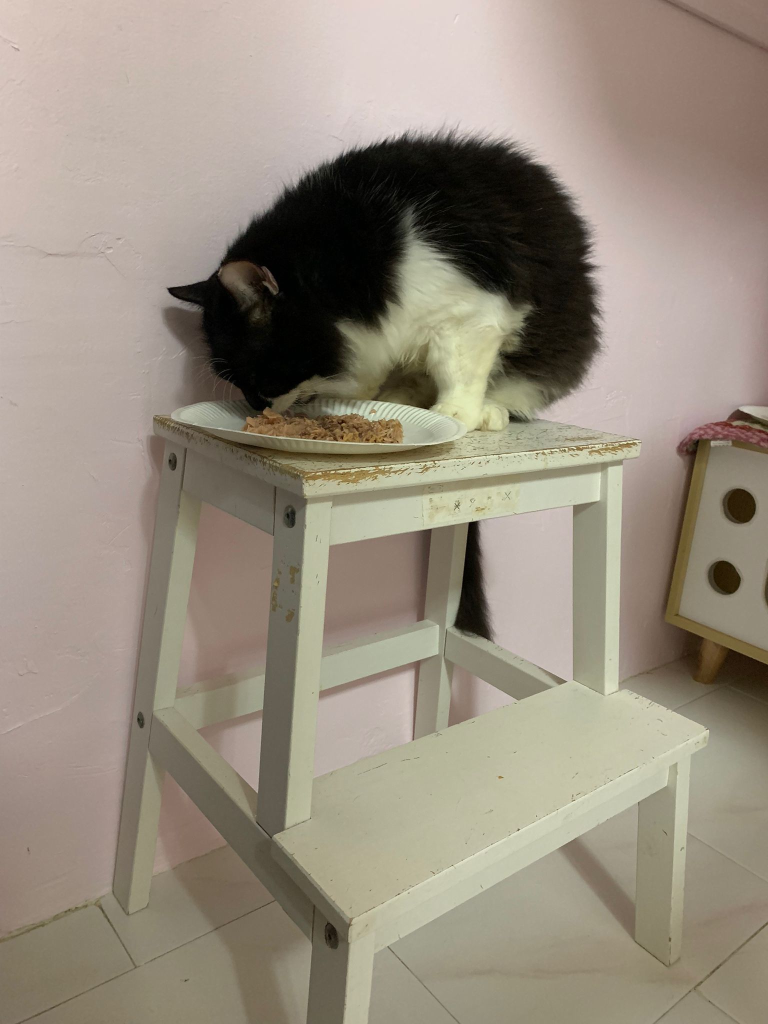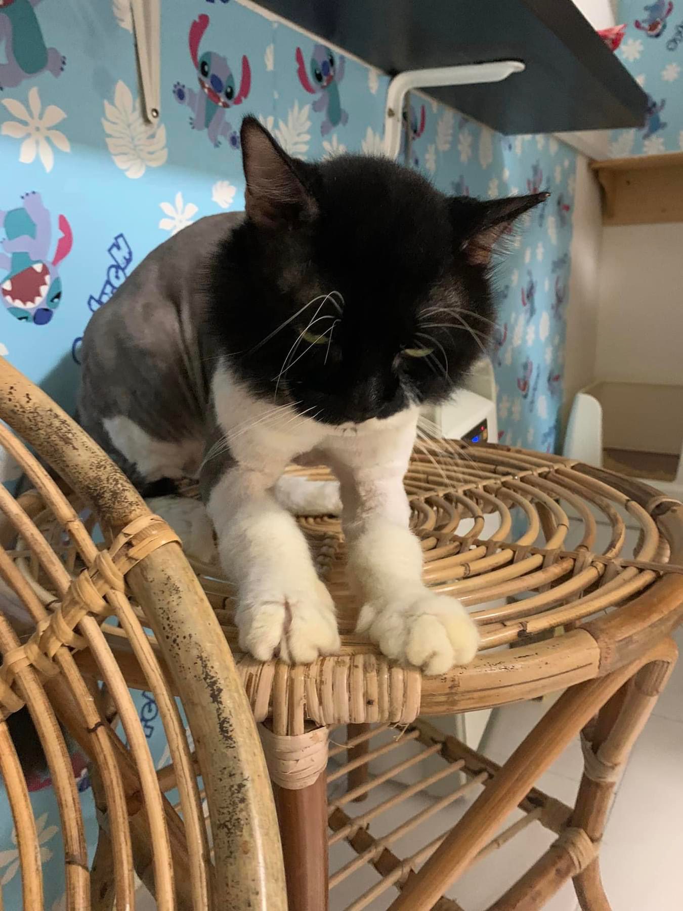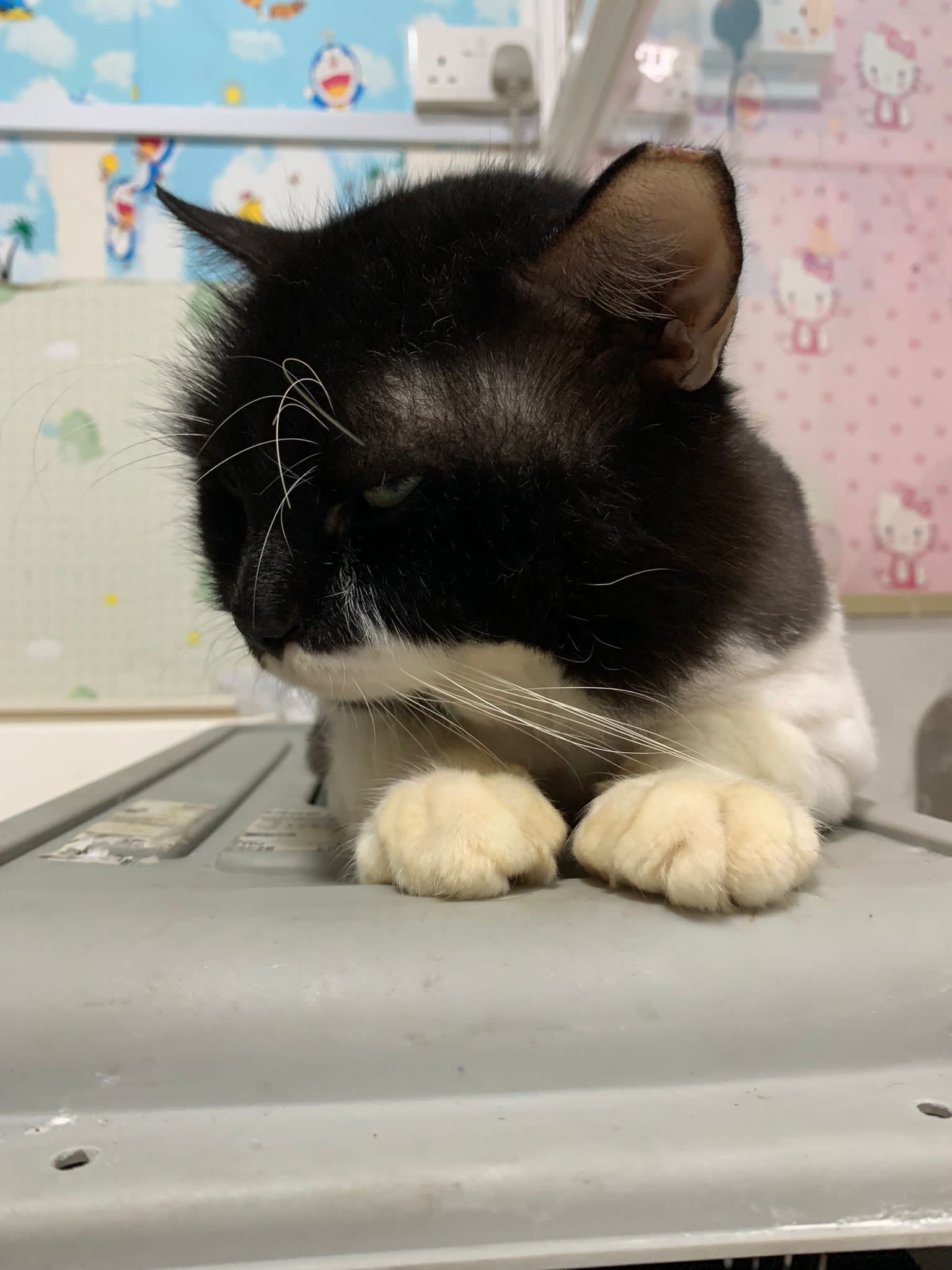 Roam happily till I carry him back to room for overnight. Getting more confident to jump up 80cm -90cm high platform. Clean up and dress his wound, getting better think he feels so too, didn’t struggle as much alr. Day 01 high kick me non stop. Serve him a can of tuna w white fish. maybe Tues can let him out whole day since major cleaning day.