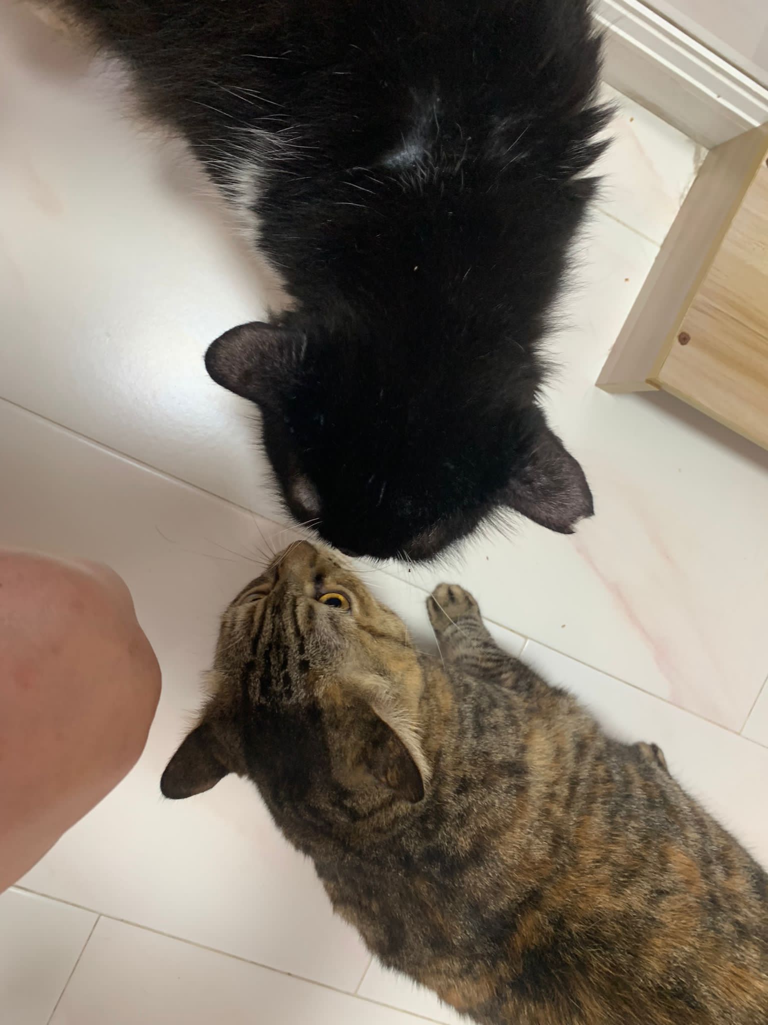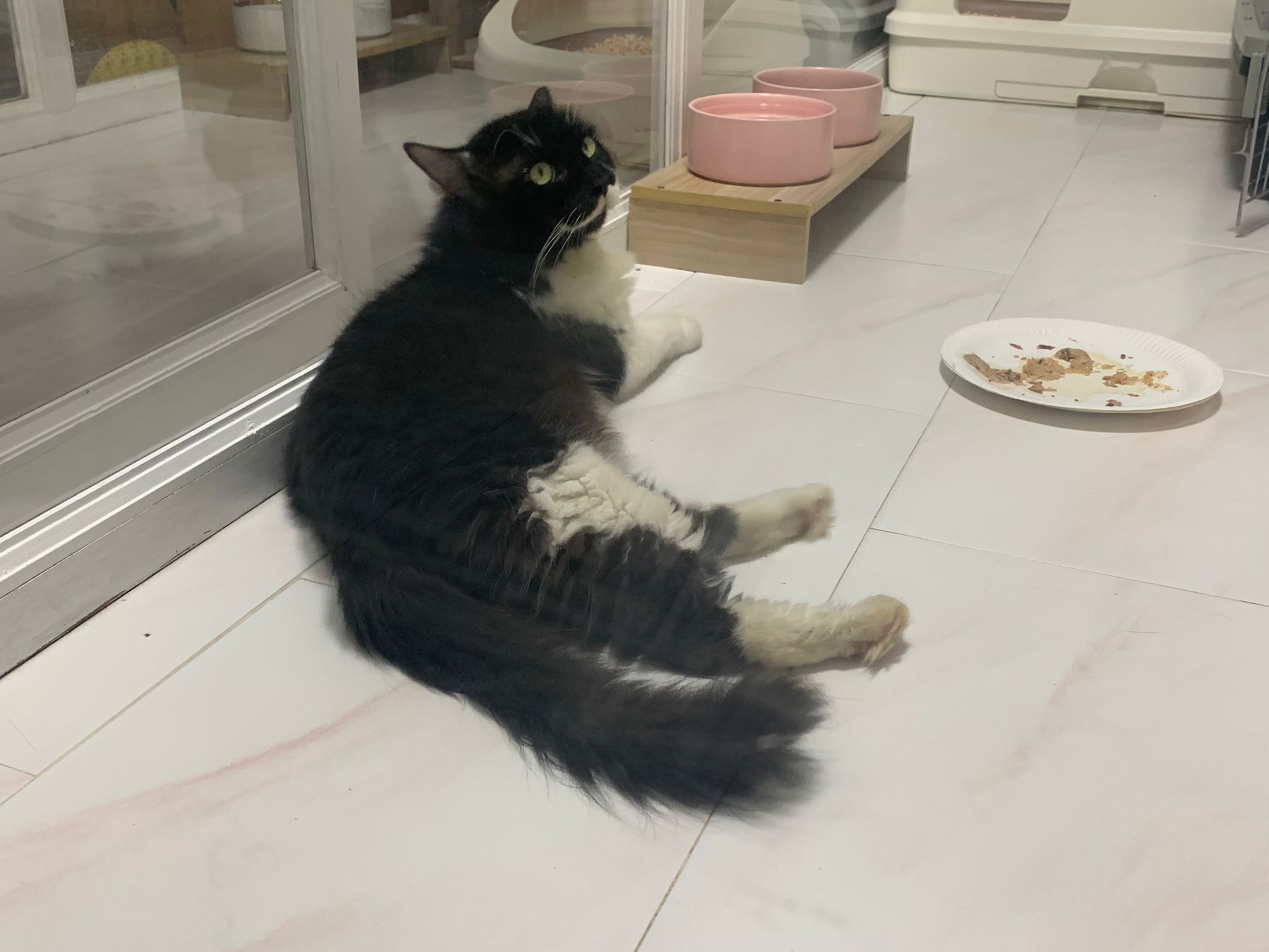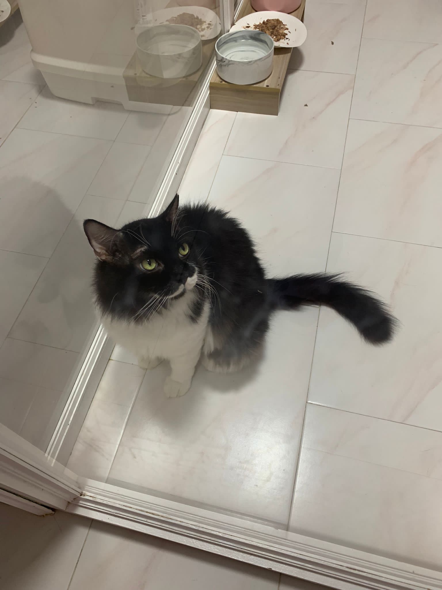 8am+: open door and greet daring also, even lick daring twice. These 2 got weird relationship. Ok one. But daring hate pple face stick to his to provoke him n jumbo love putting his big head face to other’s face. serve tuna w chicken.
