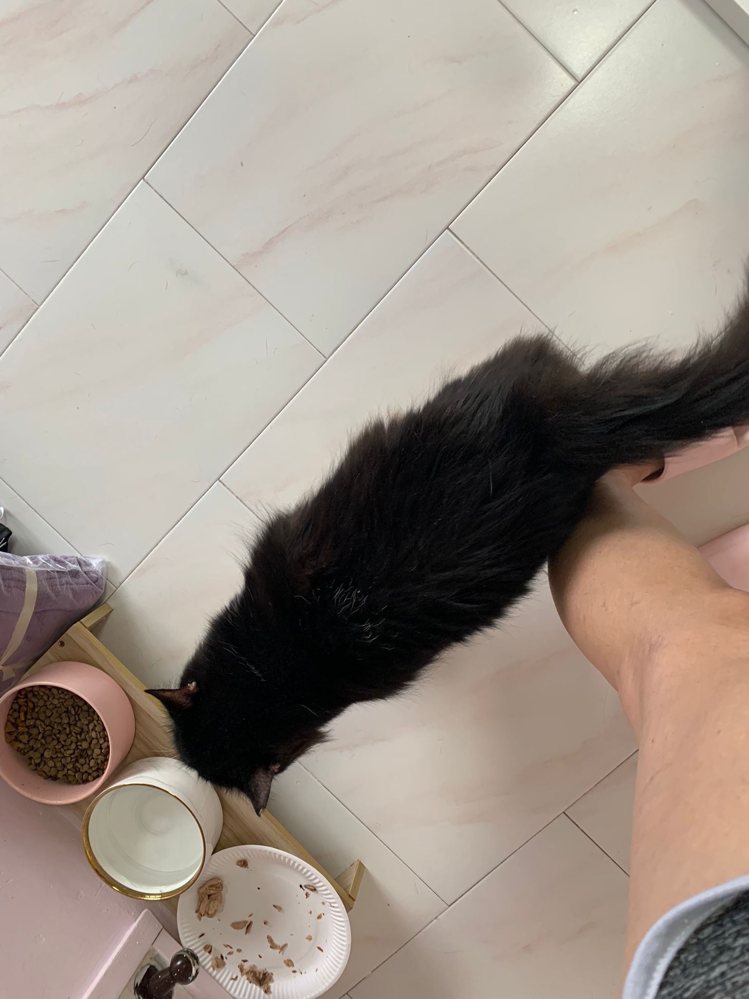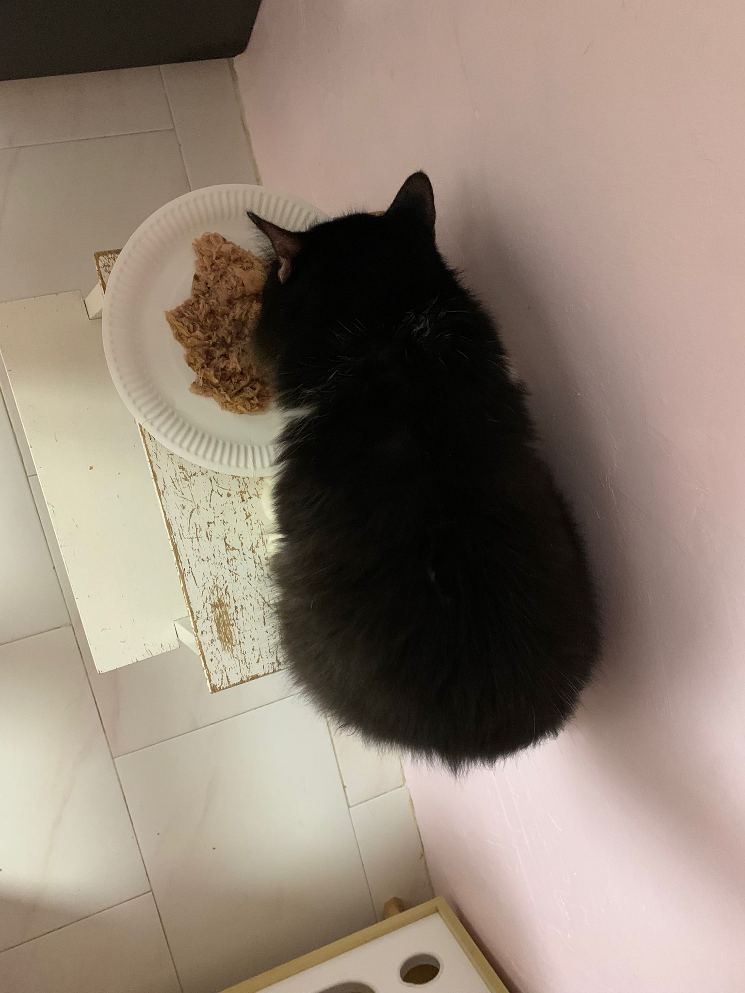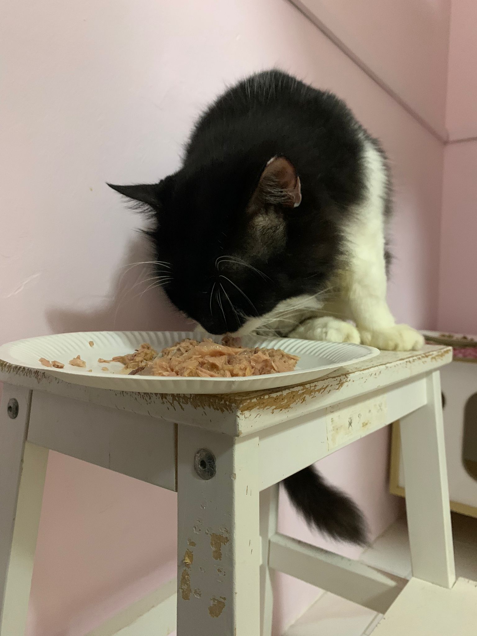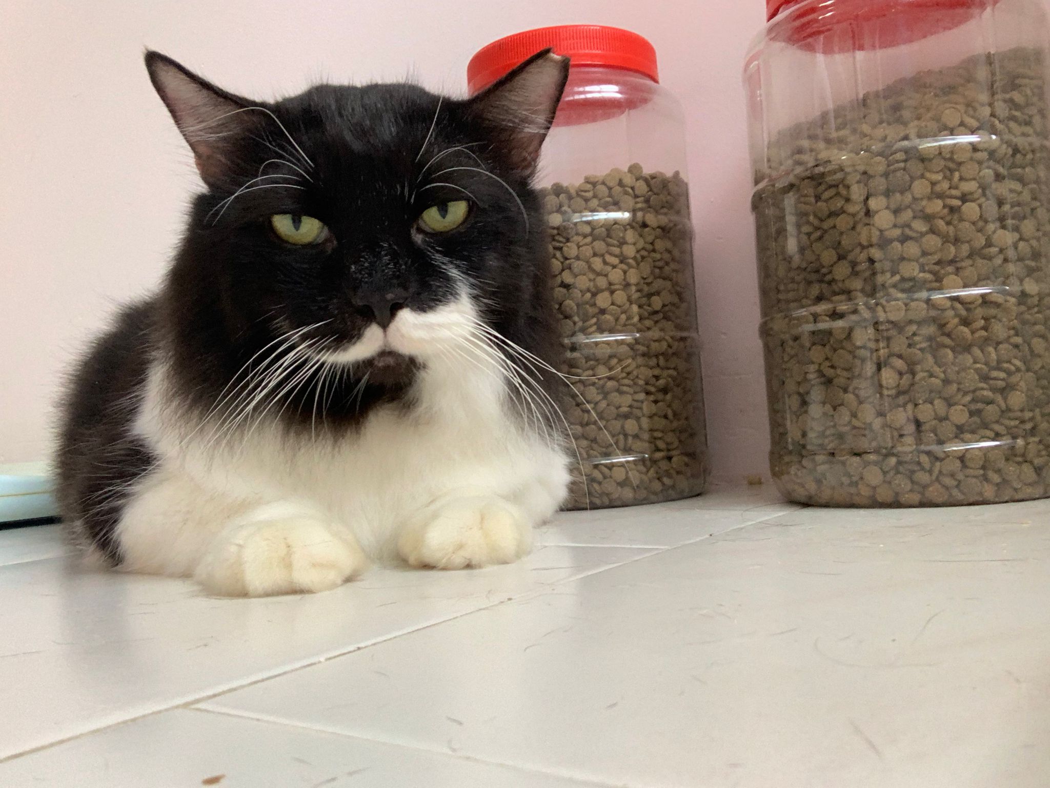 8am+: open door and greet daring also, even lick daring twice. These 2 got weird relationship. Ok one. But daring hate pple face stick to his to provoke him n jumbo love putting his big head face to other’s face. serve tuna w chicken.