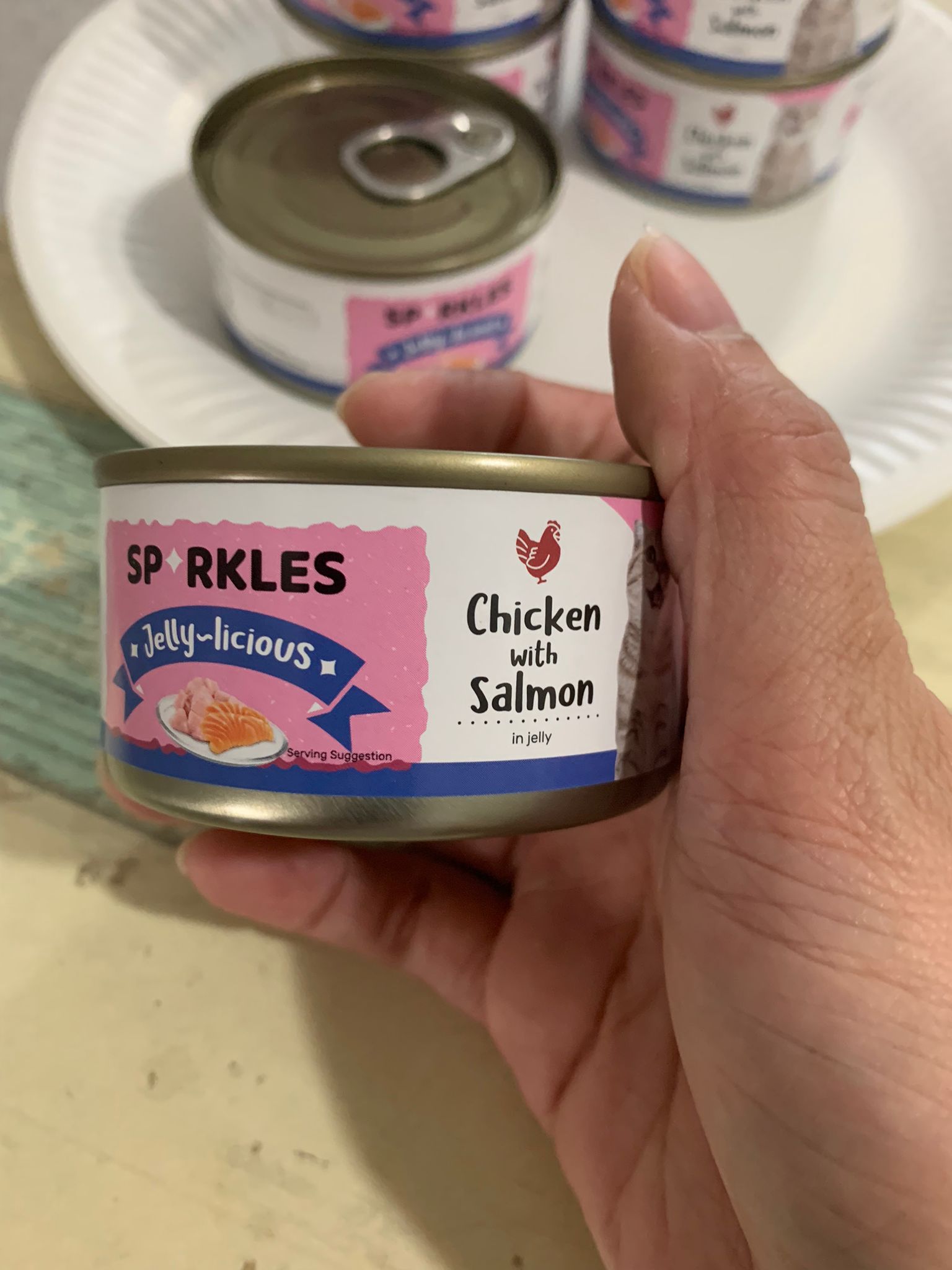 Serve sparkles chicken w salmon jelly, he don’t want to eat. Serve tuna w salmon he got eat – later check again.