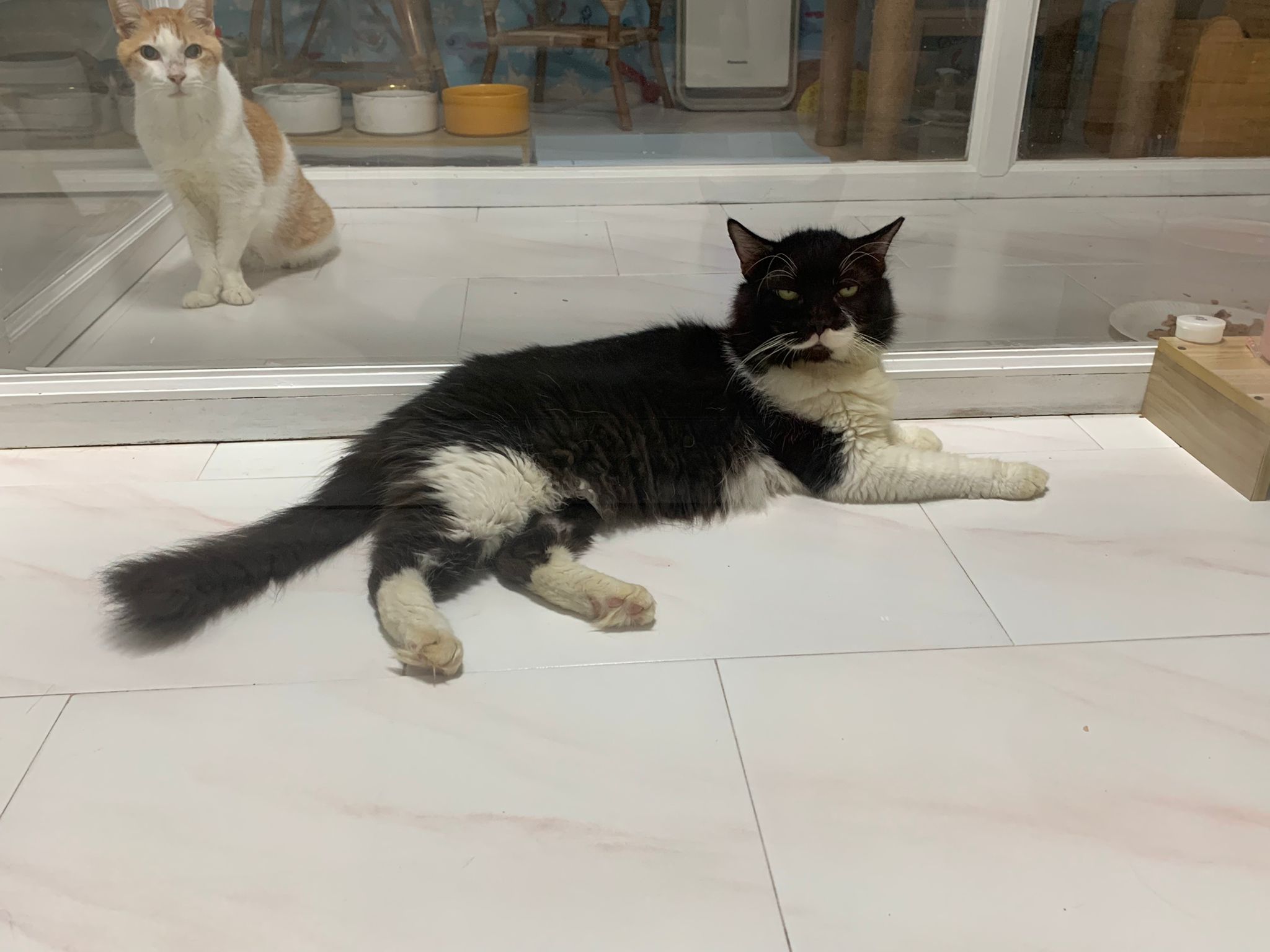 Noon: I back to 猫房 and he is standing at window looking out … remind him jan coming – he is going home he got owner le. And a bro who is same colour as him but is a rabbit.