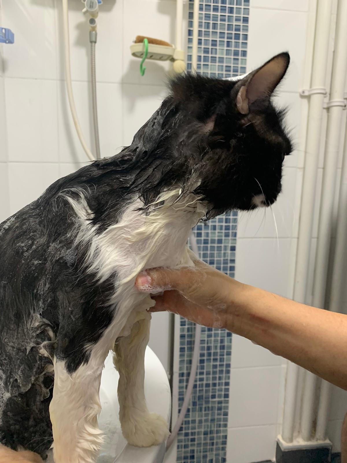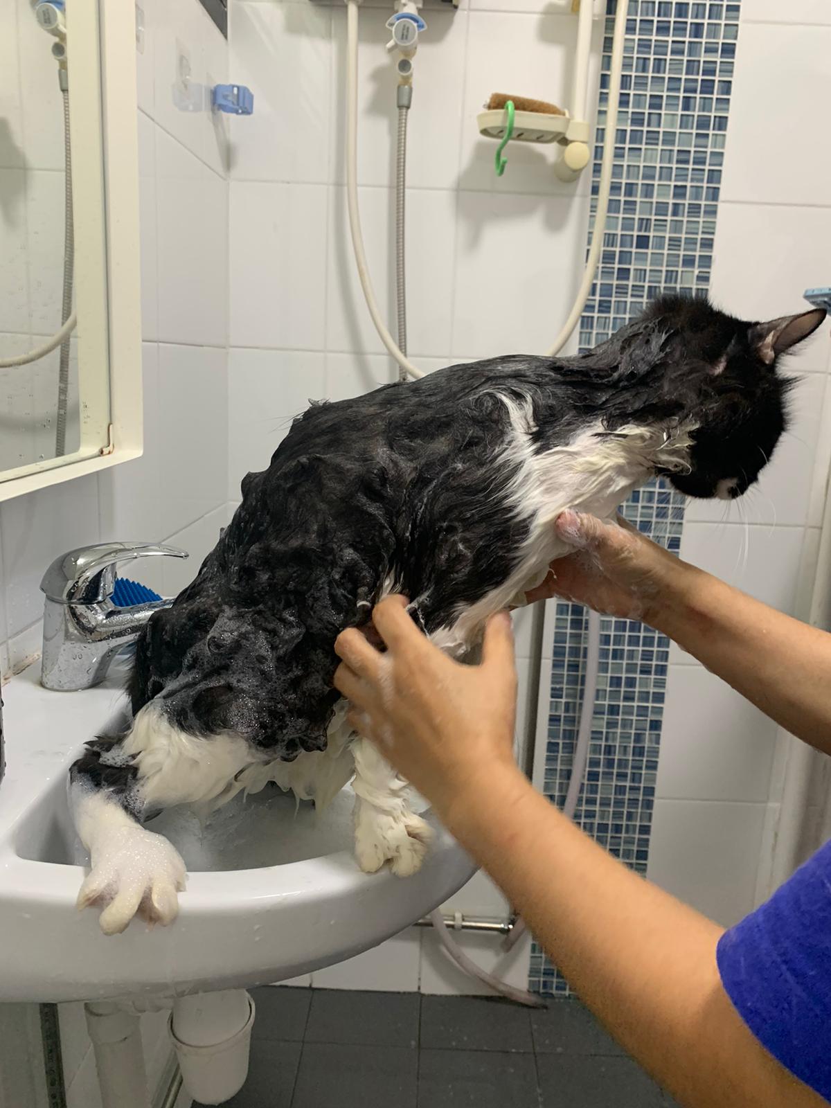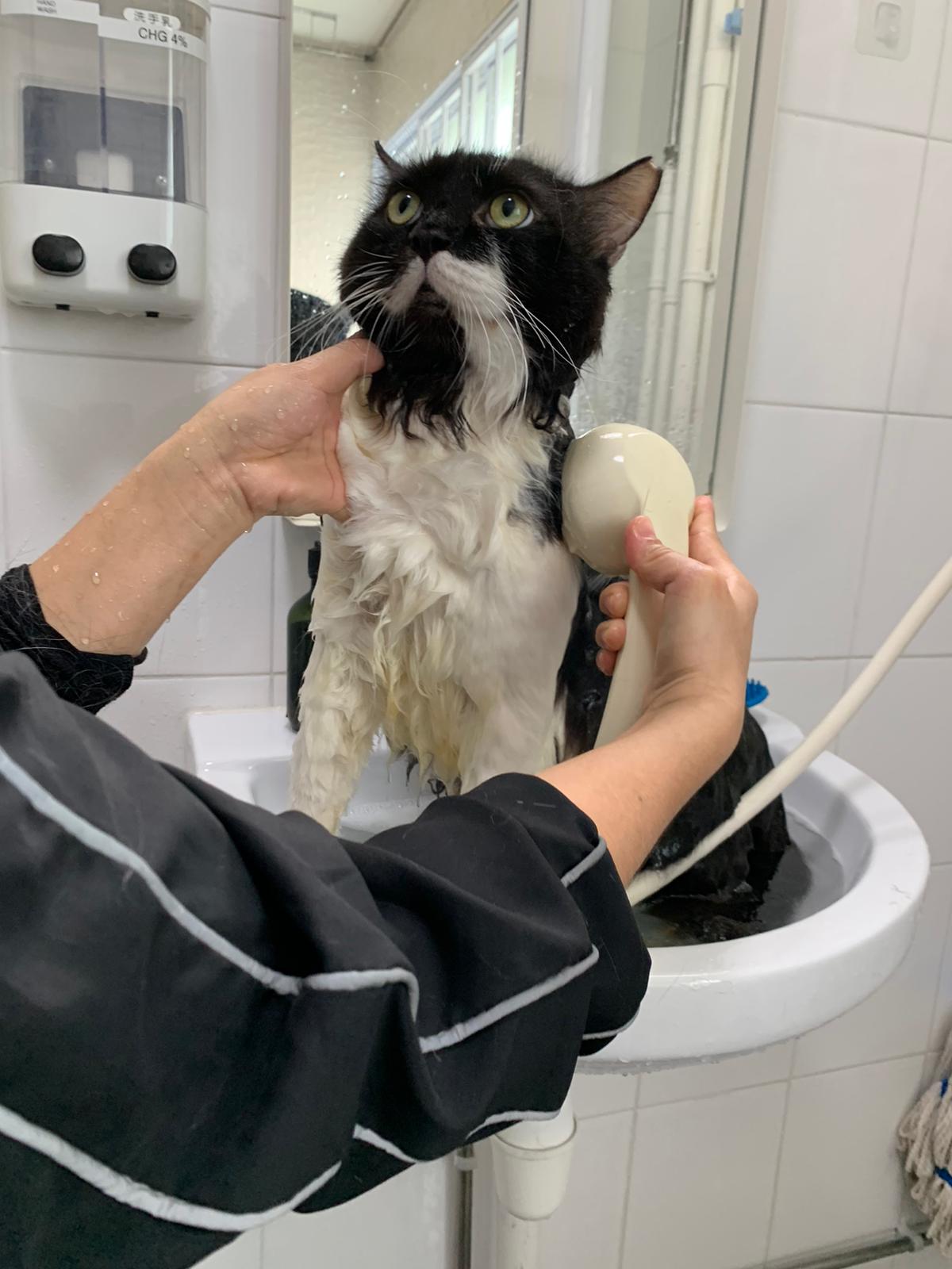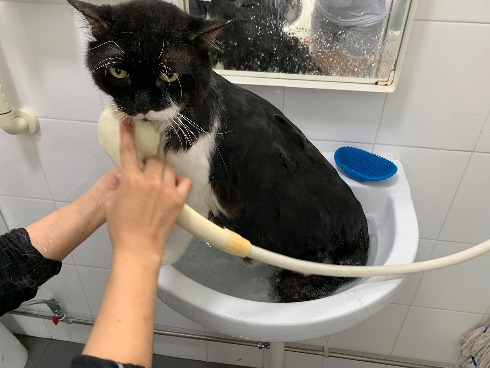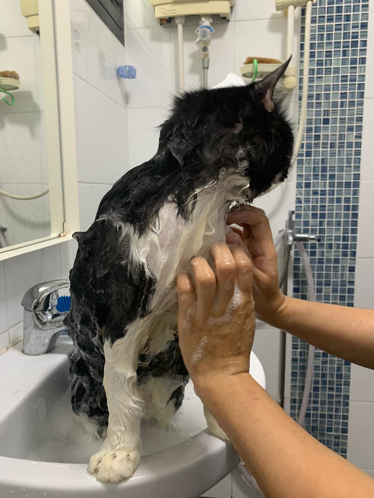 1248pm: start bathing. The stain on the tail is urine stain, can remove, have to scrub. He meowing for help