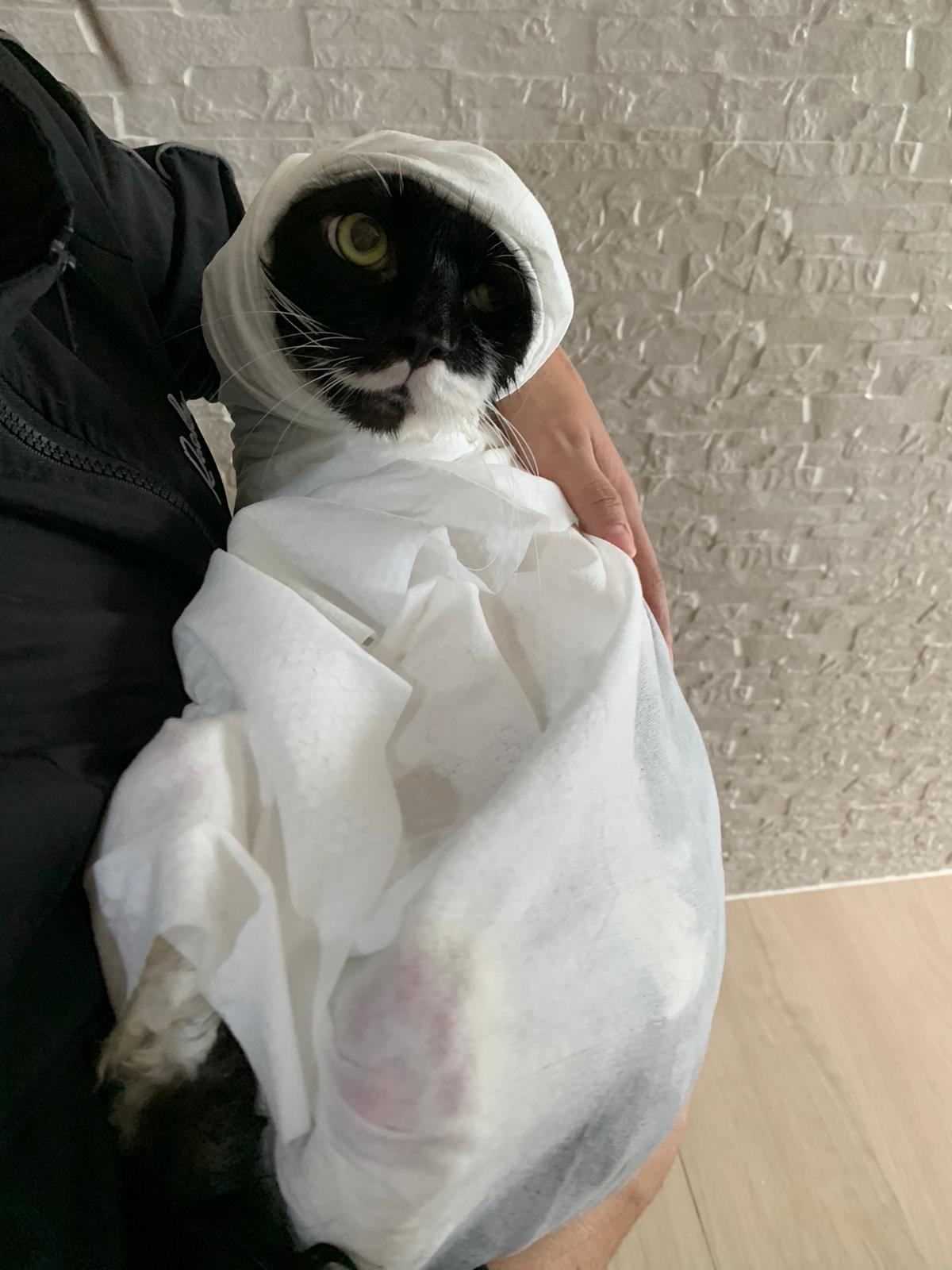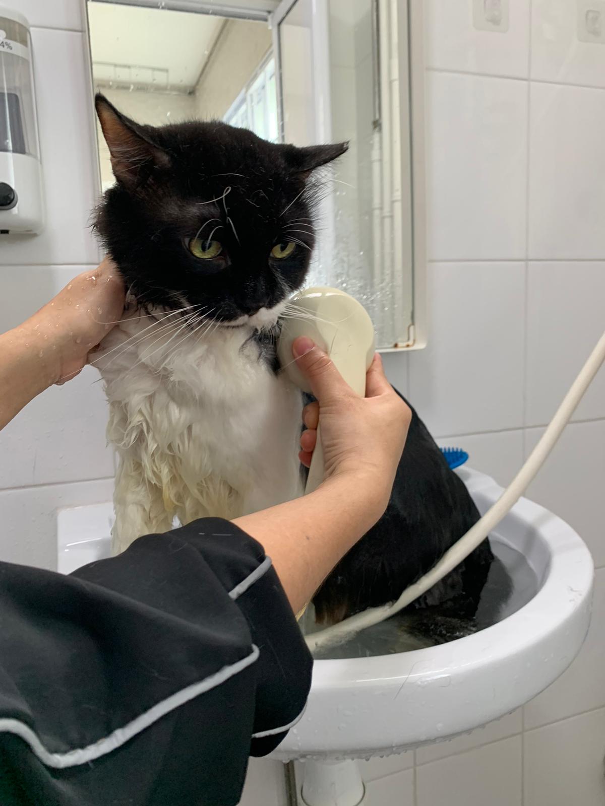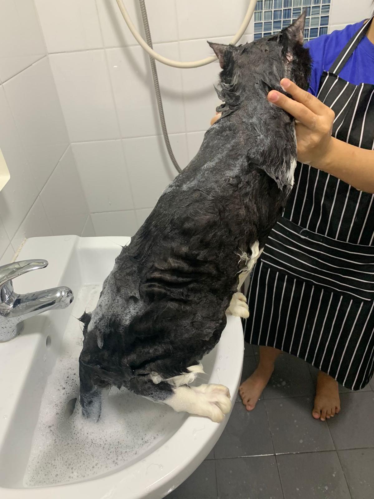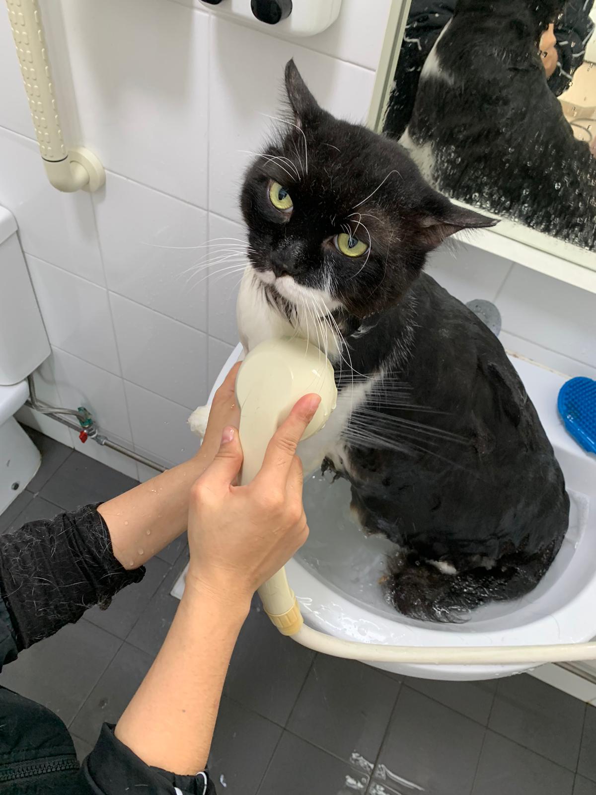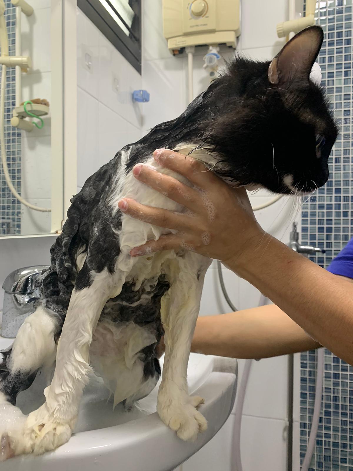 1248pm: start bathing. The stain on the tail is urine stain, can remove, have to scrub. He meowing for help