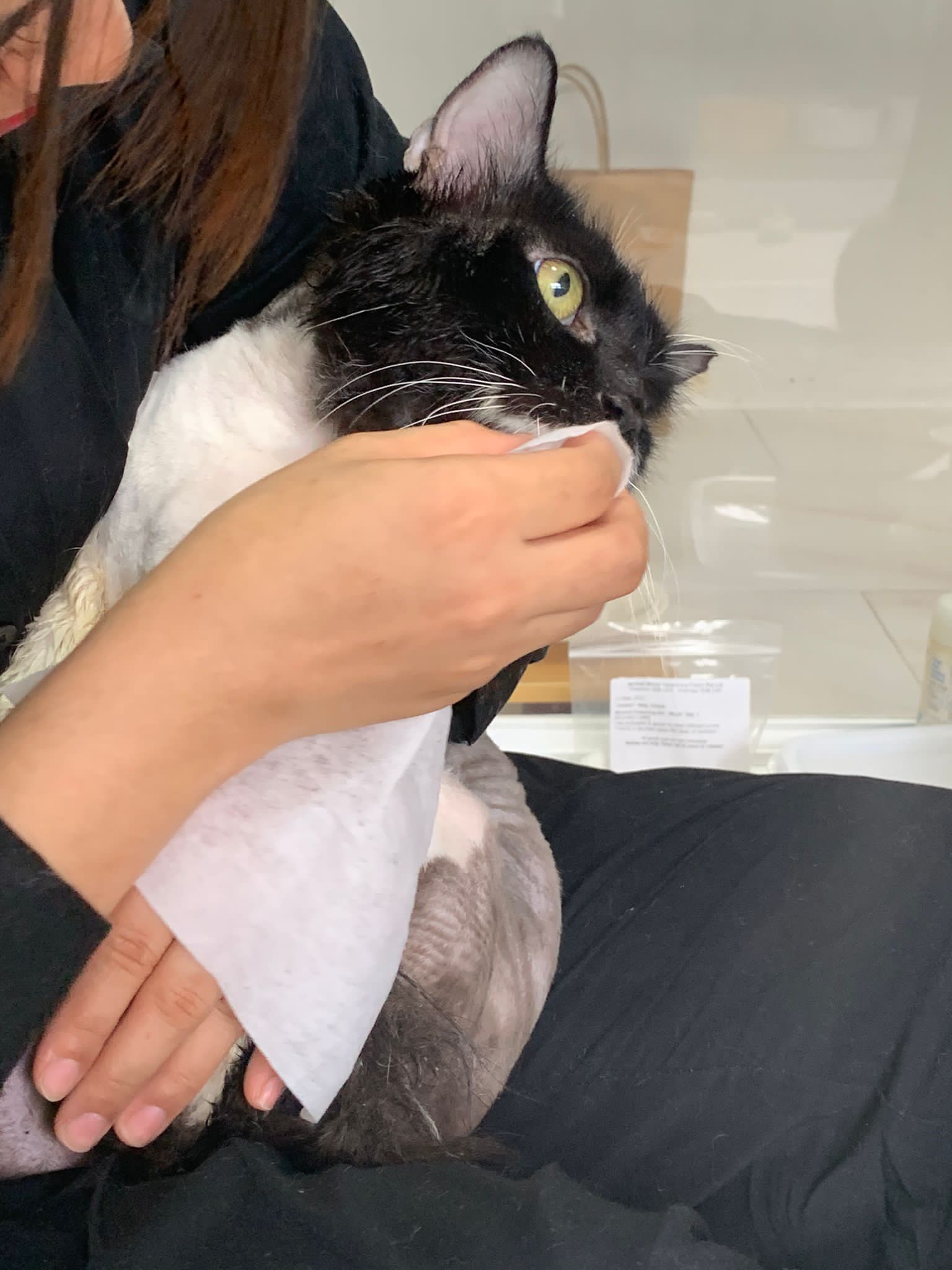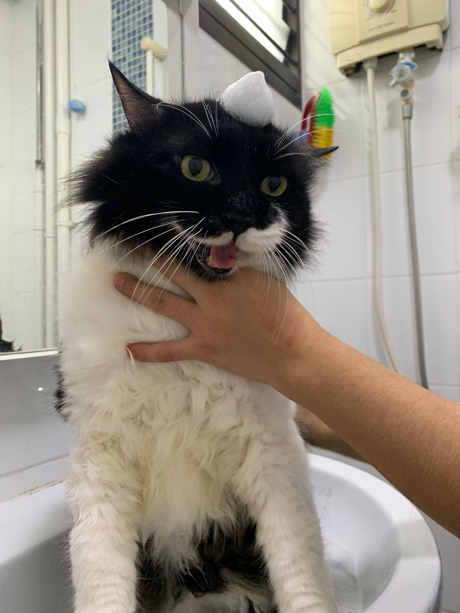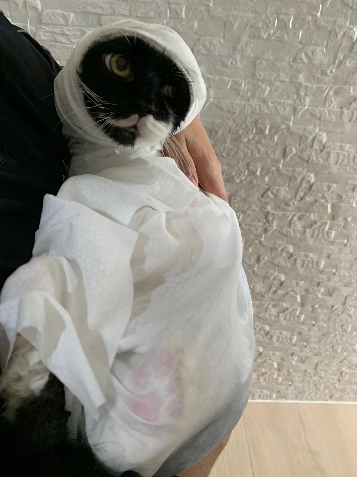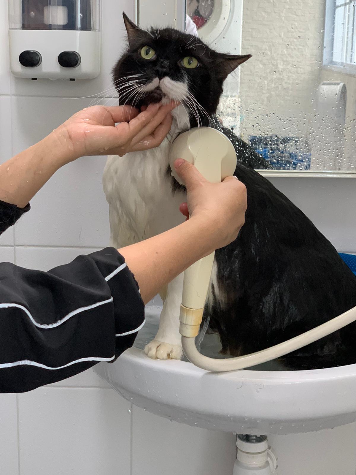 1248pm: start bathing. The stain on the tail is urine stain, can remove, have to scrub. He meowing for help