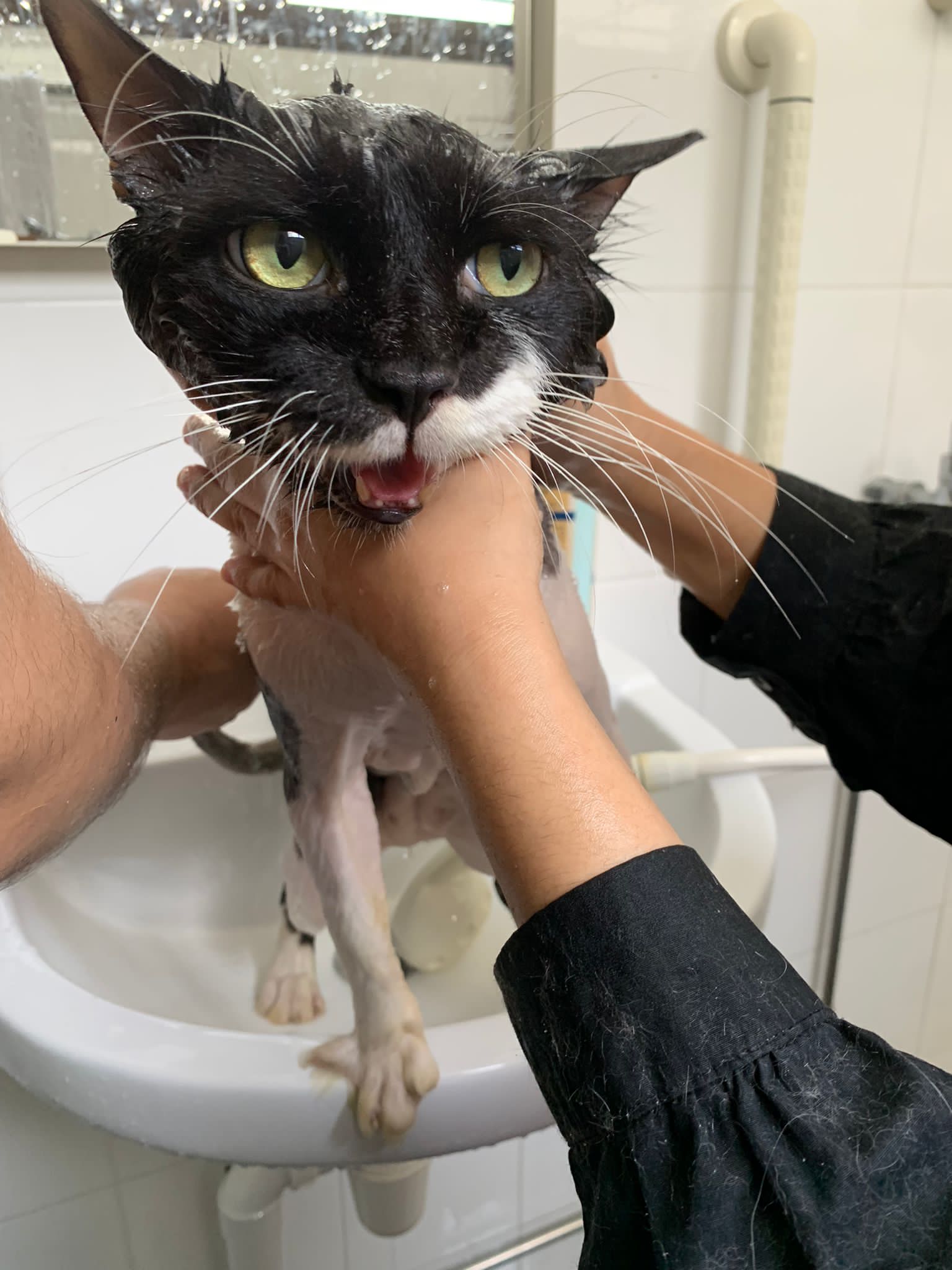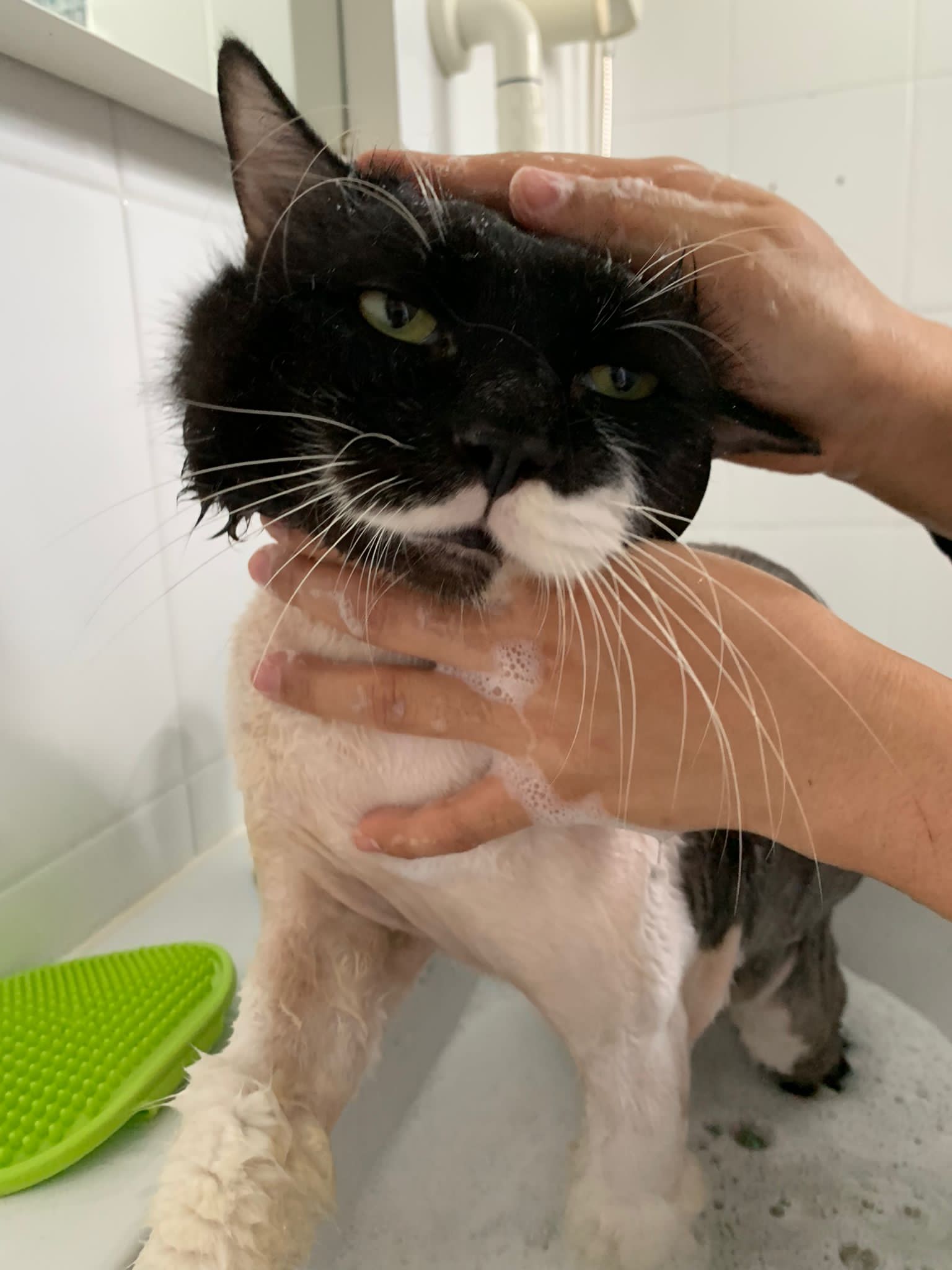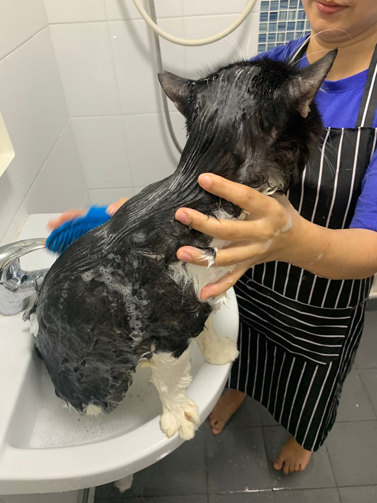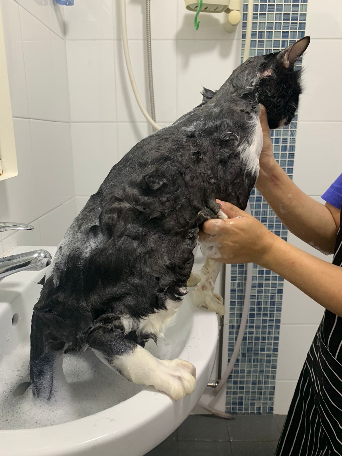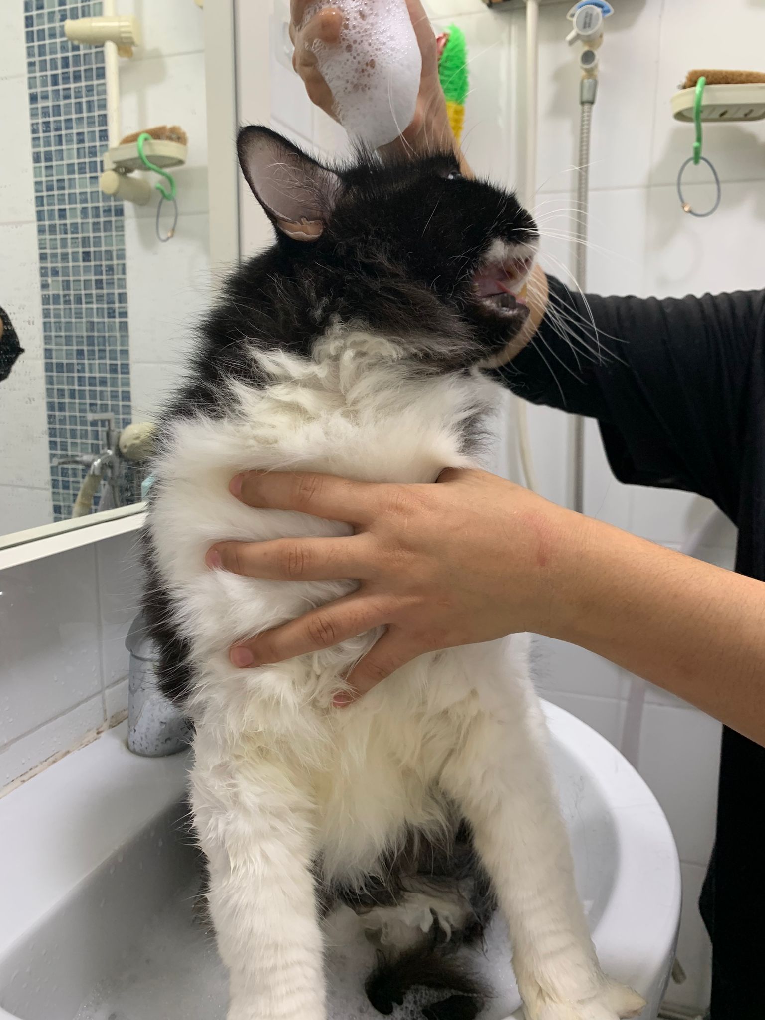 1248pm: start bathing. The stain on the tail is urine stain, can remove, have to scrub. He meowing for help