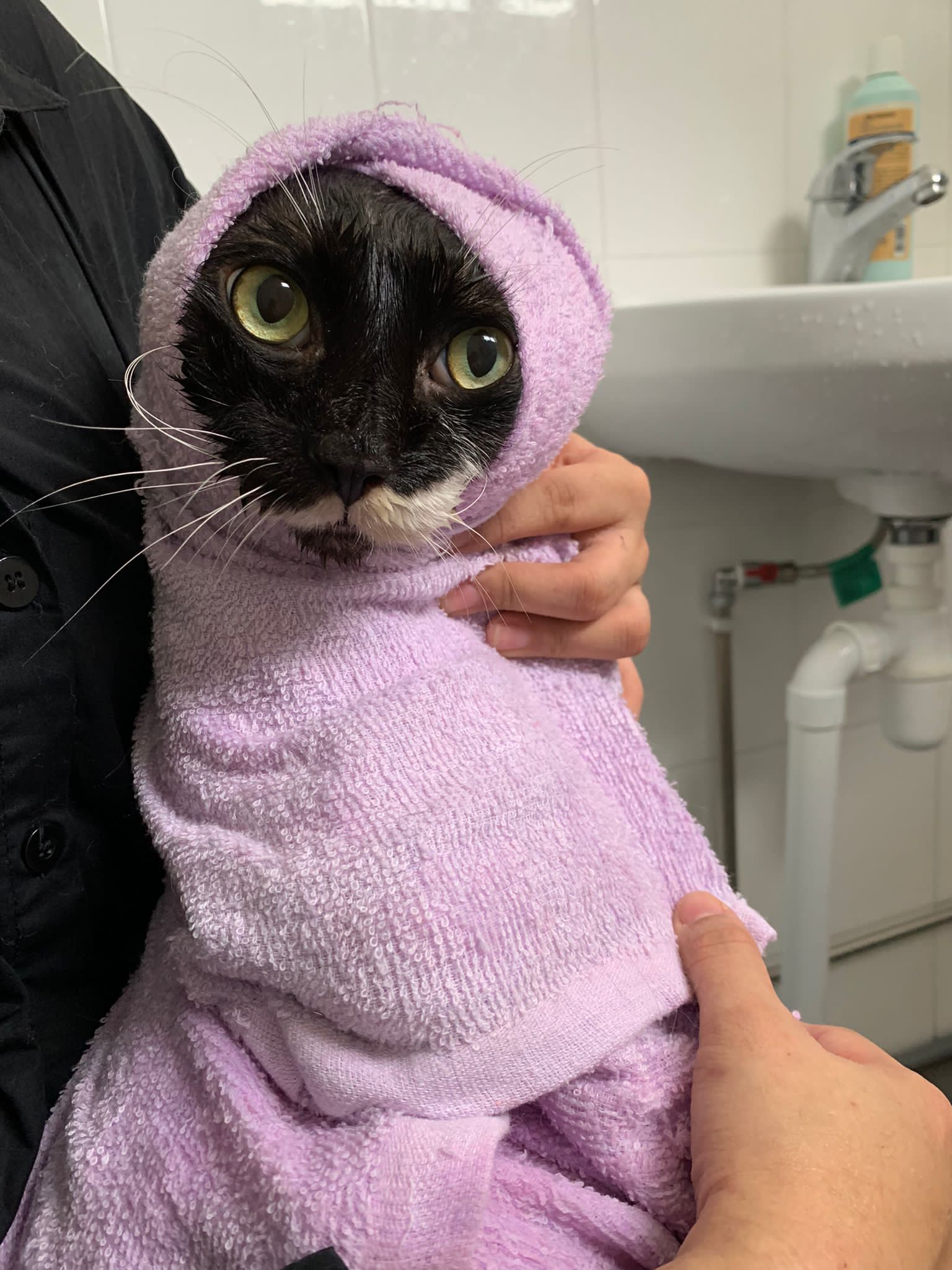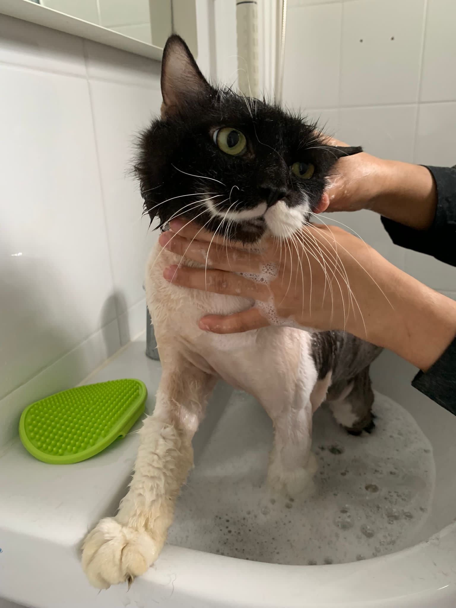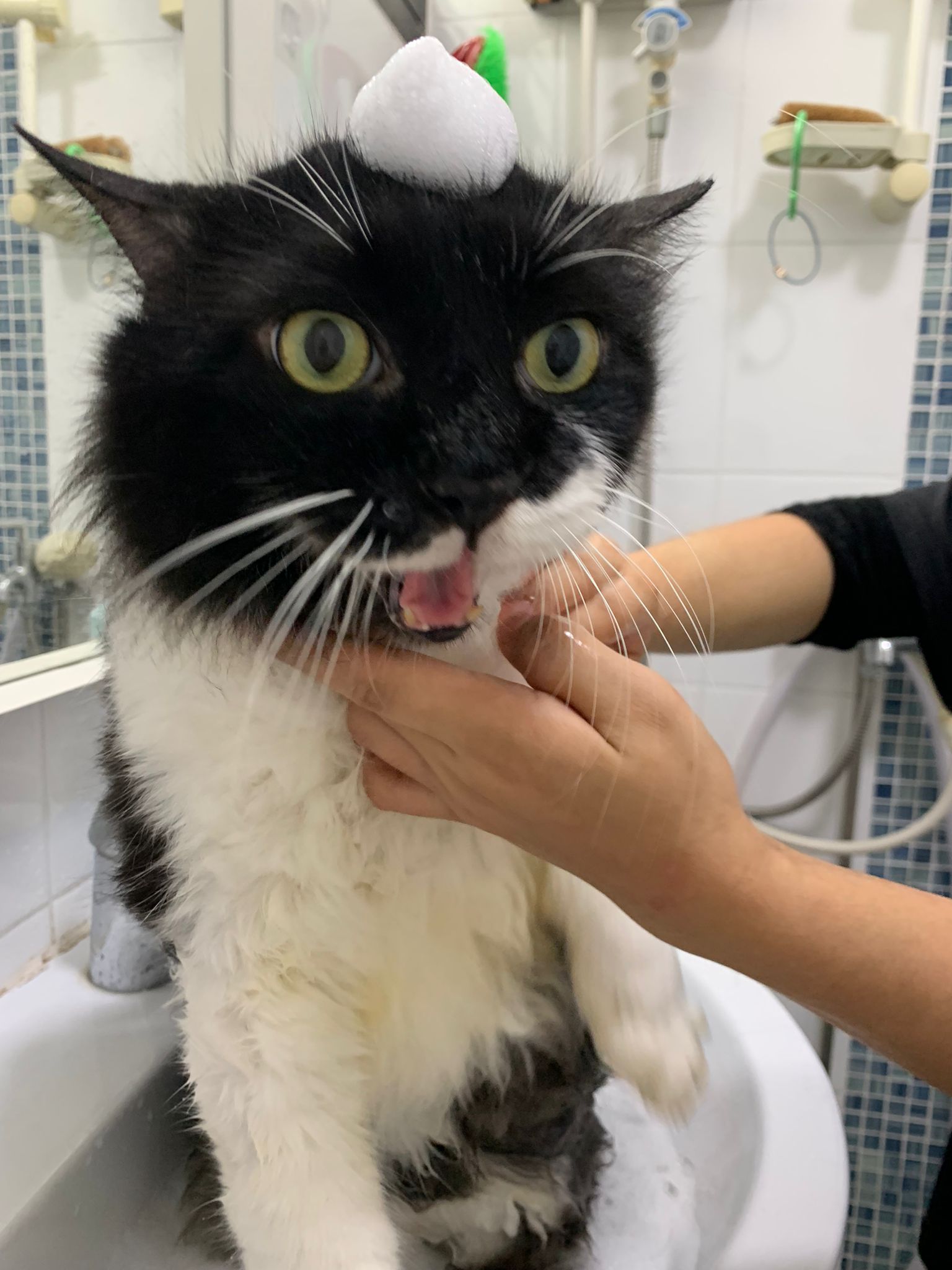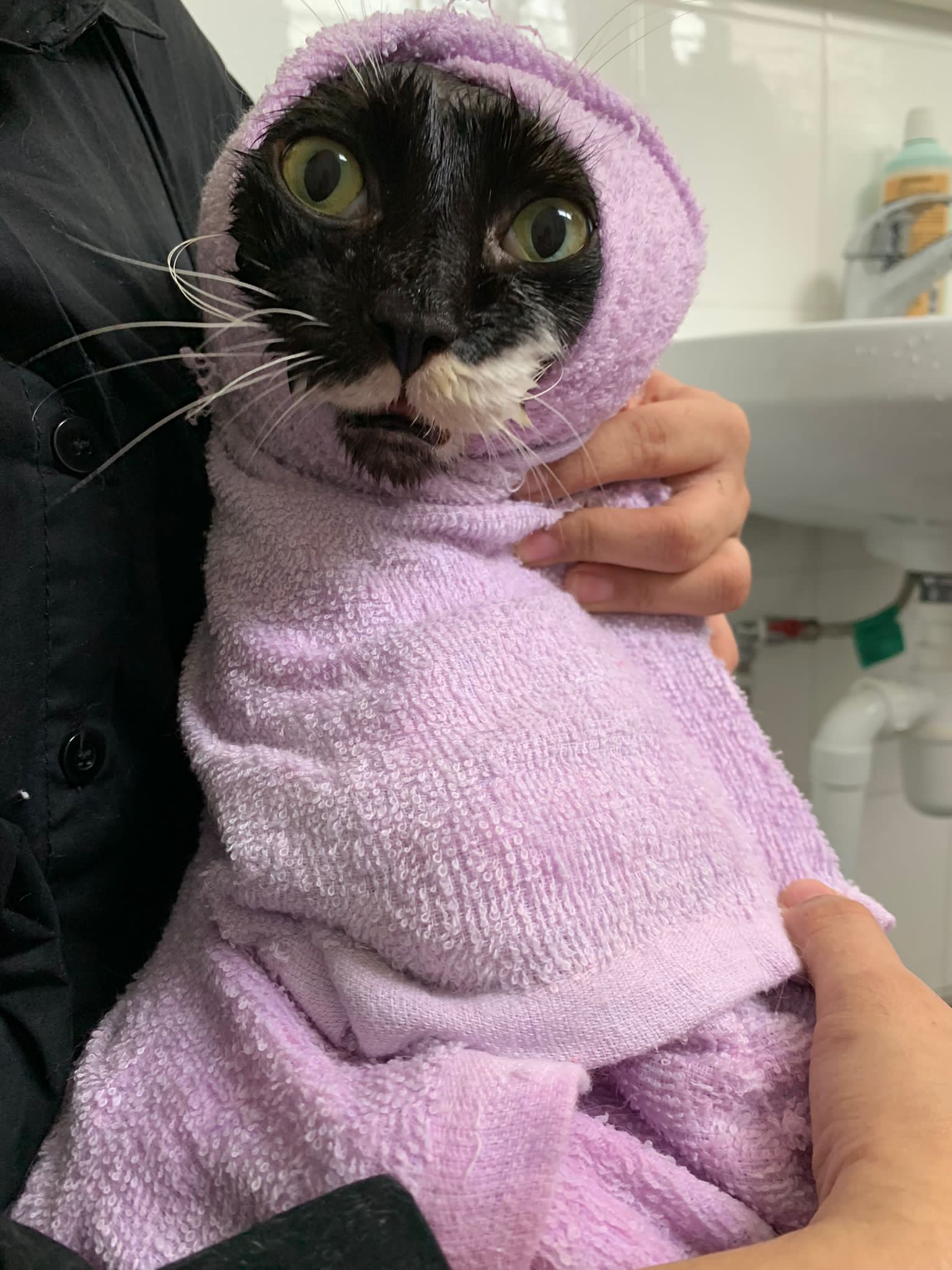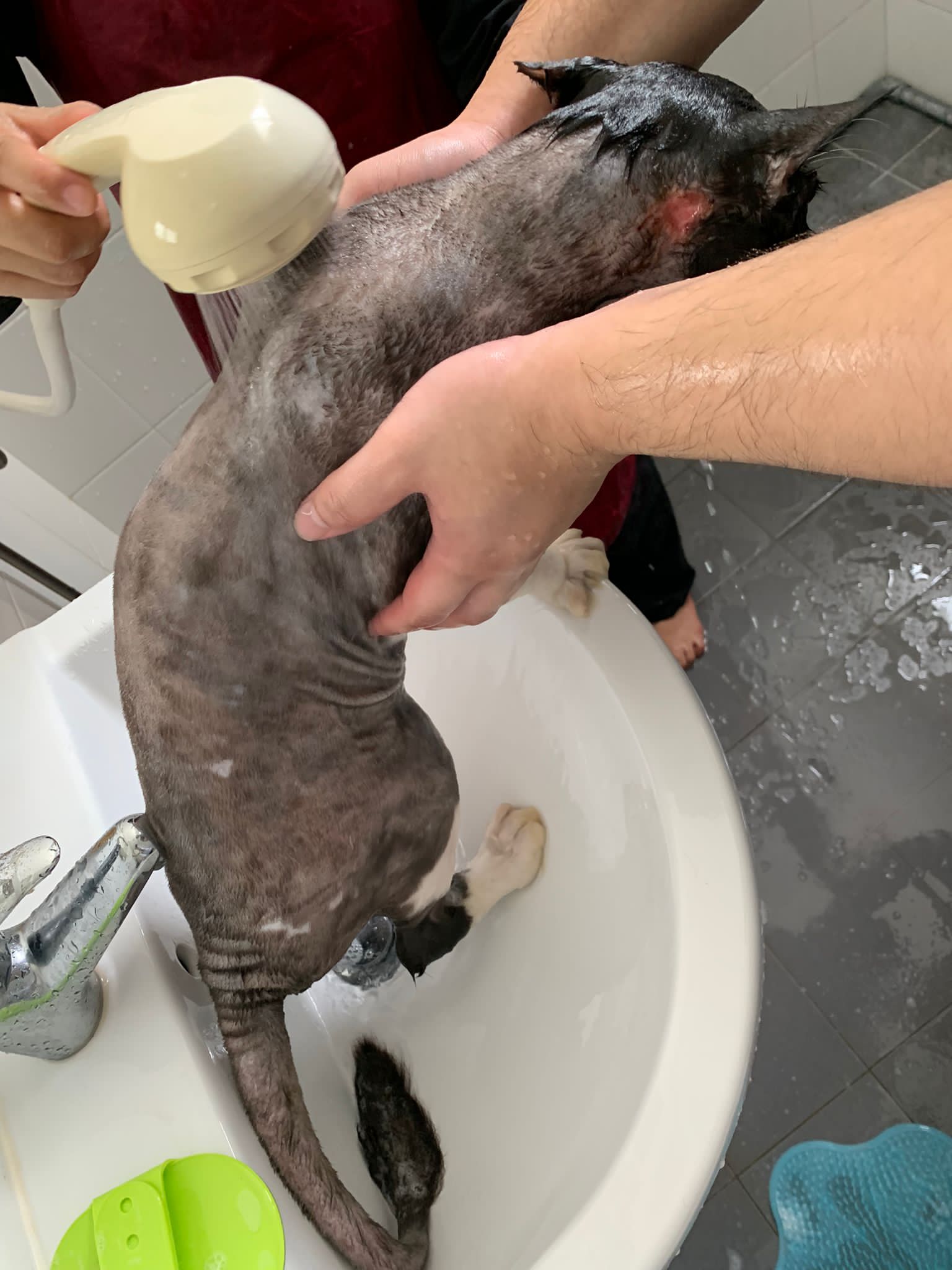 1248pm: start bathing. The stain on the tail is urine stain, can remove, have to scrub. He meowing for help