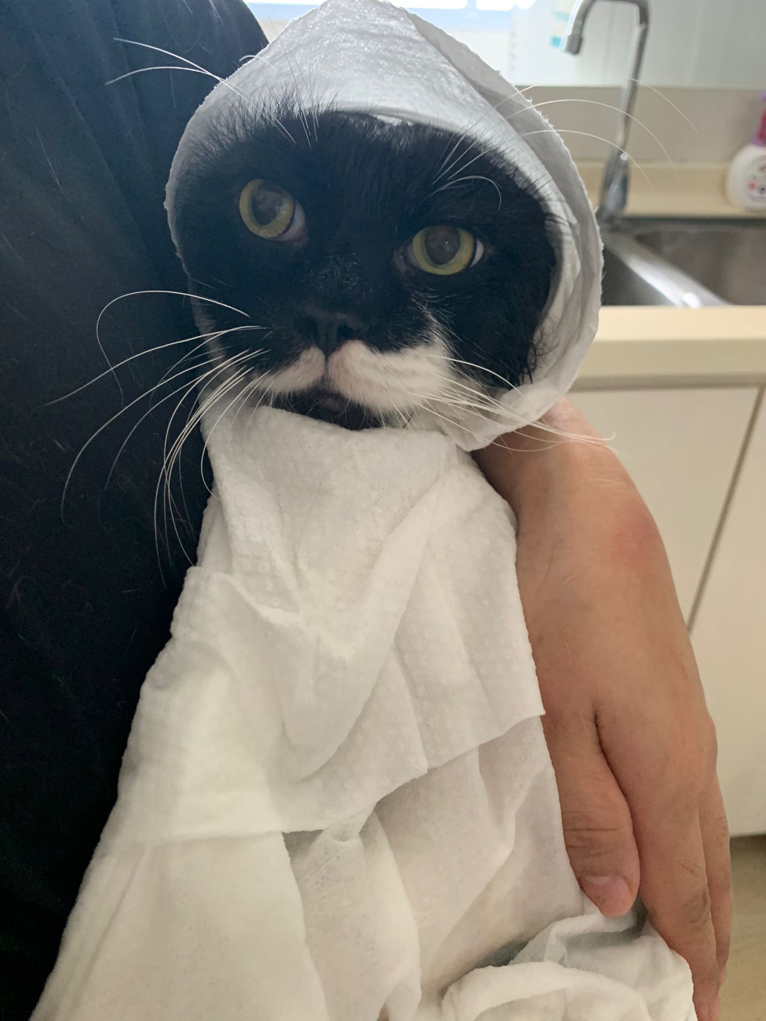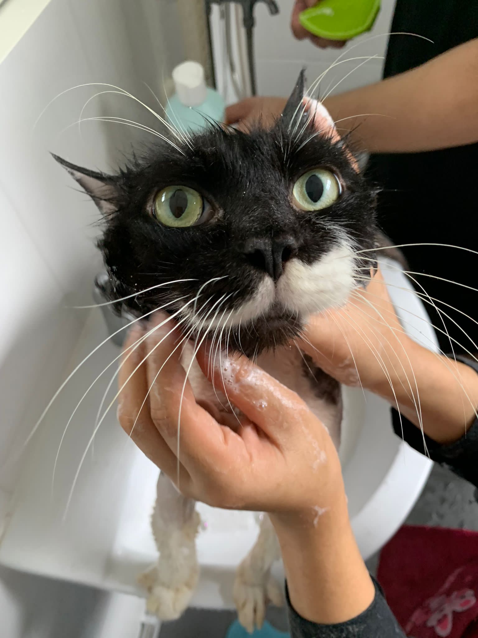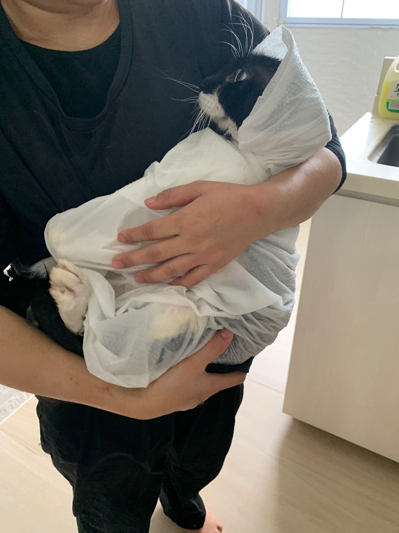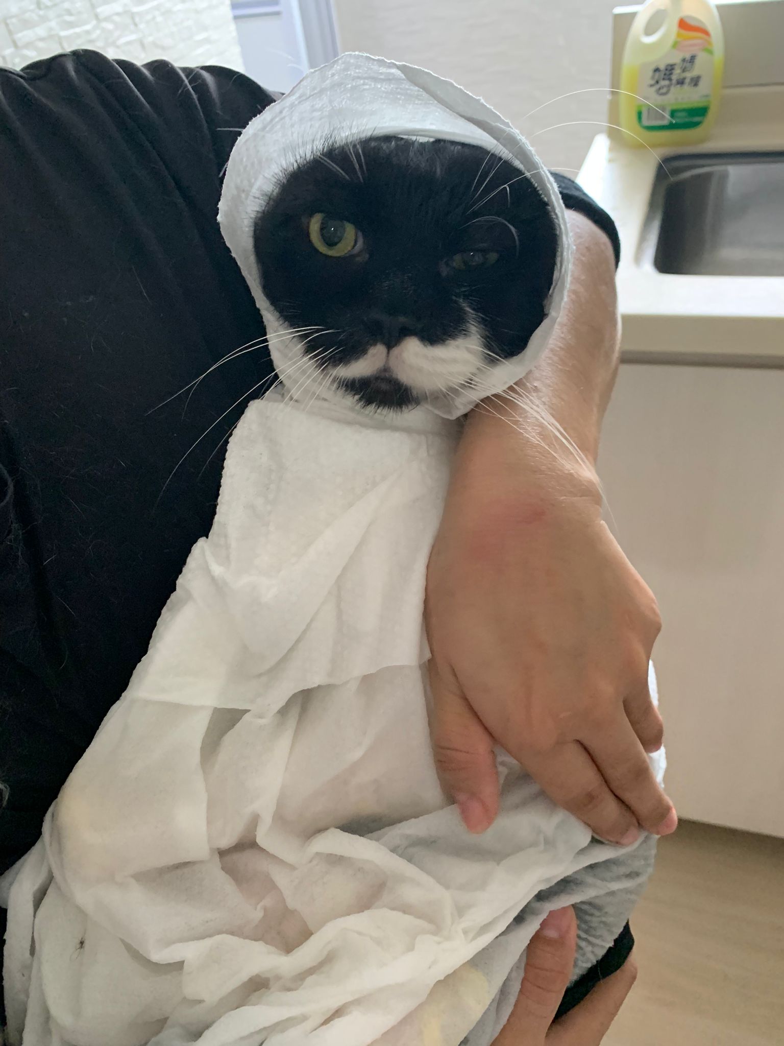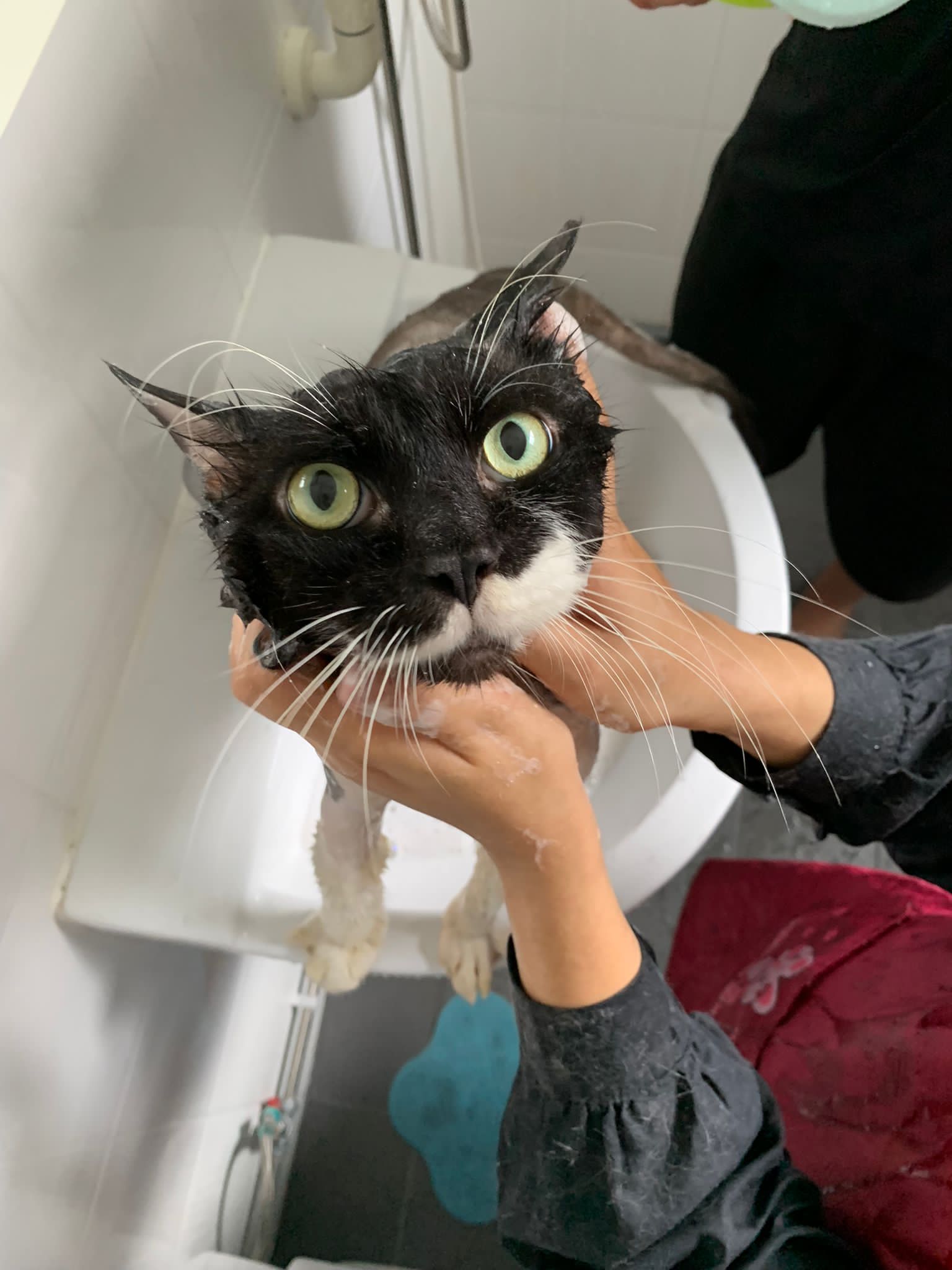 1248pm: start bathing. The stain on the tail is urine stain, can remove, have to scrub. He meowing for help