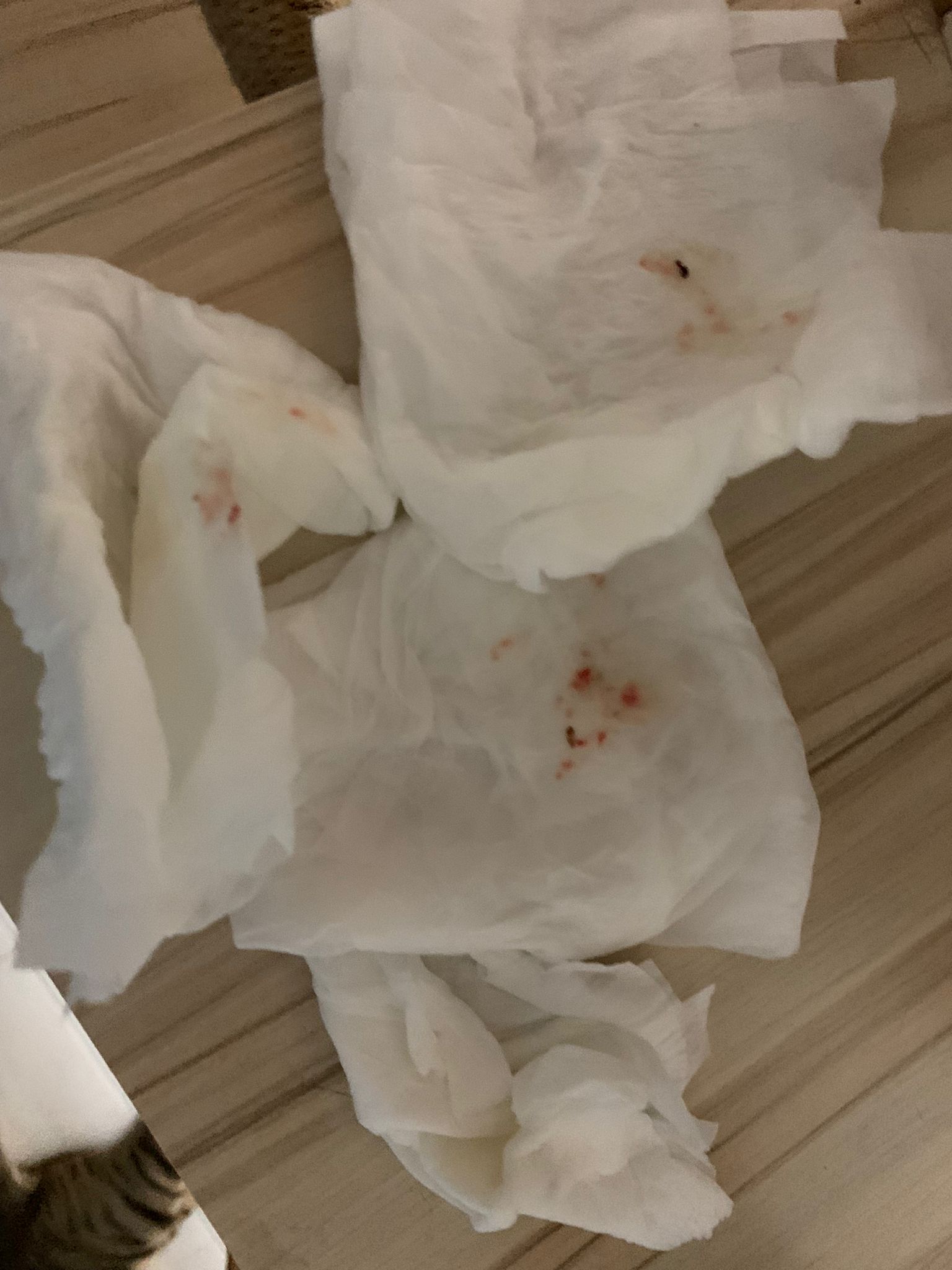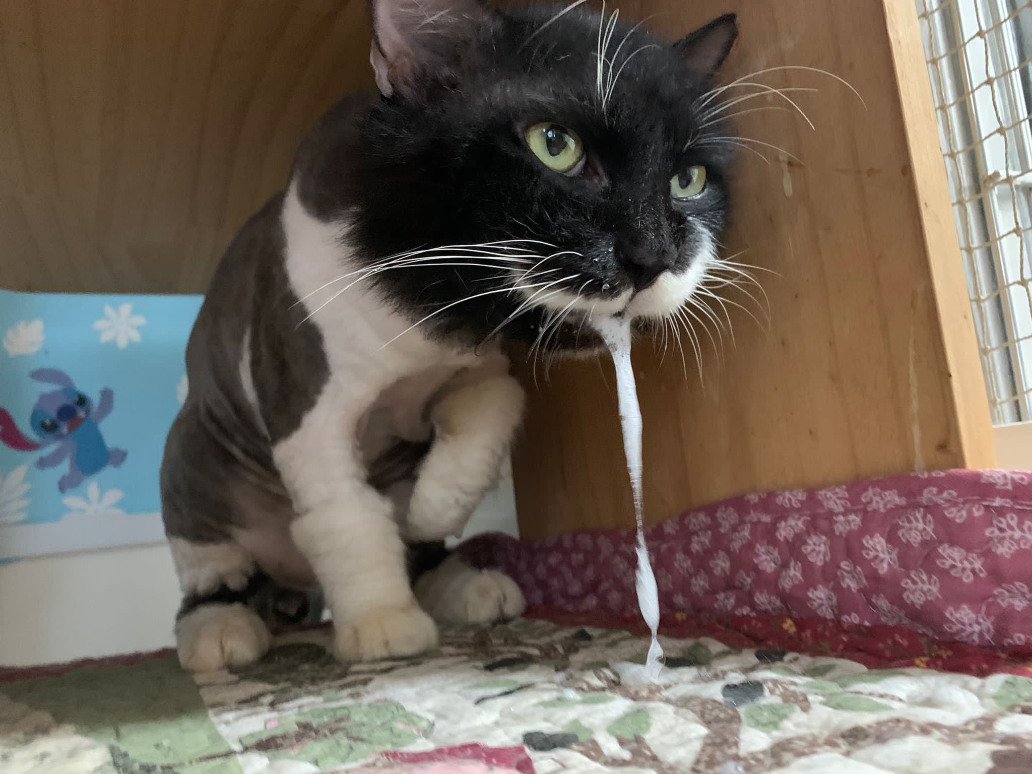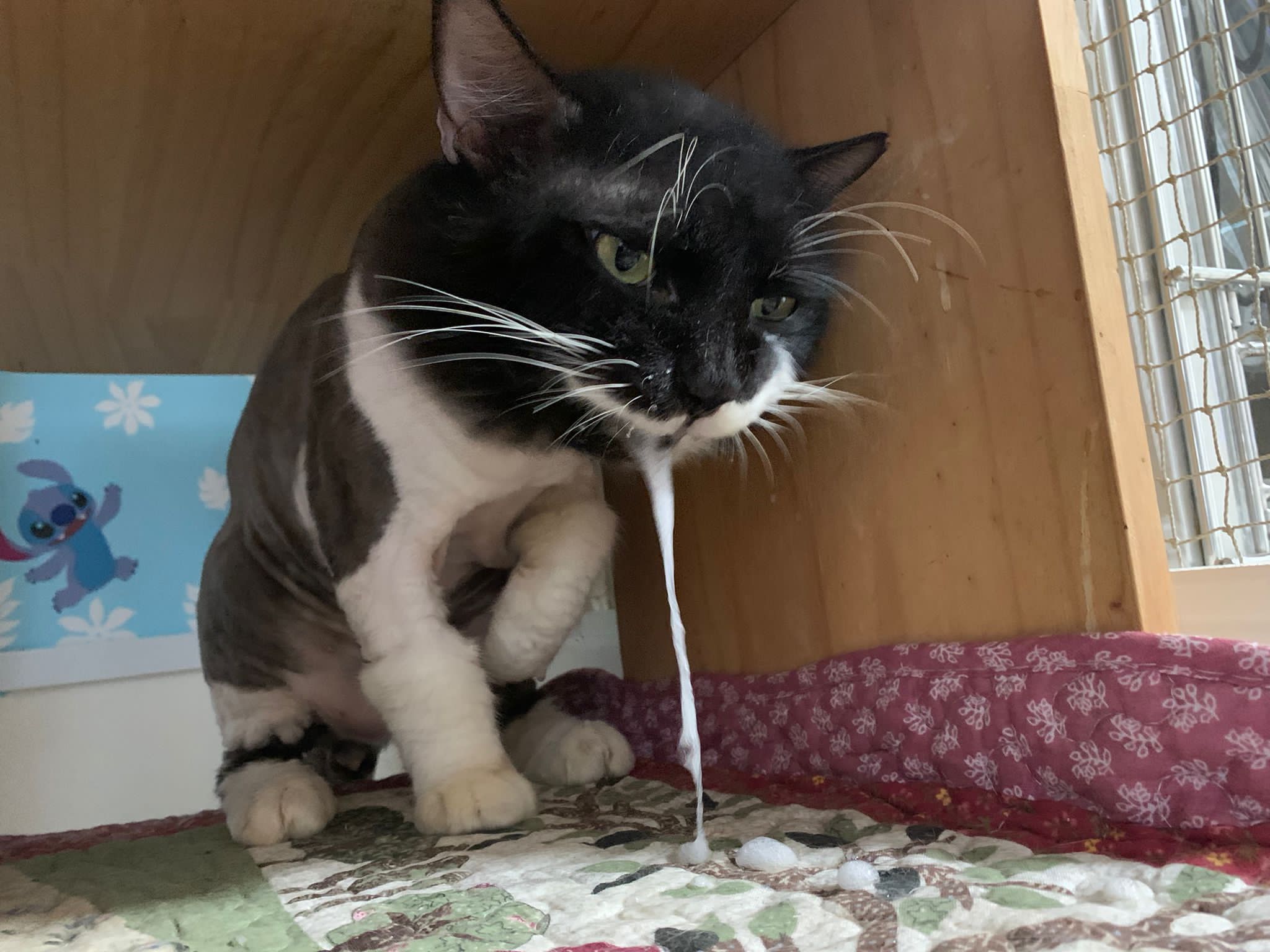 358pm: given probiotics. Still active come out walk n sit on ratten chair and on mat. clean his wound. While I’m doing stuff, don’t know what he did or lick or taste something in his mouth? (Probiotics?) he start to foam. Clean him up. Mat all his saliva, give him for his room. Tmr I go buy new one again.