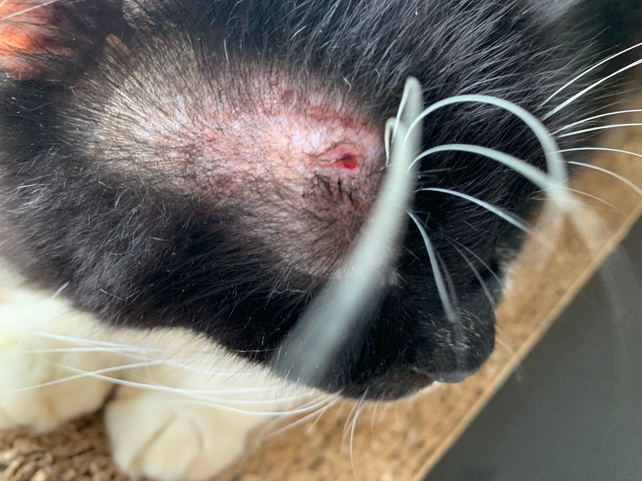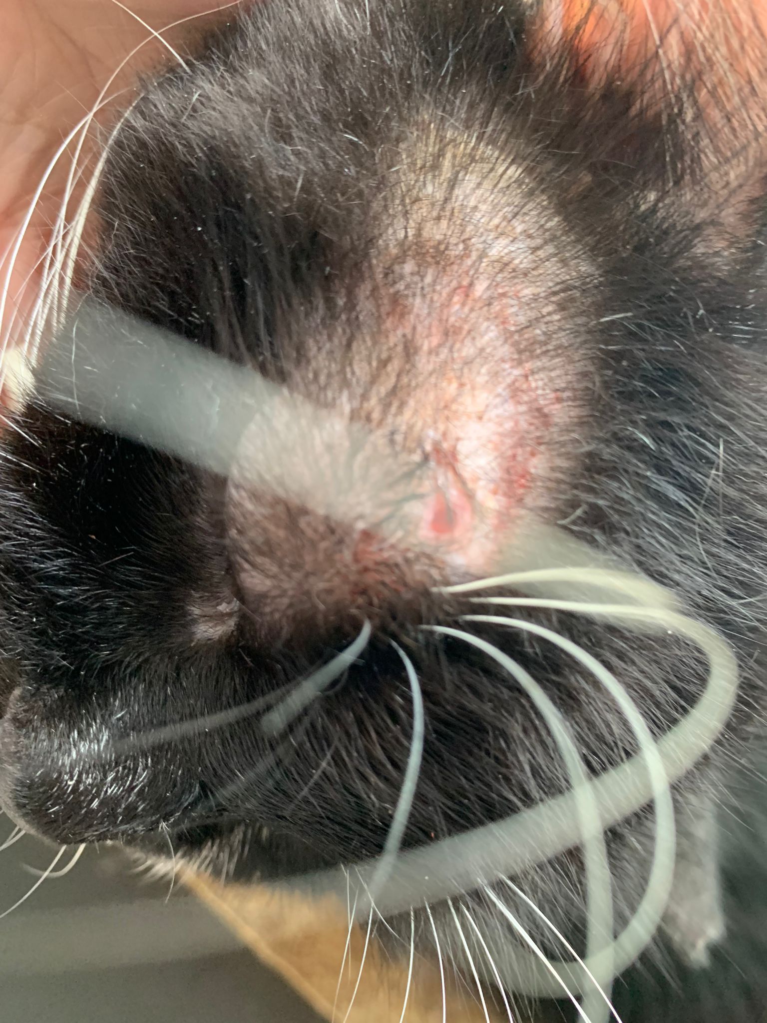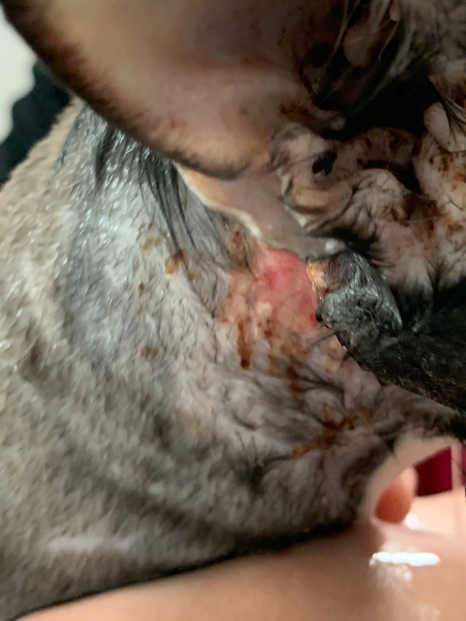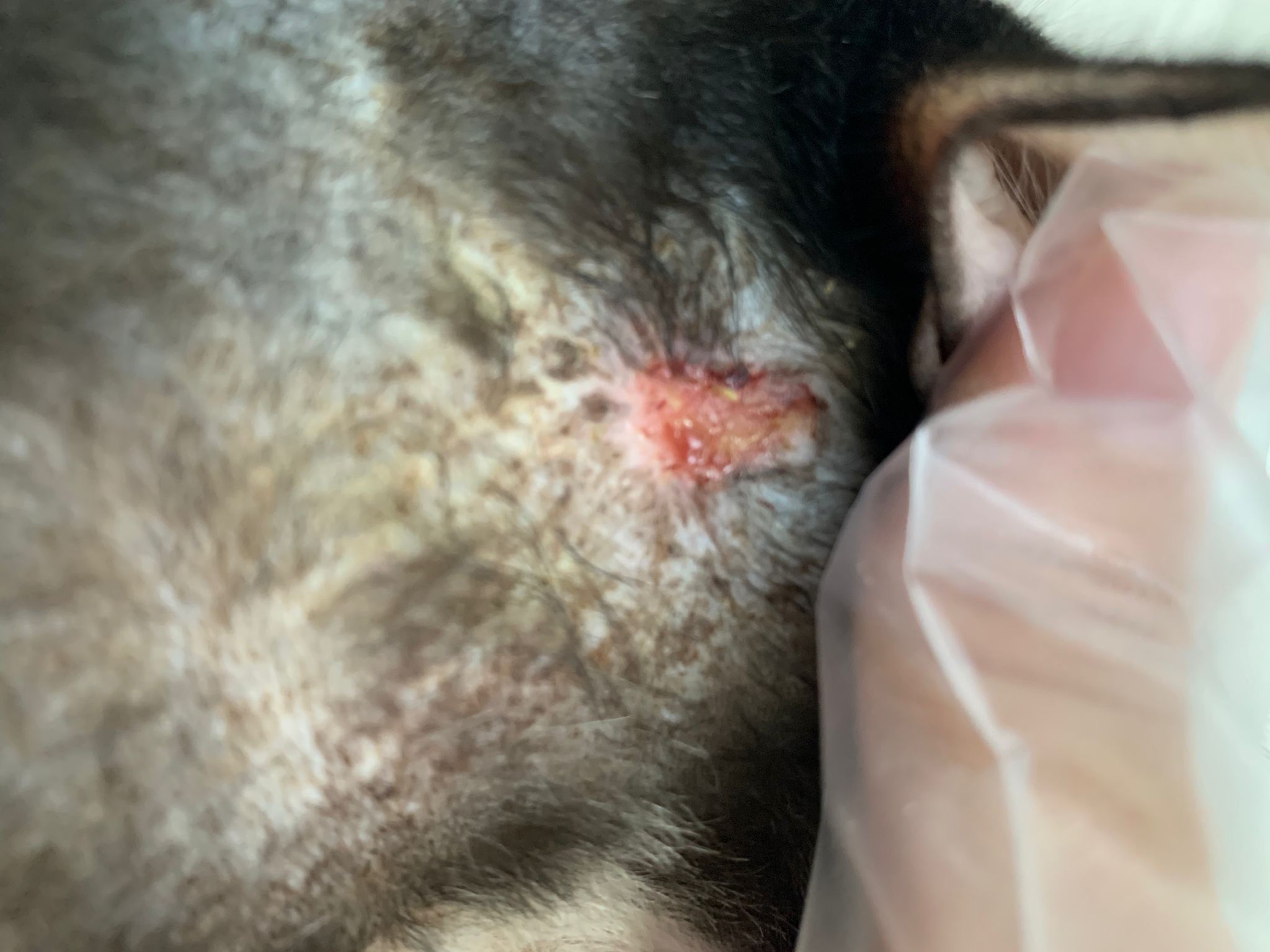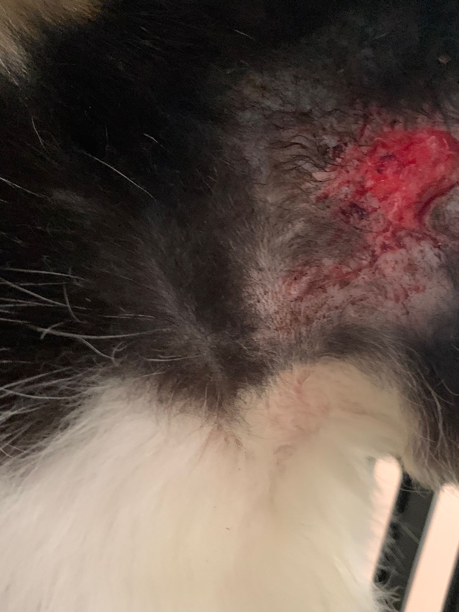 Ear/Furmites – both sides of face below ears got issue. Right red raw w wound.