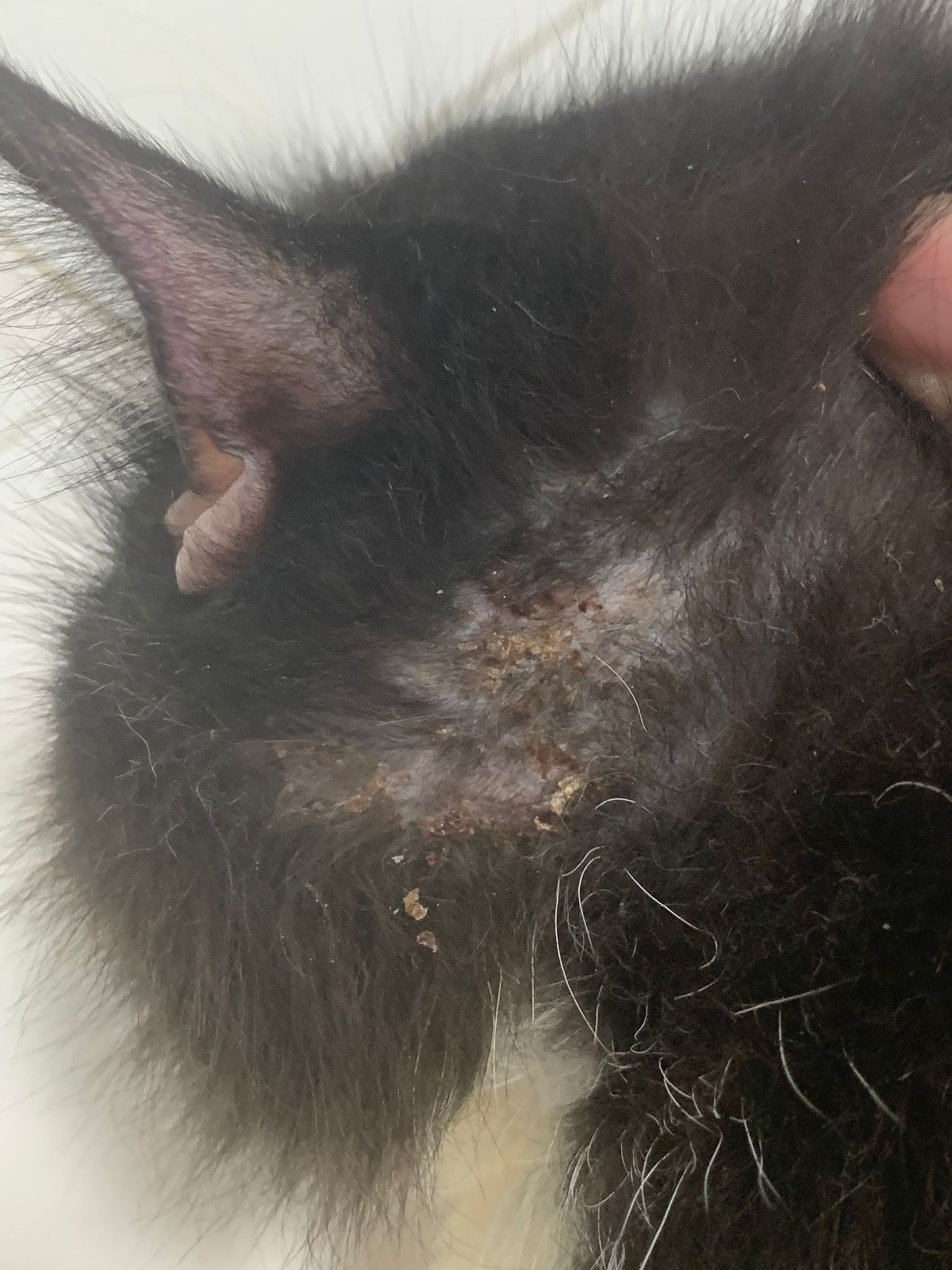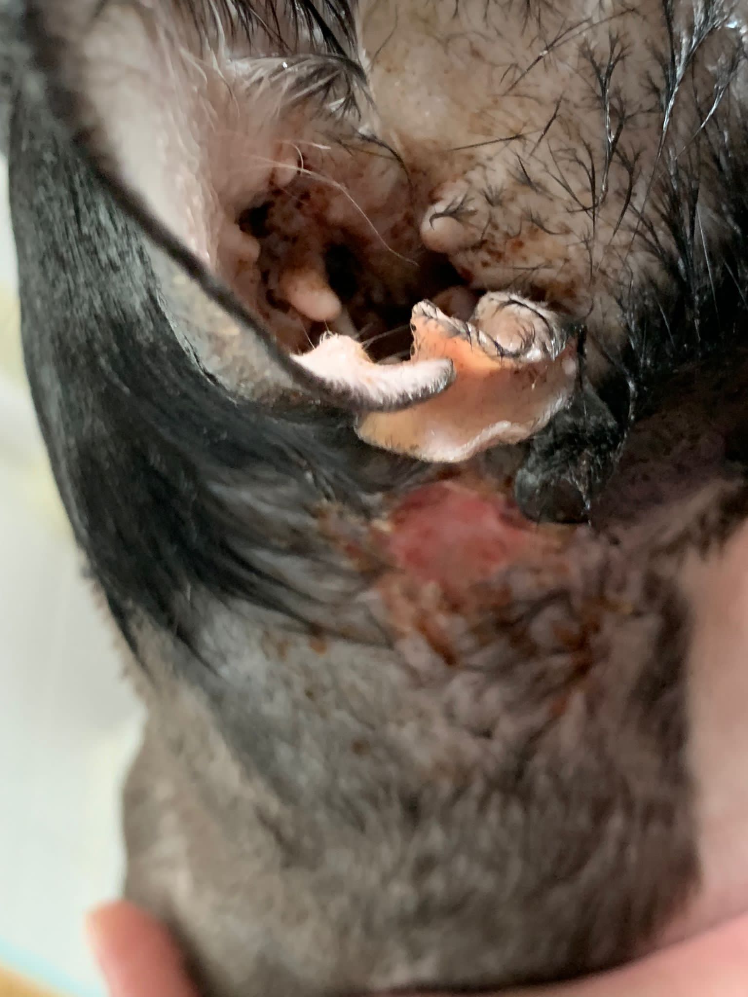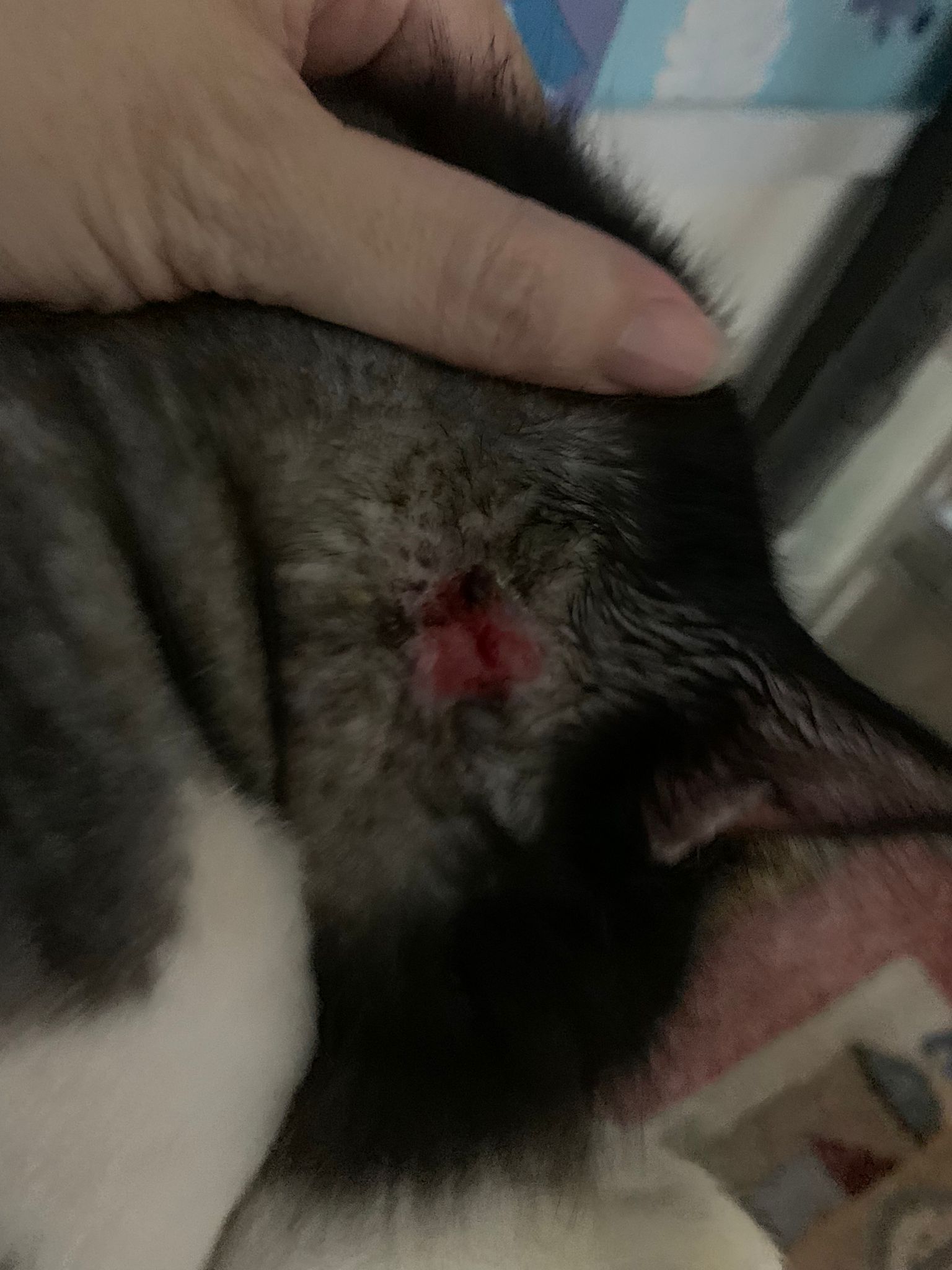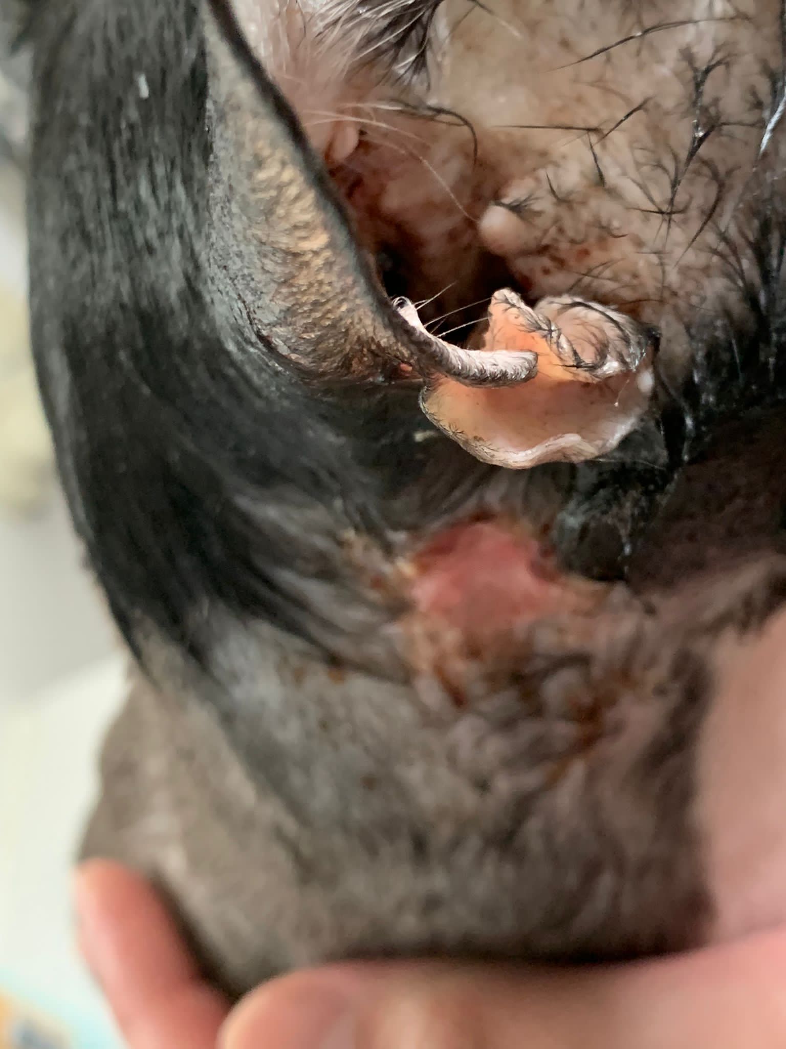Ear/Furmites – both sides of face below ears got issue. Right red raw w wound.