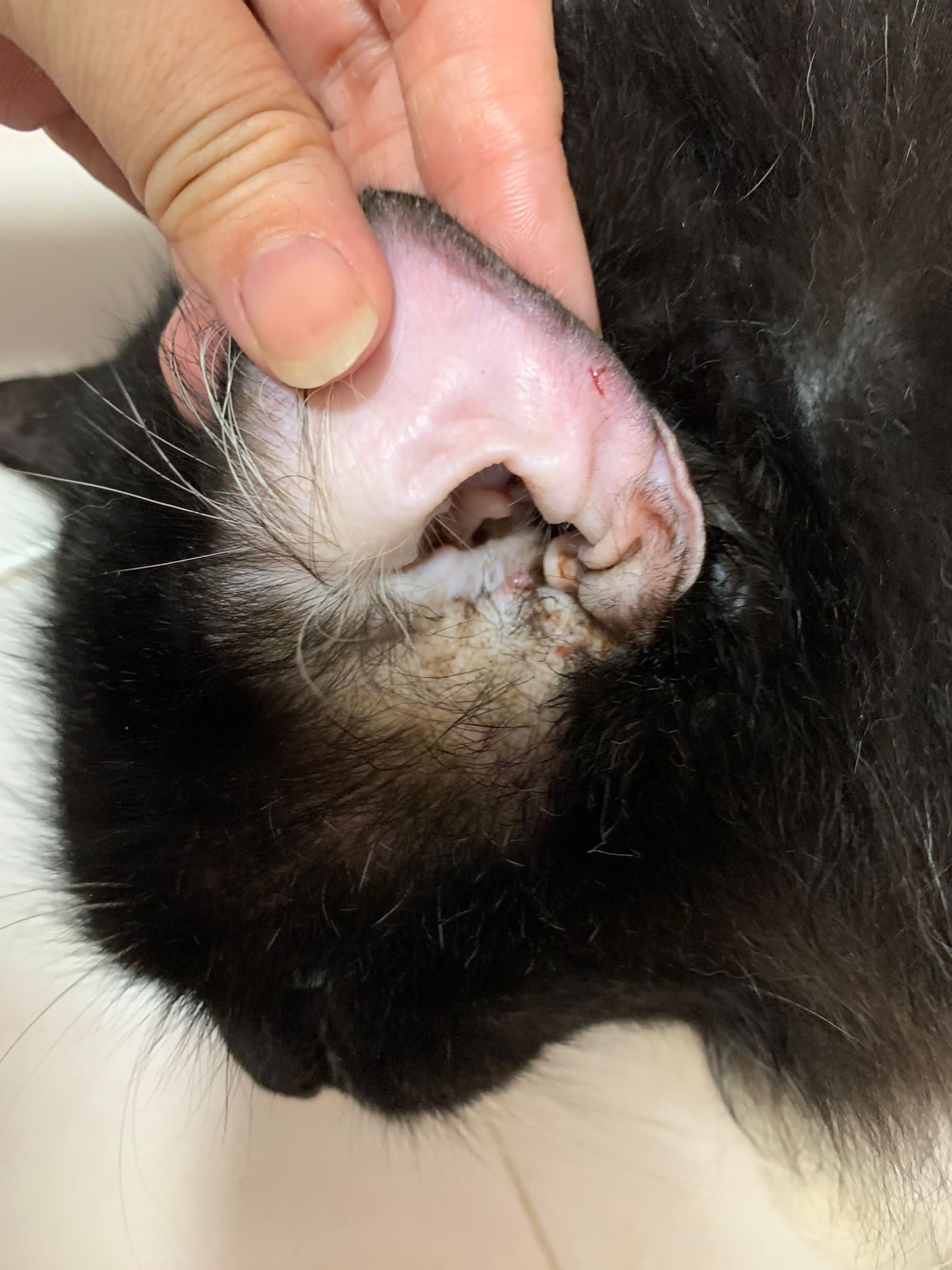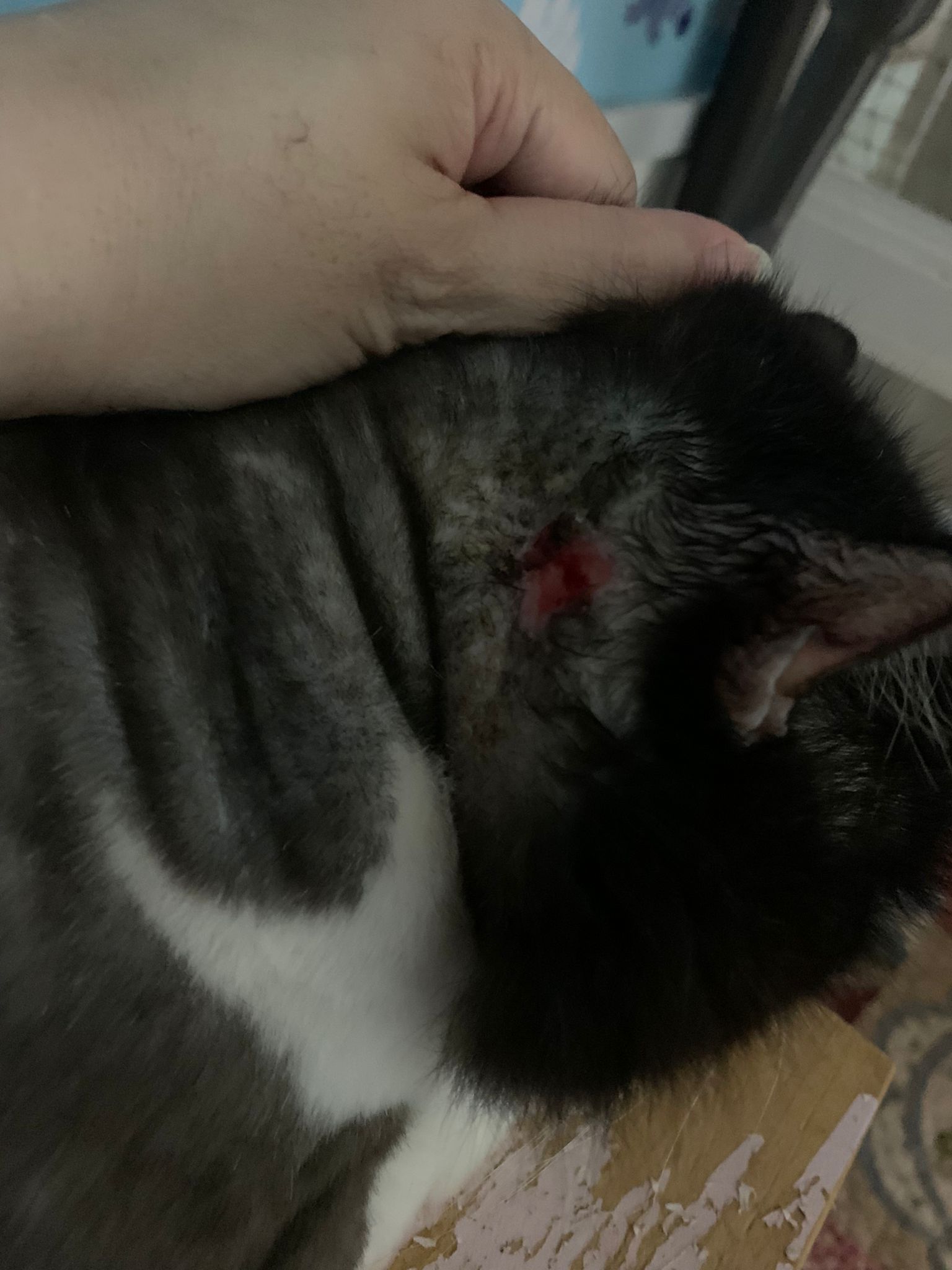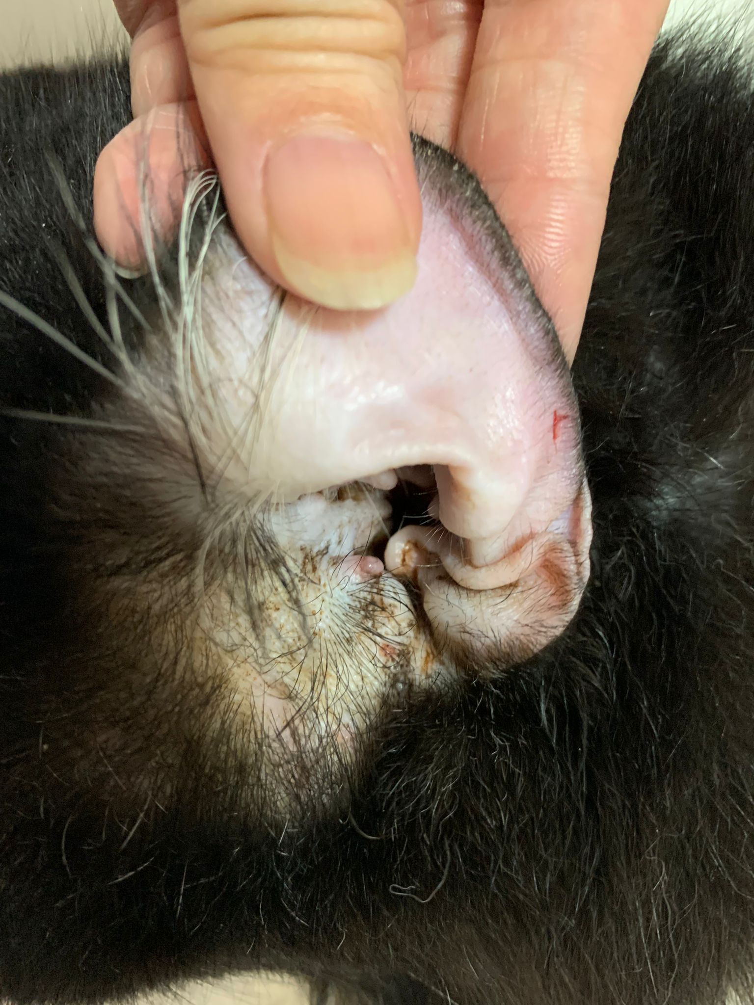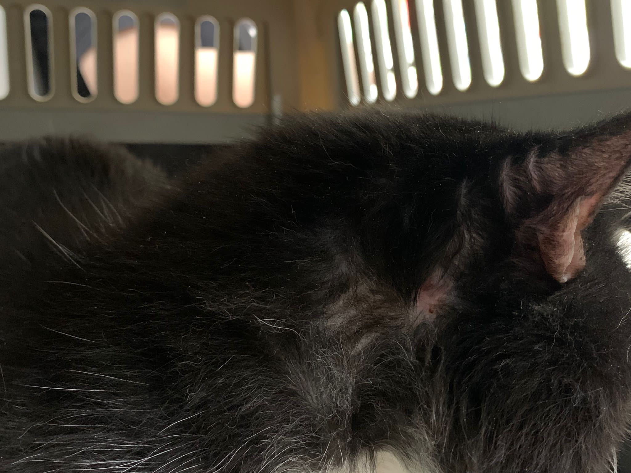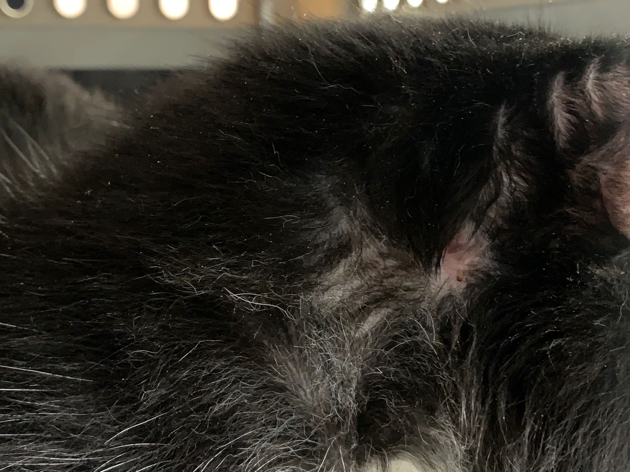 Ear/Furmites – both sides of face below ears got issue. Right red raw w wound.