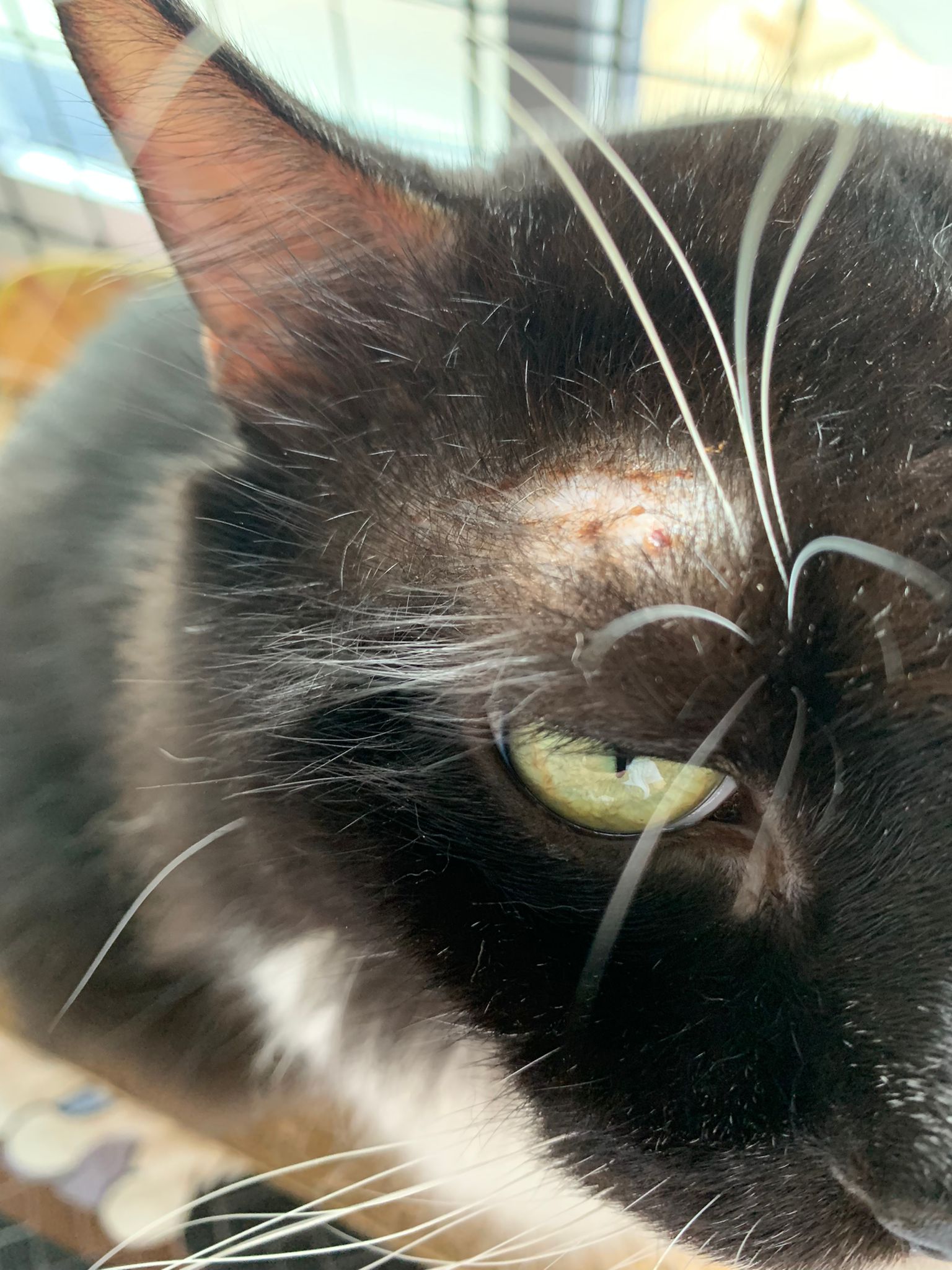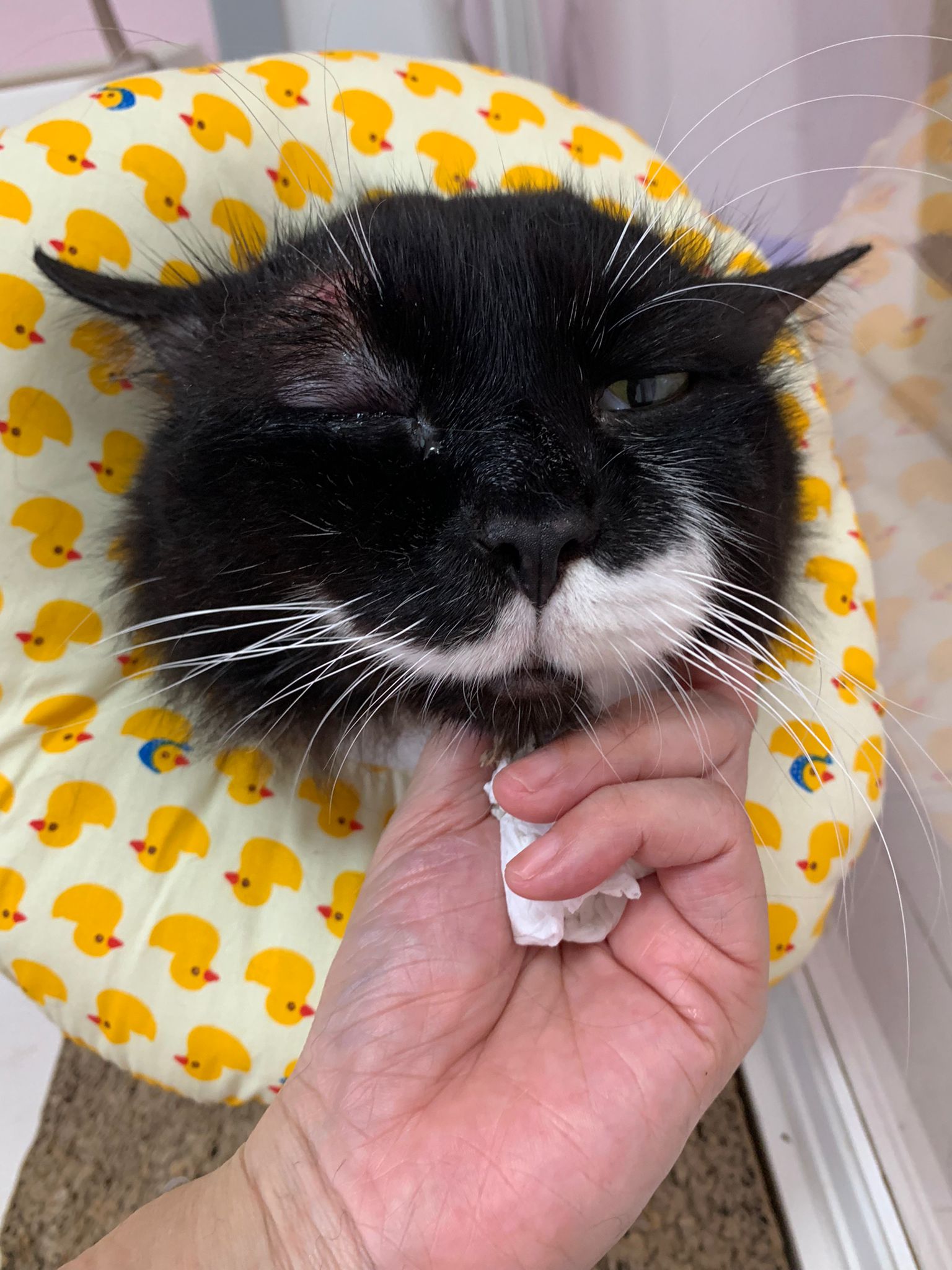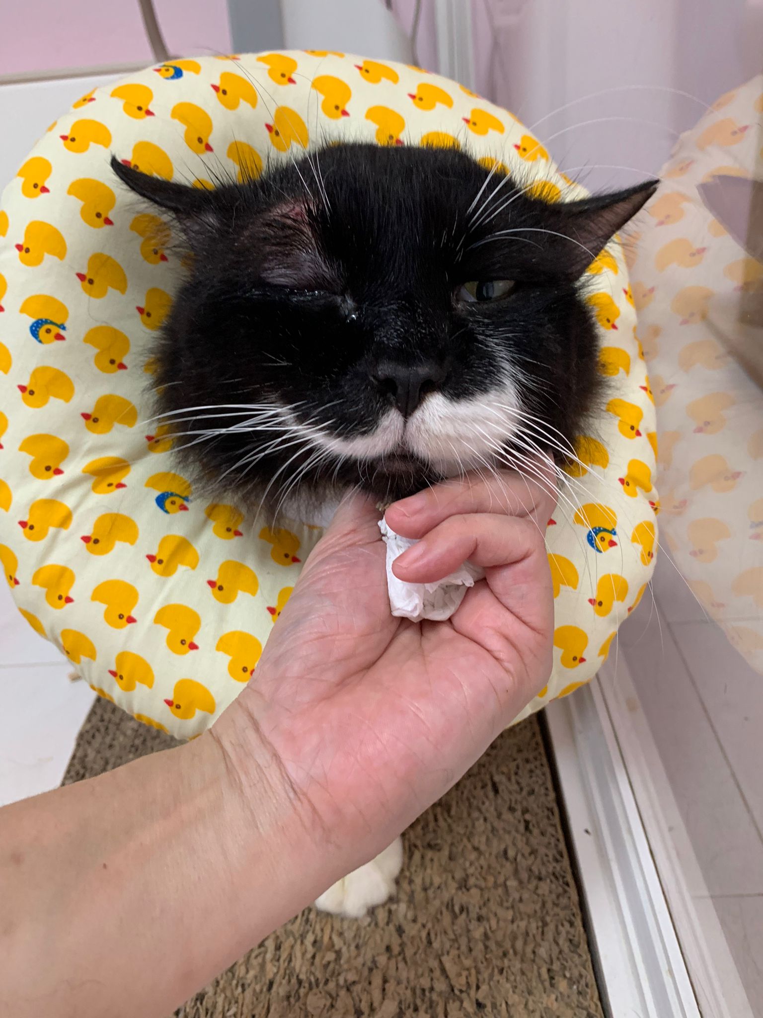 check eyeball, no issue, so is the area above the eyeball only. Clean again and apply terramycin to both the wound and the eyeball. Eyeball added halid. put a cool collar for him he don’t like told him no choice. N stay in room b also no choice. Sayang him more told him going home le still start new thing.
