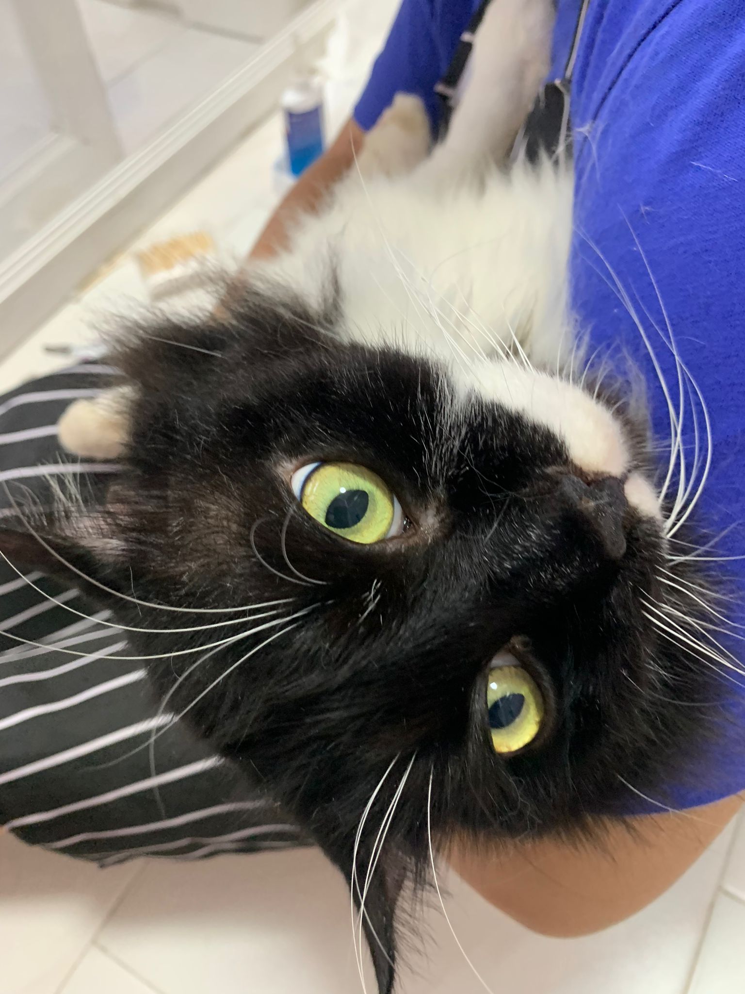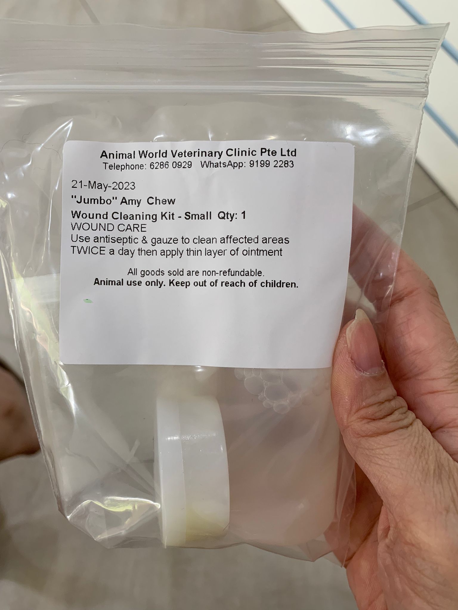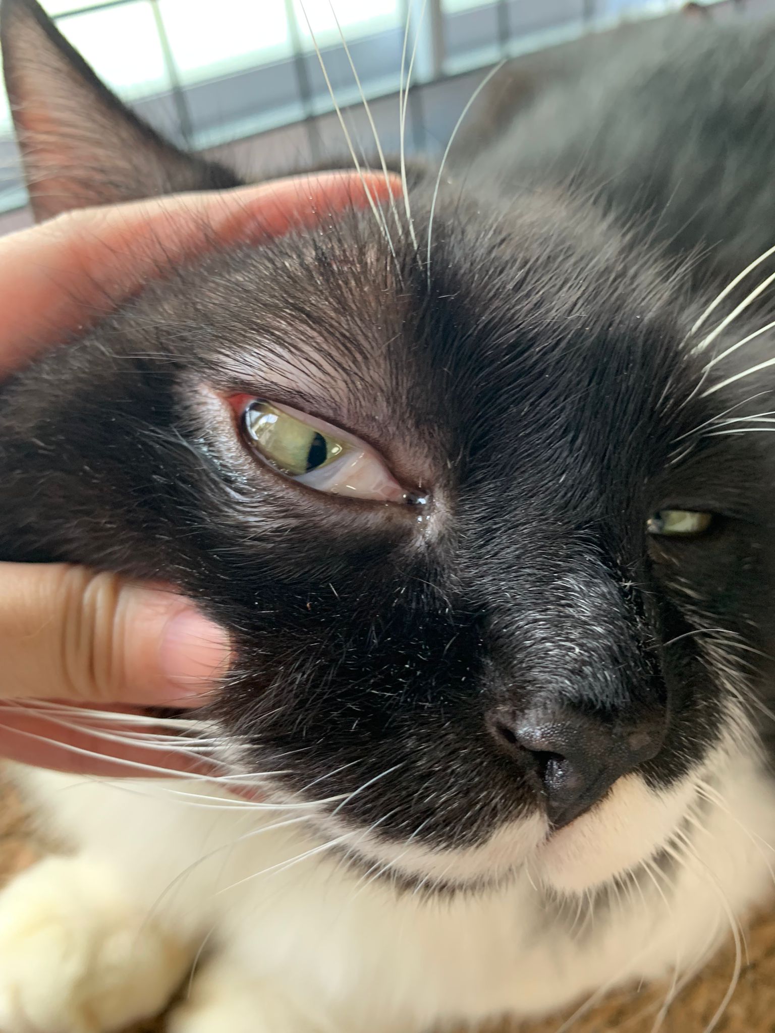 check eyeball, no issue, so is the area above the eyeball only. Clean again and apply terramycin to both the wound and the eyeball. Eyeball added halid. put a cool collar for him he don’t like told him no choice. N stay in room b also no choice. Sayang him more told him going home le still start new thing.