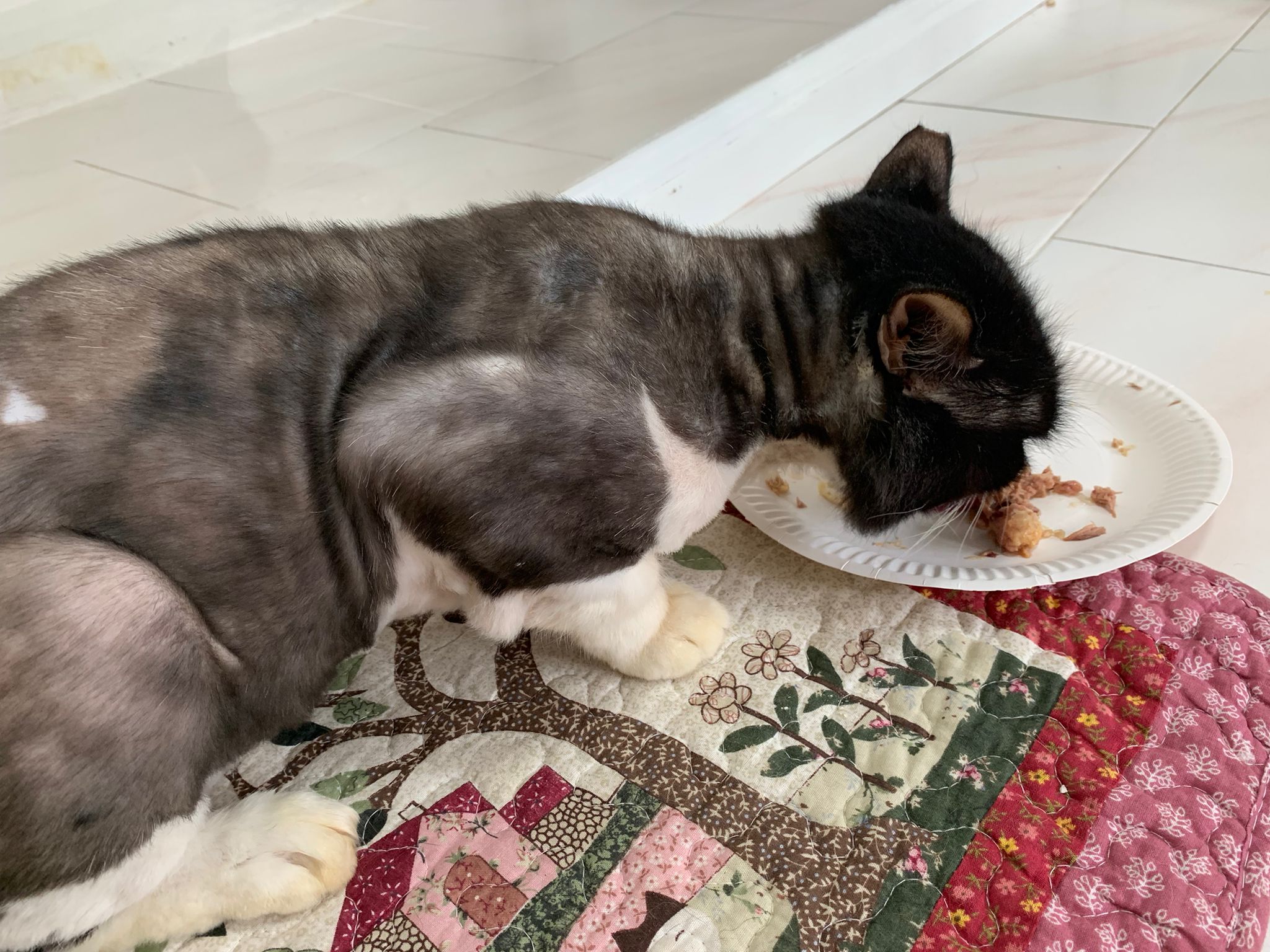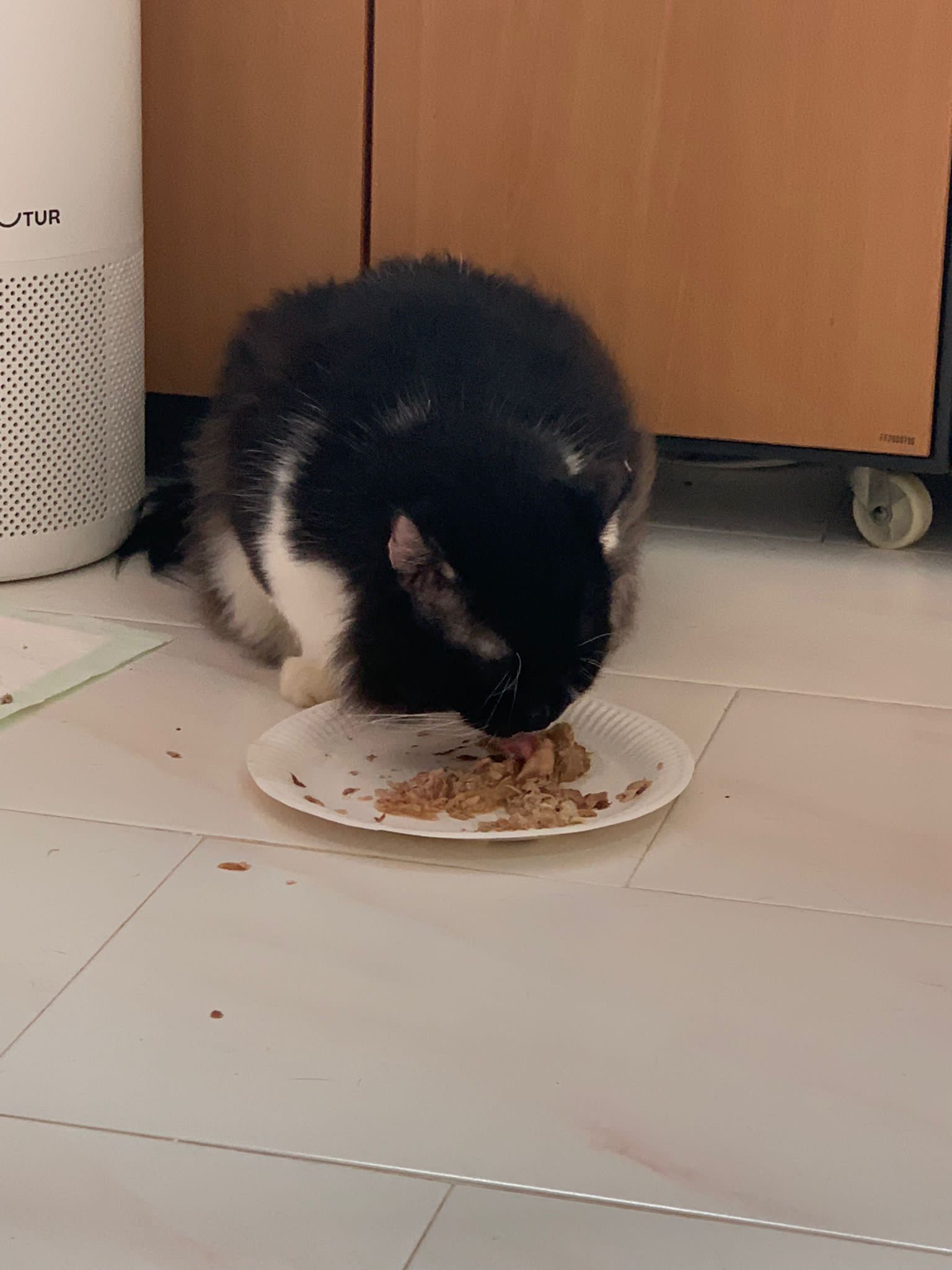 940am: got poo, 2.5+5/10. the formed one is improving. I think I can add on probiotics. Serve tuna w chicken ham – ha he follow the rest see the plate so small don’t want eat siak. I don’t have enough plates la. He ate a bit only. then I let him roam. Safe. No aggression from him. He likes to go smell pple litterbin.