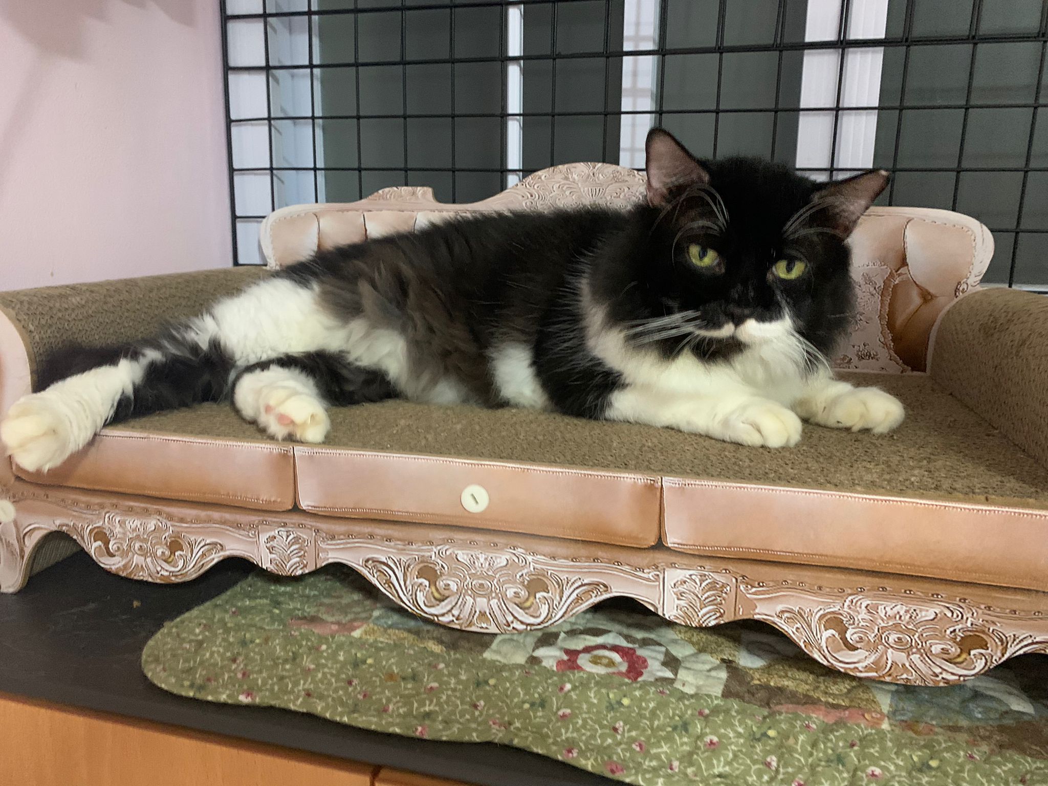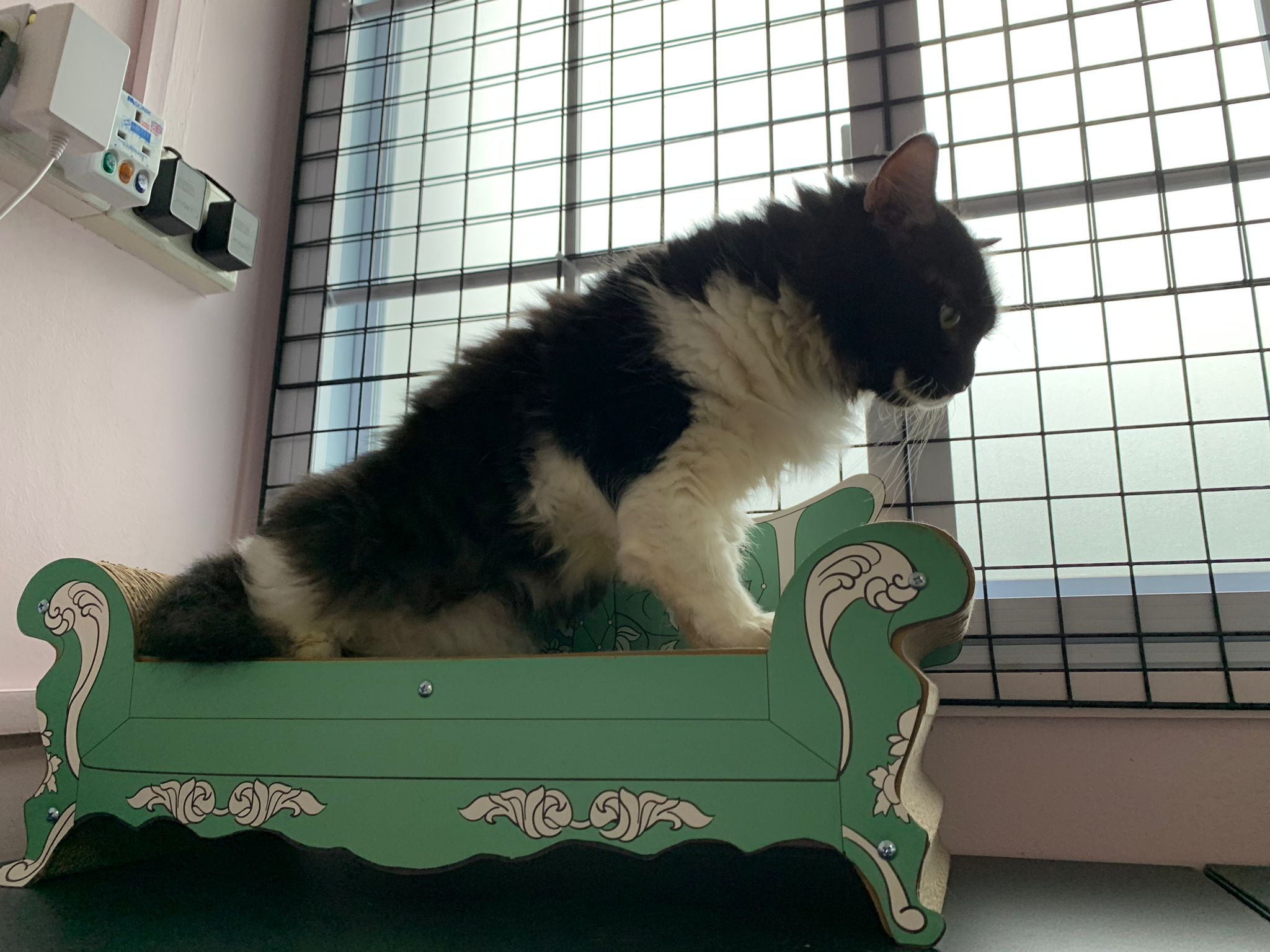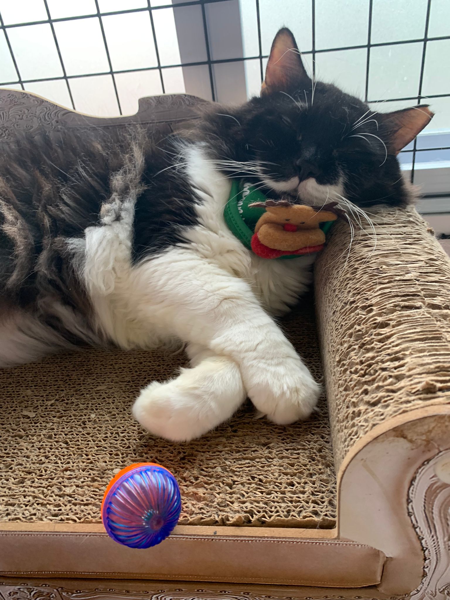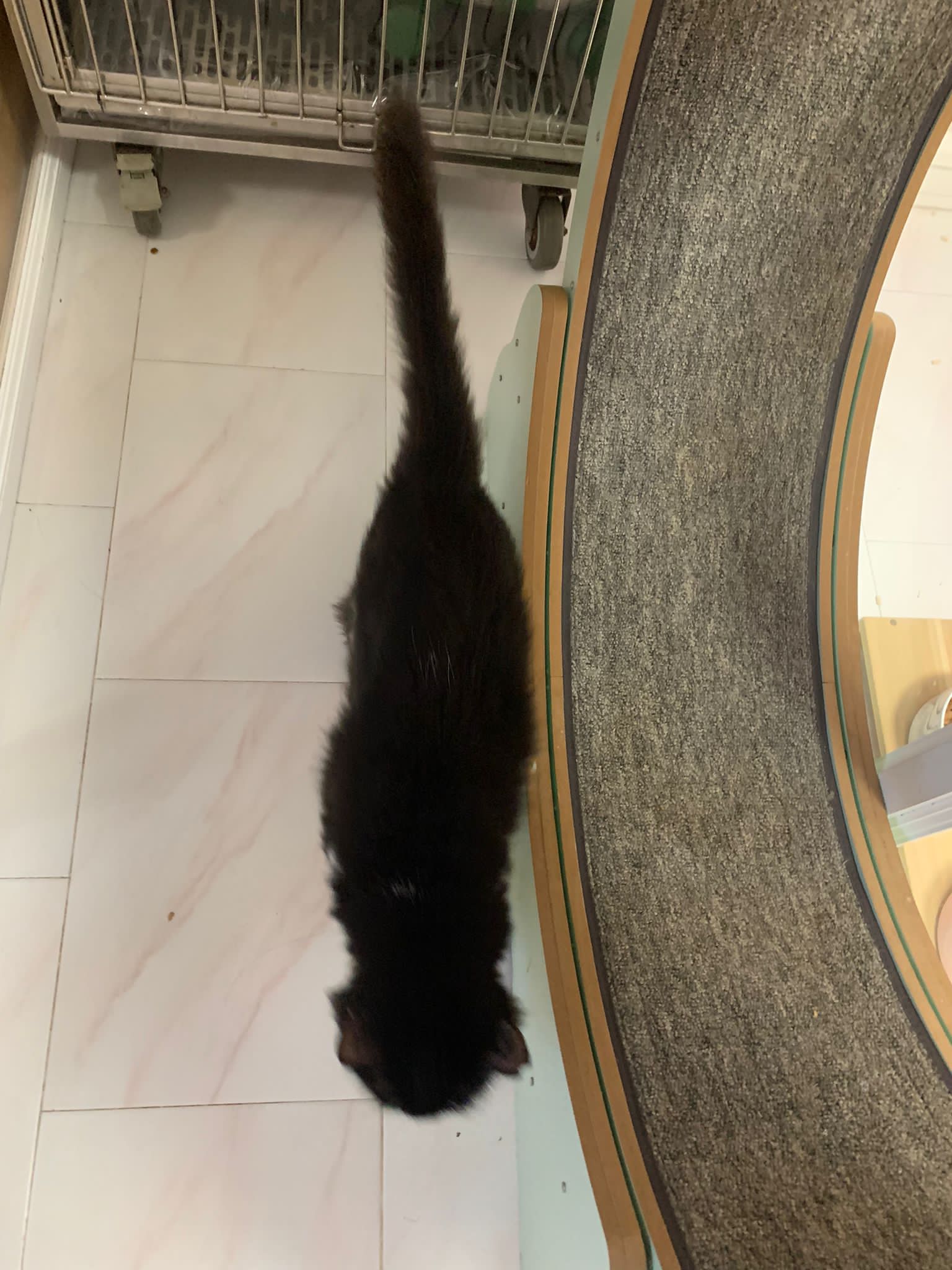 Room got a cycle wheel. Didn’t see jumbo on it yet. He is out like to go find the rest. Like to jump on and scratch the ratten table and chair. Tonight he venture jump onto the window platform.
