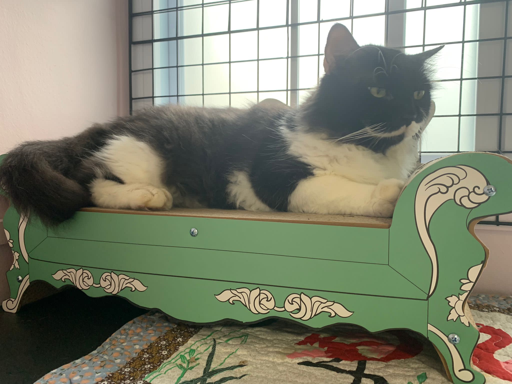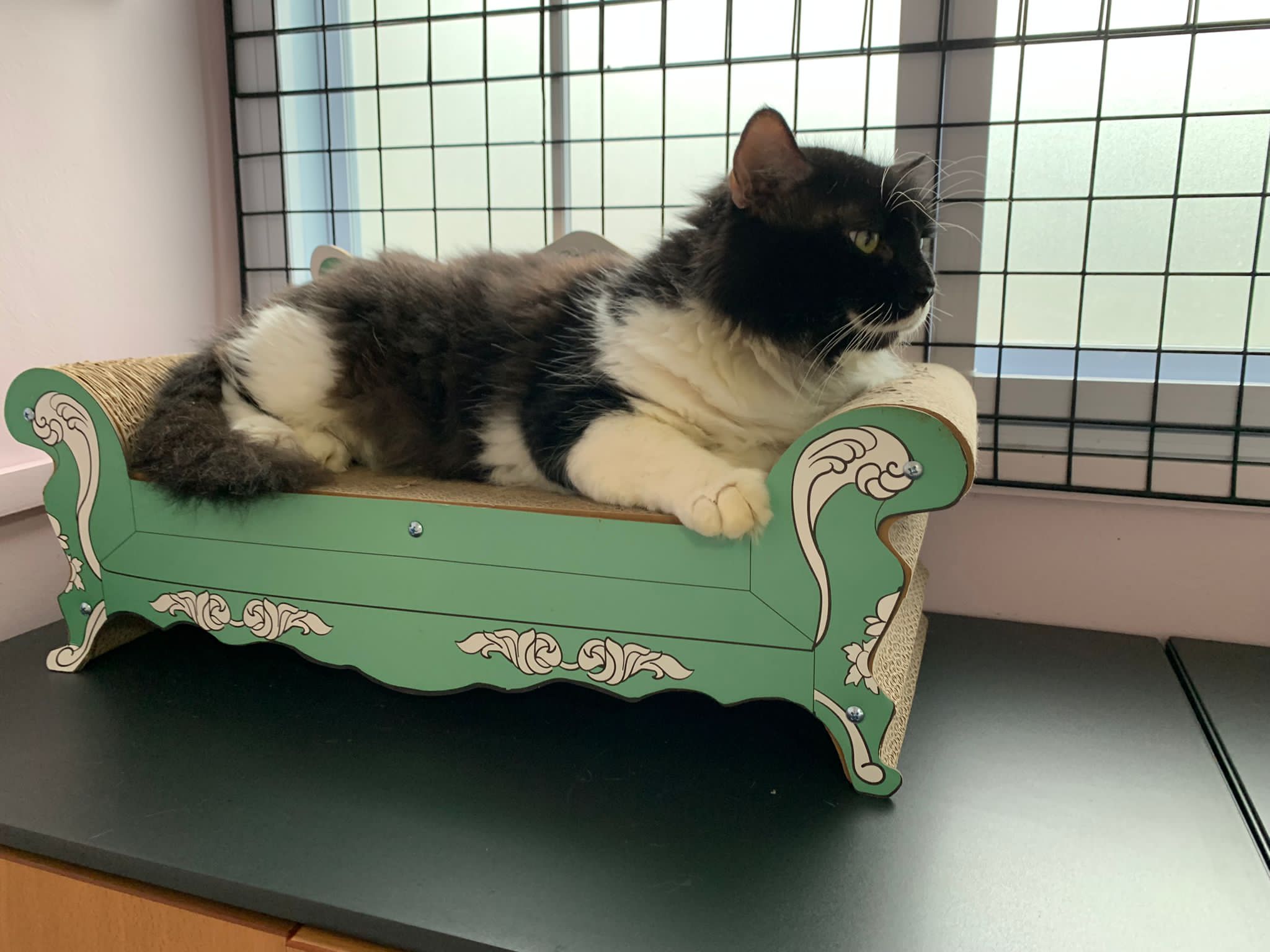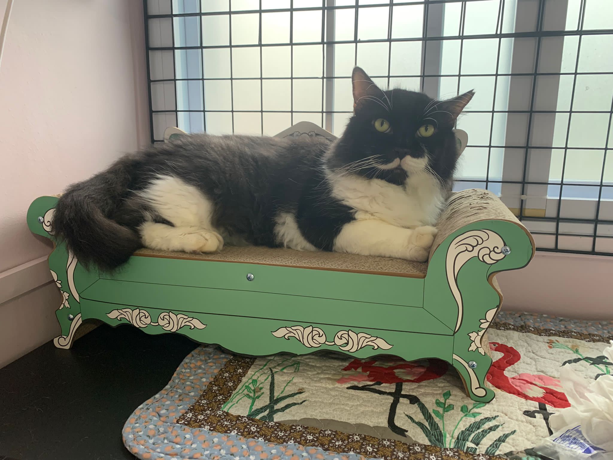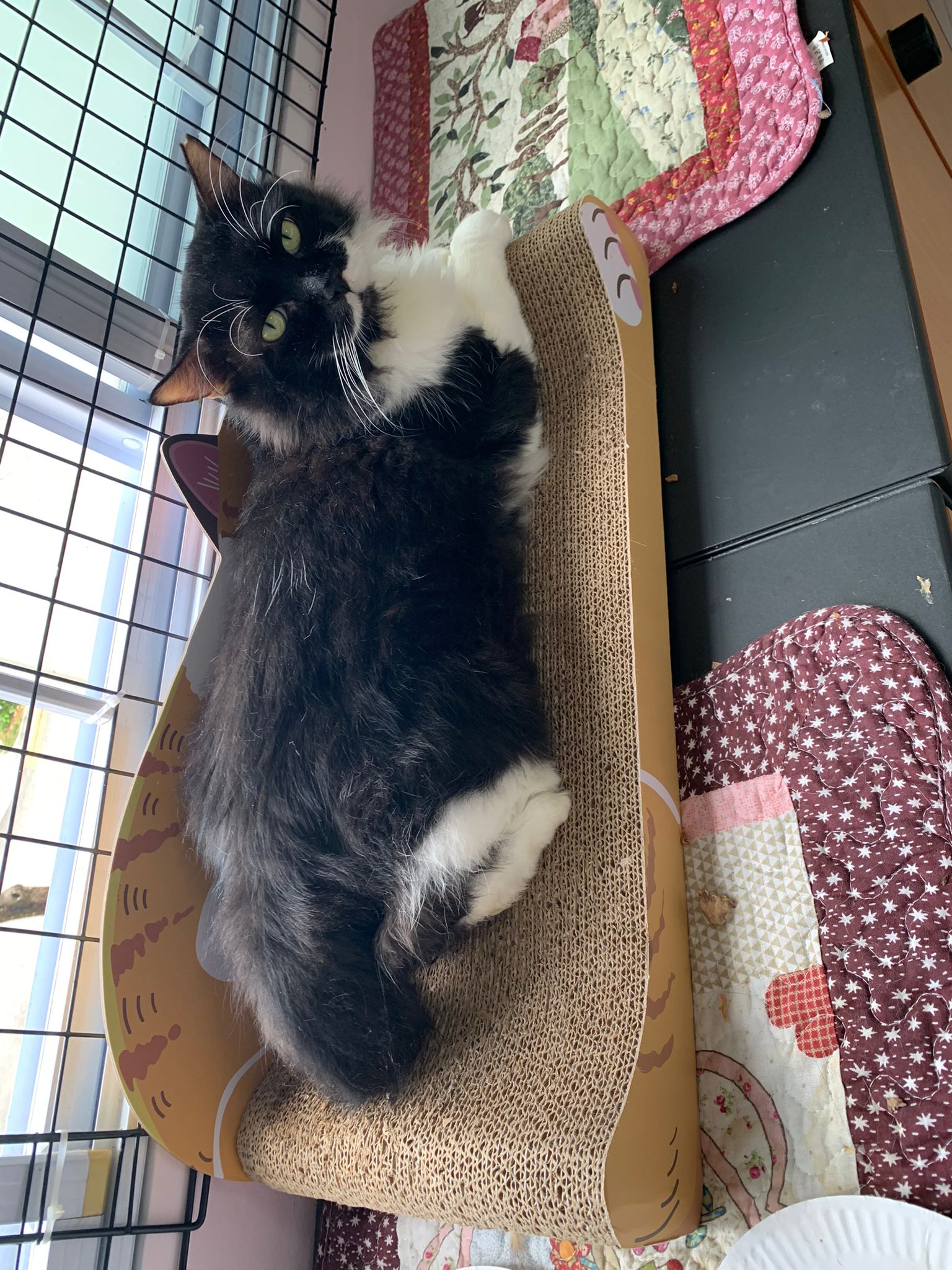 Room got a cycle wheel. Didn’t see jumbo on it yet. He is out like to go find the rest. Like to jump on and scratch the ratten table and chair. Tonight he venture jump onto the window platform.