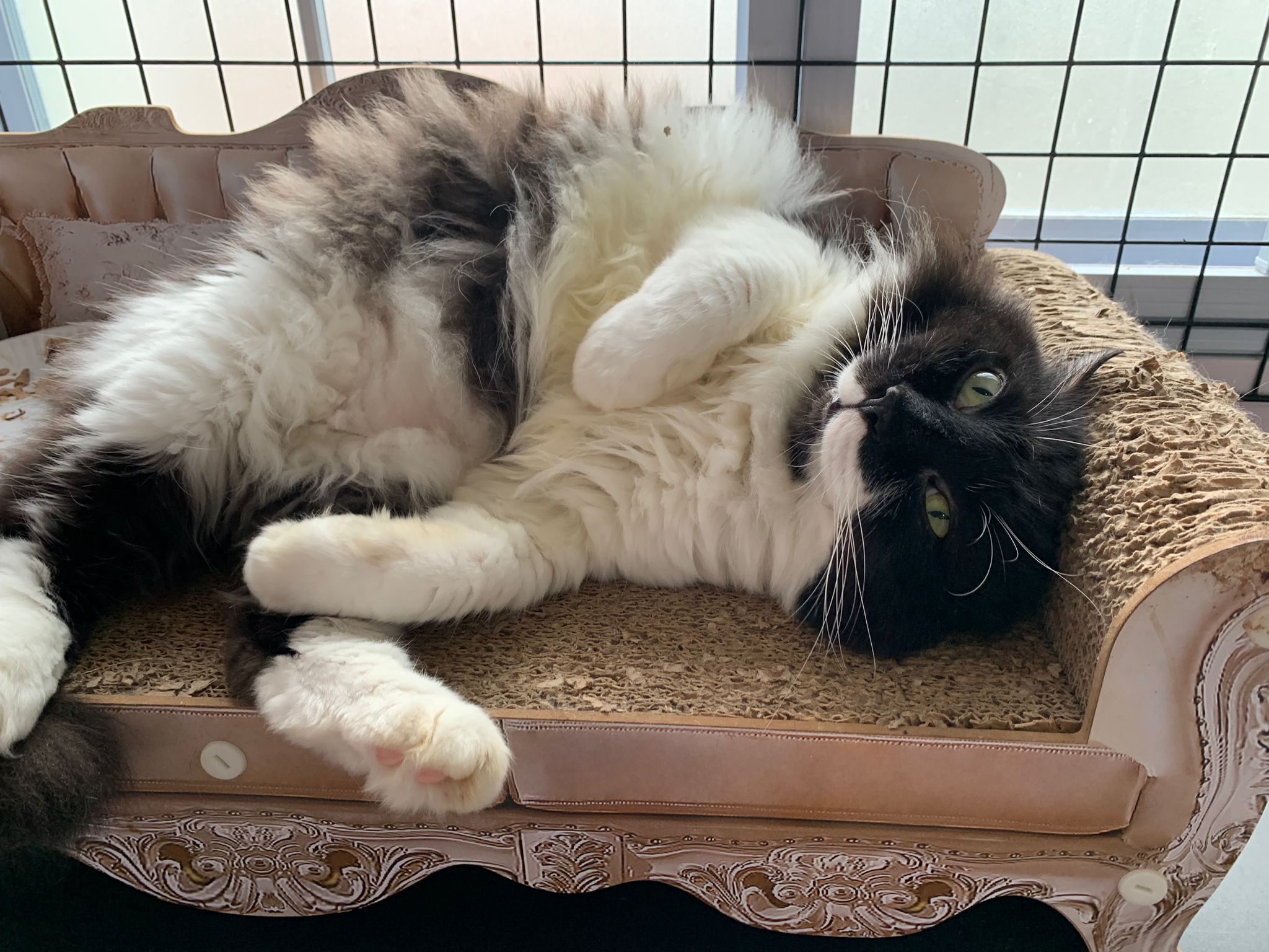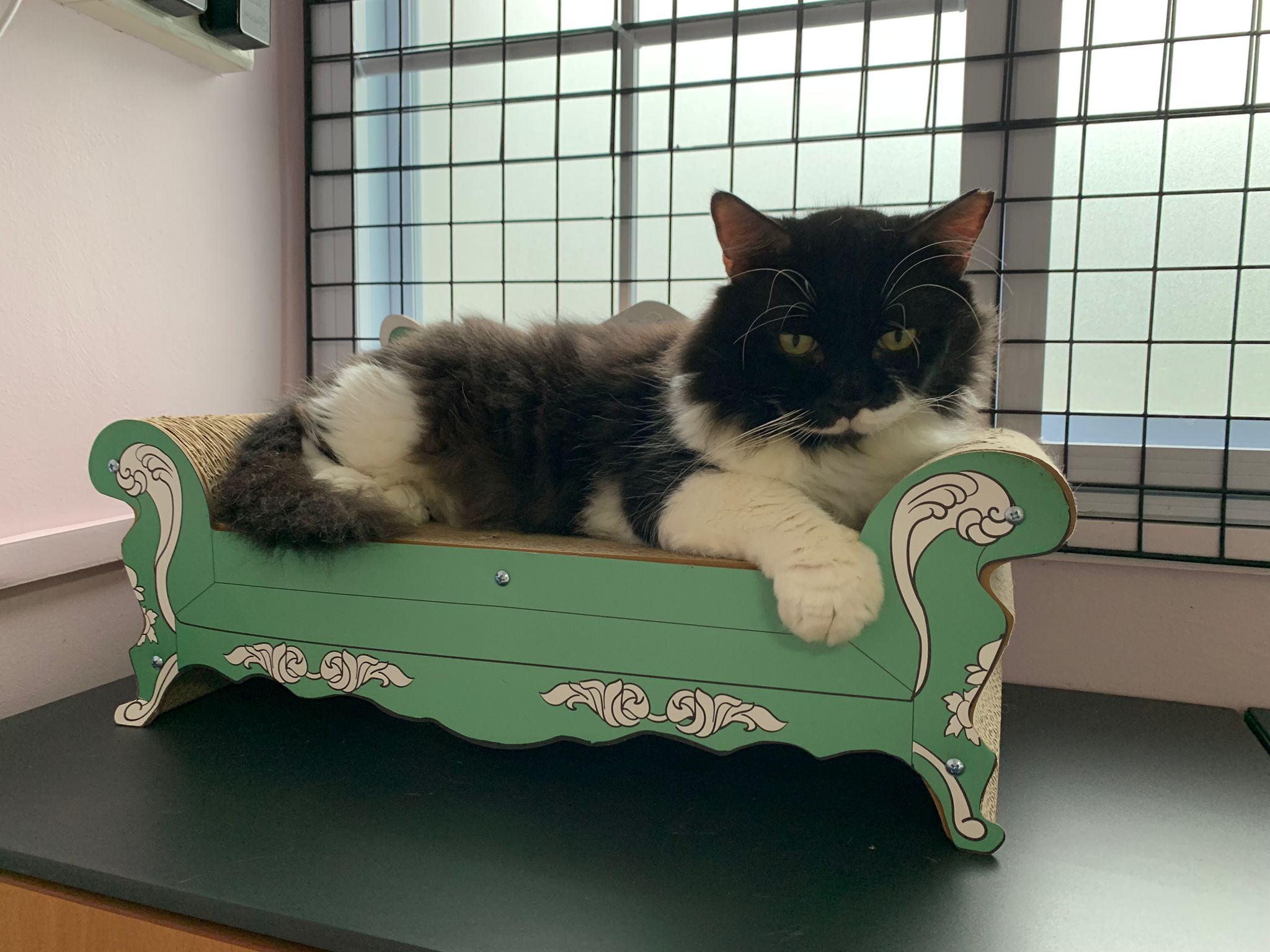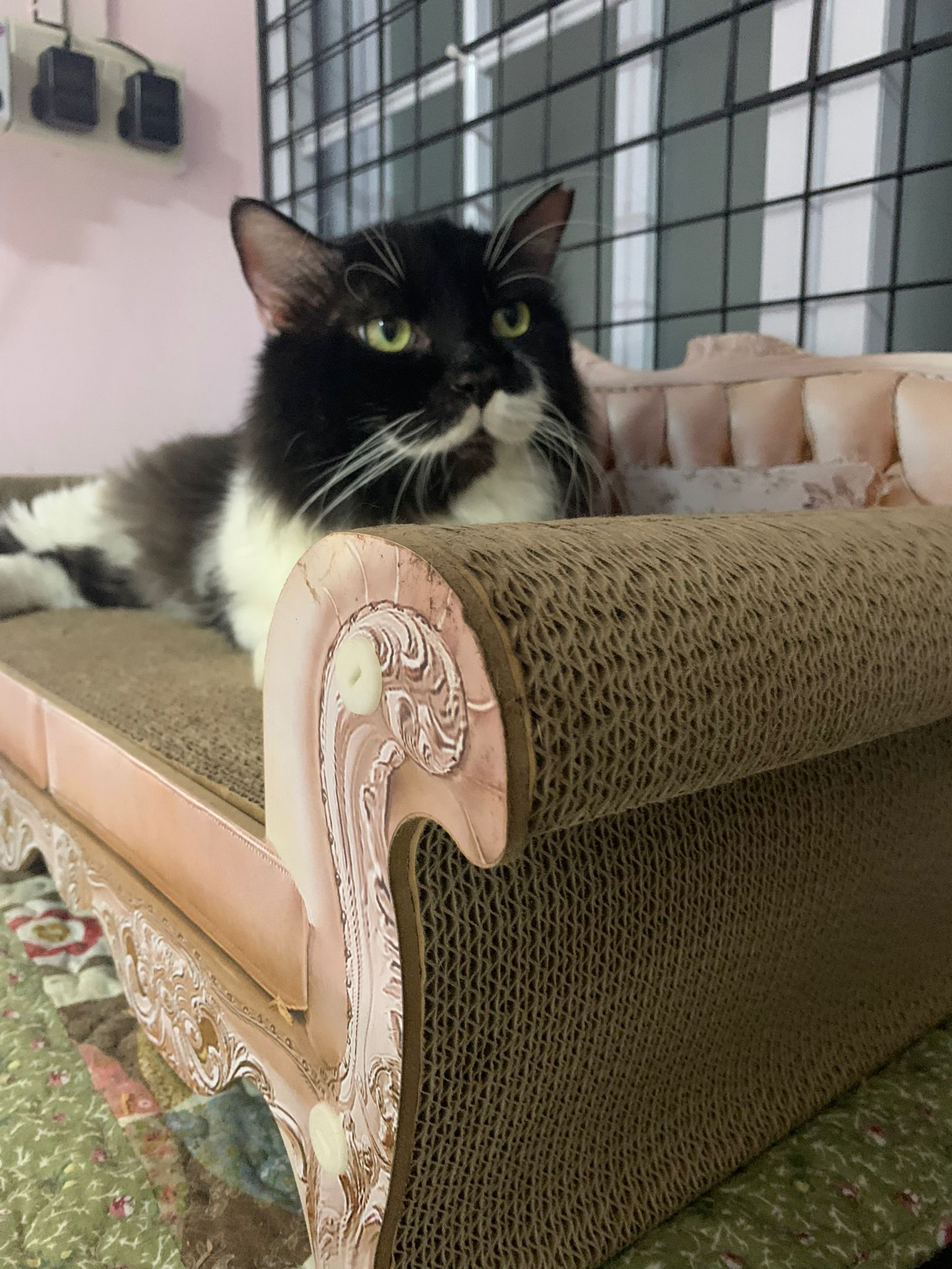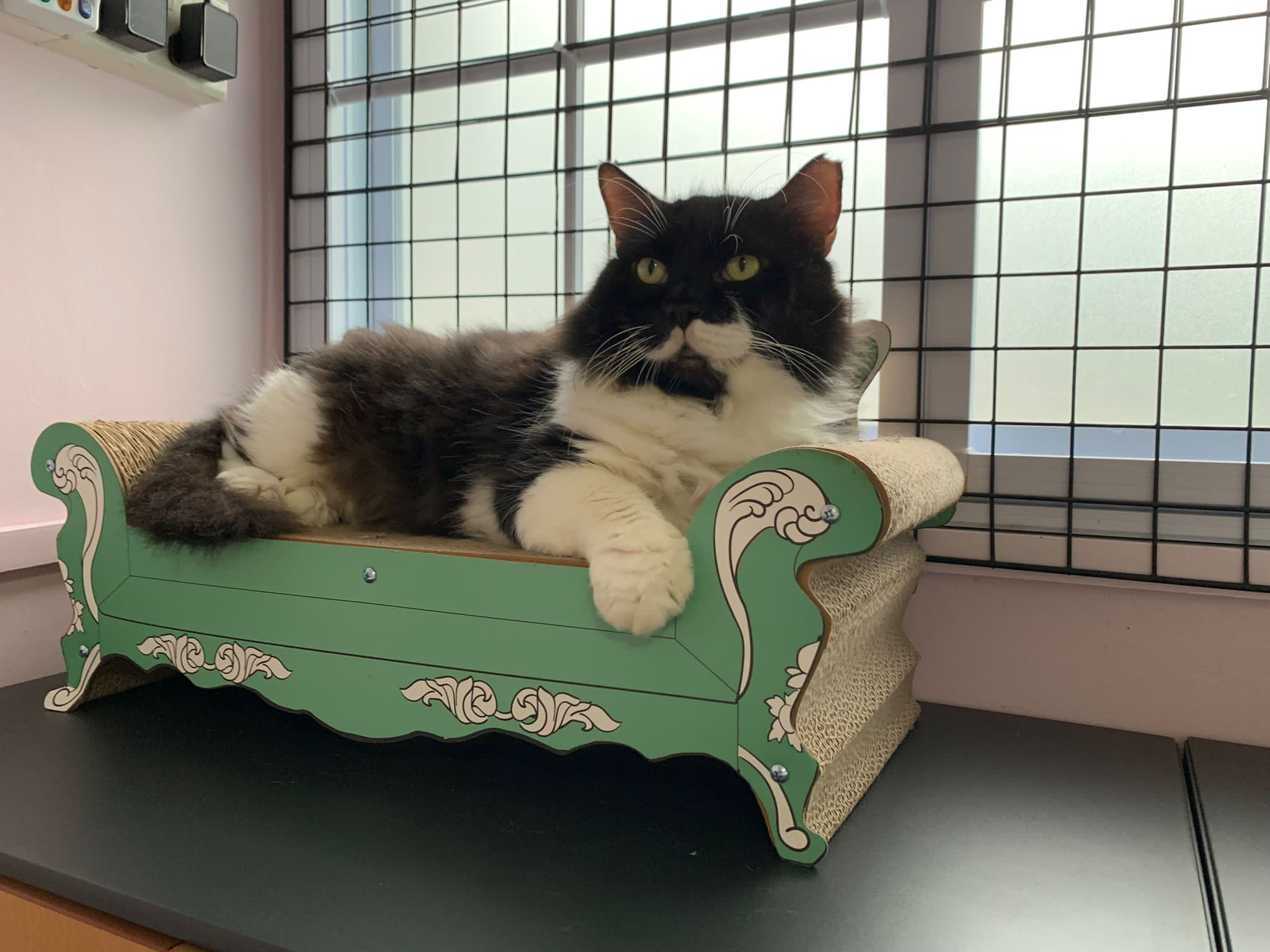 Room got a cycle wheel. Didn’t see jumbo on it yet. He is out like to go find the rest. Like to jump on and scratch the ratten table and chair. Tonight he venture jump onto the window platform.