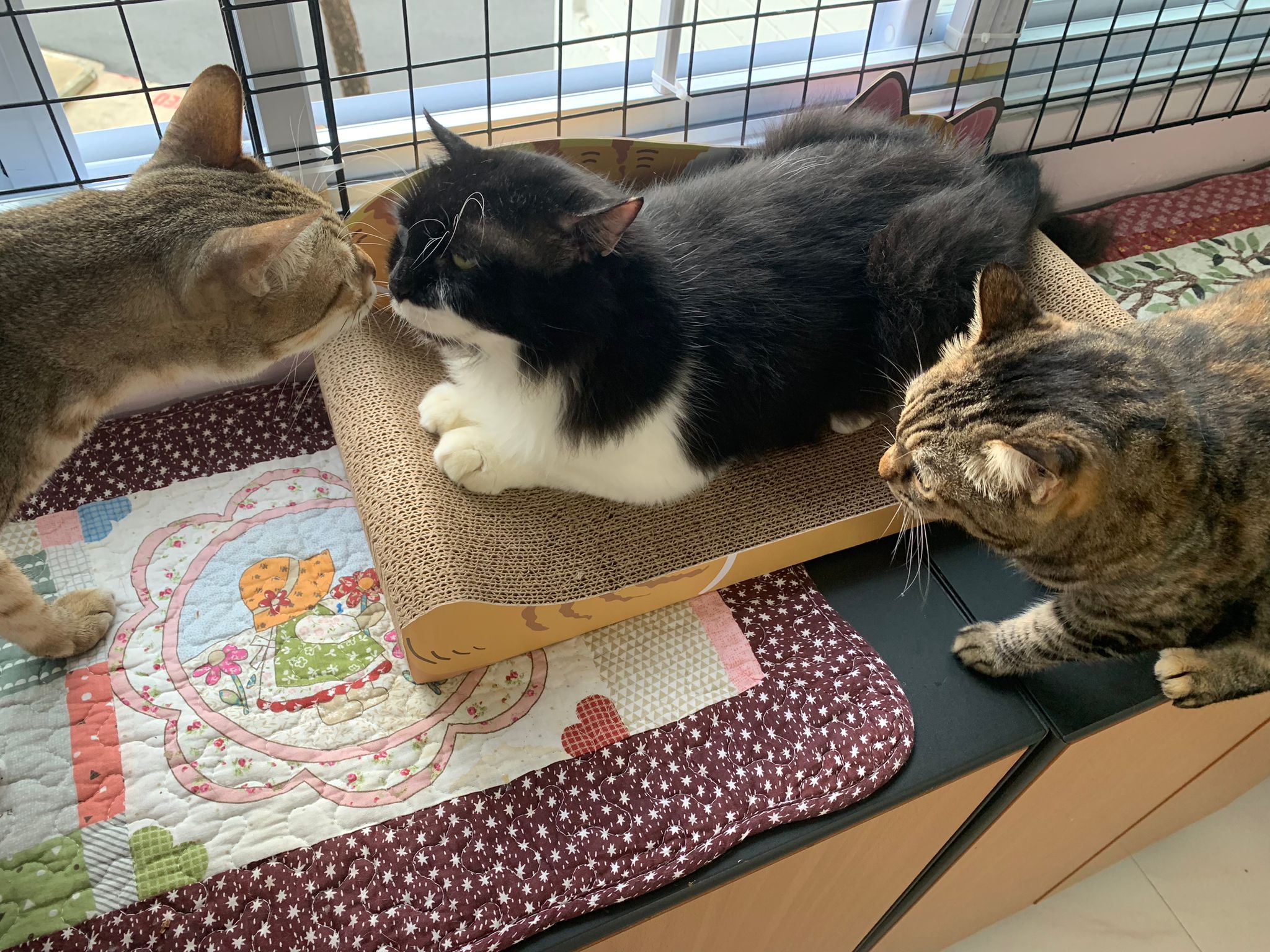 Night: I’m packing and serving meals. I see he like want to go provoke daring, I prevent a few times. Daring got jump off to higher spot and move away casually. just 1-2 sec diff I scoop poo this jumbo go pounce on daring backside. Sigh.lucky I got long sb to block and split them into diff rooms. he still want to be fierce to me loh. Told him won’t let him out le. Serve food. Nights out.