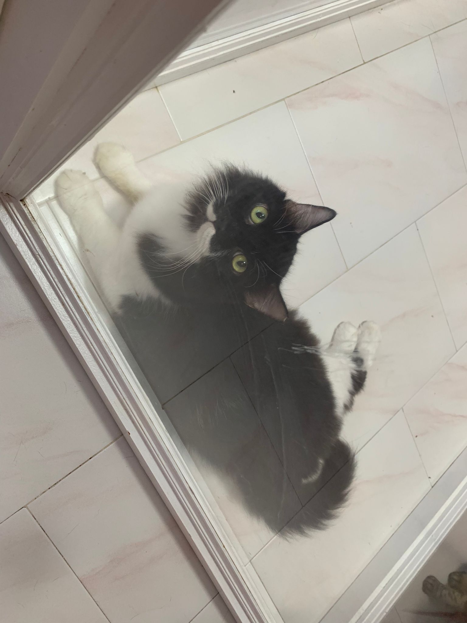 1252pm: he struggle and he turn n he saw himself in the mirror he try to whack himself and fell into the water. Super cute.