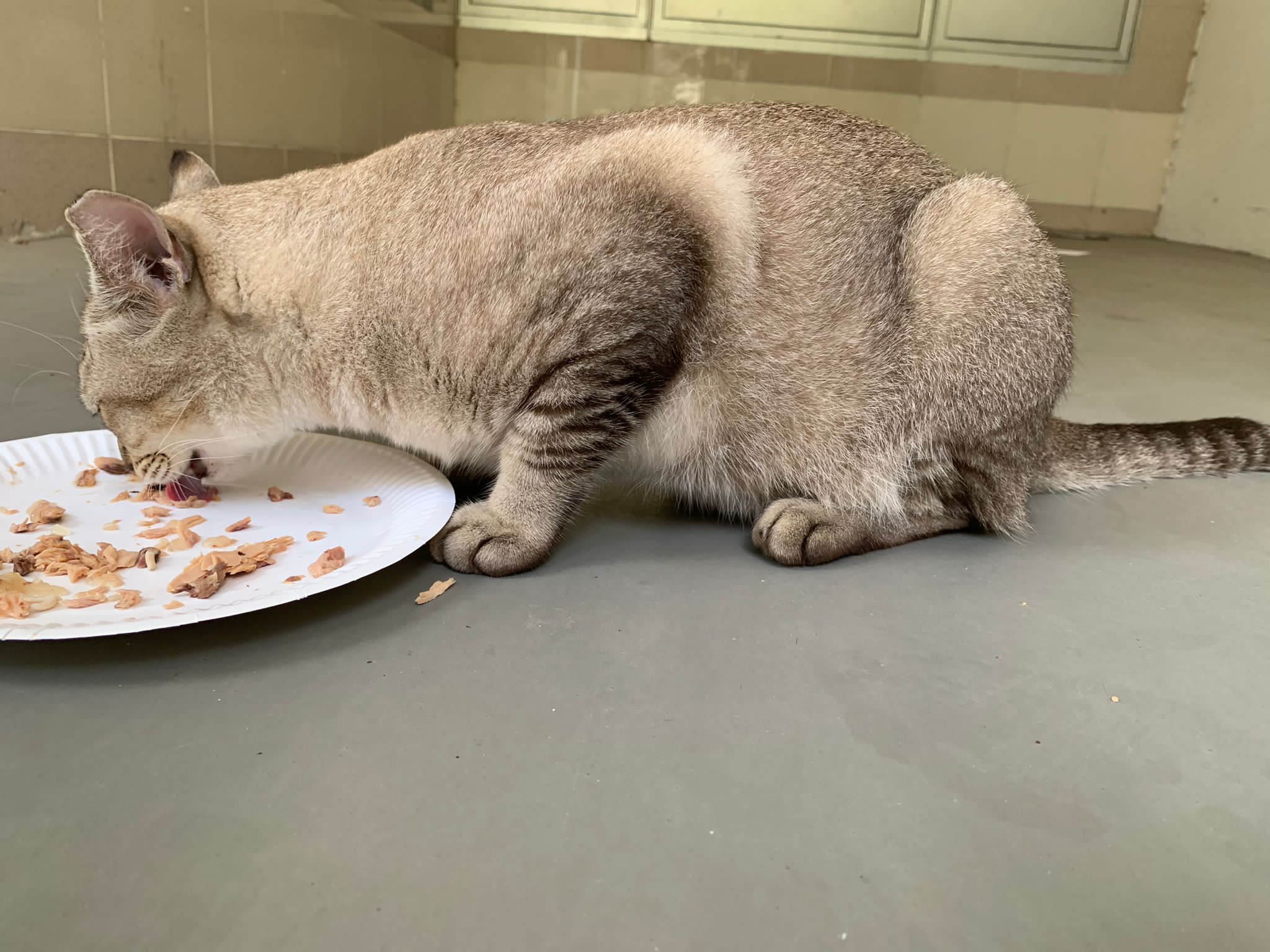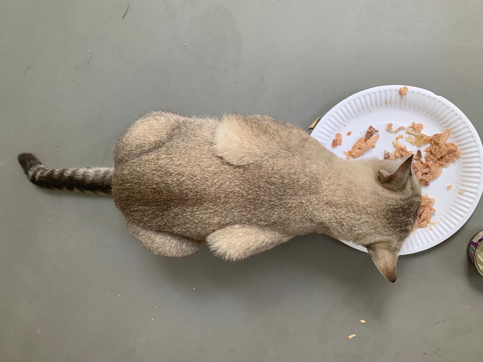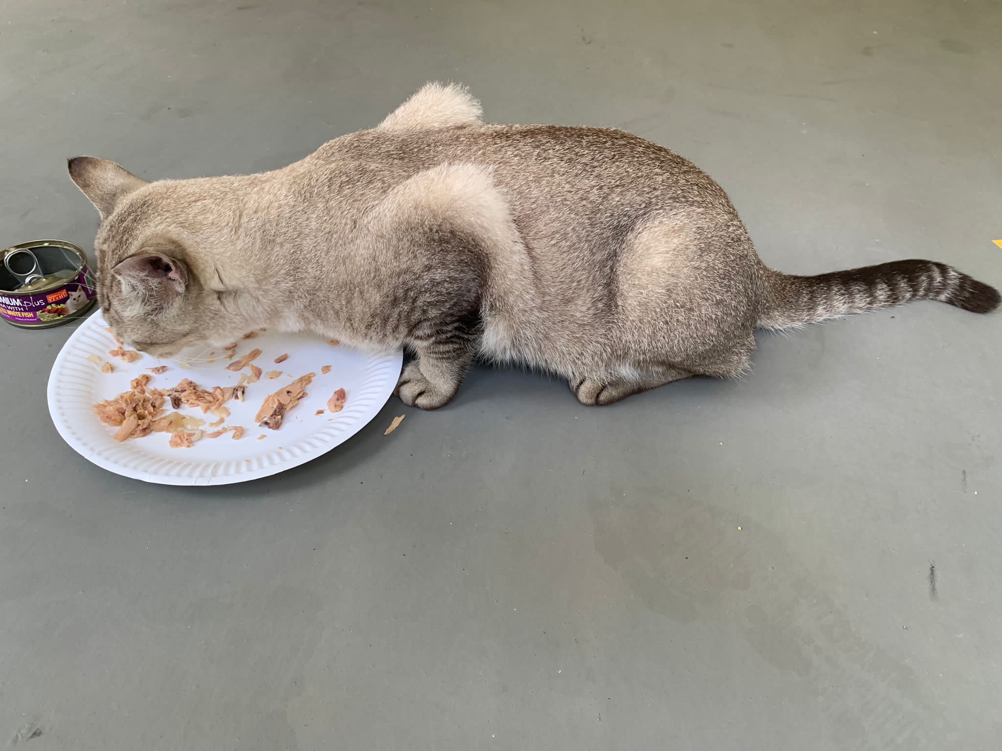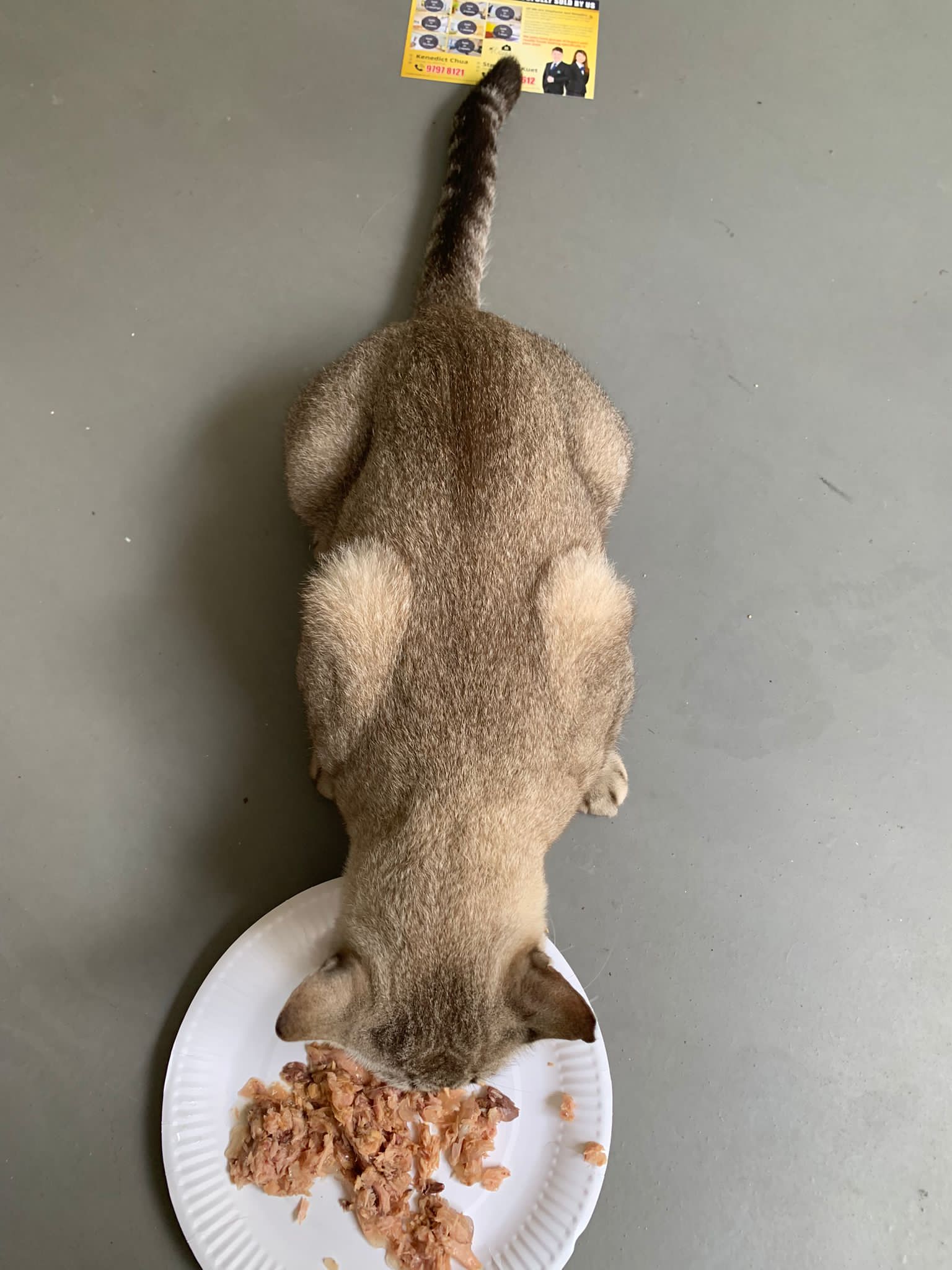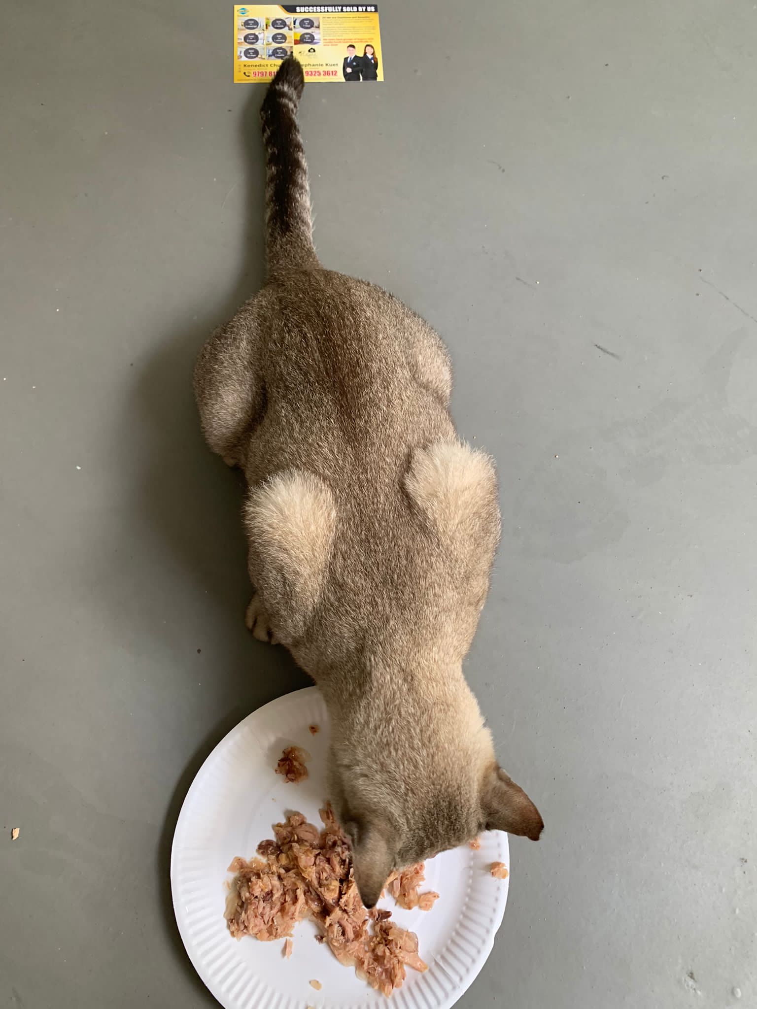 420pm+: jialat saw a new guy. Handsome. Eat tipped. Seal point Siamese. Come smell me rub me. Told him wait I go get food. Finish a can of tuna w white fish. Physical looks fit.