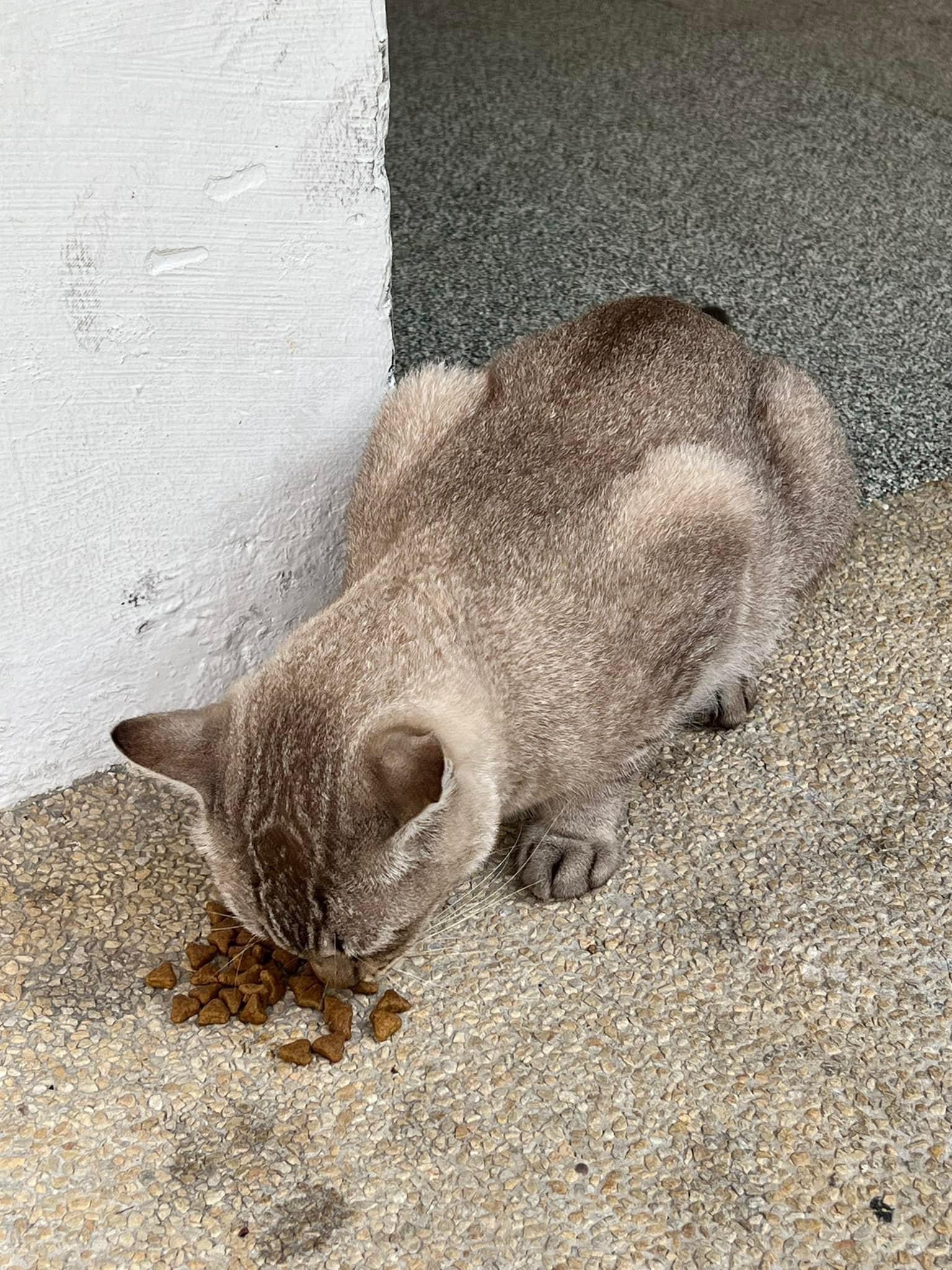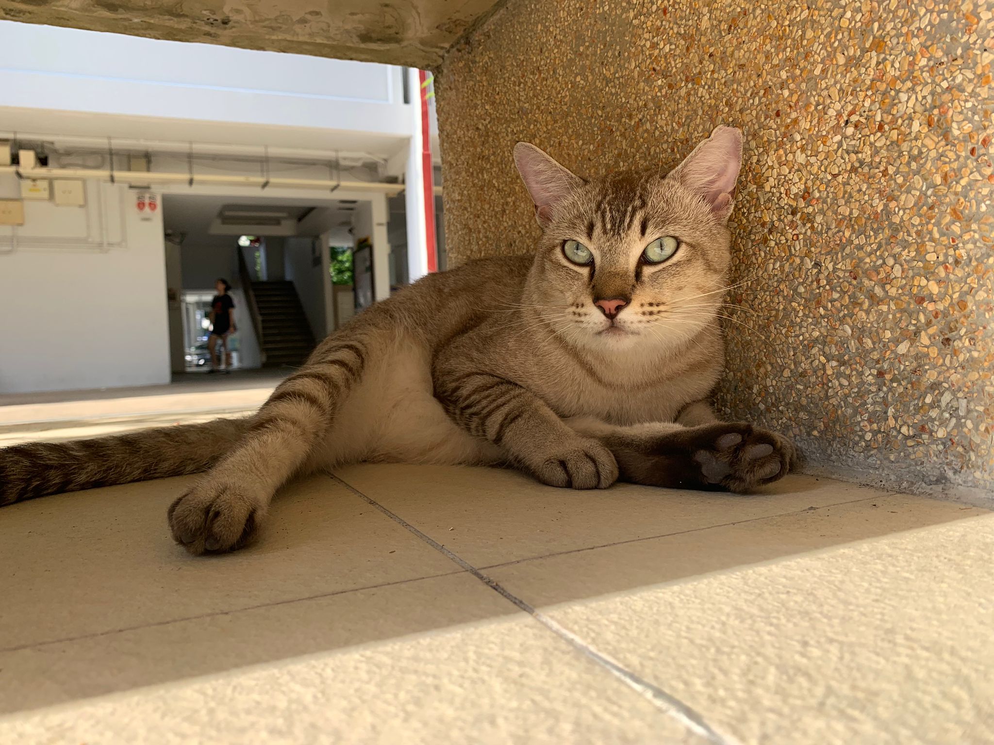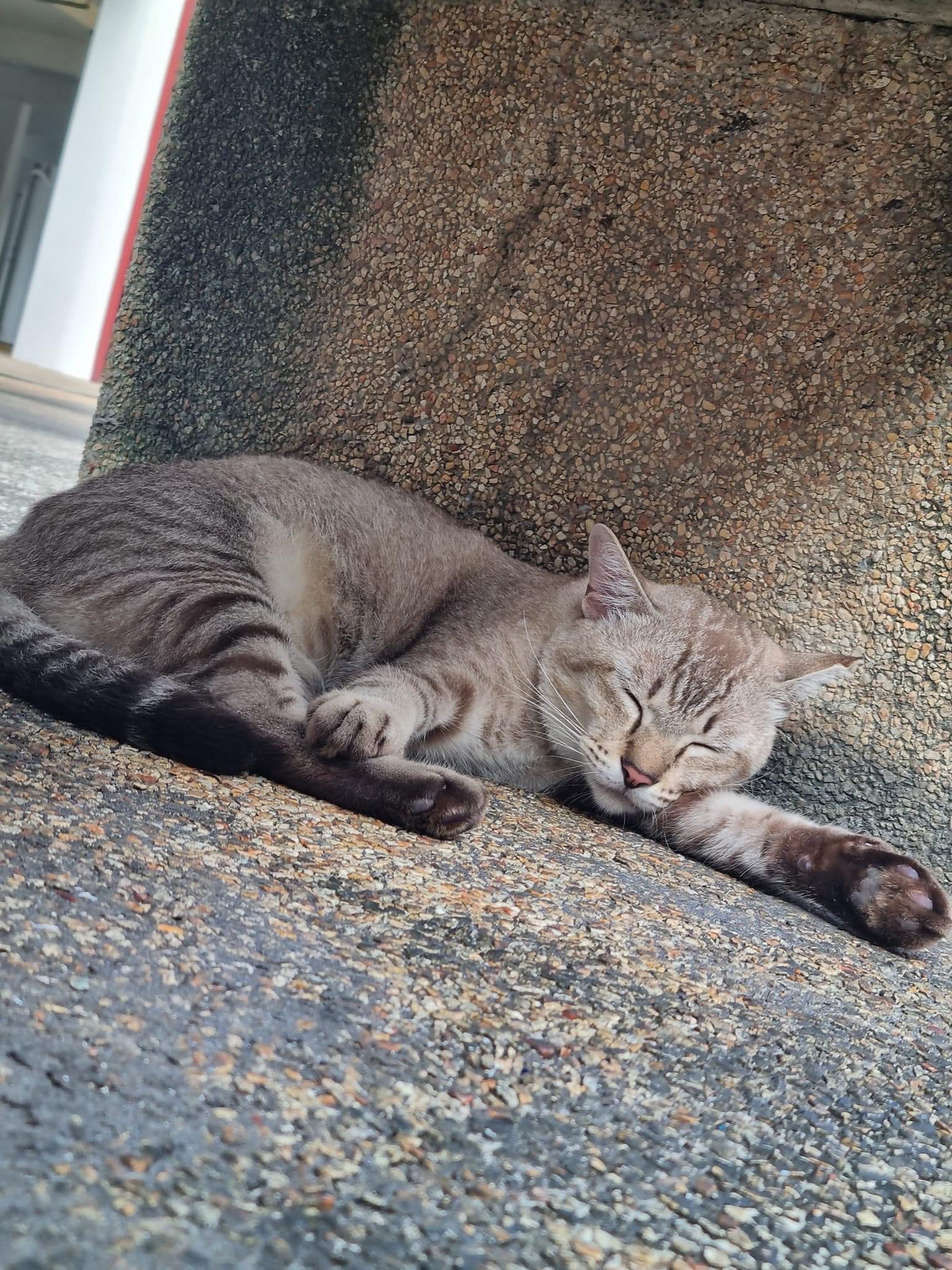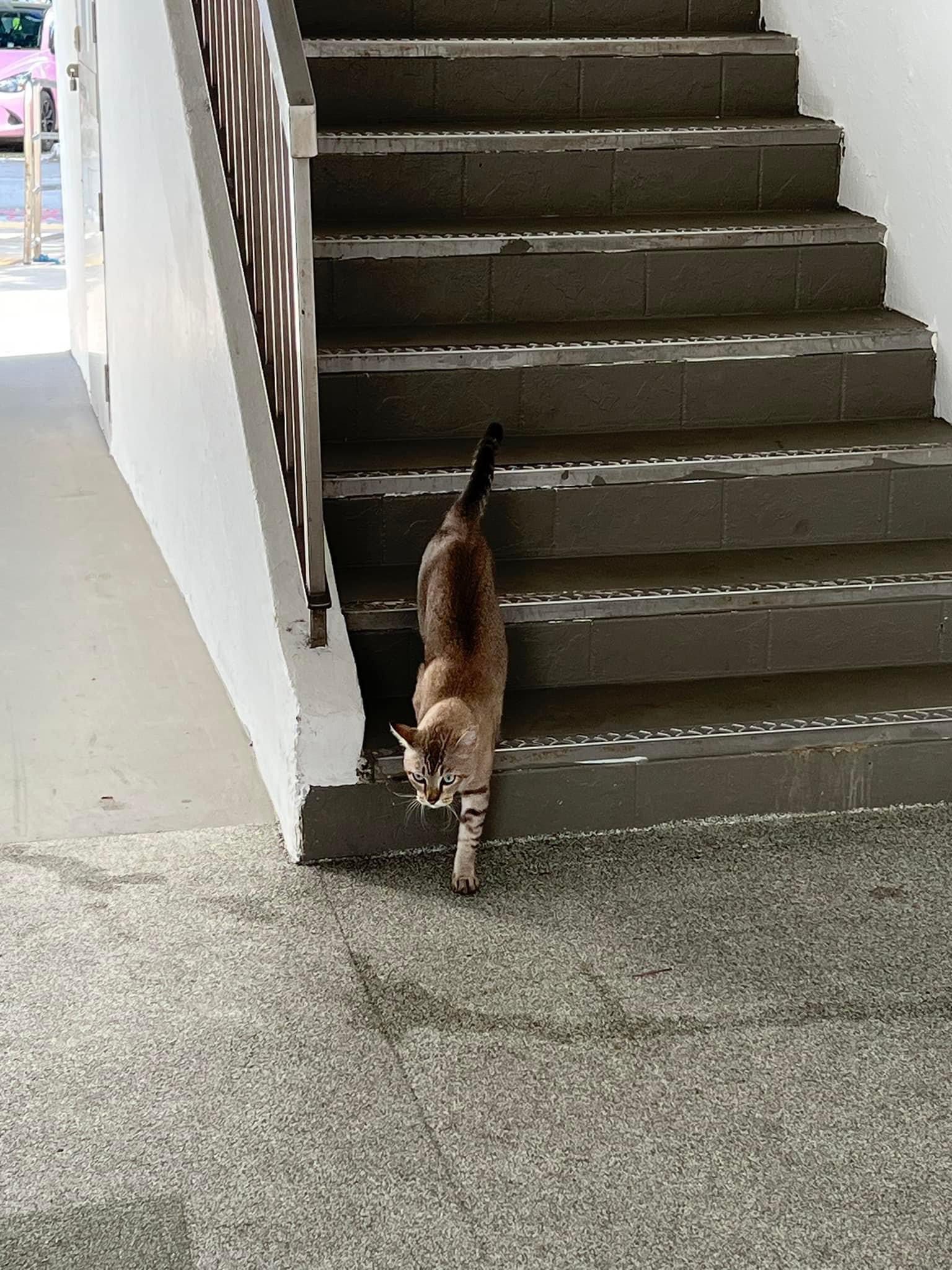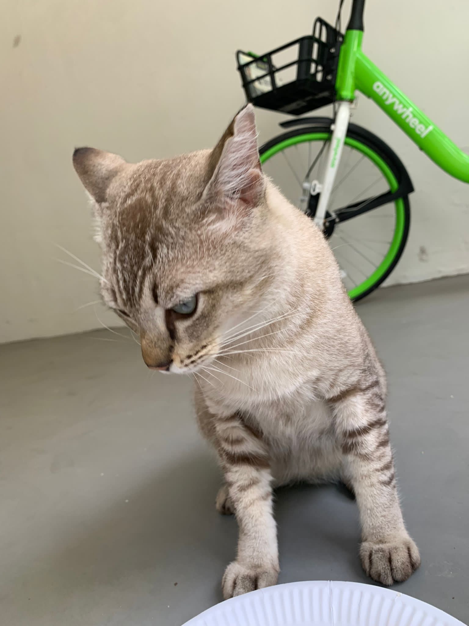 as of 27.8.23 4pm+: first time I saw this cat. He is nice and friendly to me. He got checked out my 猫房 smell. Got eat my food. maybe is lost. See whether I get to see him again