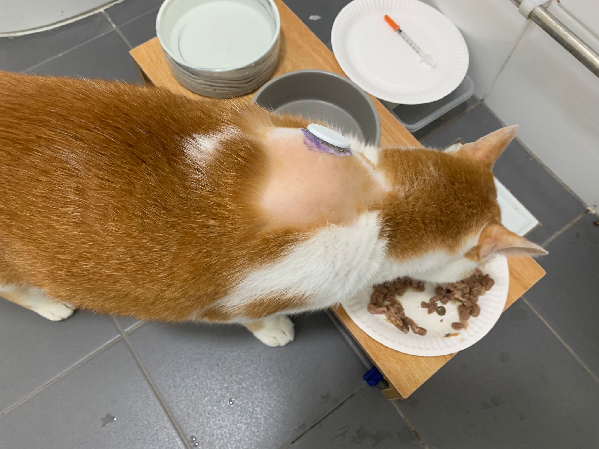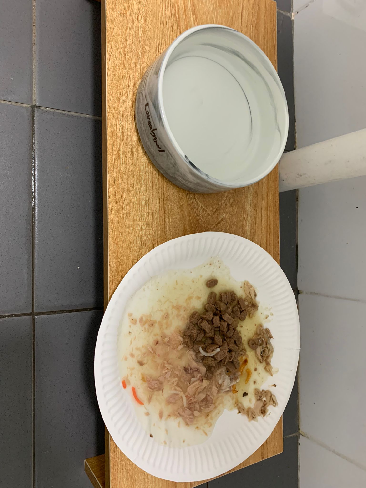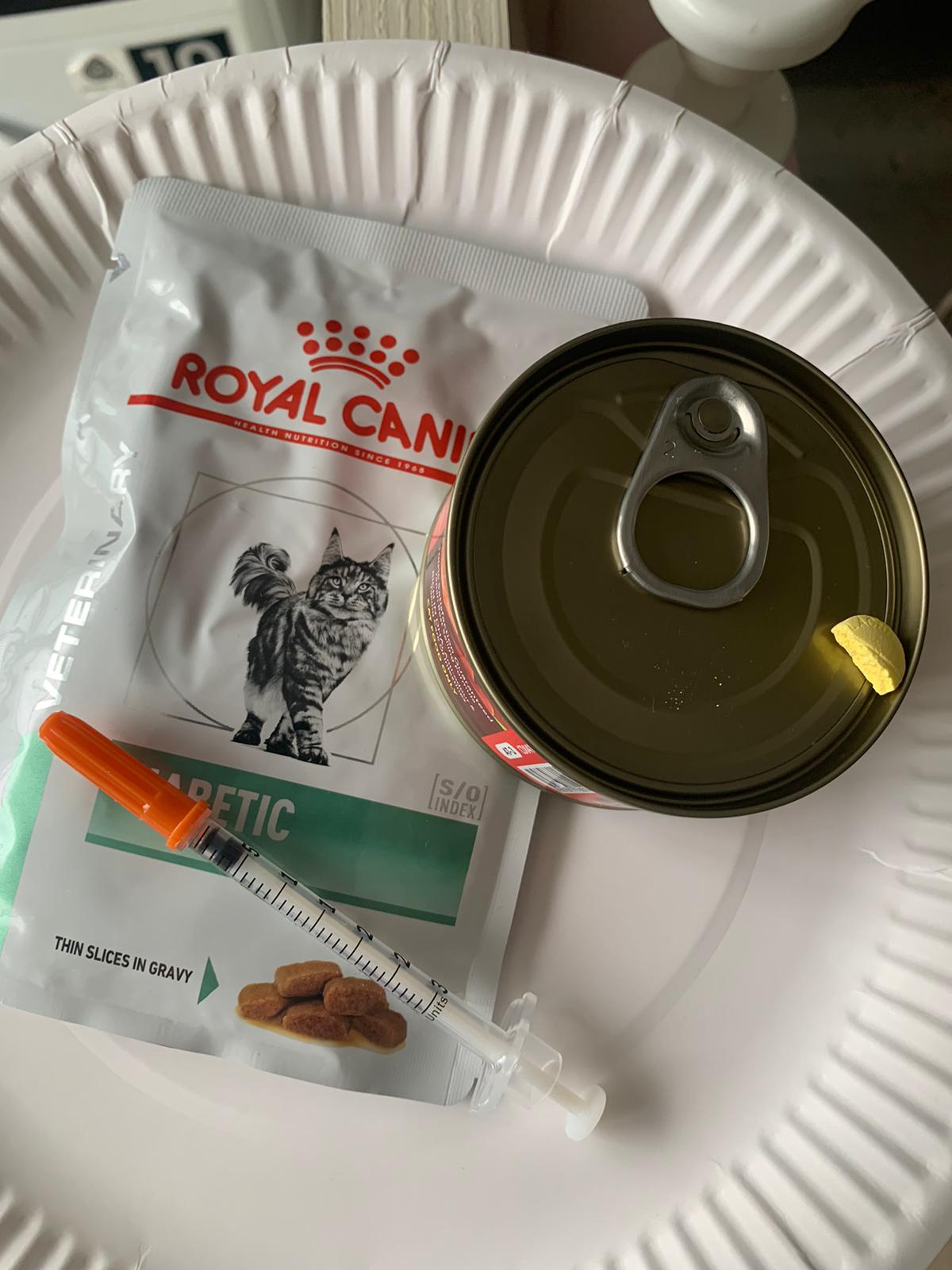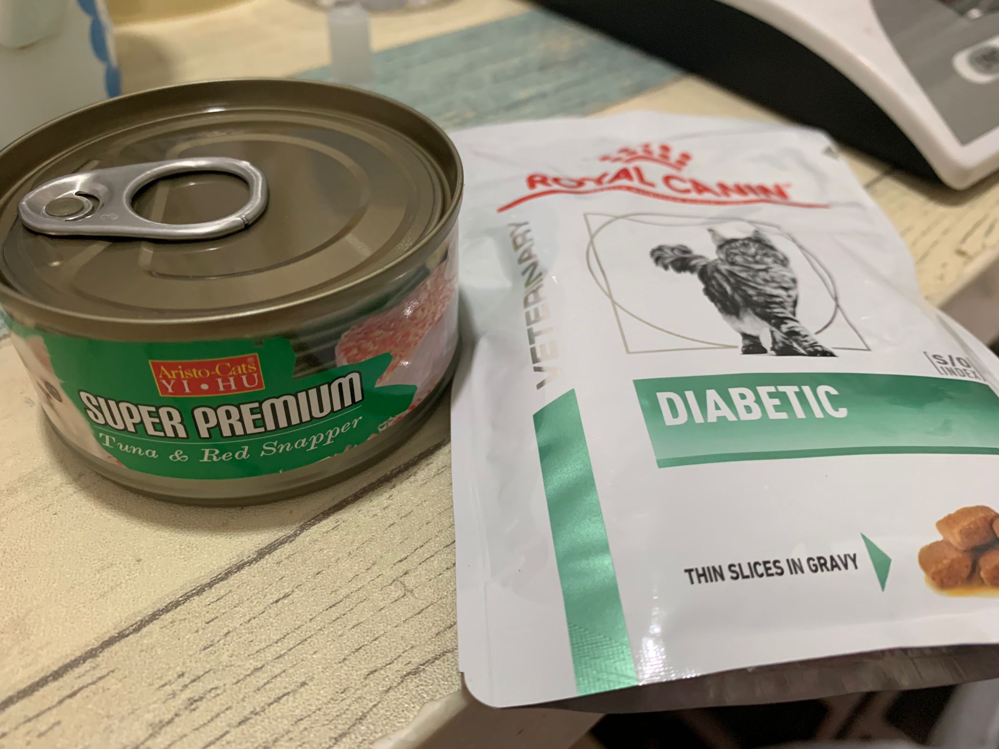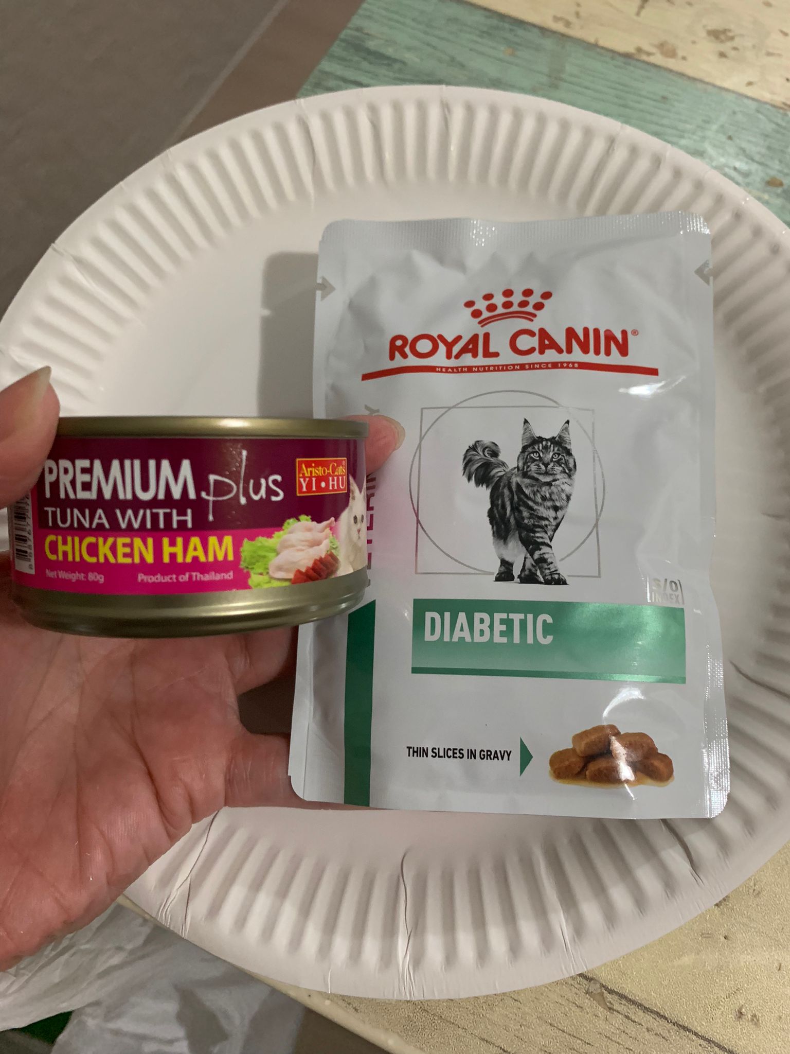 9.56am: 6.3 – good, serve food. stablise as 1/4 tuna : 2/3 diabetic pouch.