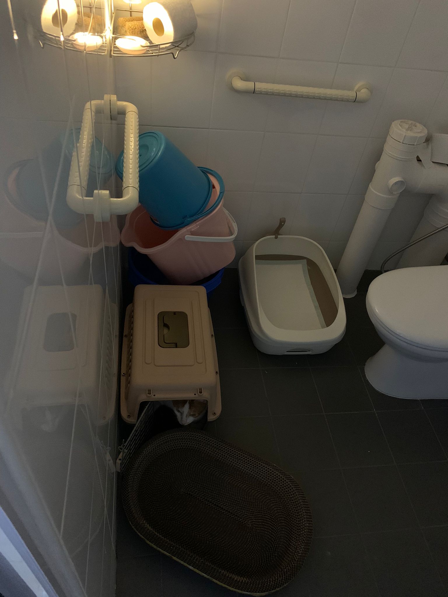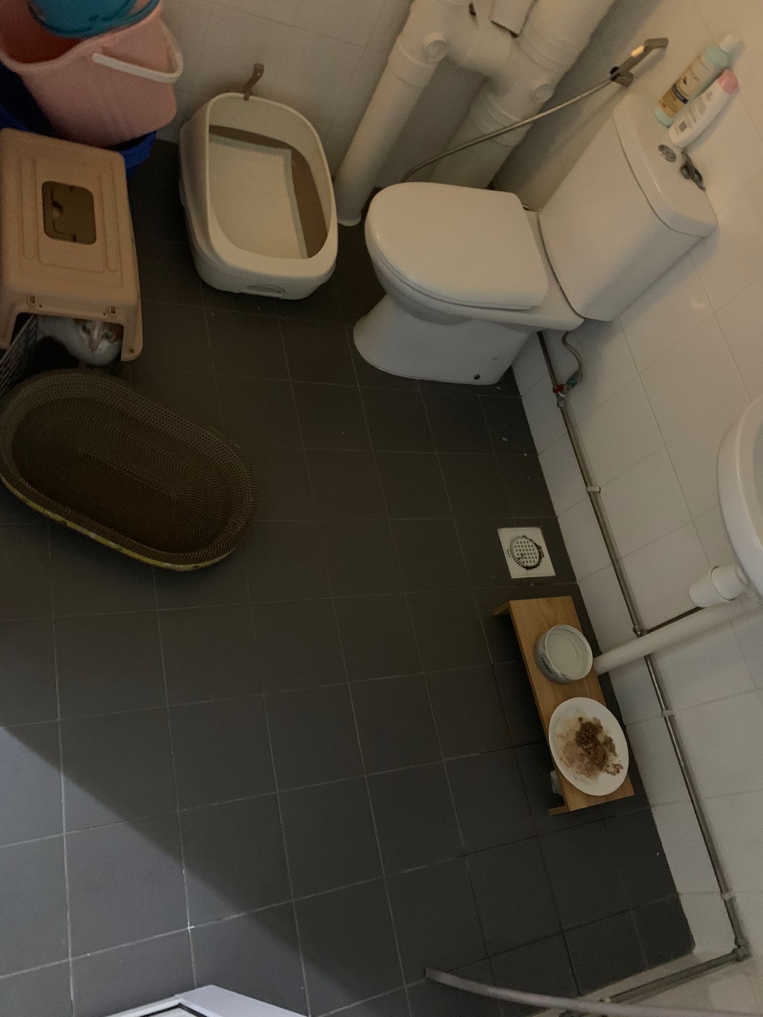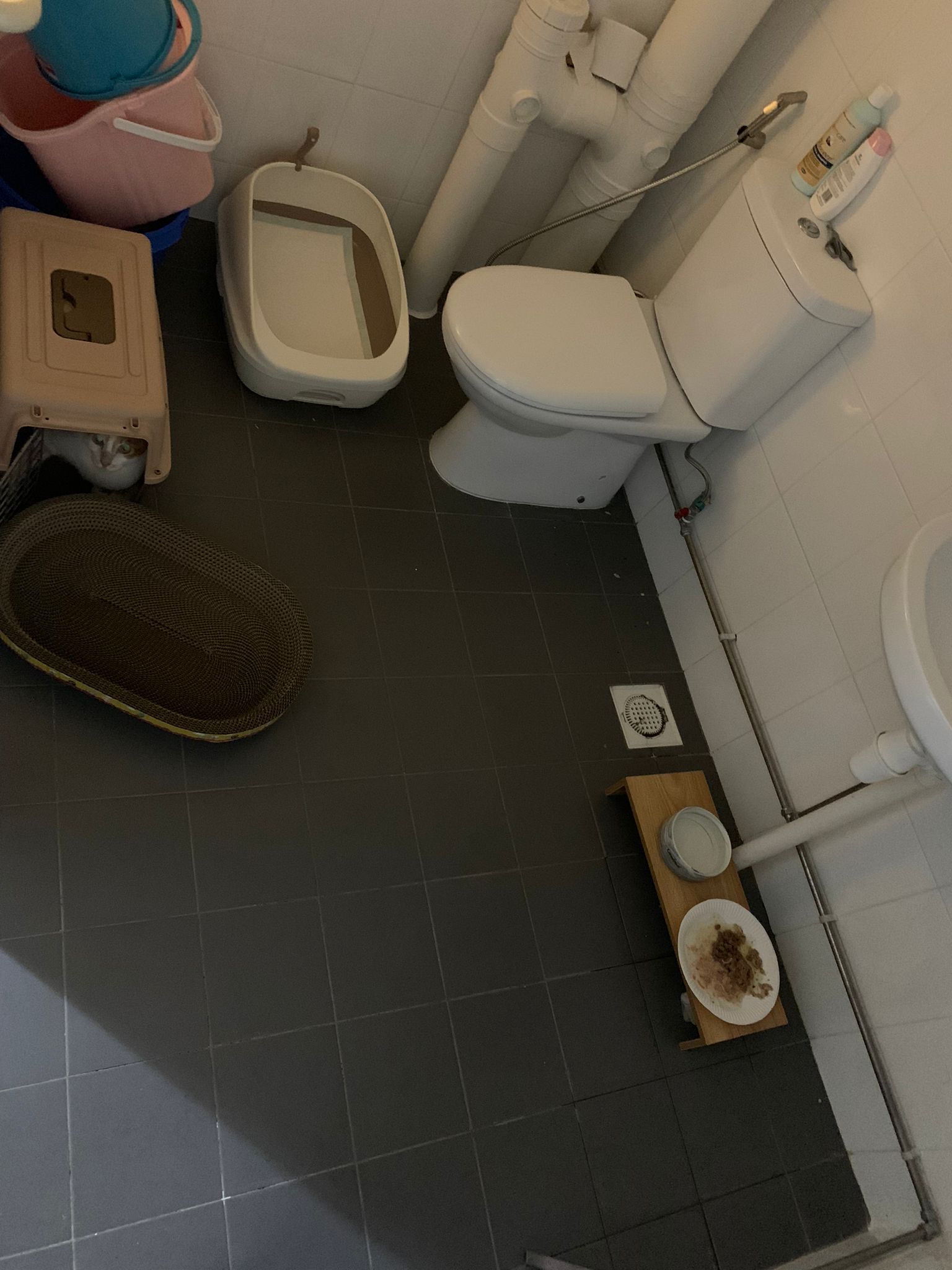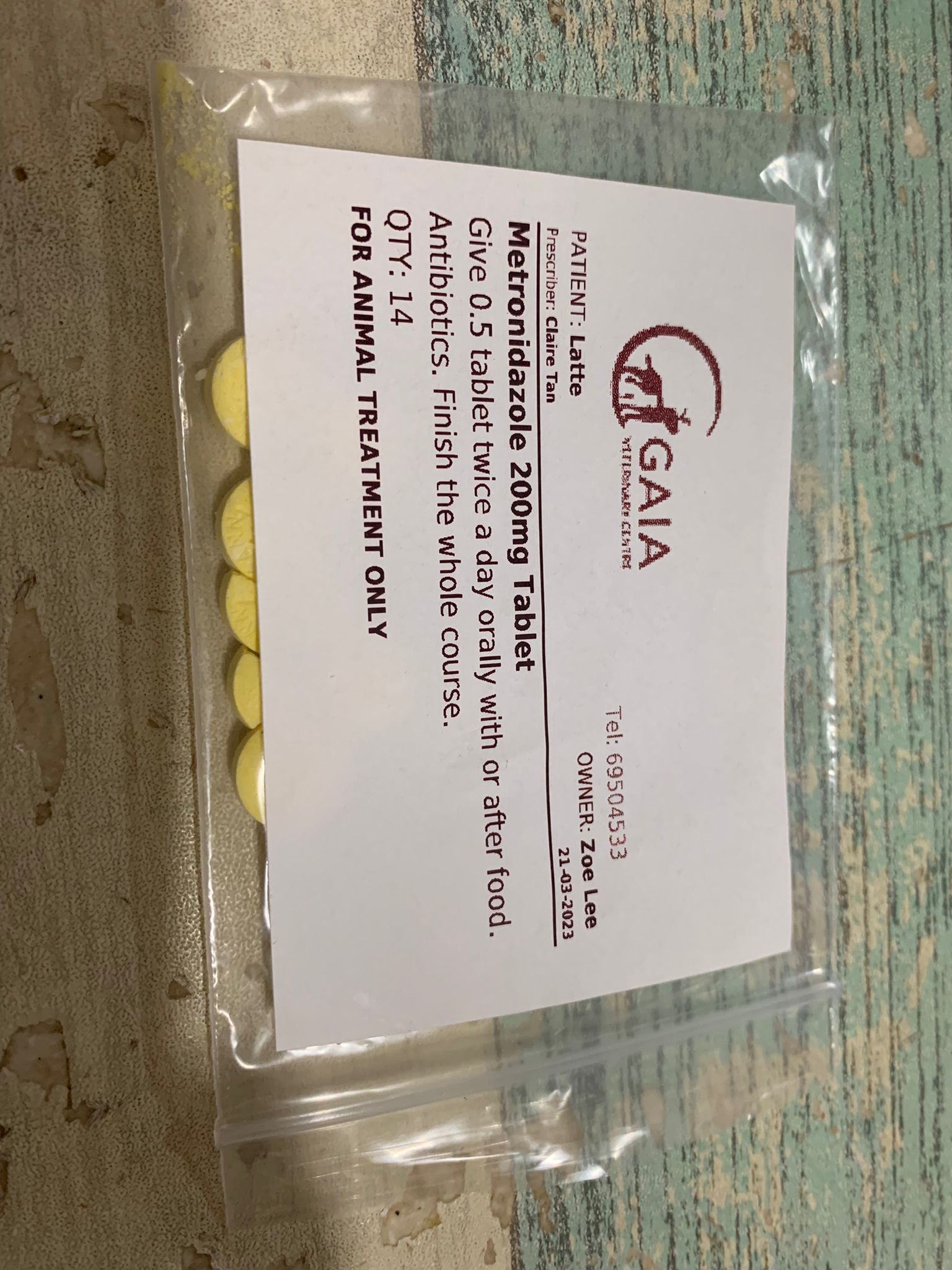 he looks damn stress. Not good. Up to the state of shivering Liao, I can feel if I’m him, I’ll be feeling cold too. I nego w him, i ask him want to go toilet mai? Then won’t see the rest, will b like just now, u alone. Duno he understand a bit the purpose or anything also better than stay in room a – I give him carrier and he walk in straight and I bring him to unused toilet. He calm. he look at me while he see me bringing things one by one for him. Added a night light for him also. he left 10 doses of metro (just know today that he started on 14 days metro starting fr 21.3.23), ab can’t skip n yet he can’t touch. So better than totally 0% hope of getting it in, I put into tiny teaser chicken and