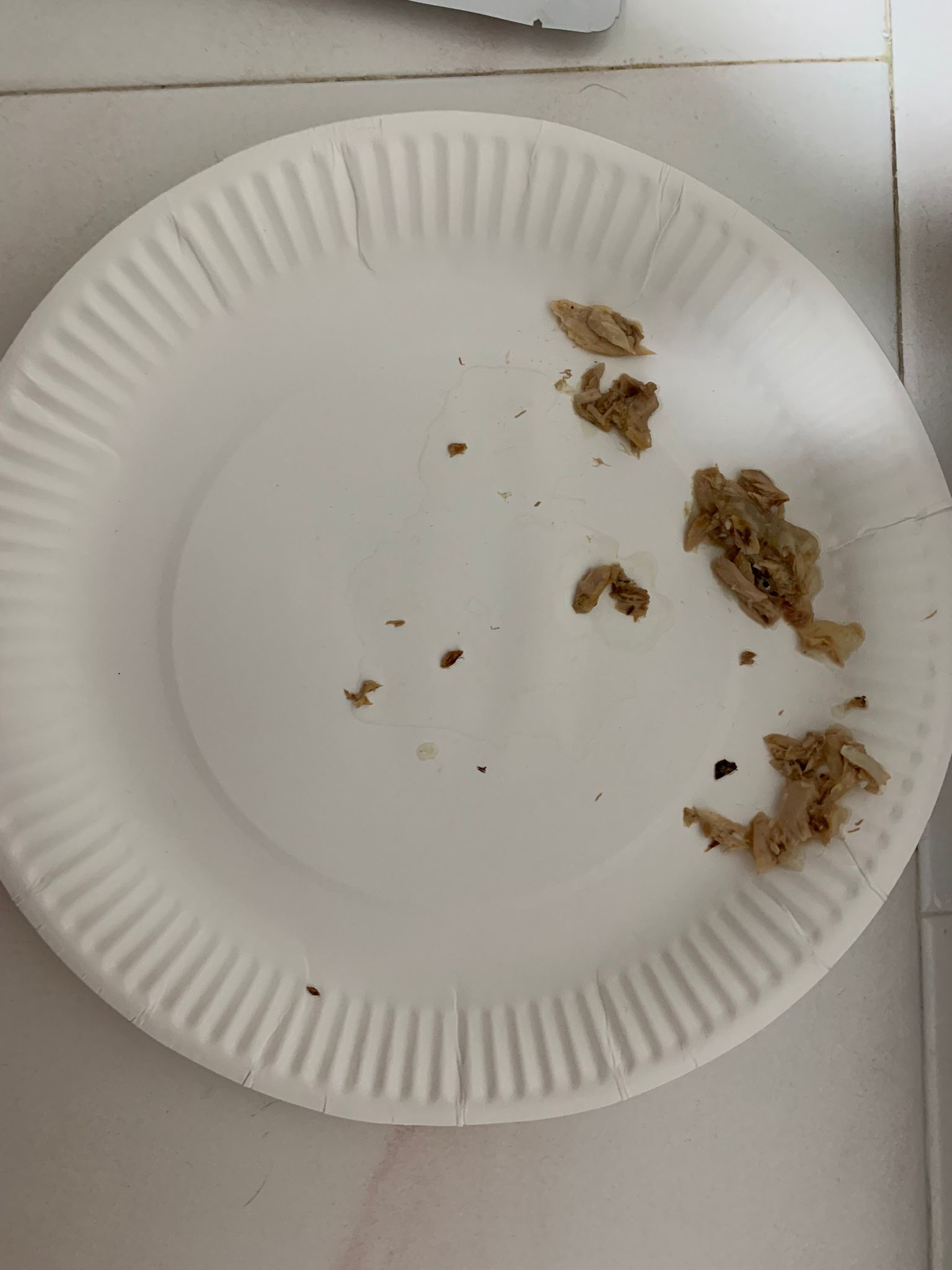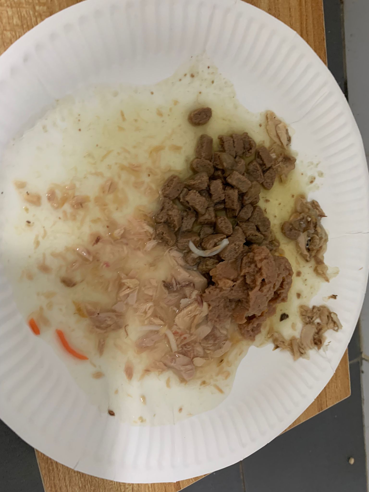 Food plate cleared. Sleep in basin. Got poo 5.5/10. serve tuna w chicken ham 1/4 and diabetic pouch 1/2 – he eat.