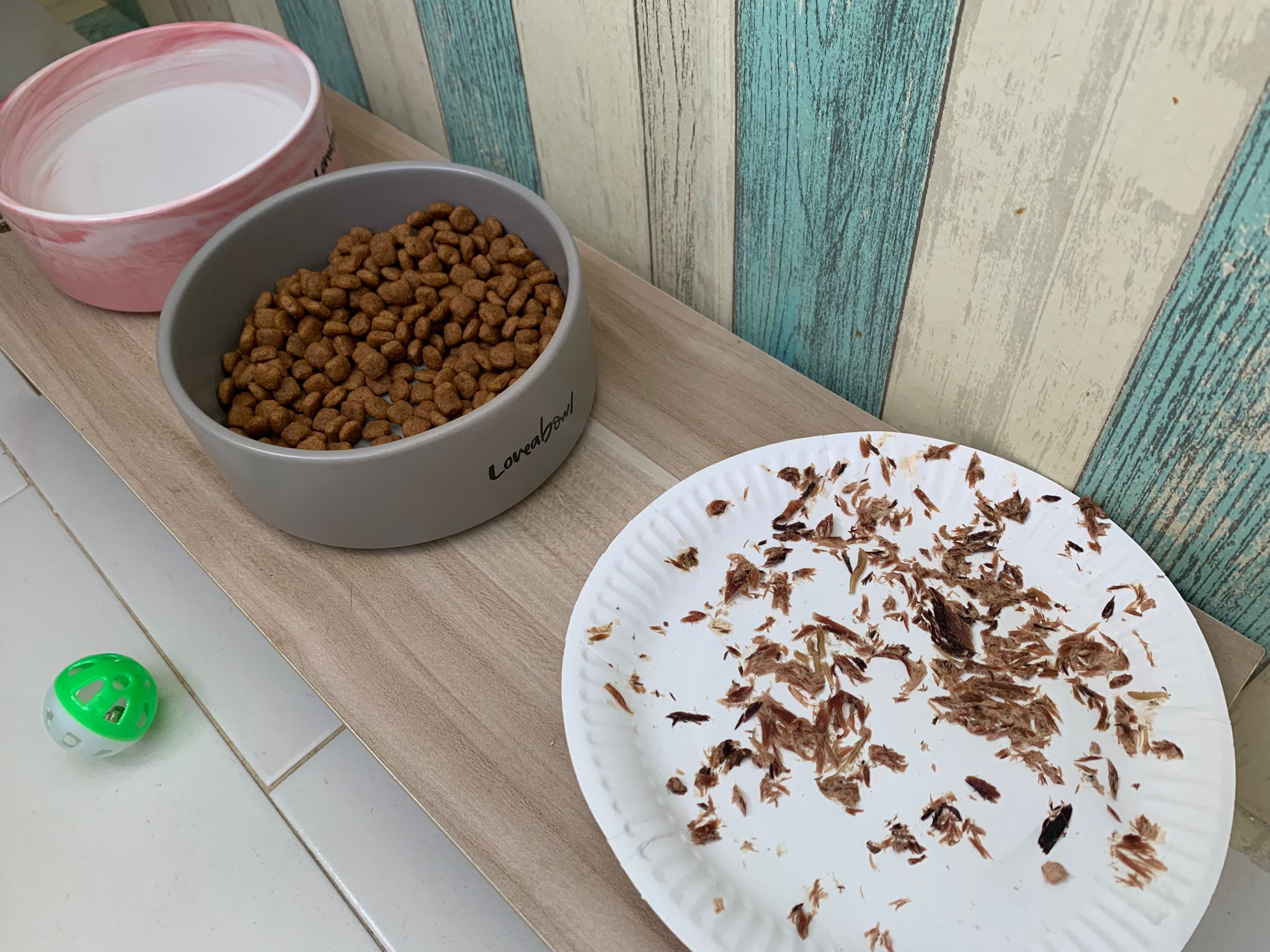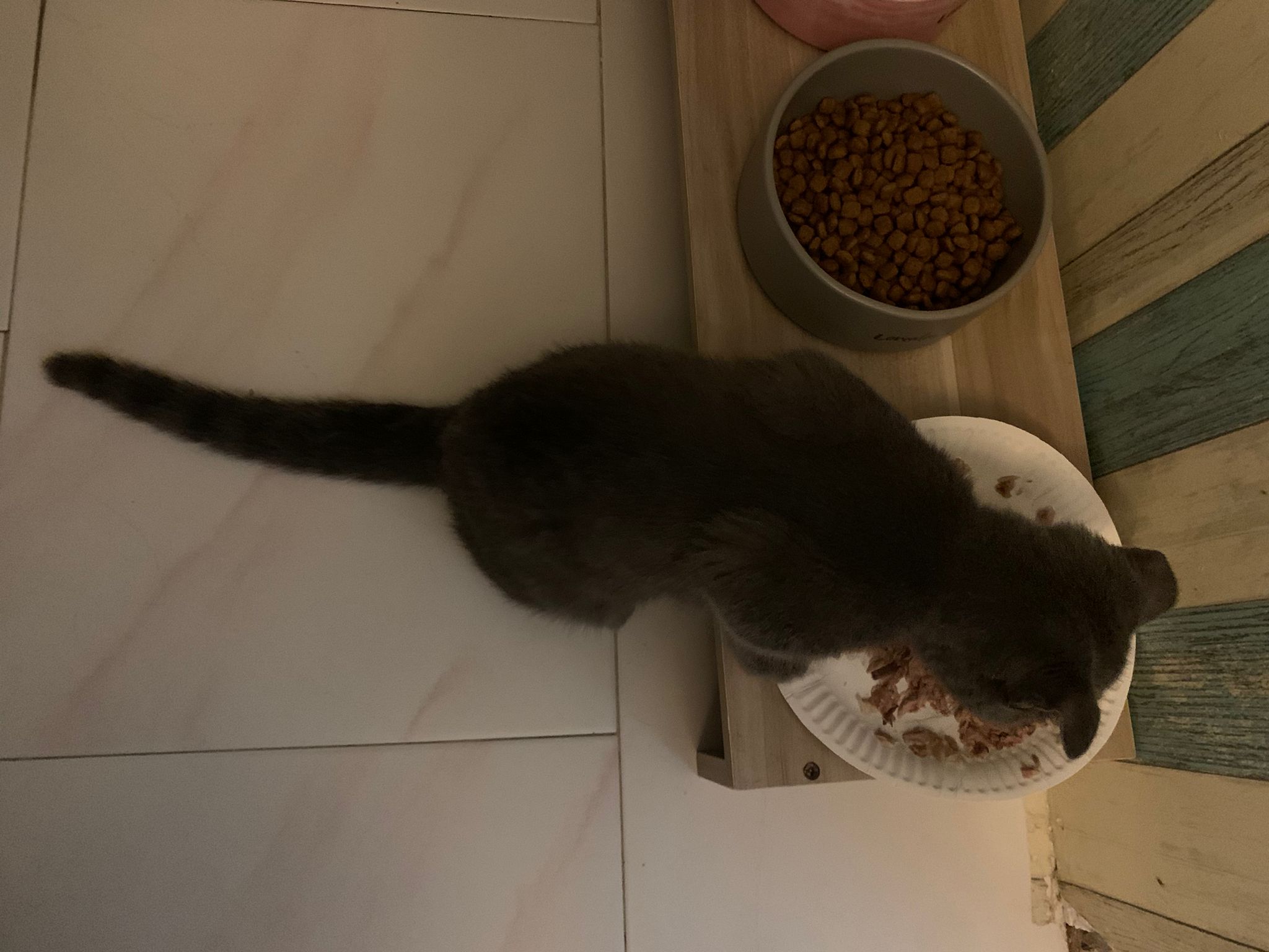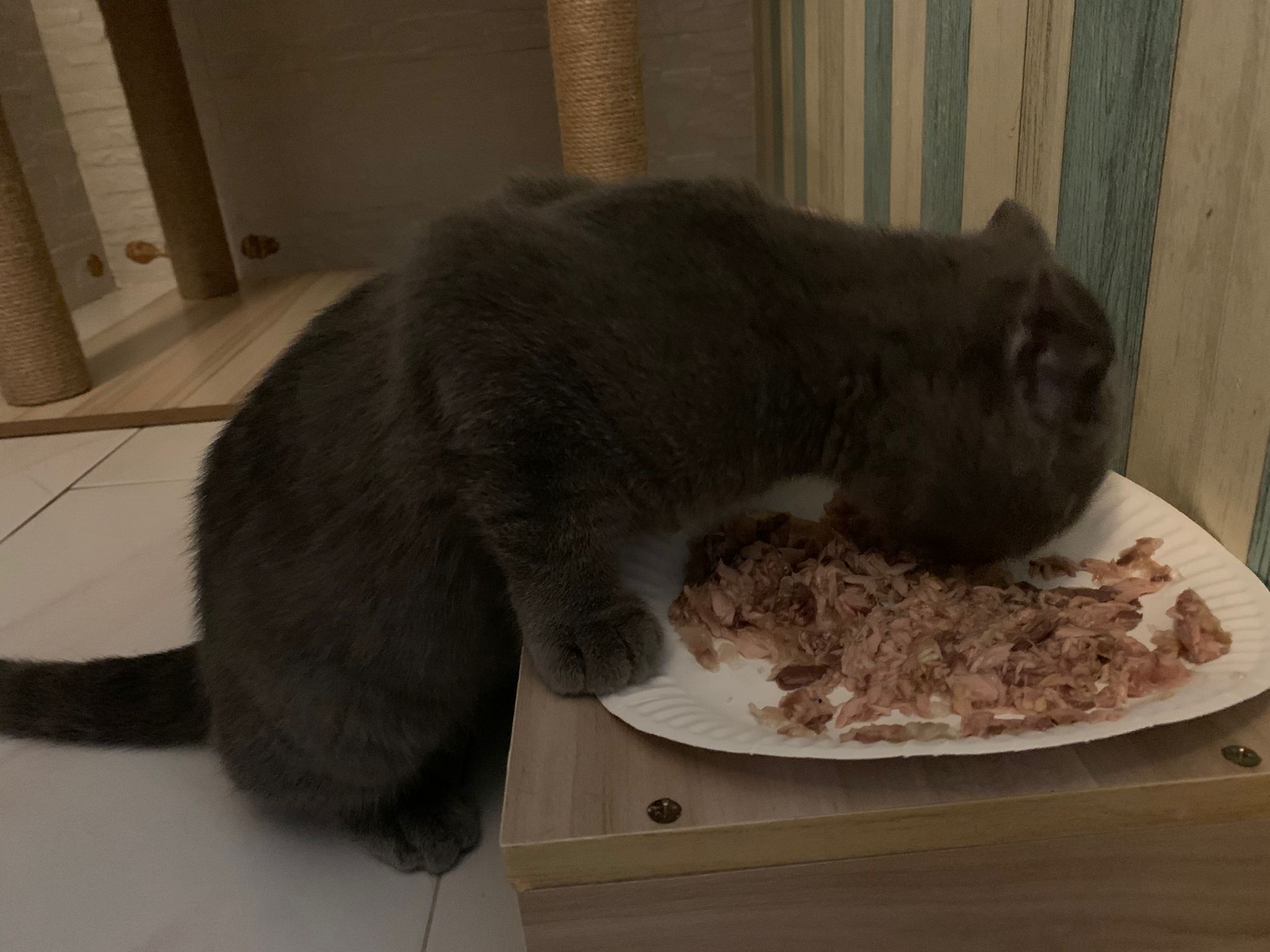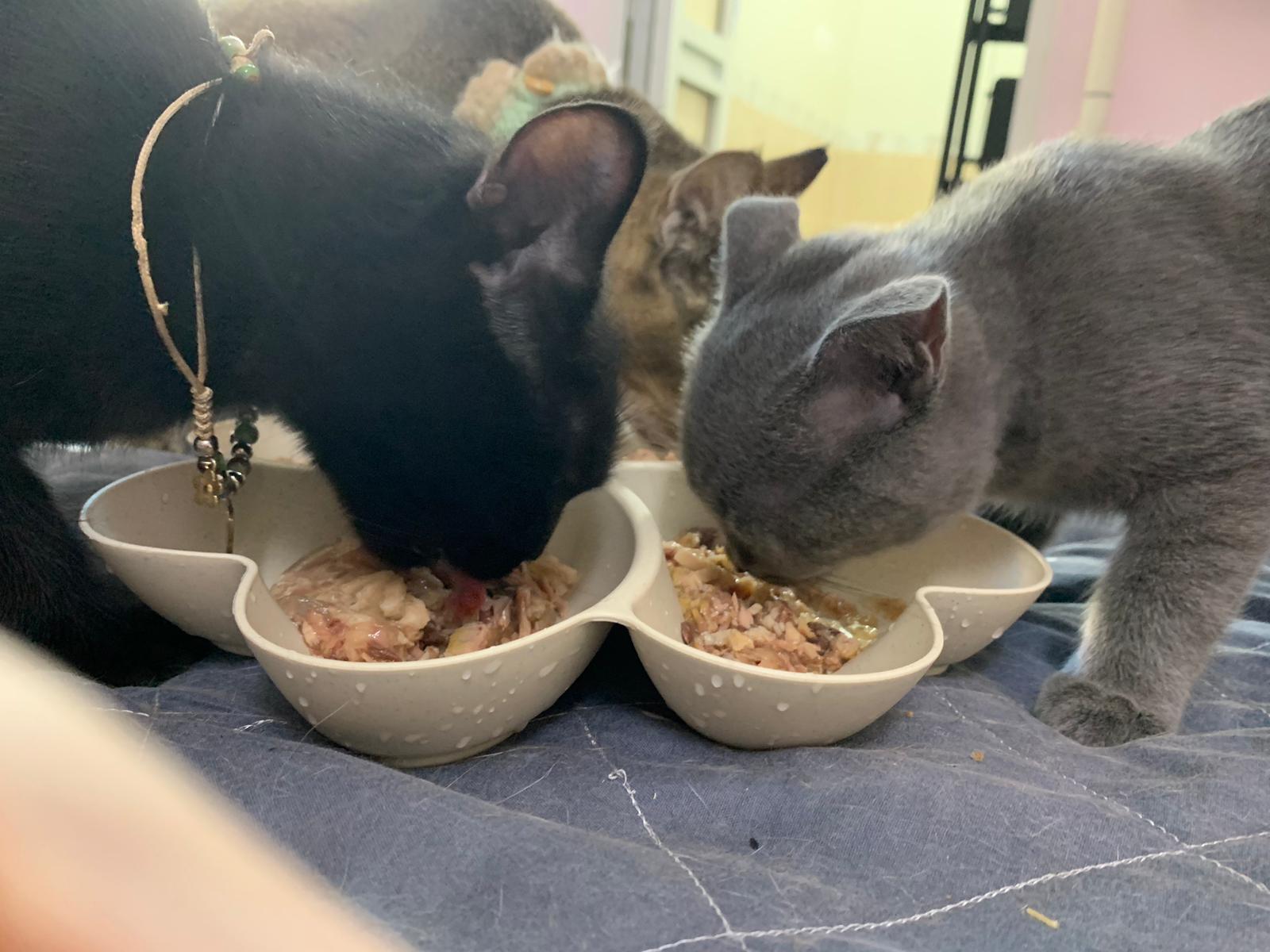 3.55pm: serve tuna w chicken ham, he finish all food le. Hungry kitten. Clean up his eye, got play a little w me n the sb.