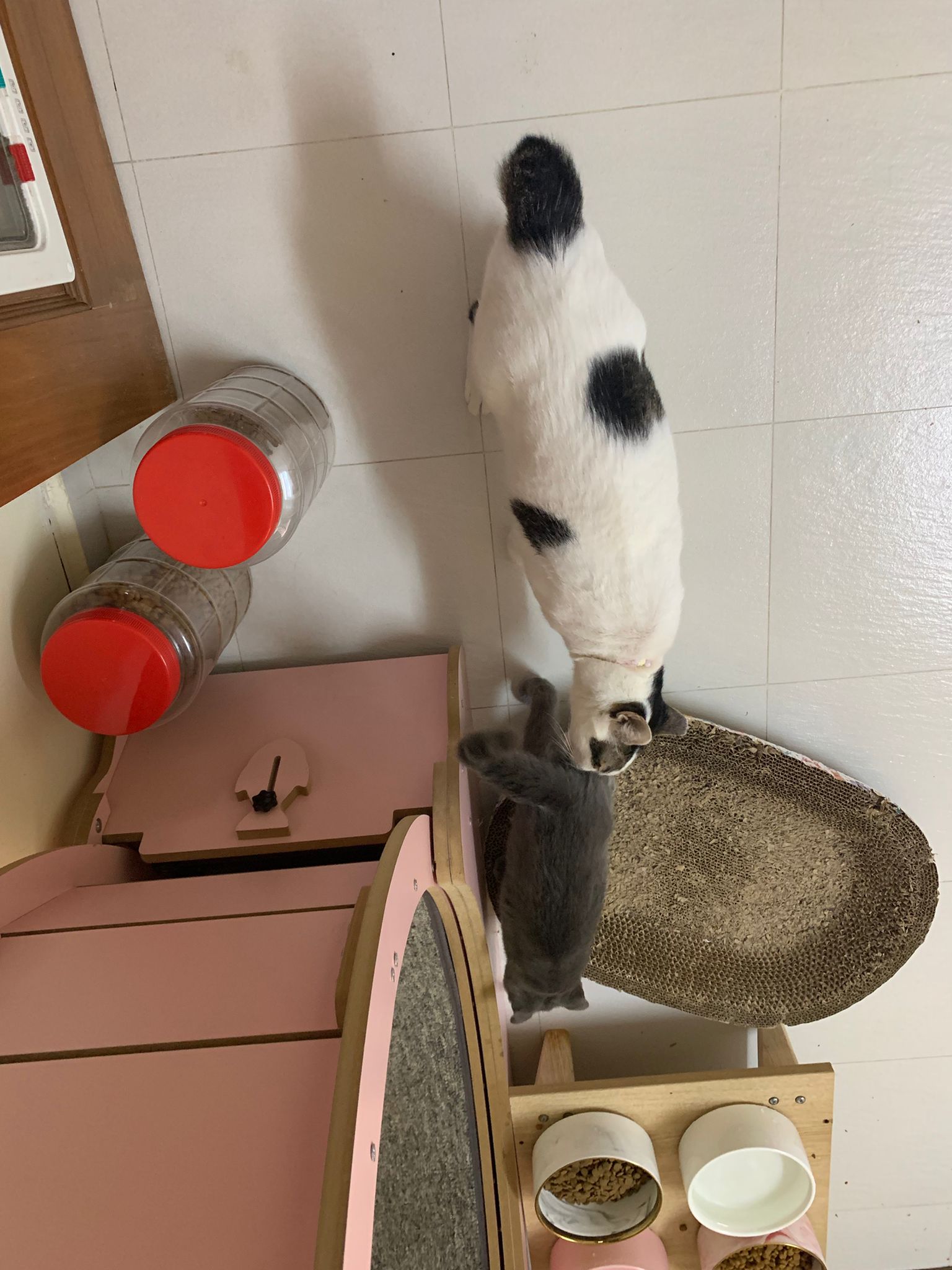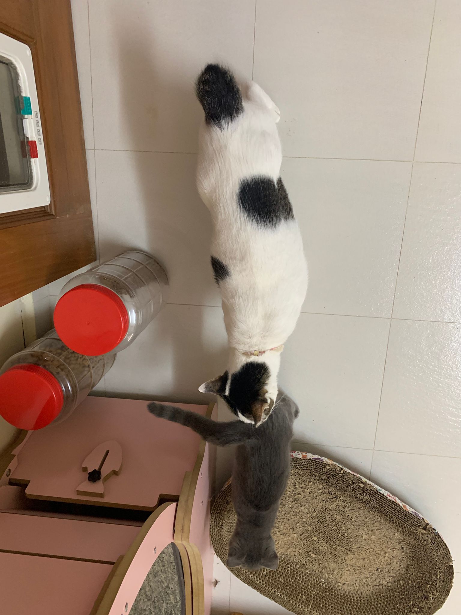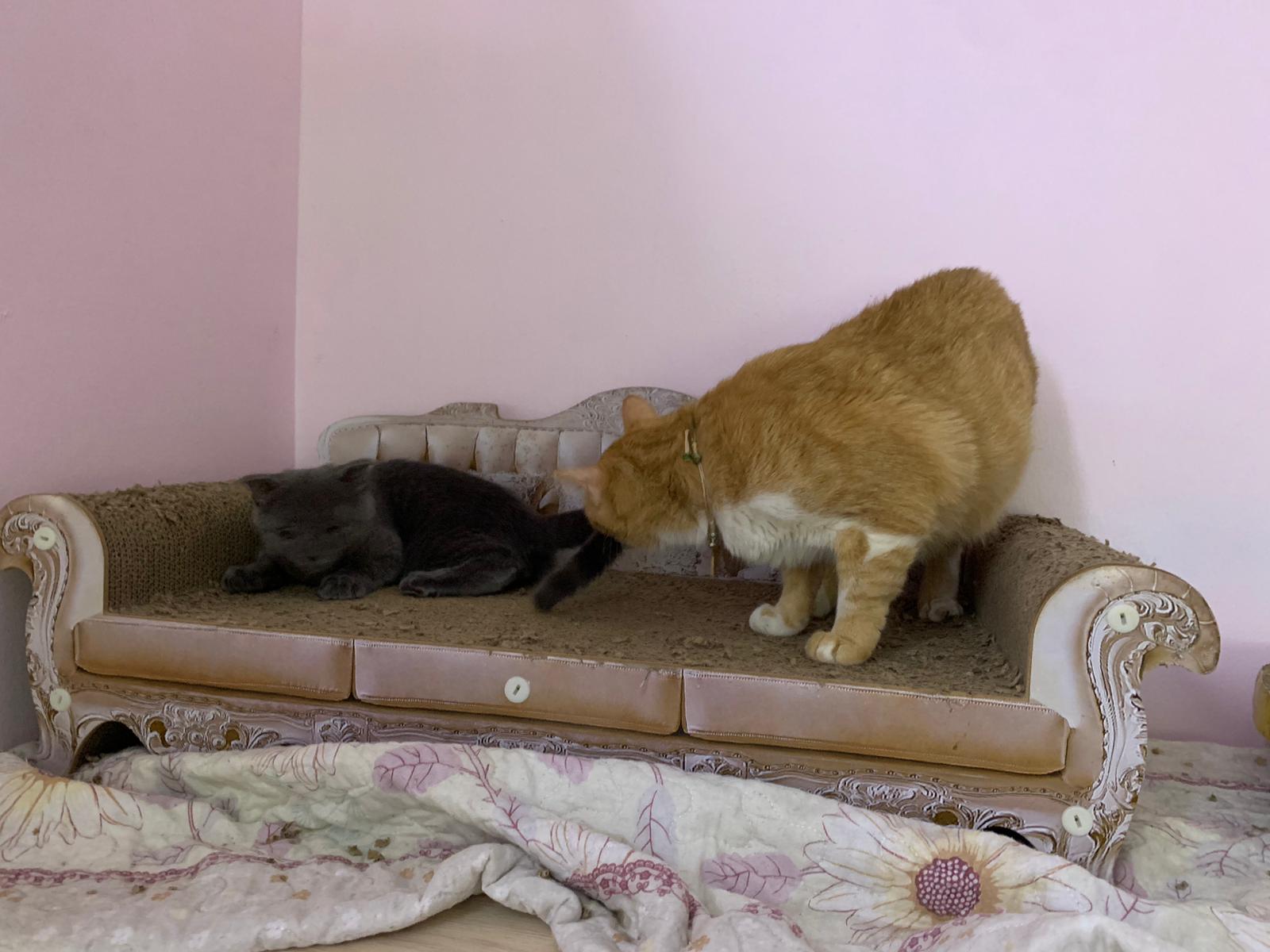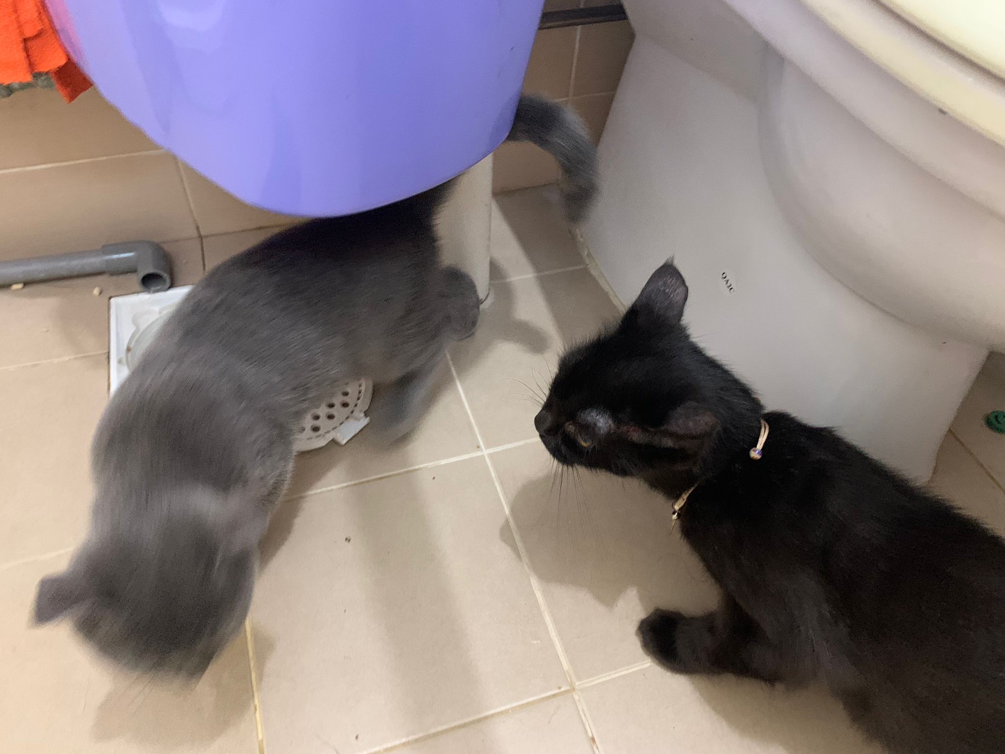 night: play till quite 疯, zoom here n there while I’m going stuff in 猫房. can jump very well. So much more active and agile and muscular than days b4. Like to play hideout in the bathtub sb also. 1.80kg – gain another 50g. junior also curious about him. Kitty wanna whack him.