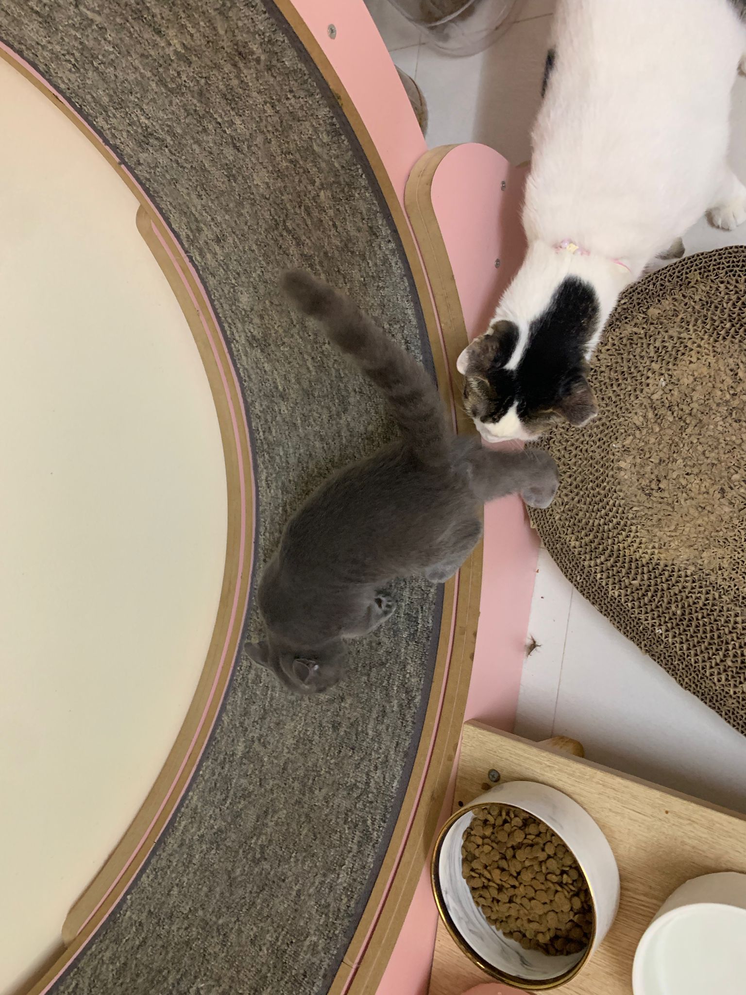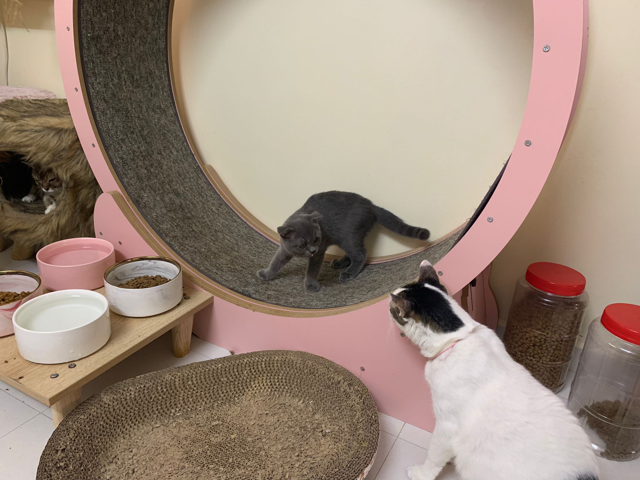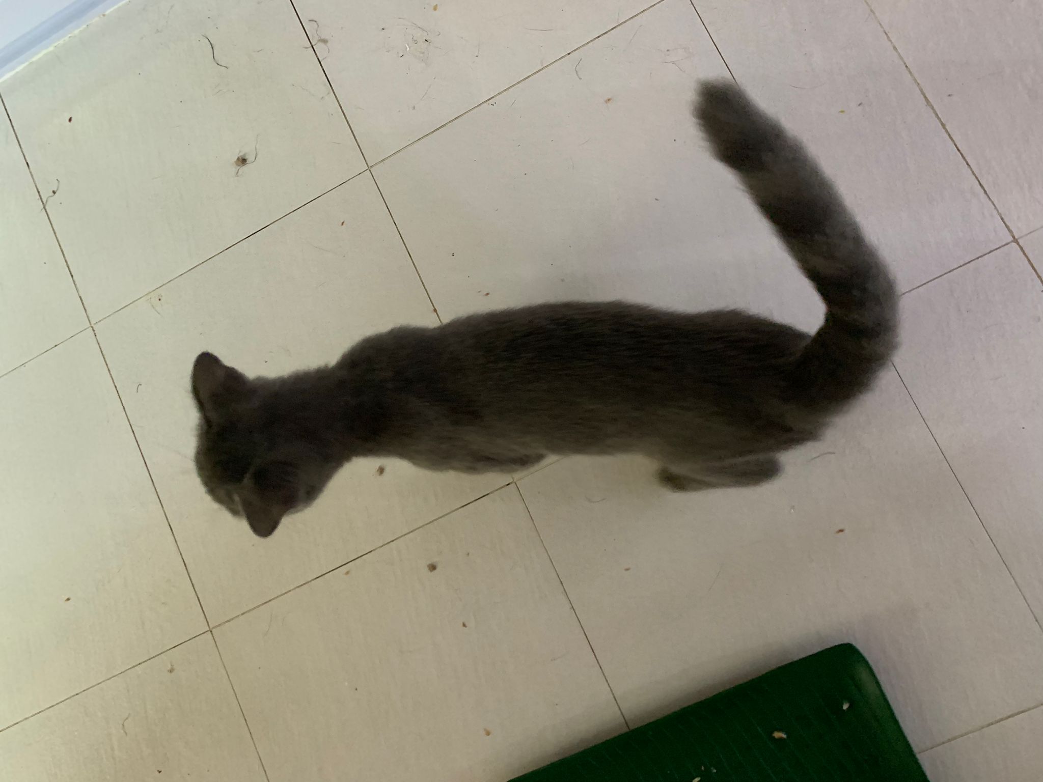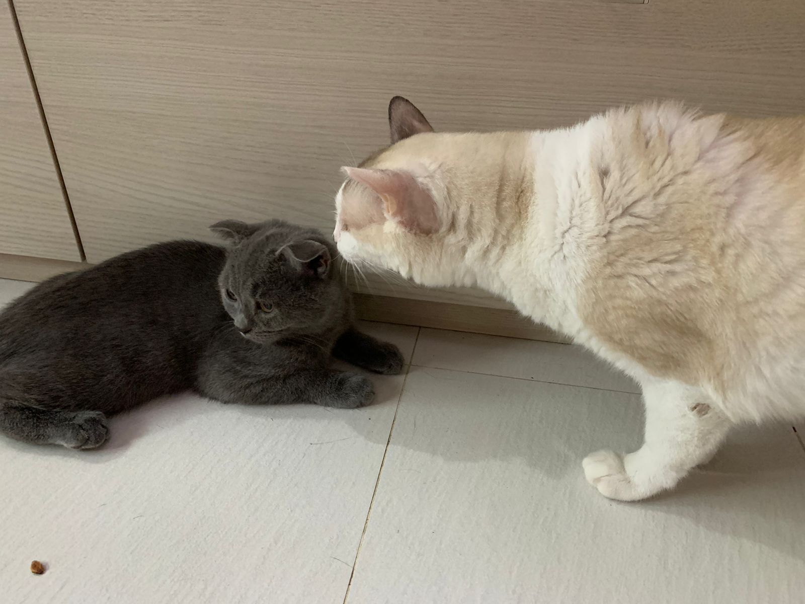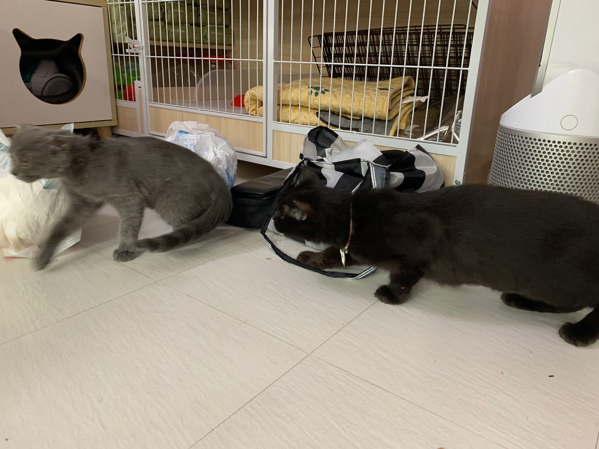 night: play till quite 疯, zoom here n there while I’m going stuff in 猫房. can jump very well. So much more active and agile and muscular than days b4. Like to play hideout in the bathtub sb also. 1.80kg – gain another 50g. junior also curious about him. Kitty wanna whack him.