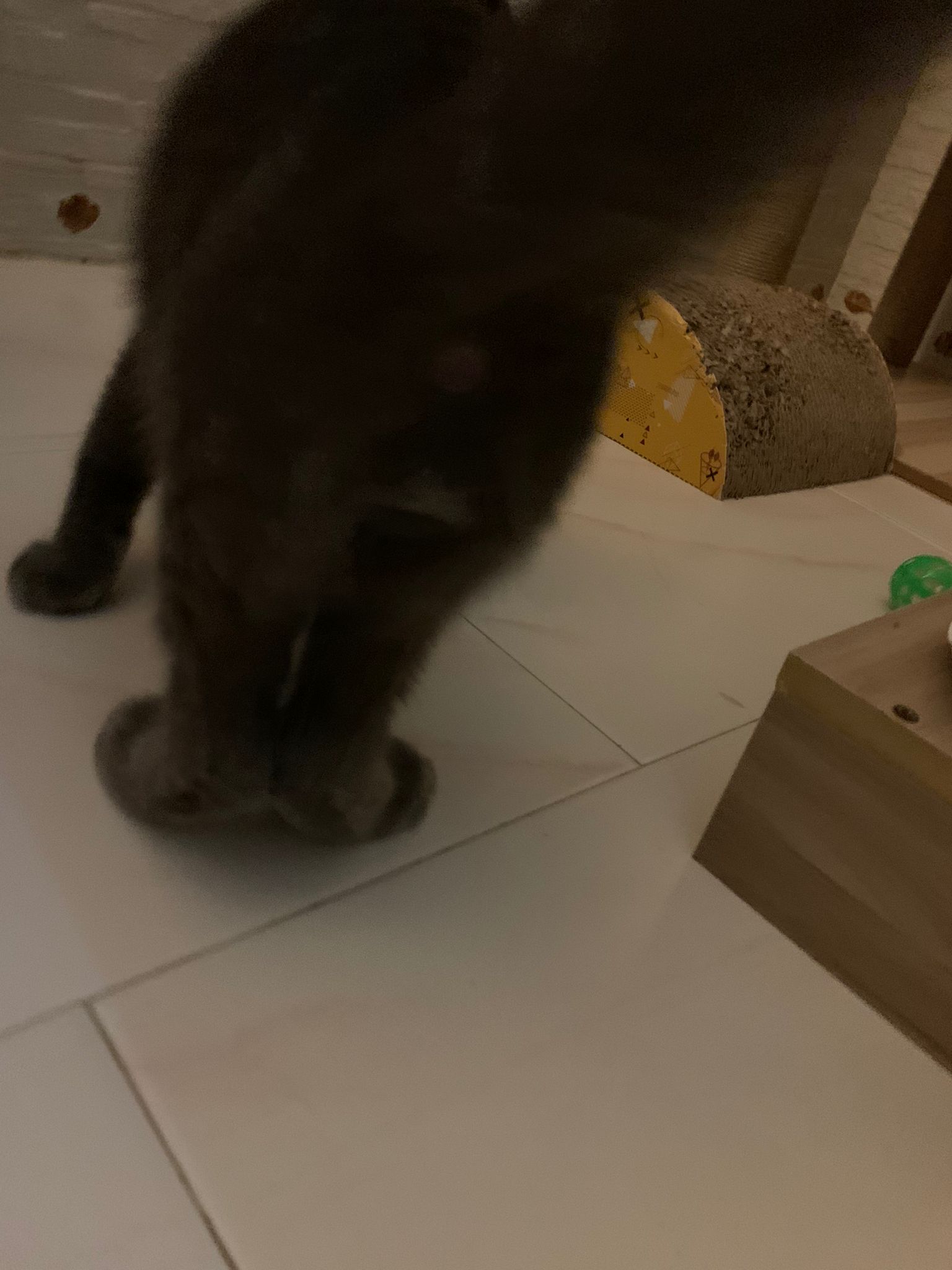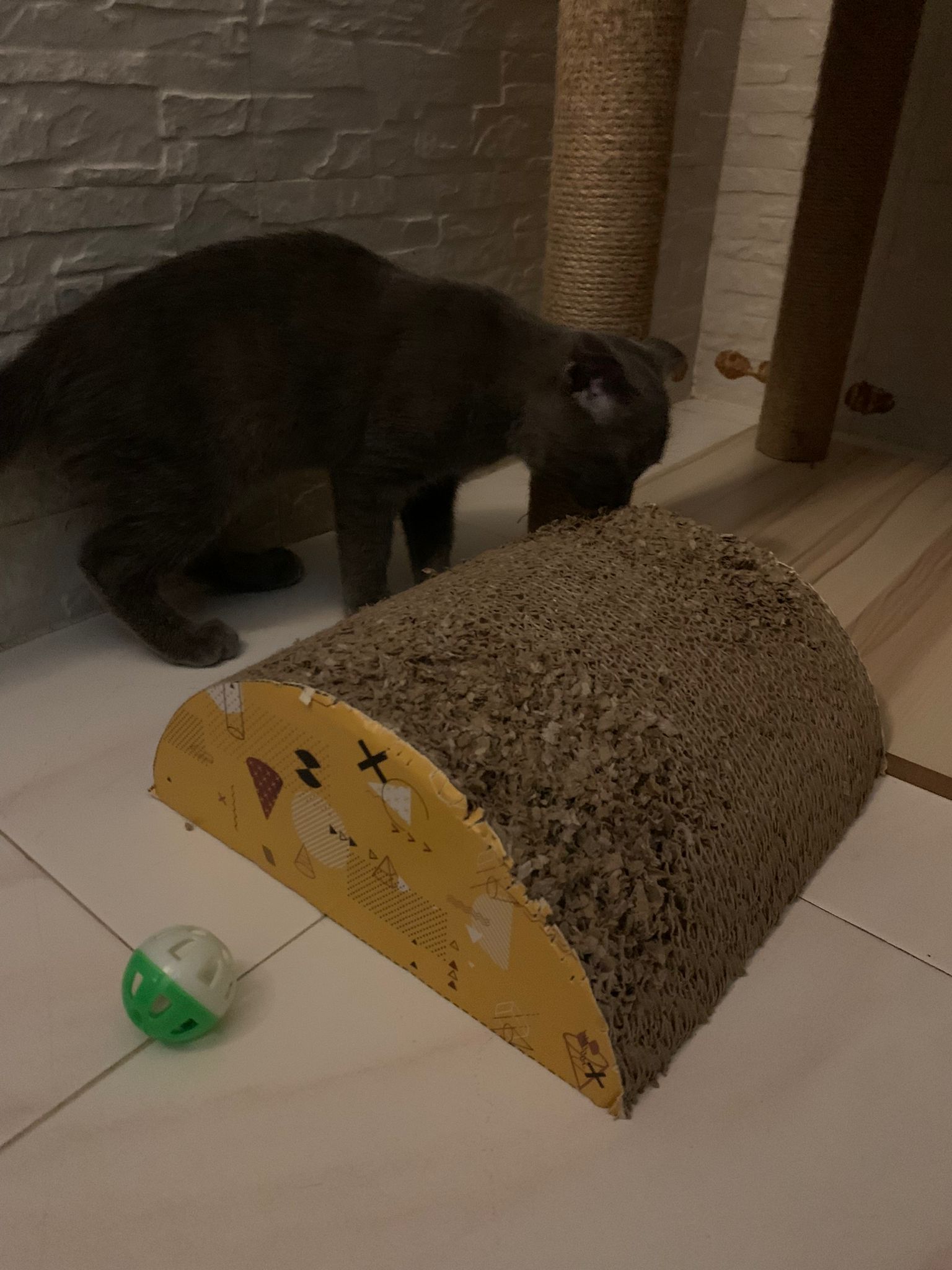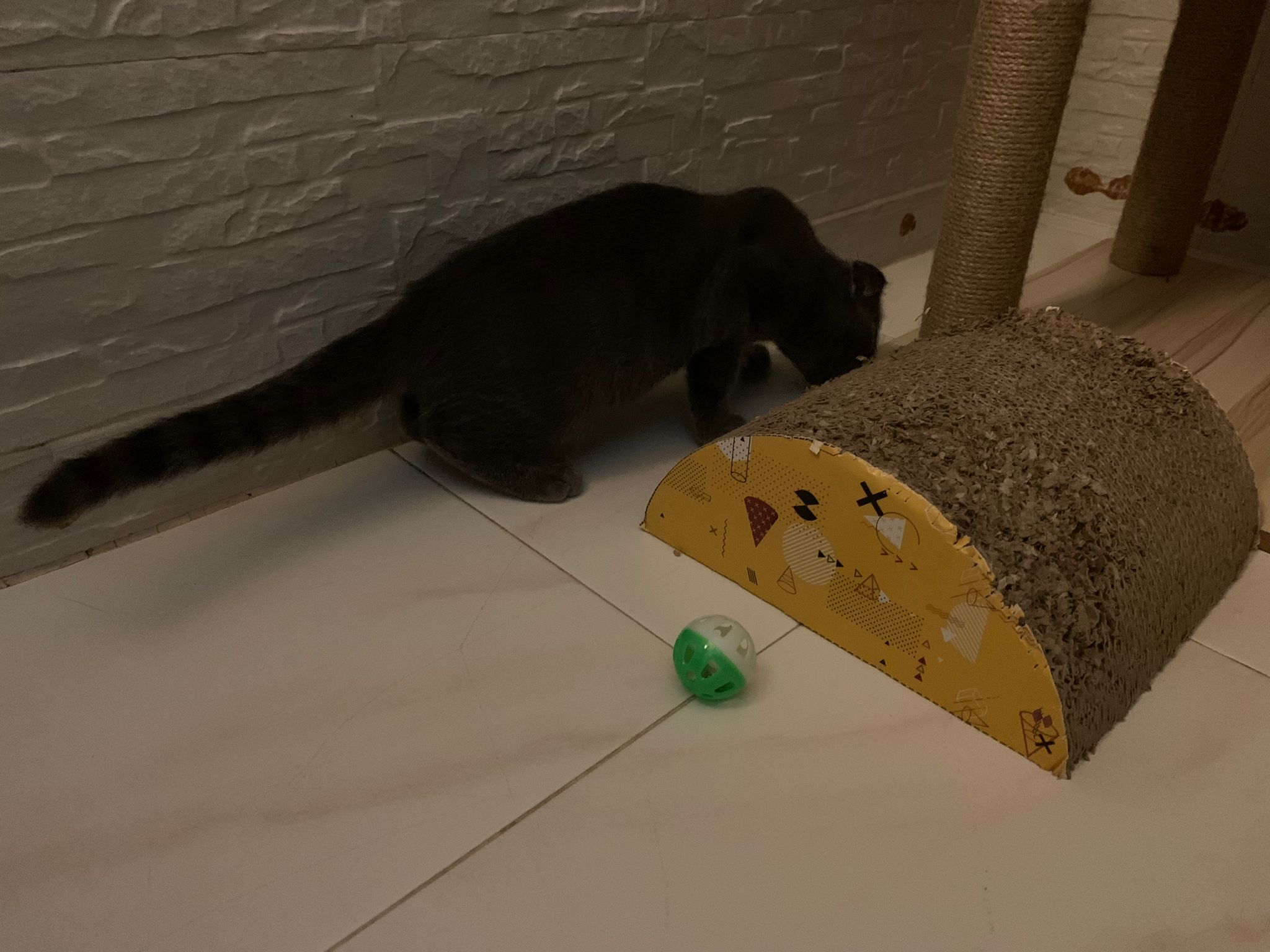 Jo let him out to play too, active, will climb, will play w slipper, w string w lighted ball.